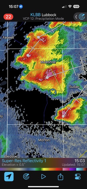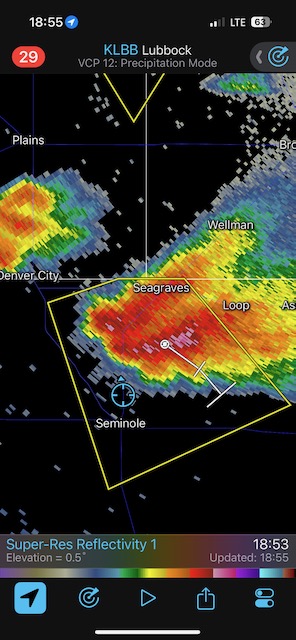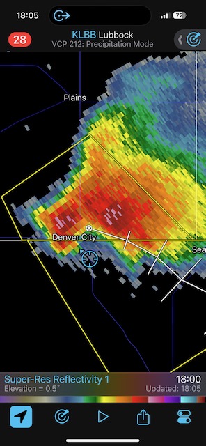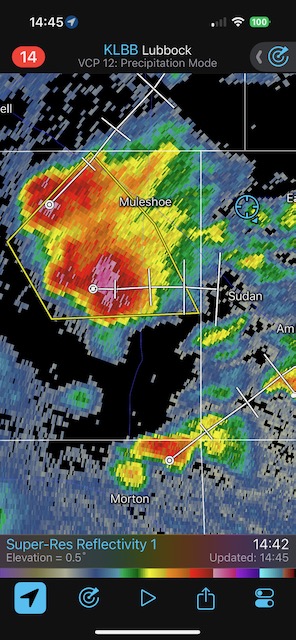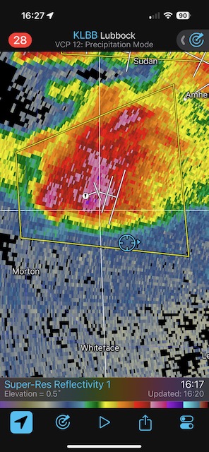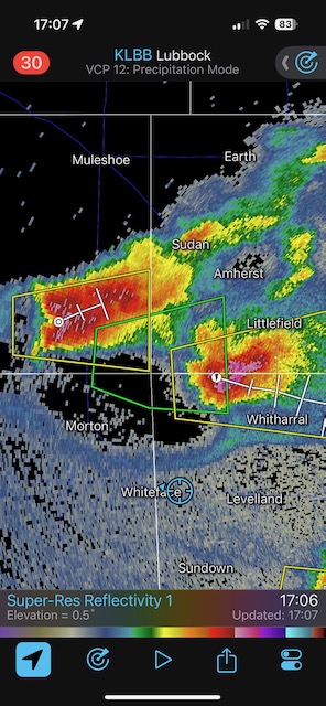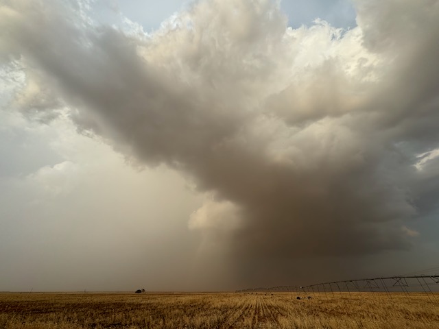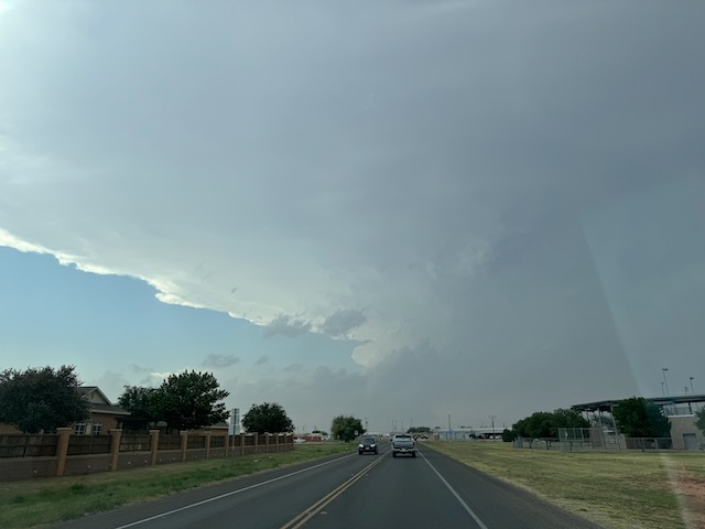 This was a fine Panhandle supercell day, with a couple of photogenic rotating storms. The winner was one near Morton which moved towards Levelland. It was warned for “DVD-sized” hail, and it did indeed produce giant hail. I tried to find a good spot around Levelland to experience the hail while protecting the vans, but had to settle for a spot that wound up too far south. SPC showed a 5 percent tornado risk area but I do not recall much of an attempt to make a tornado. Temp-dew point spreads were probably a bit too high.