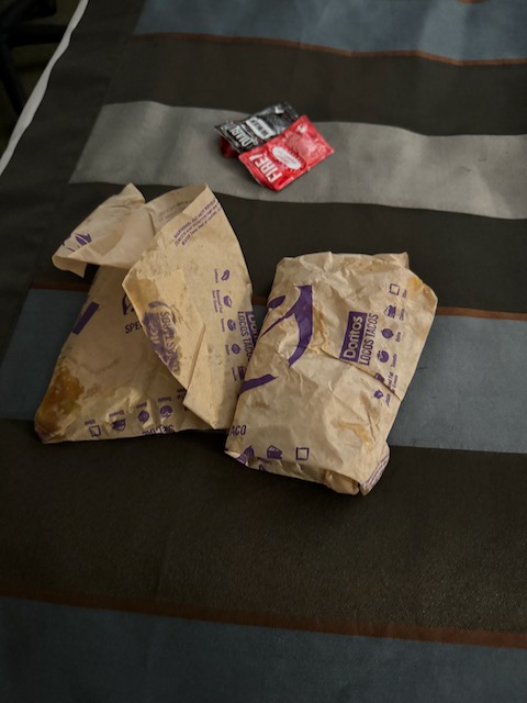 We did wind up with a pretty supercell and a very pretty sunset, and some swirly stuff happening beneath the storm base! This was from about Denver City to Seminole. At the hotel in Seminole the Gatlin Brothers gave me two Taco Bell tacos.