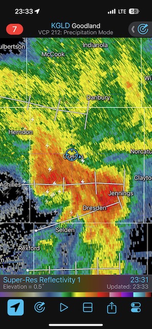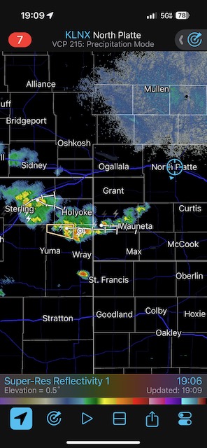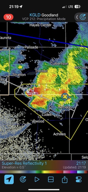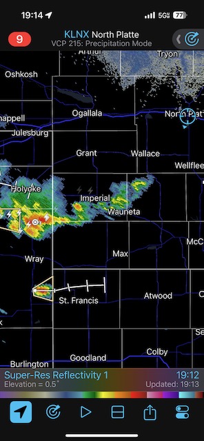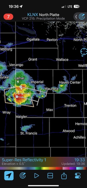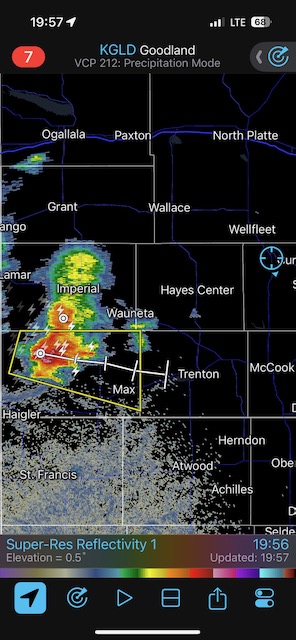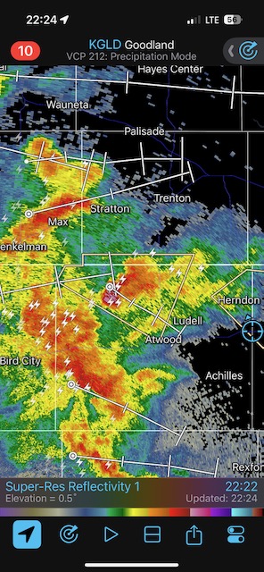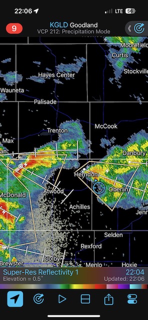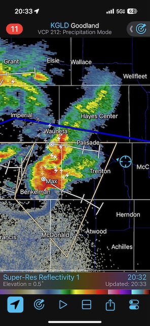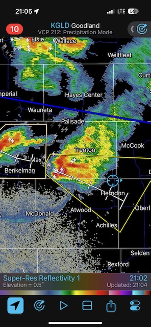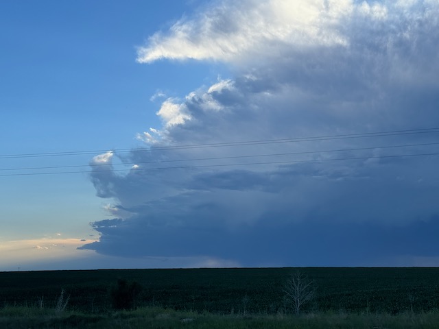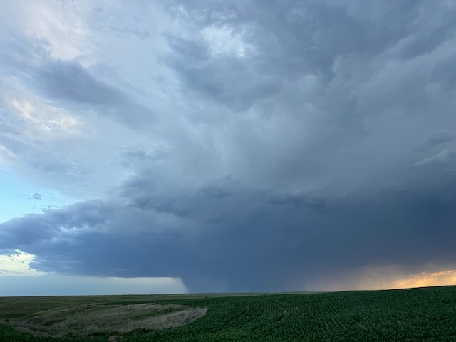 Final chase day for Tour 8 and for me for the chase season. We tried our luck around Tryon and Arthur, but that wasn’t happening. We managed to get in front of marginally severe stuff southwest of McCook and sagging southward into Kansas around sunset. It was high-based.