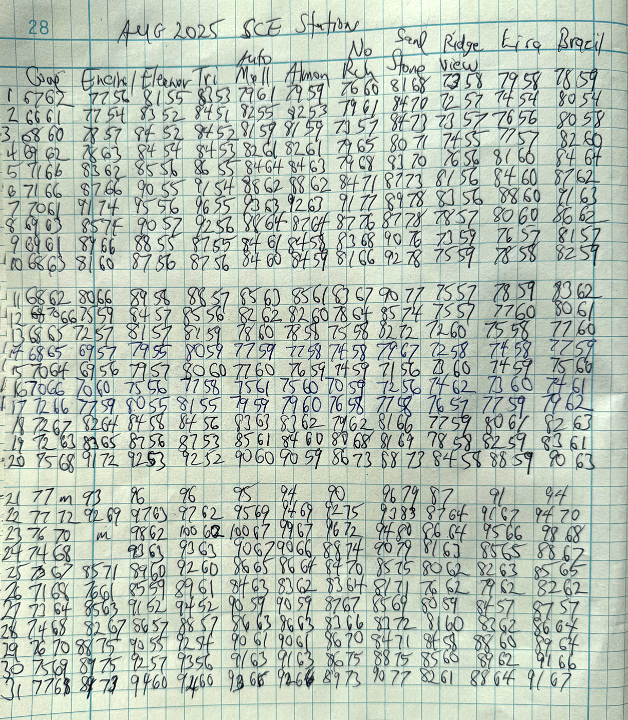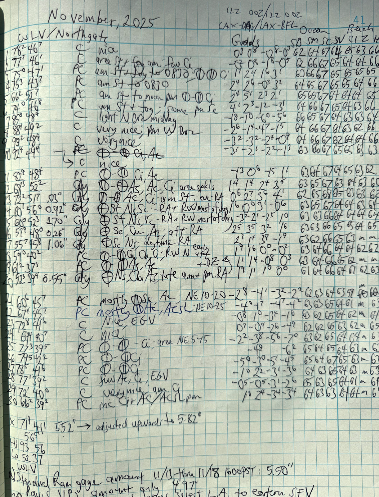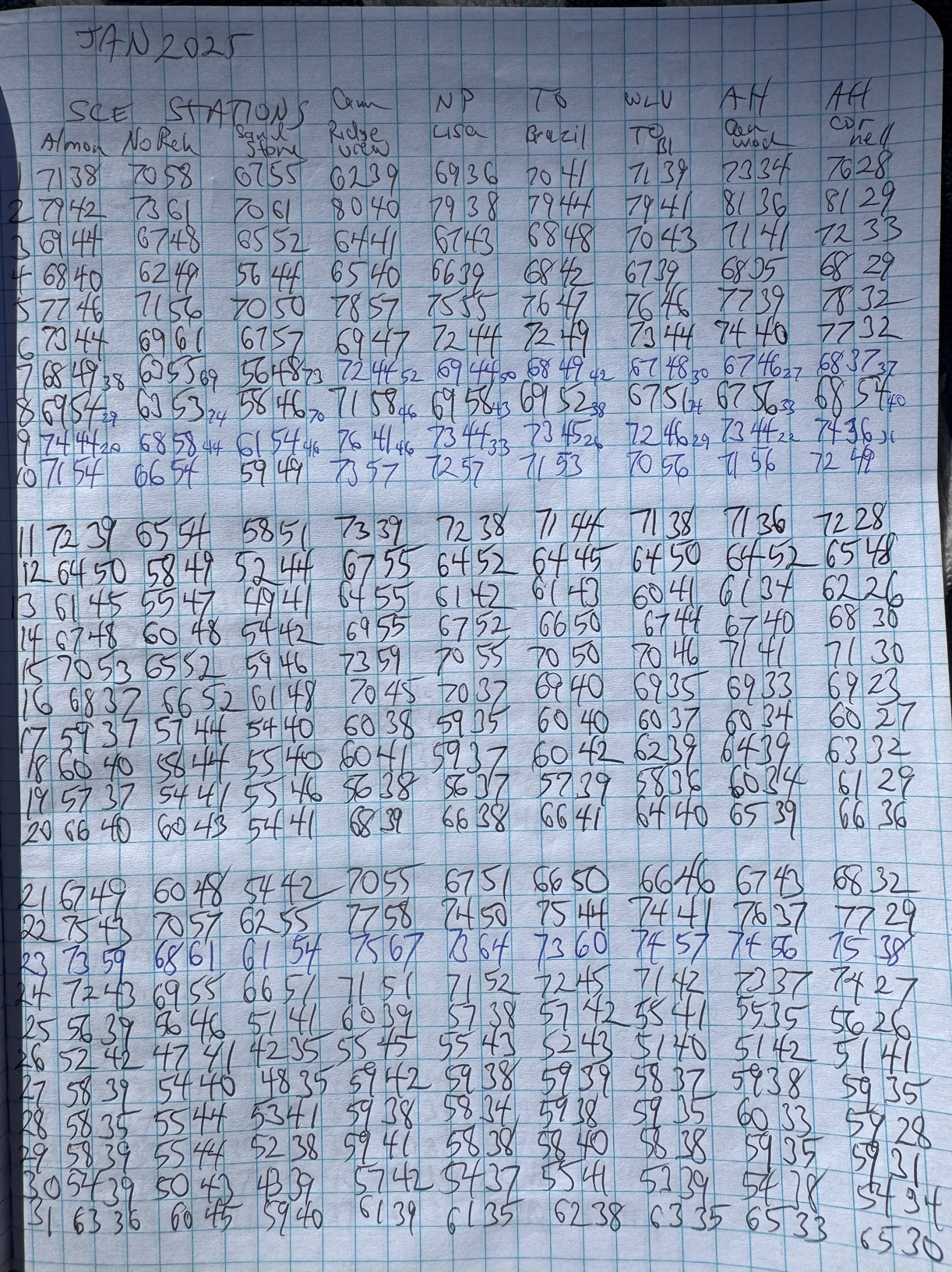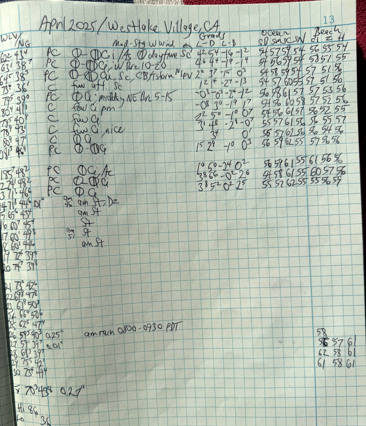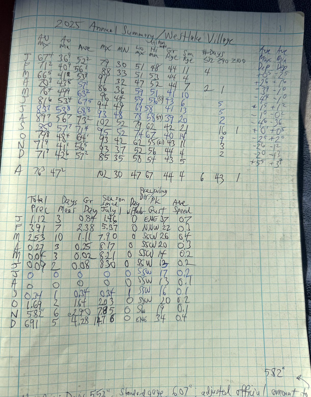 This page contains links to scans of my original hand-written daily weather records from Dec 1997 to about the present (2025 as of now) for Westlake Village primarily. For Dec 1997 to mid 1999 I was in Agoura Hills. Also, this link is for the same daily and monthly records for 1977 to 1997 at Woodland Hills.