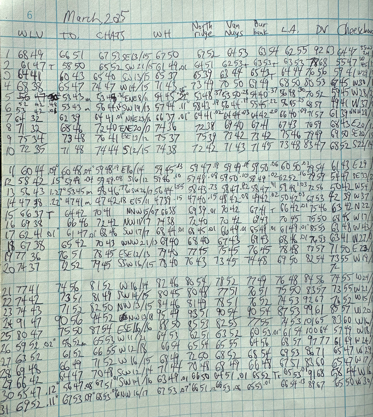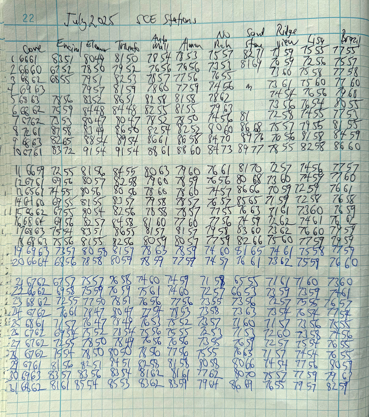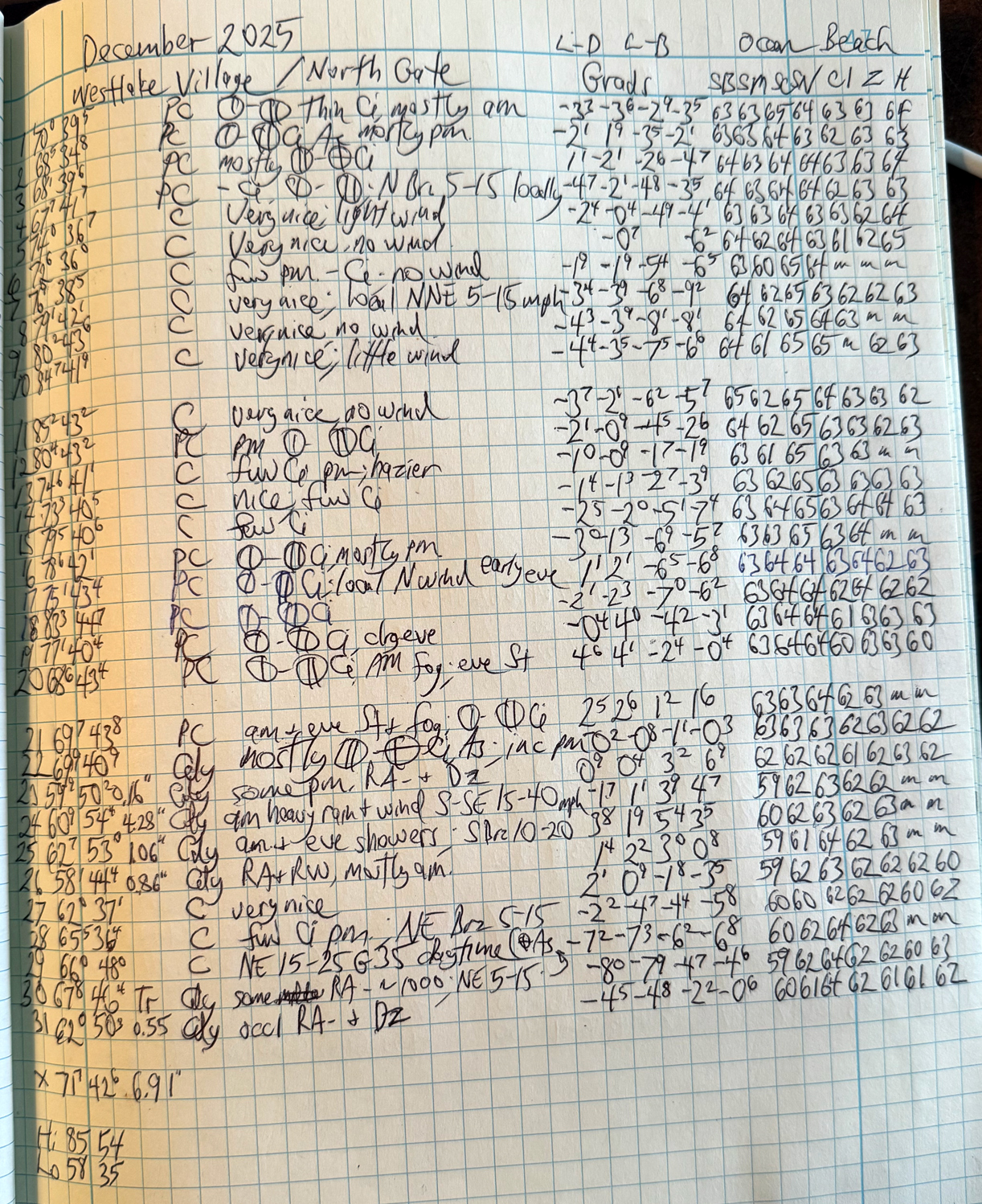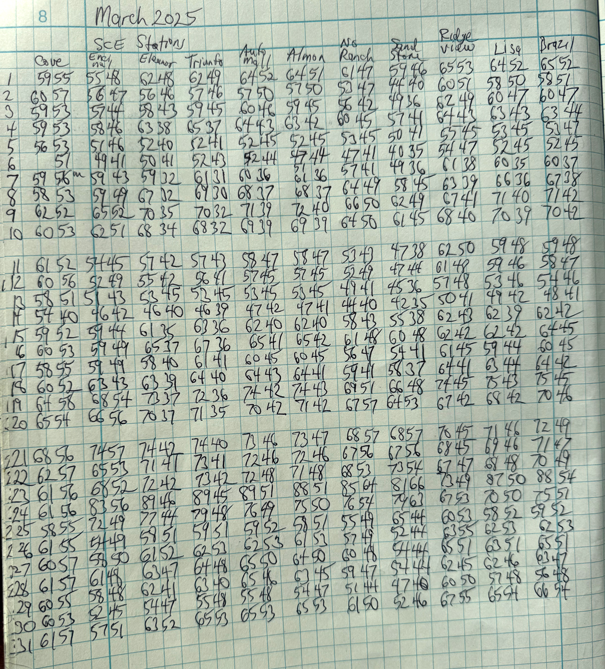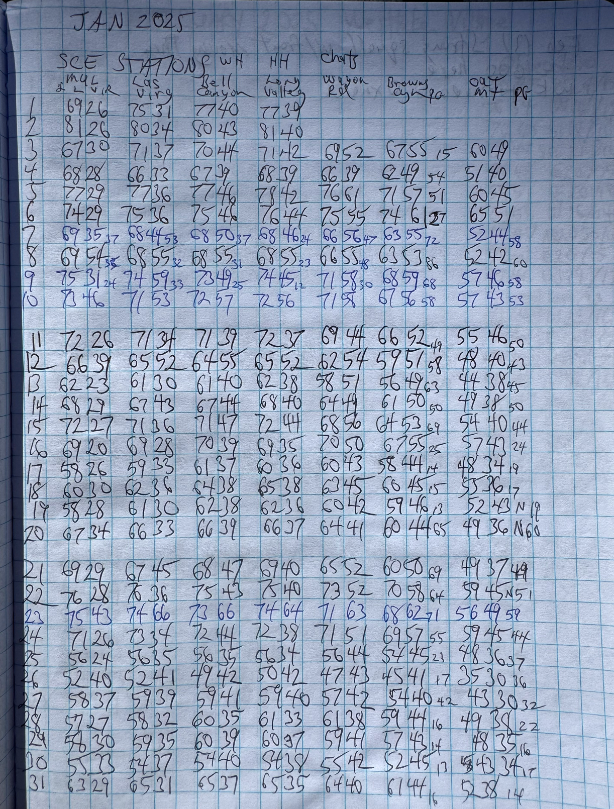 This page contains links to scans of my original hand-written daily weather records from Dec 1997 to about the present (2025 as of now) for Westlake Village primarily. For Dec 1997 to mid 1999 I was in Agoura Hills. Also, this link is for the same daily and monthly records for 1977 to 1997 at Woodland Hills.