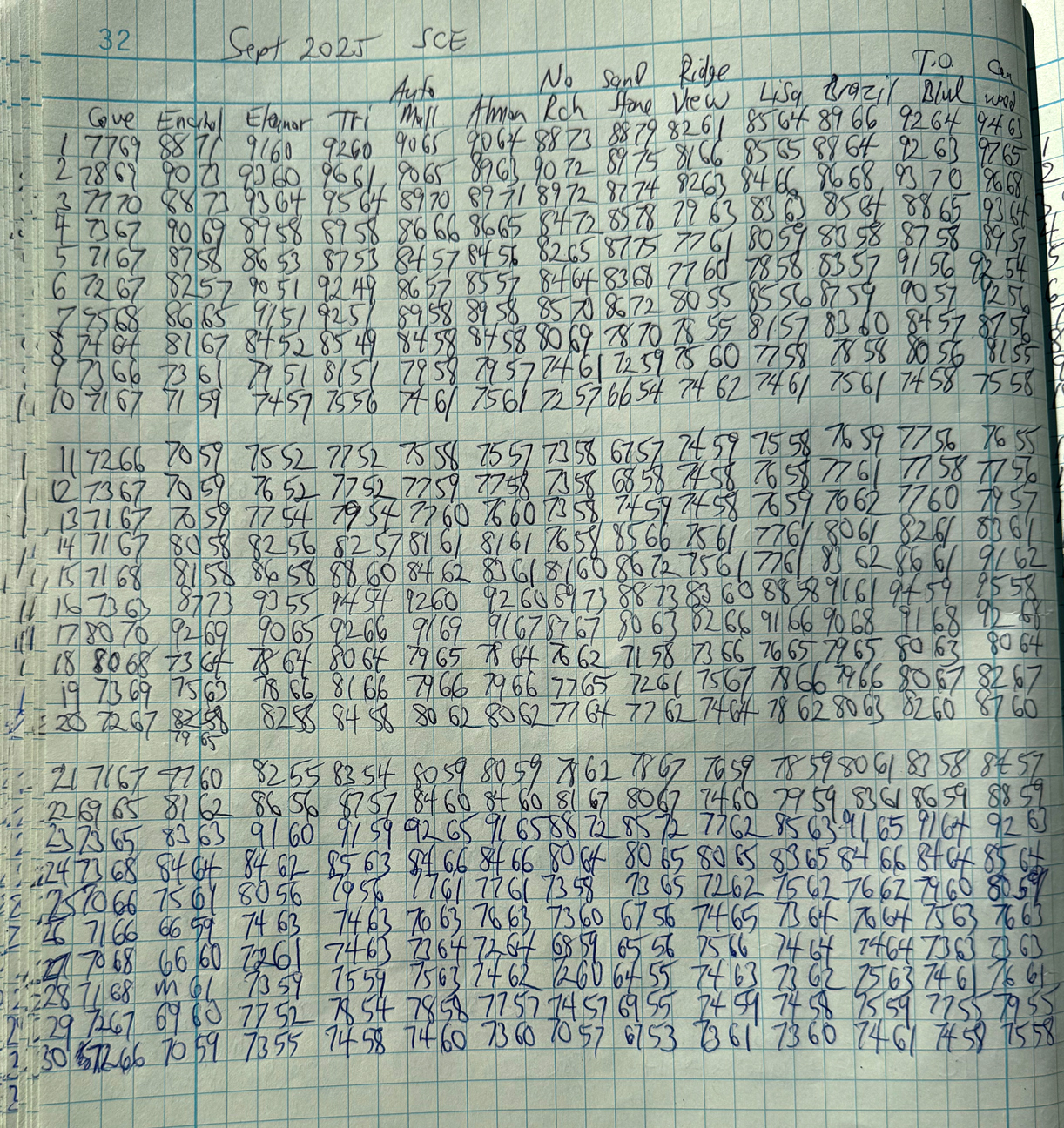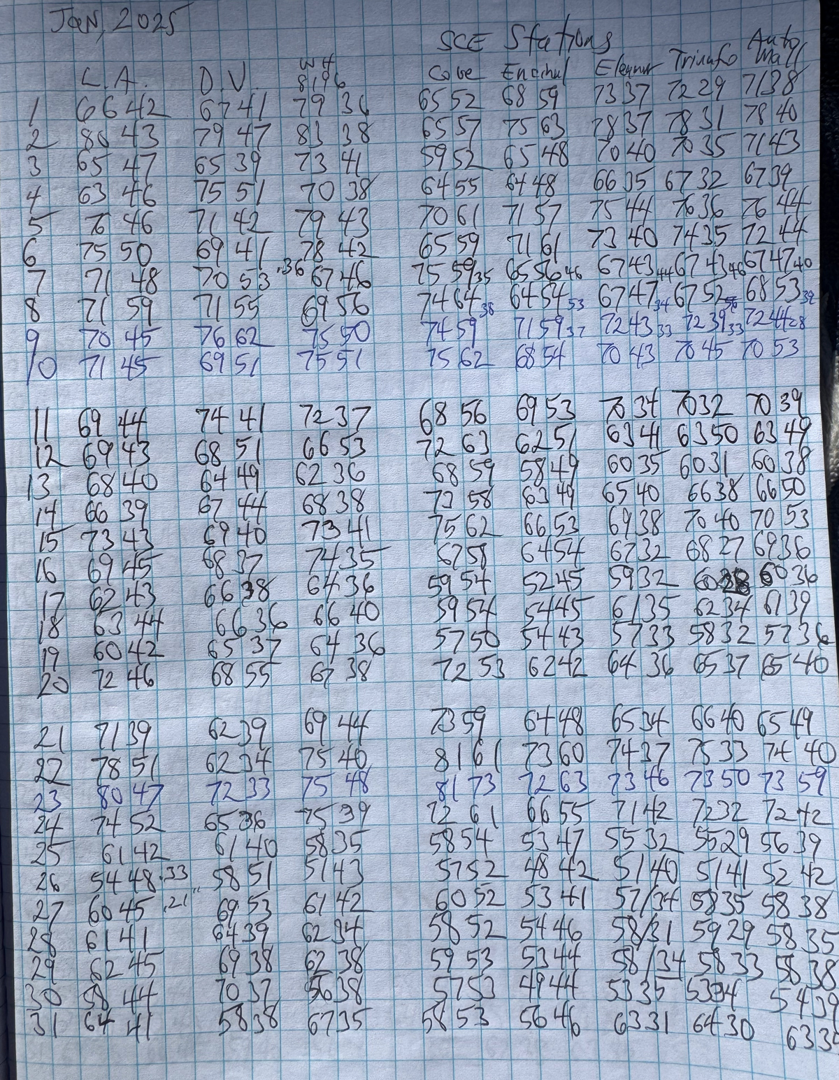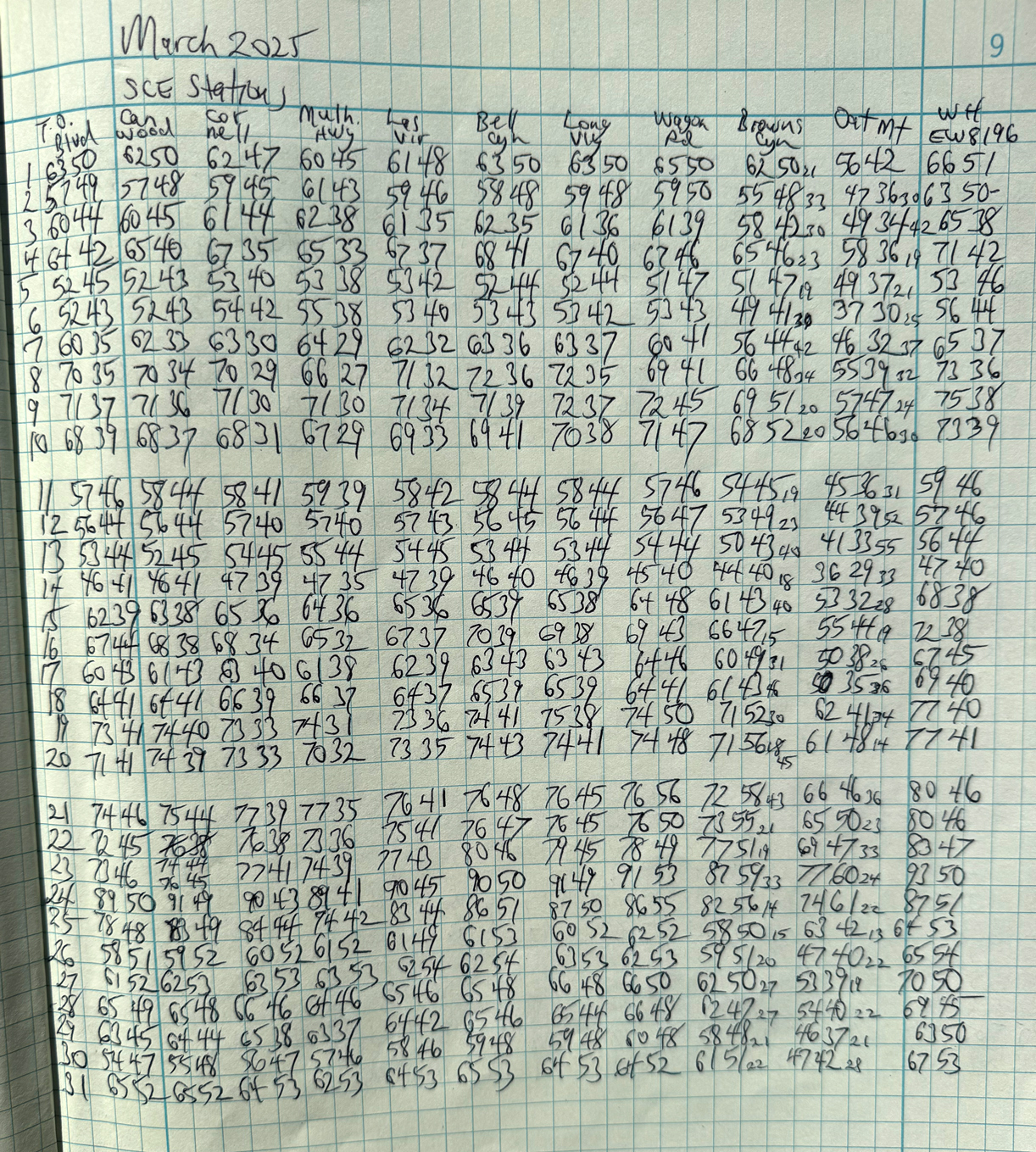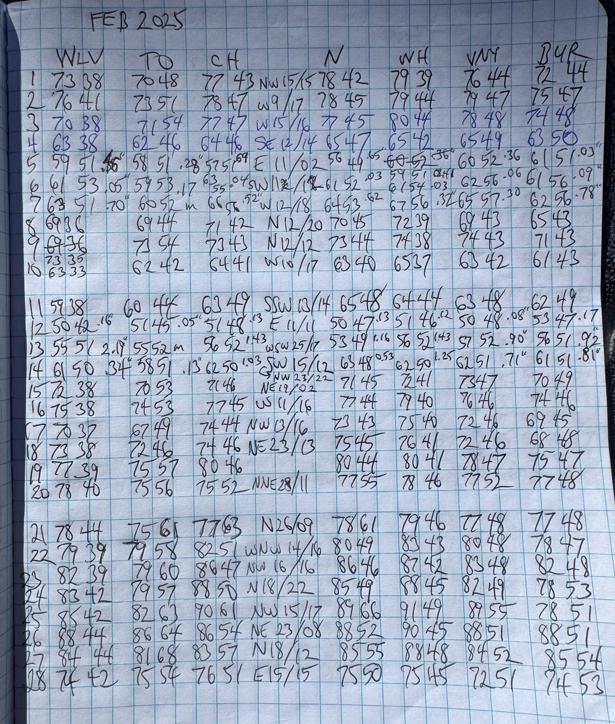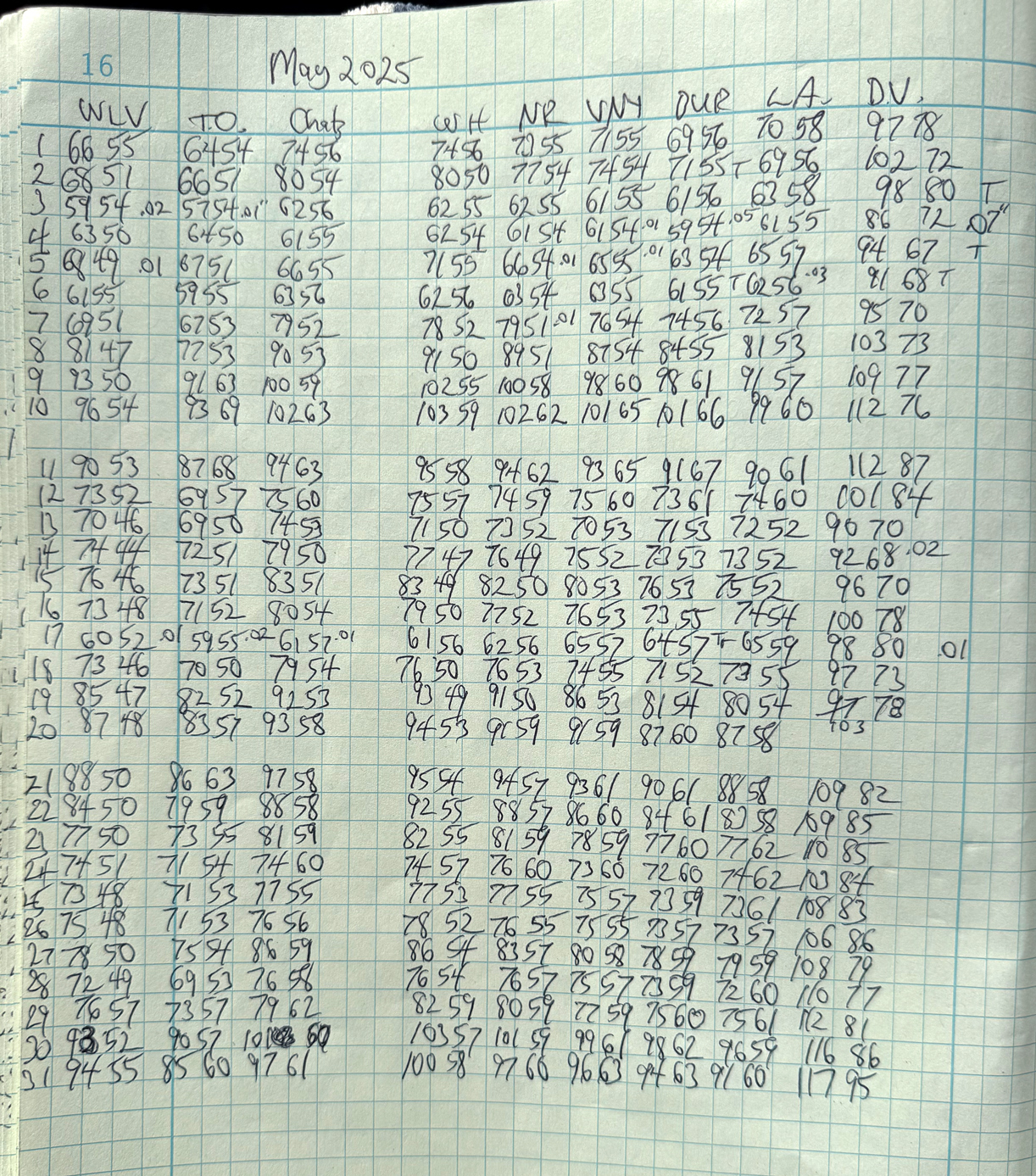 This page contains links to scans of my original hand-written daily weather records from Dec 1997 to about the present (2025 as of now) for Westlake Village primarily. For Dec 1997 to mid 1999 I was in Agoura Hills. Also, this link is for the same daily and monthly records for 1977 to 1997 at Woodland Hills.