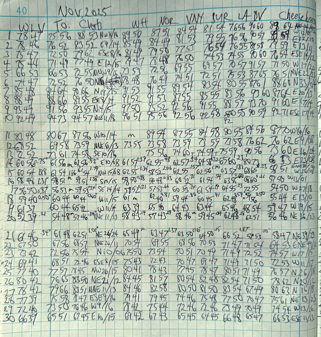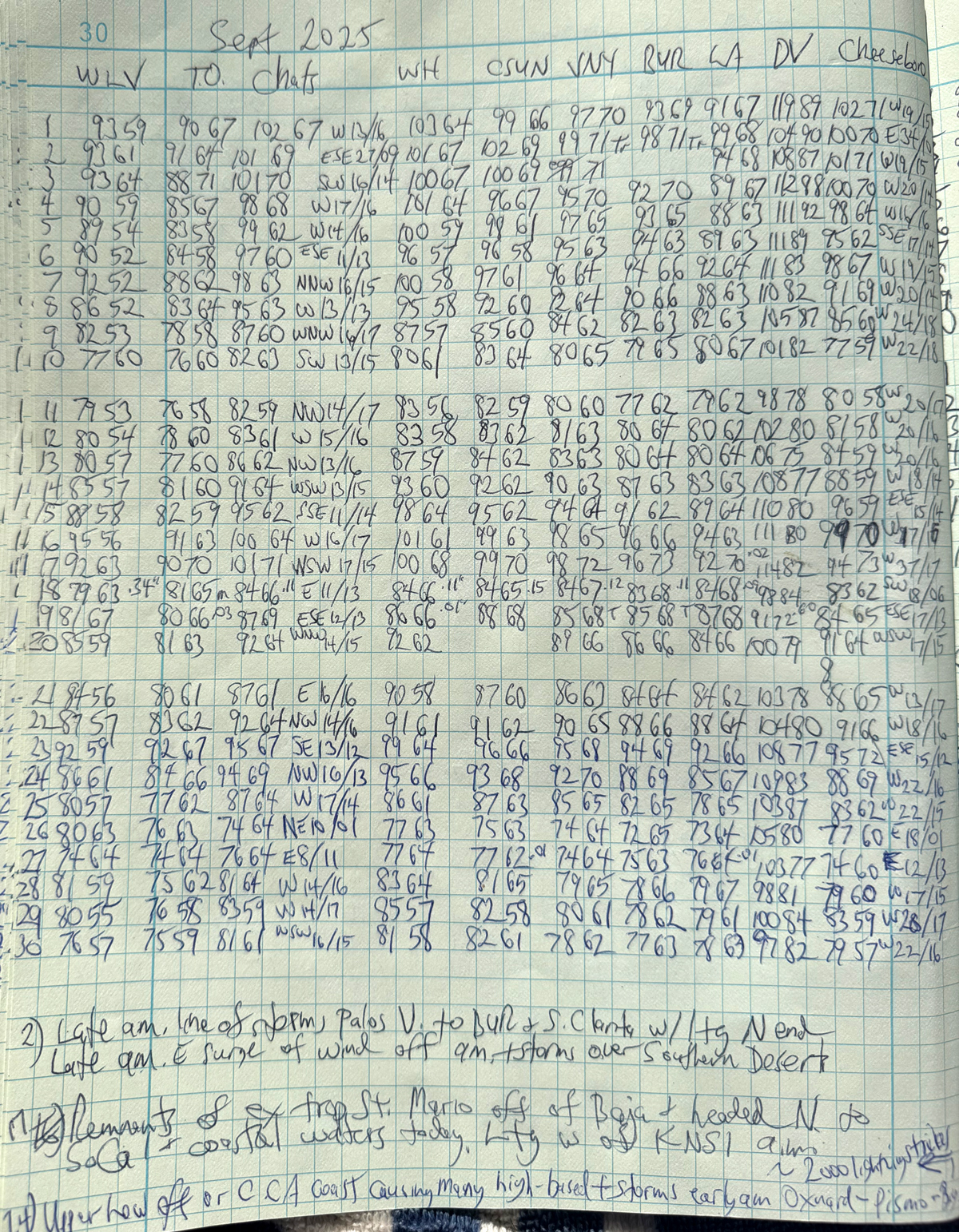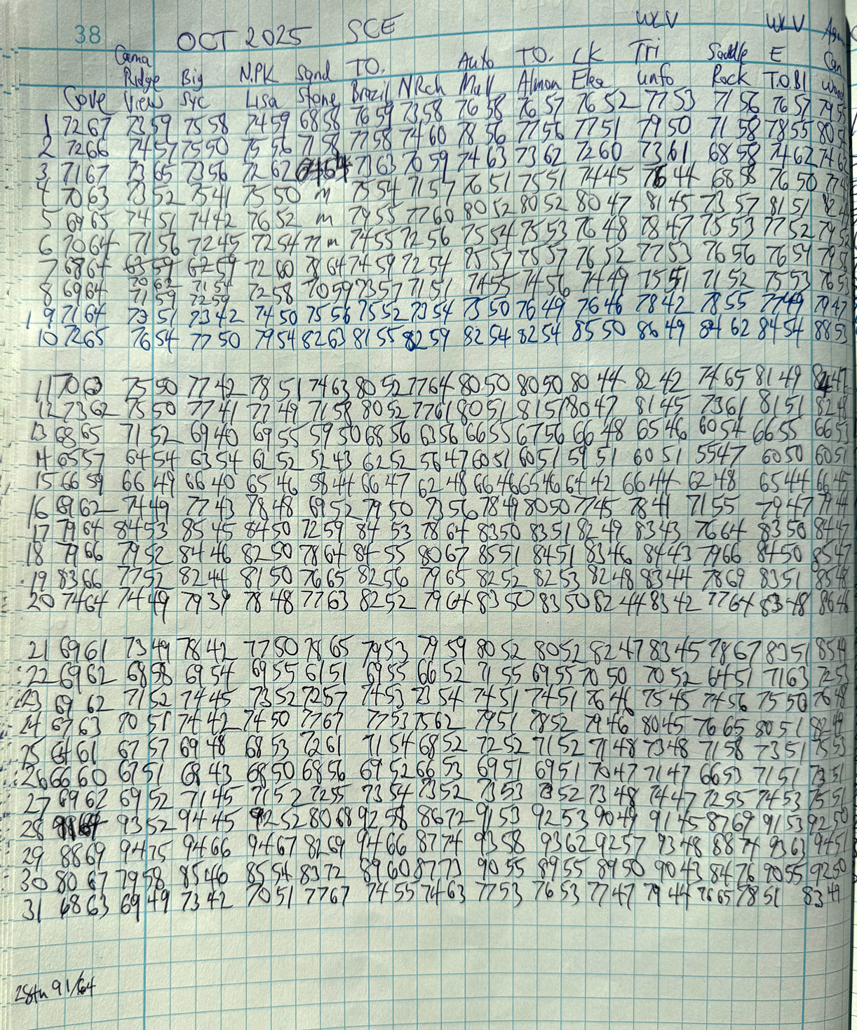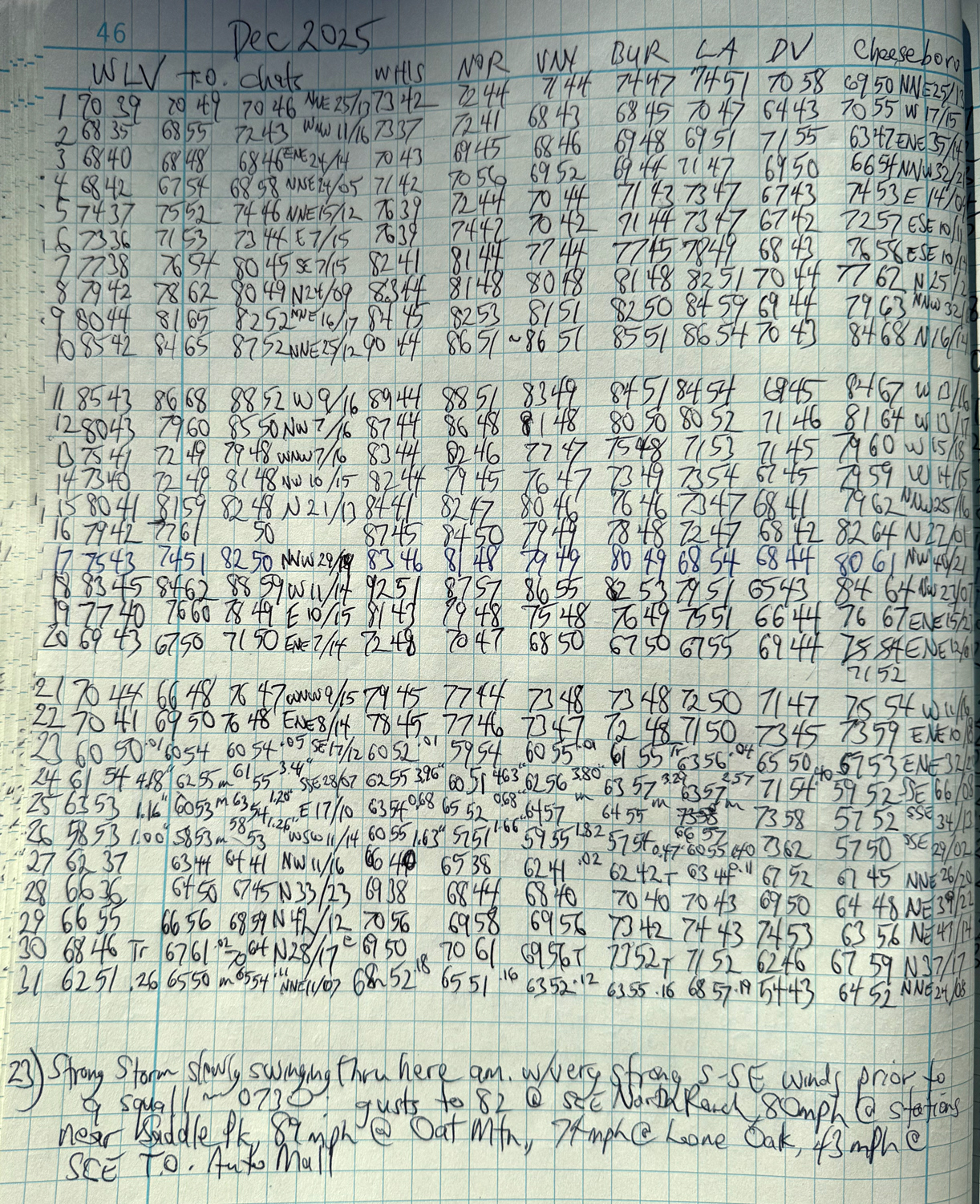 This page contains links to scans of my original hand-written daily weather records from Dec 1997 to about the present (2025 as of now) for Westlake Village primarily. For Dec 1997 to mid 1999 I was in Agoura Hills. Also, this link is for the same daily and monthly records for 1977 to 1997 at Woodland Hills.