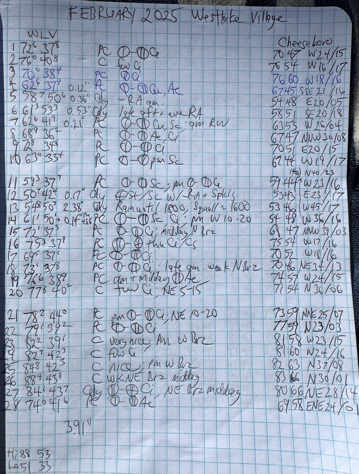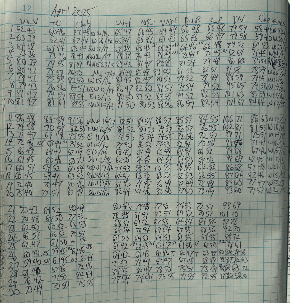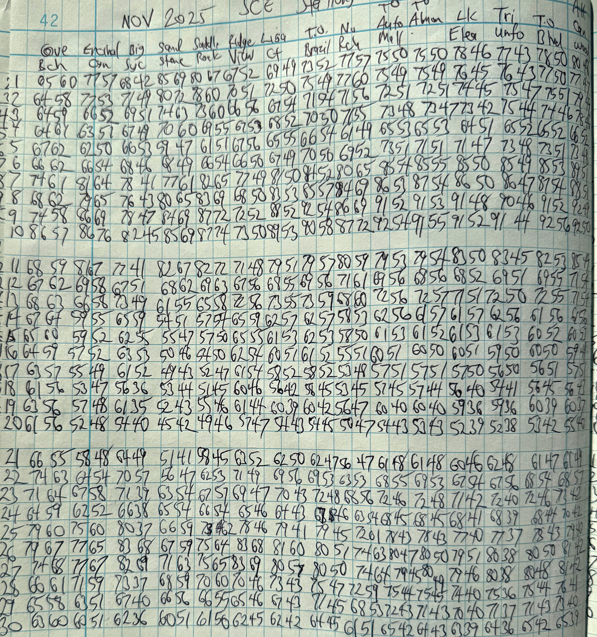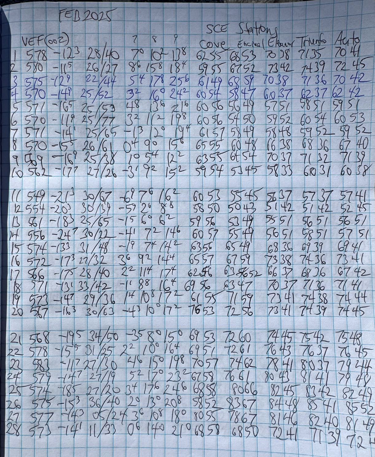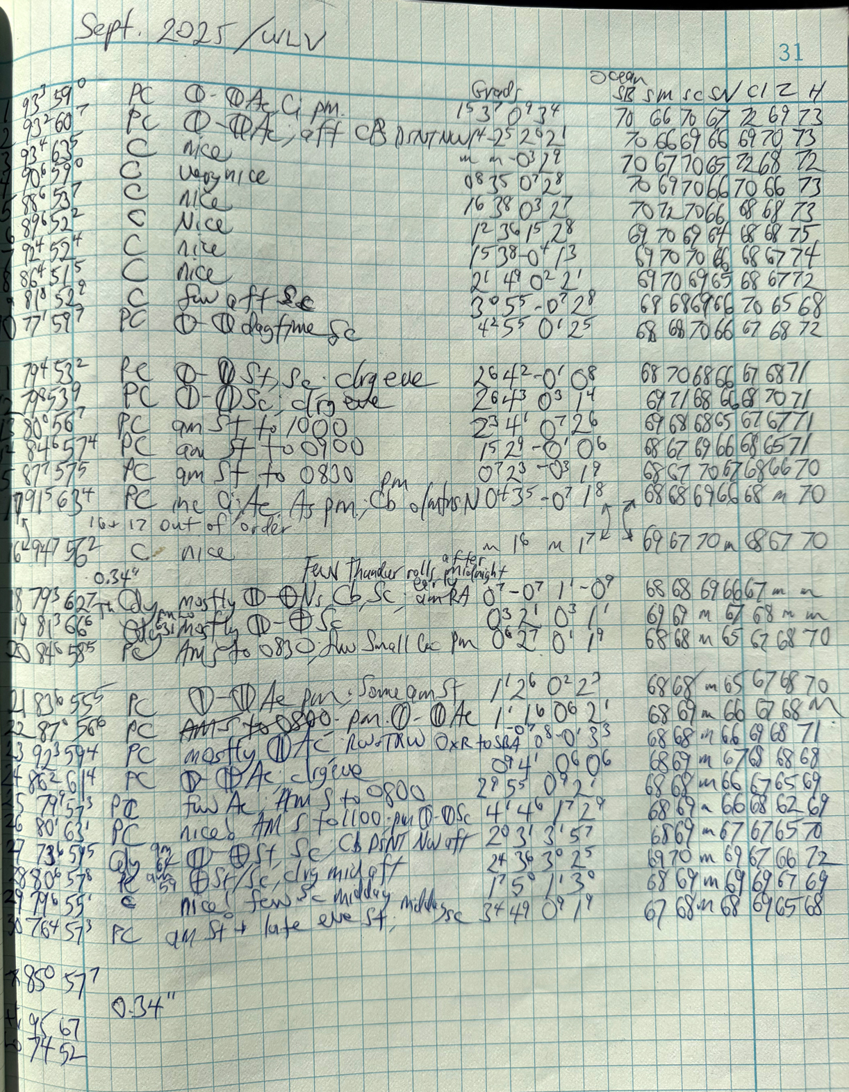 This page contains links to scans of my original hand-written daily weather records from Dec 1997 to about the present (2025 as of now) for Westlake Village primarily. For Dec 1997 to mid 1999 I was in Agoura Hills. Also, this link is for the same daily and monthly records for 1977 to 1997 at Woodland Hills.