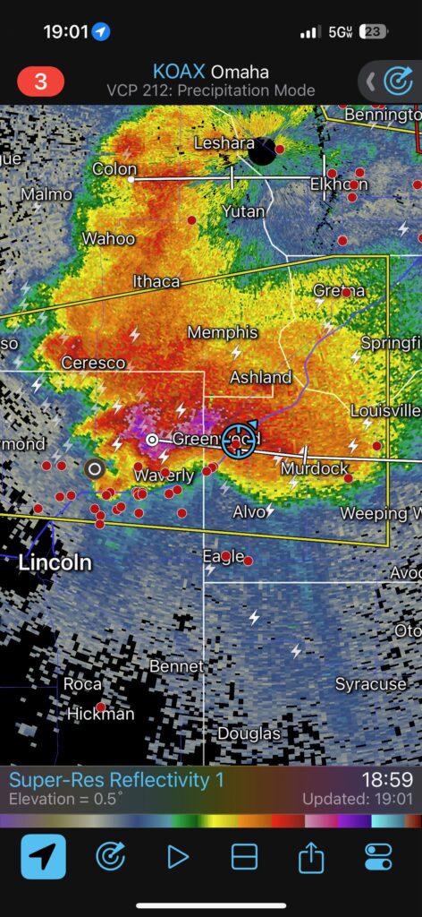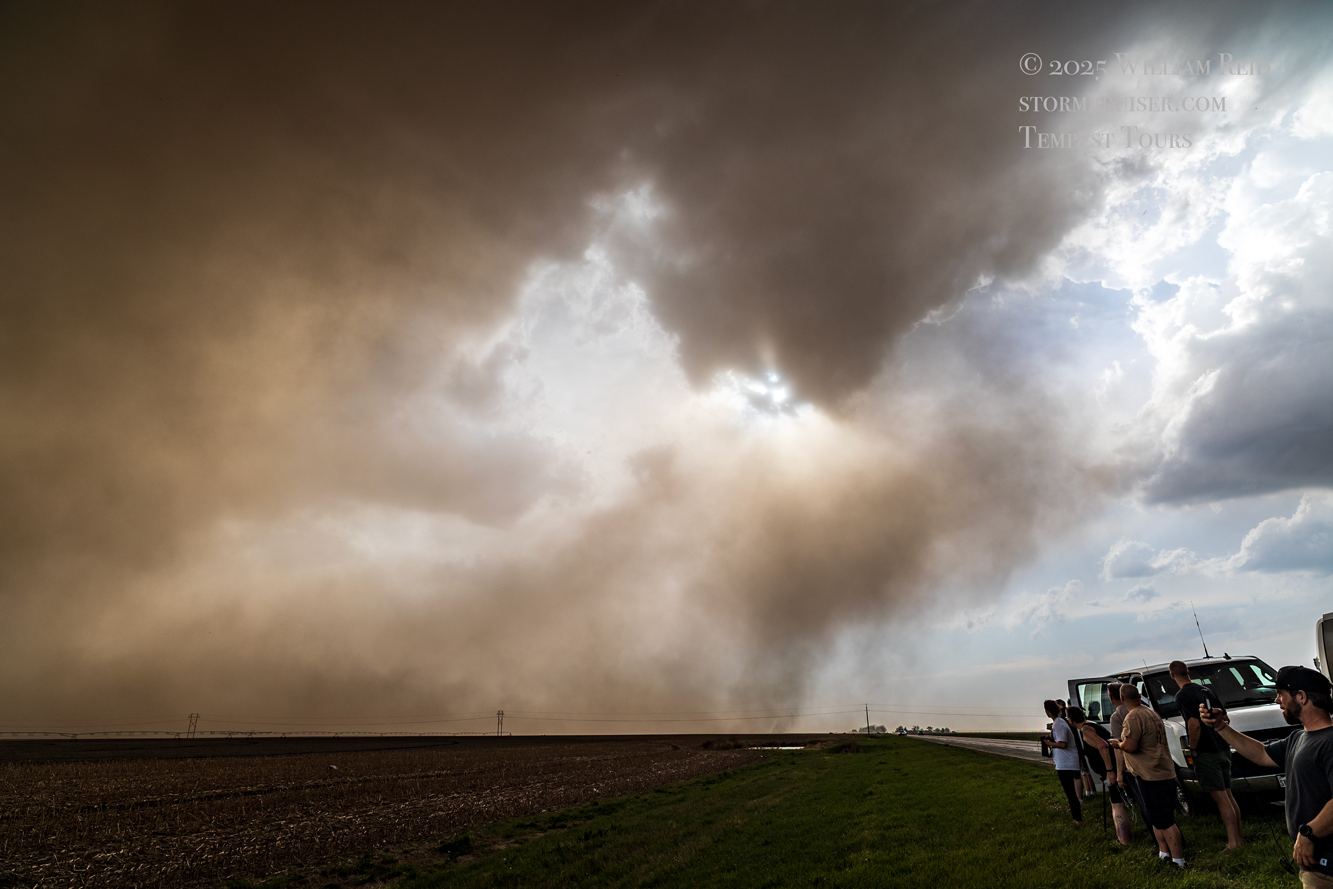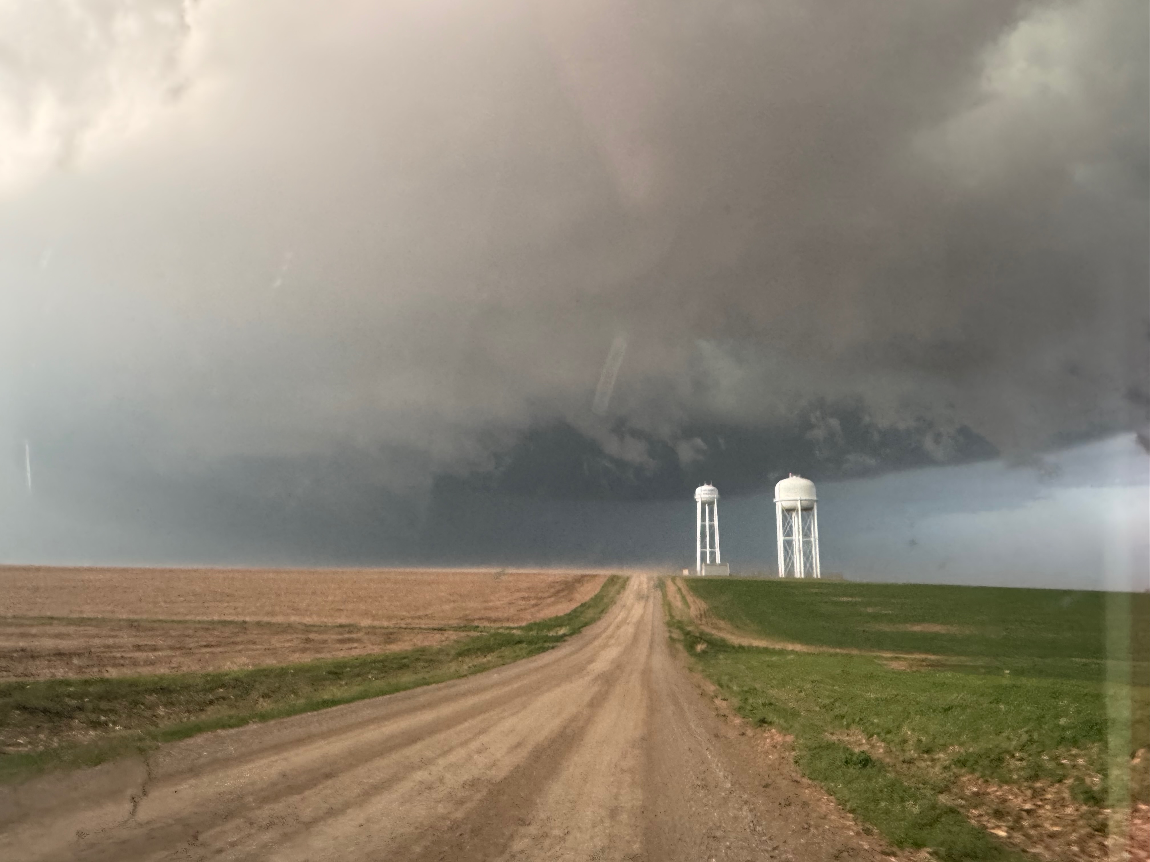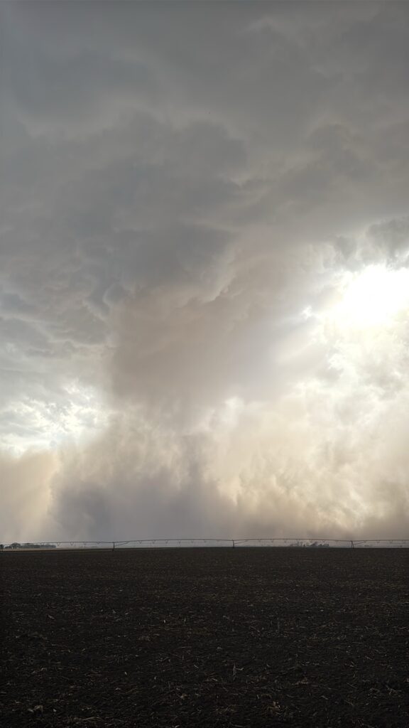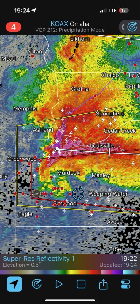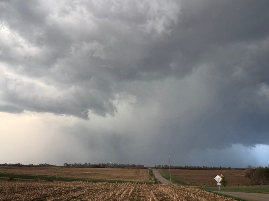 We got ourselves up to I-80 near York in time to watch a big storm or two go up not too far to our west. These were moving eastward. The tail-end one dragged us around the north side of Lincoln, and thereafter was rather active with some weak tornadoes towards the Missouri River. We watched dusty spin-ups in the vicinity of Alvo, Murdock, and Weeping Water. This occurred primarily after 00Z while we were on Fletcher Avenue, west of Weeping Water, in Cass County. There wasn’t much to see with regard to condensed funnel clouds, but the ground was dry enough to allow a lot of dust and dirt to get kicked up beneath the active storm base. At the time, I was not sure if these were legitimate tornadoes or maybe strong gustnadoes. Given where they were with respect to the storm base and RFD, and given their longevity and strength, I think we can say that we observed a tornado or two.