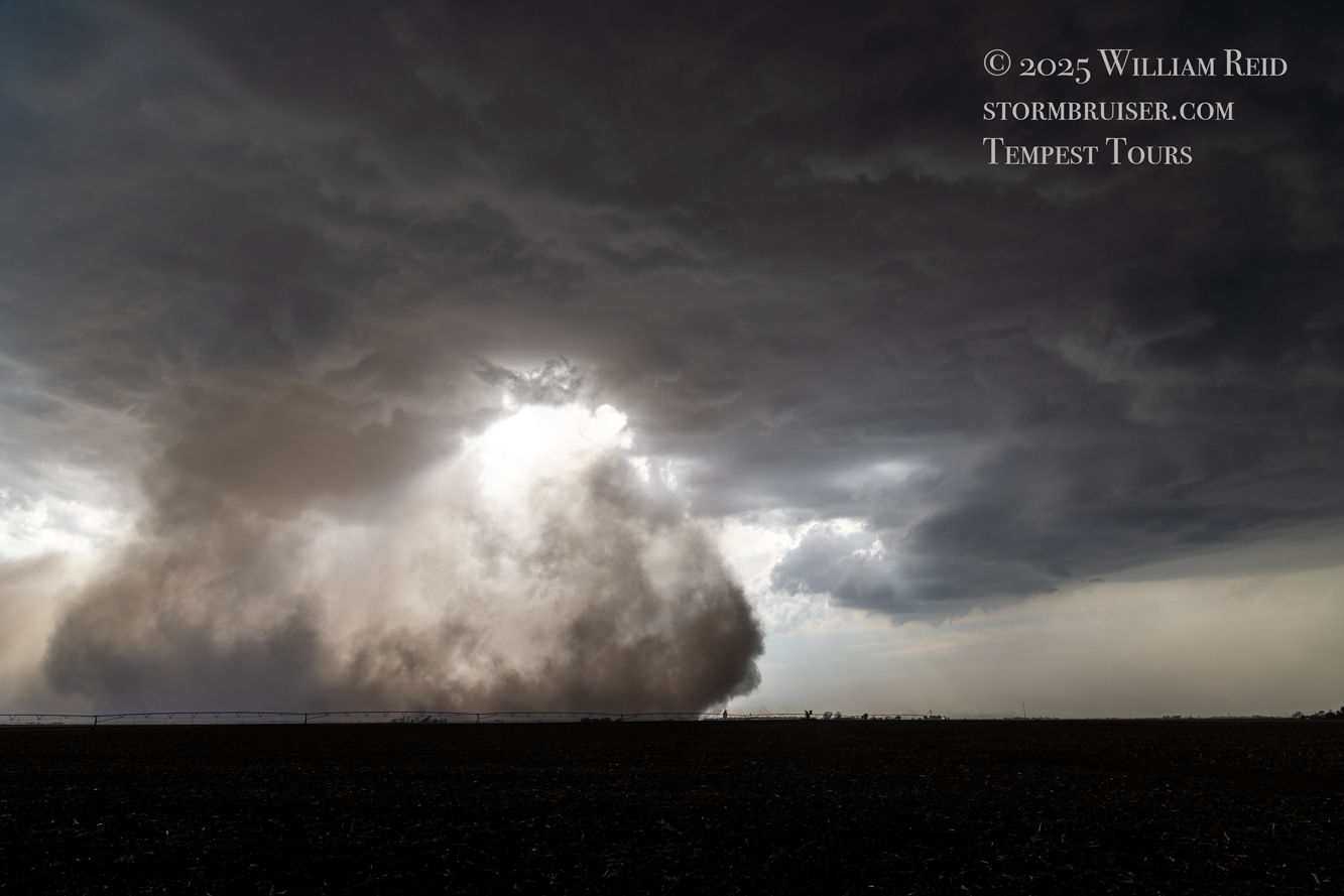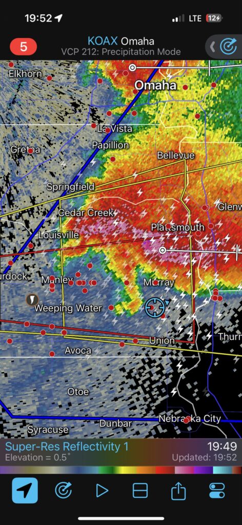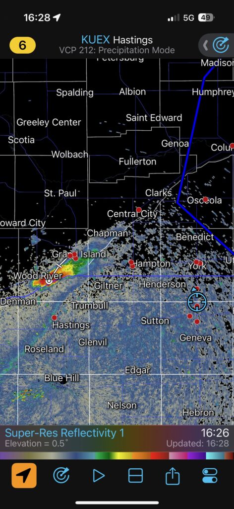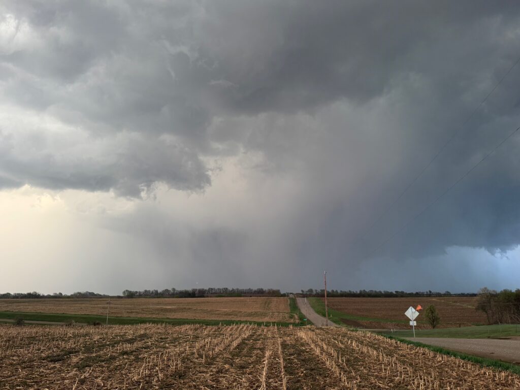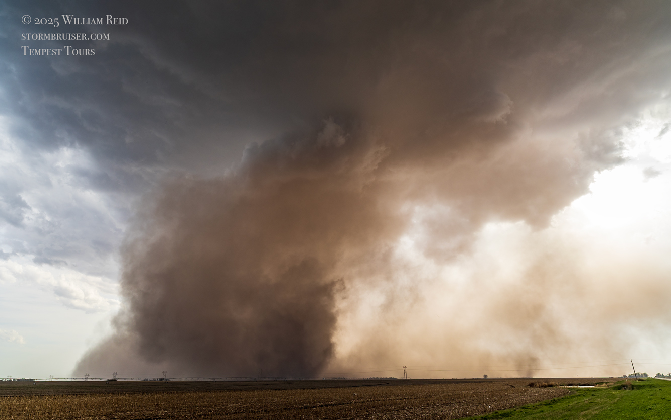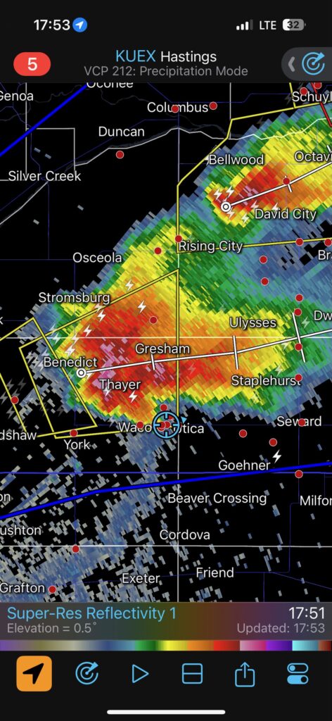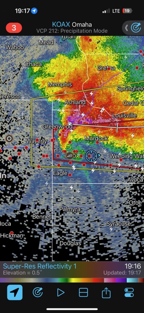 We got ourselves up to I-80 near York in time to watch a big storm or two go up not too far to our west. These were moving eastward. The tail-end one dragged us around the north side of Lincoln, and thereafter was rather active with some weak tornadoes towards the Missouri River. We watched dusty spin-ups in the vicinity of Alvo, Murdock, and Weeping Water. This occurred primarily after 00Z while we were on Fletcher Avenue, west of Weeping Water, in Cass County. There wasn’t much to see with regard to condensed funnel clouds, but the ground was dry enough to allow a lot of dust and dirt to get kicked up beneath the active storm base. At the time, I was not sure if these were legitimate tornadoes or maybe strong gustnadoes. Given where they were with respect to the storm base and RFD, and given their longevity and strength, I think we can say that we observed a tornado or two.