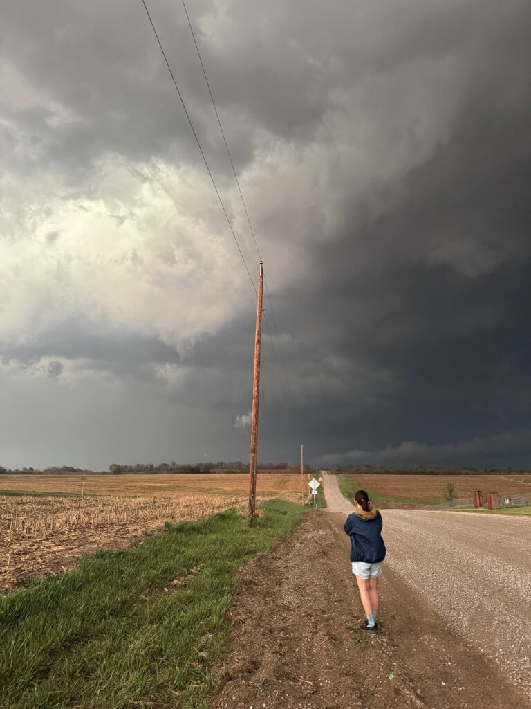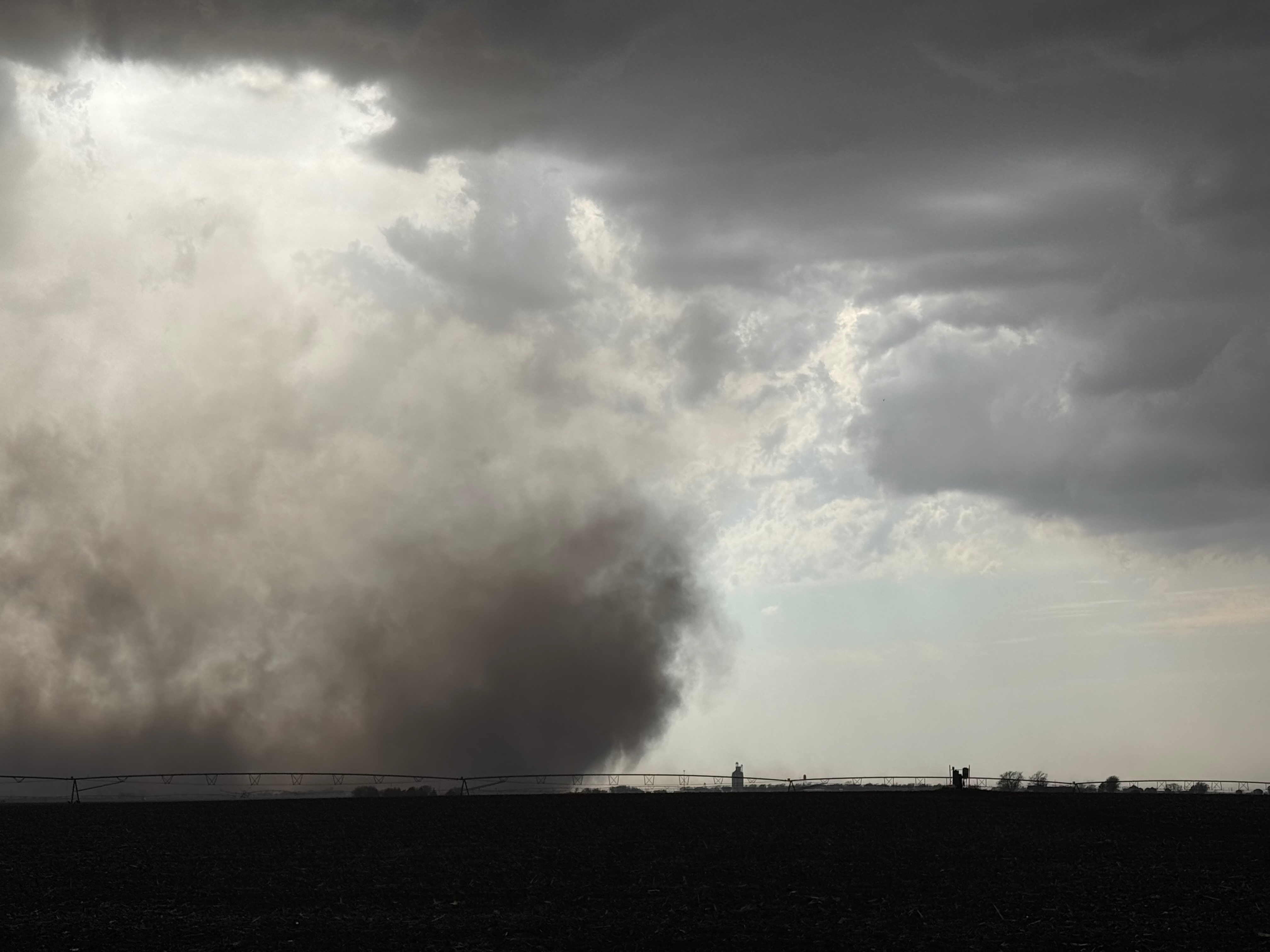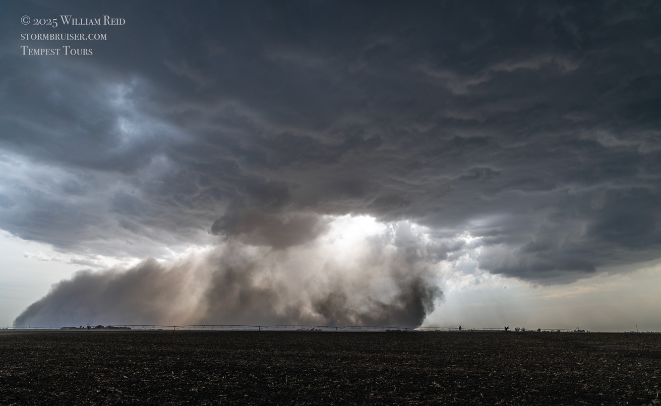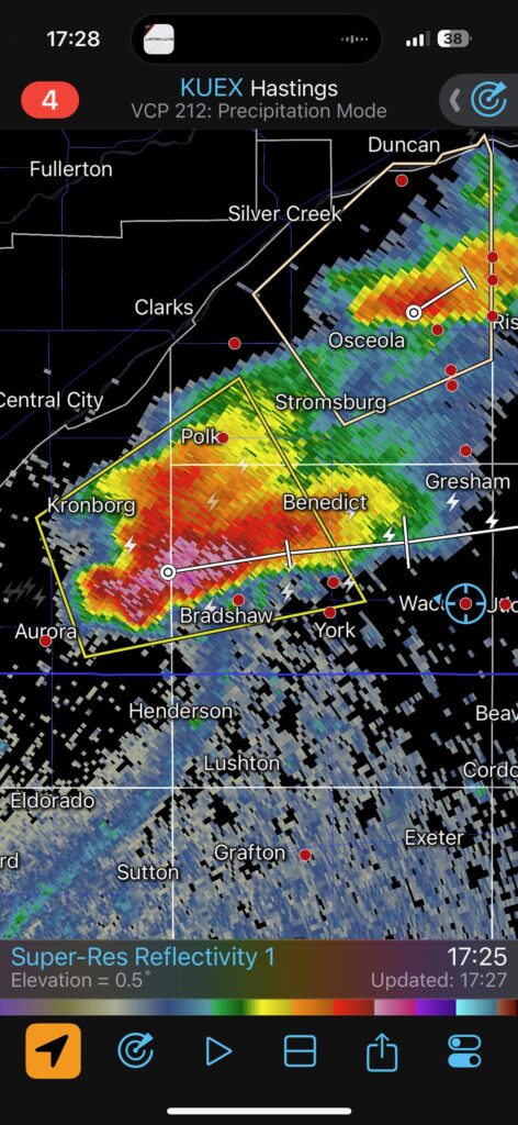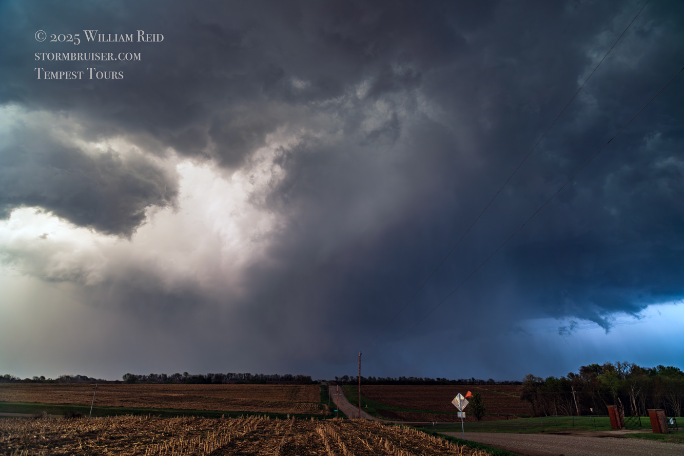 We got ourselves up to I-80 near York in time to watch a big storm or two go up not too far to our west. These were moving eastward. The tail-end one dragged us around the north side of Lincoln, and thereafter was rather active with some weak tornadoes towards the Missouri River. We watched dusty spin-ups in the vicinity of Alvo, Murdock, and Weeping Water. This occurred primarily after 00Z while we were on Fletcher Avenue, west of Weeping Water, in Cass County. There wasn’t much to see with regard to condensed funnel clouds, but the ground was dry enough to allow a lot of dust and dirt to get kicked up beneath the active storm base. At the time, I was not sure if these were legitimate tornadoes or maybe strong gustnadoes. Given where they were with respect to the storm base and RFD, and given their longevity and strength, I think we can say that we observed a tornado or two.