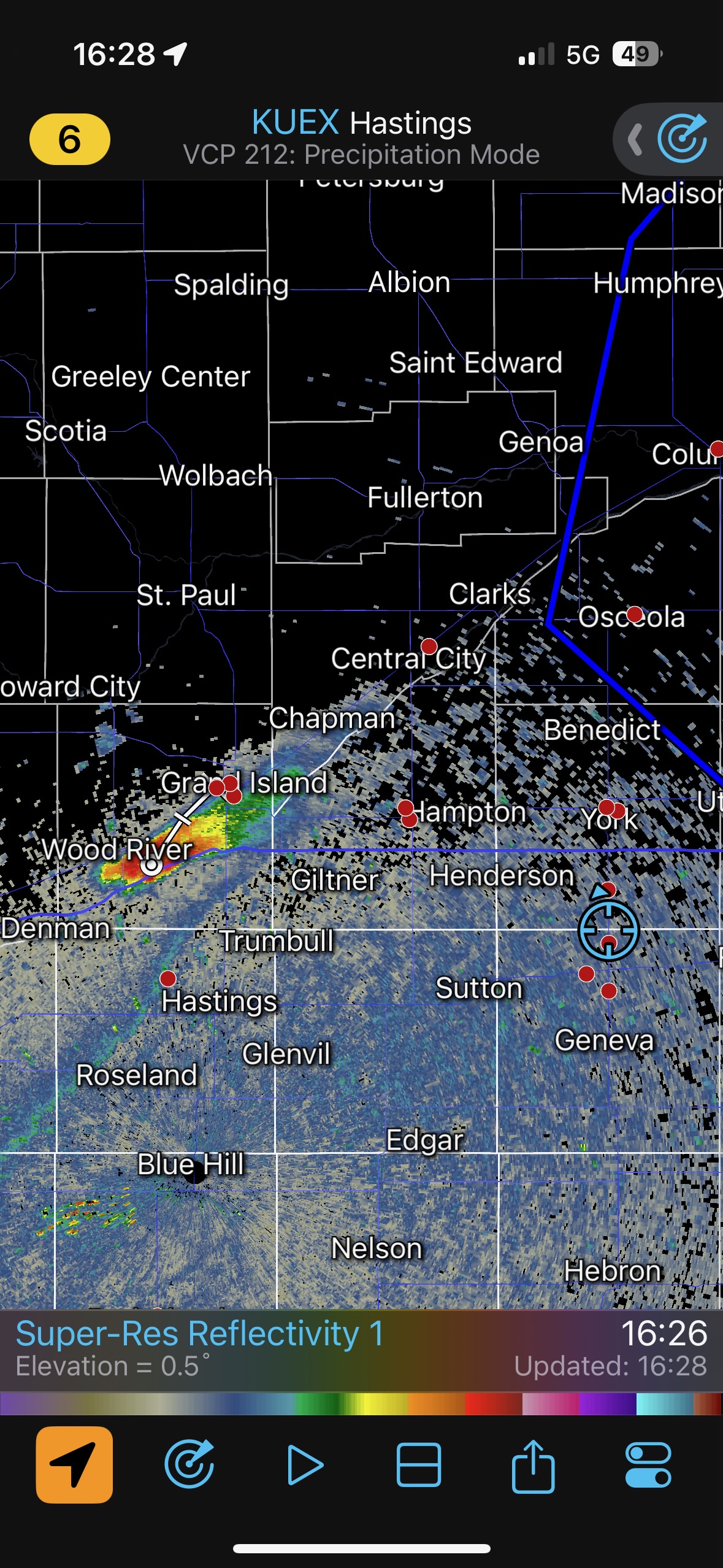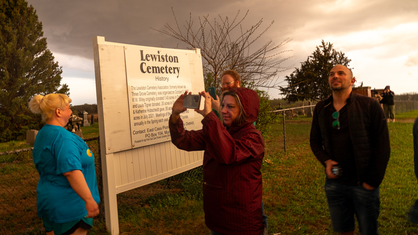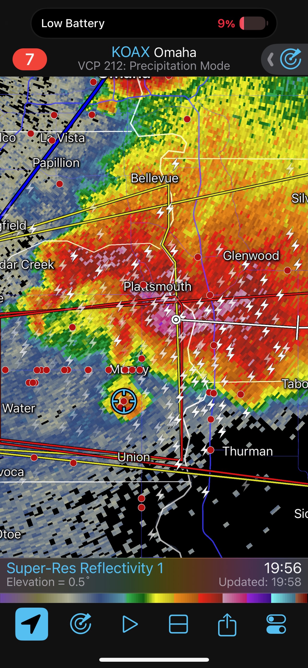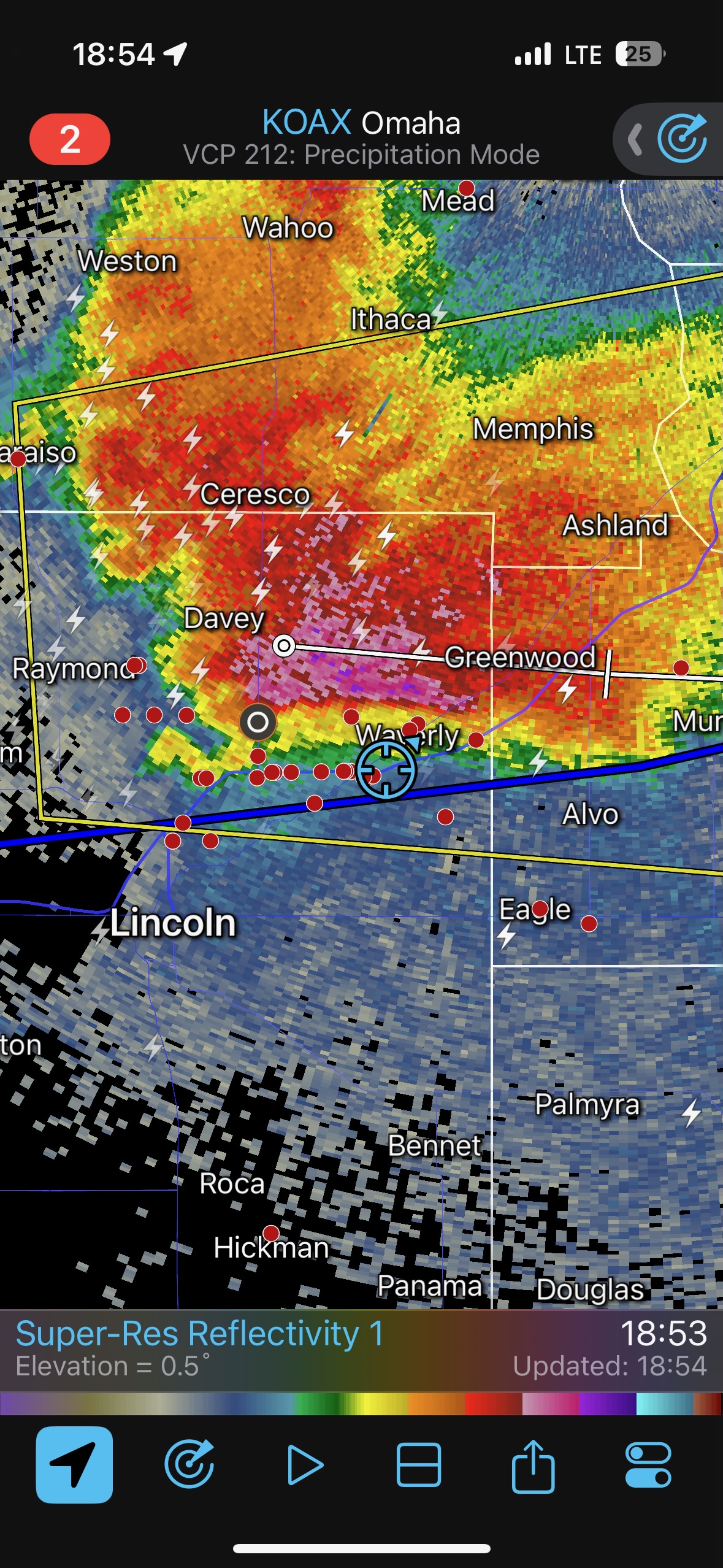 We got ourselves up to I-80 near York in time to watch a big storm or two go up not too far to our west. These were moving eastward. The tail-end one dragged us around the north side of Lincoln, and thereafter was rather active with some weak tornadoes towards the Missouri River. We watched dusty spin-ups in the vicinity of Alvo, Murdock, and Weeping Water. This occurred primarily after 00Z while we were on Fletcher Avenue, west of Weeping Water, in Cass County. There wasn’t much to see with regard to condensed funnel clouds, but the ground was dry enough to allow a lot of dust and dirt to get kicked up beneath the active storm base. At the time, I was not sure if these were legitimate tornadoes or maybe strong gustnadoes. Given where they were with respect to the storm base and RFD, and given their longevity and strength, I think we can say that we observed a tornado or two.