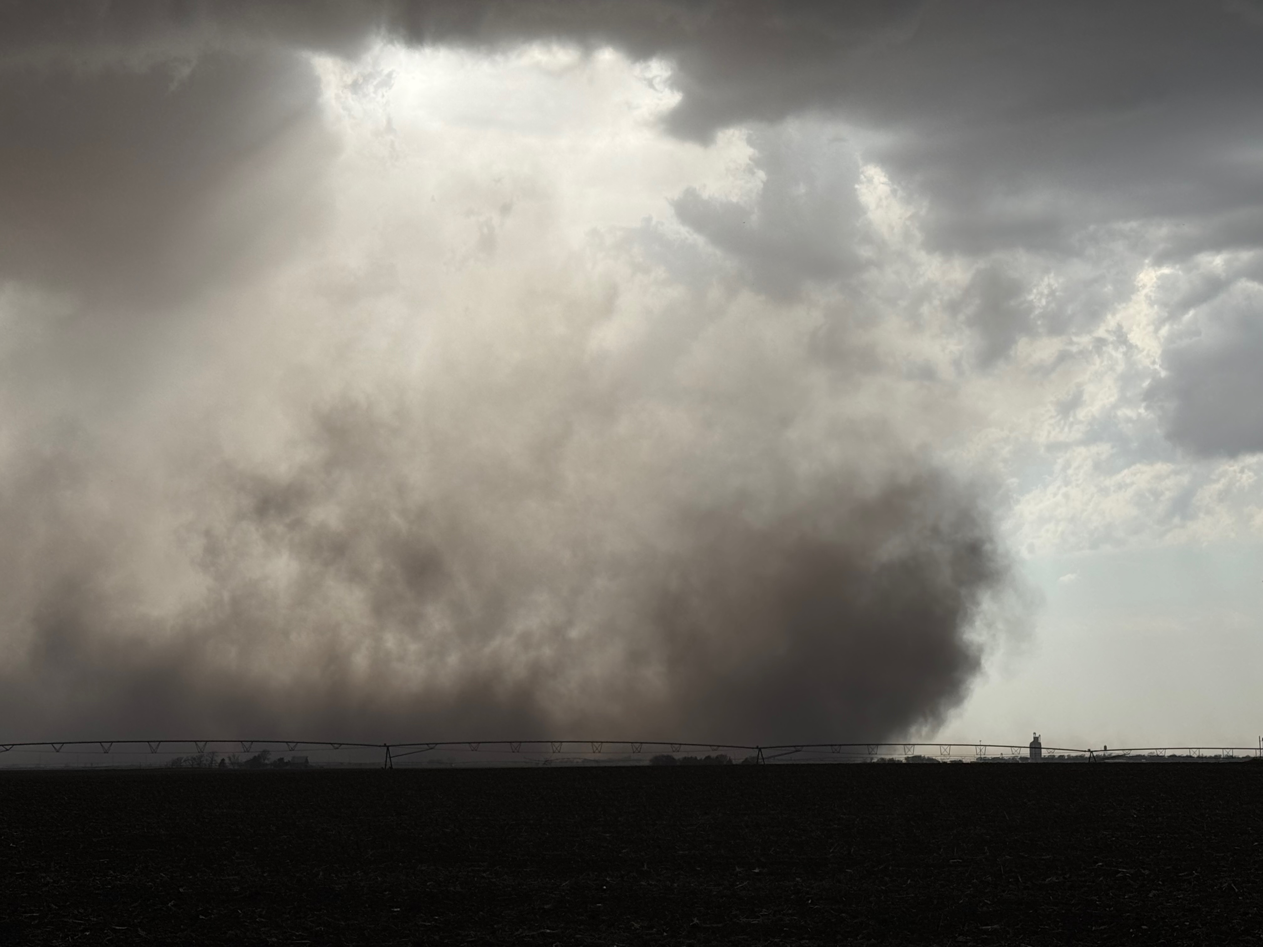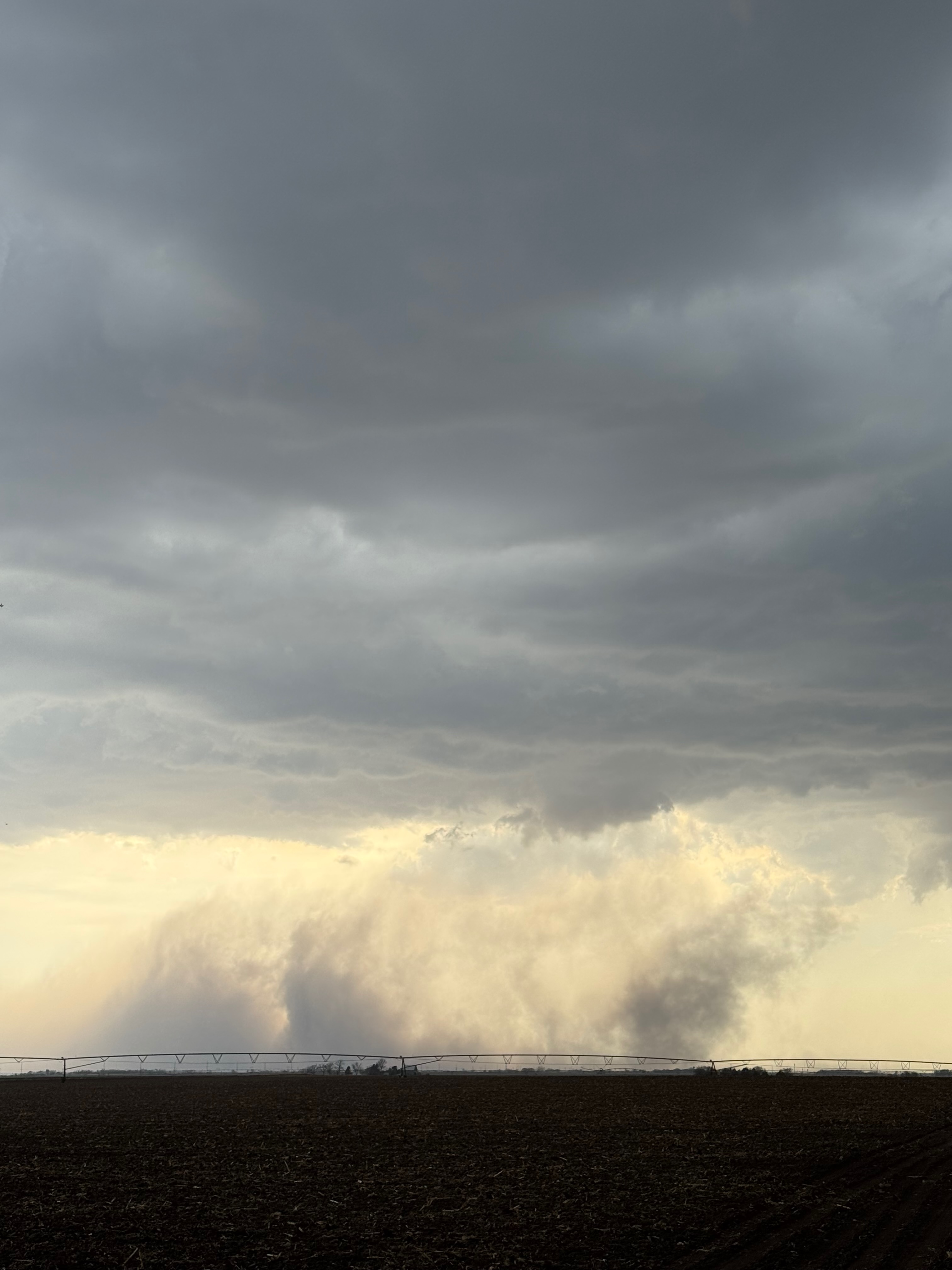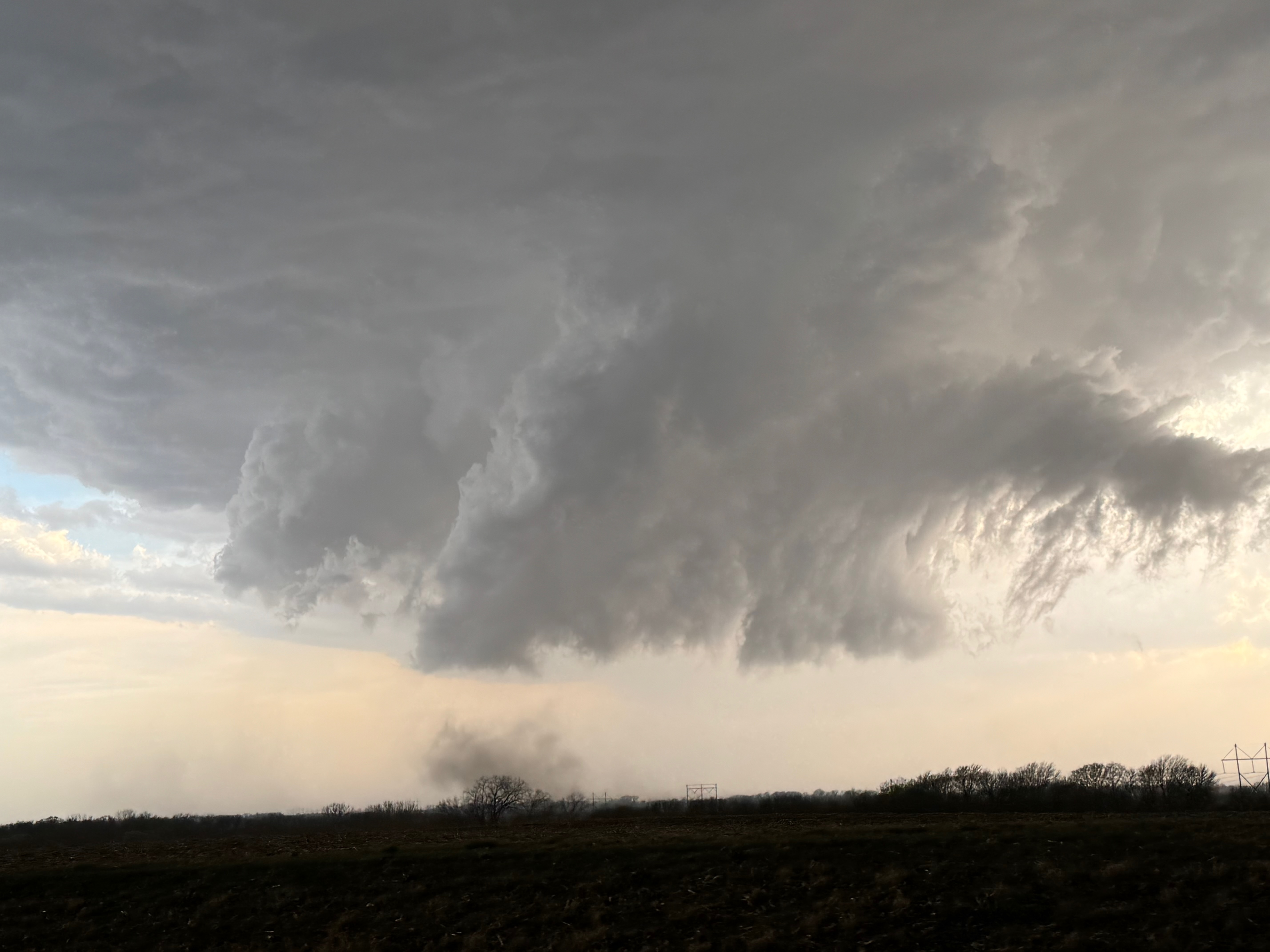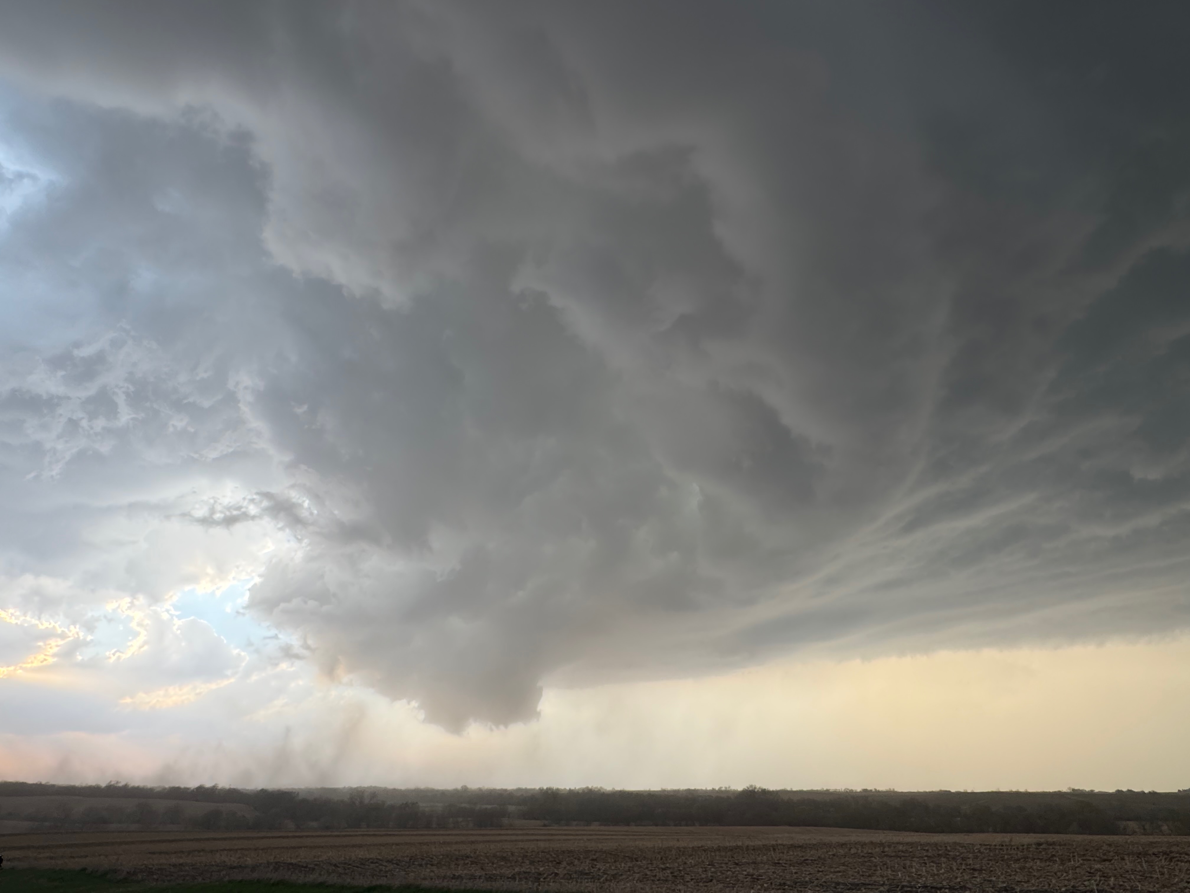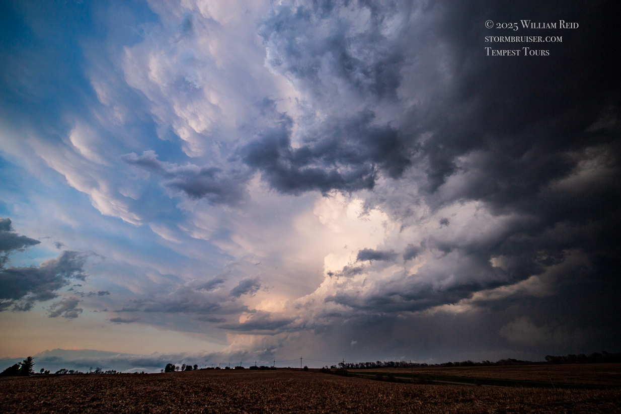 The environment for tornado-making was expected to get a little better around the Missouri River and into Iowa a county or two as a low-level jet kicked in around sunset. We stayed with the supercell to U.S. 75, but ran out of daylight and roads as the storm crossed the river. Some of my shots towards the east at dusk (below) showed suspicious stuff going on beneath the storm base, at the same time that Iowa spotters and chasers were reporting tornadoes. We were unable to stay close as the river crossings we required were not available.