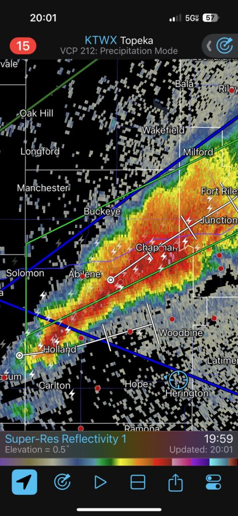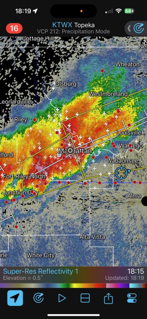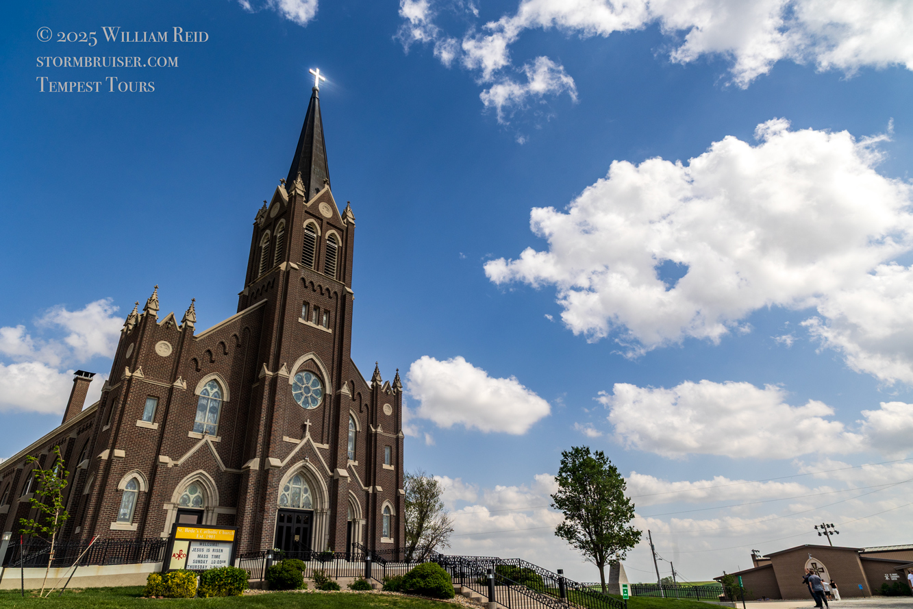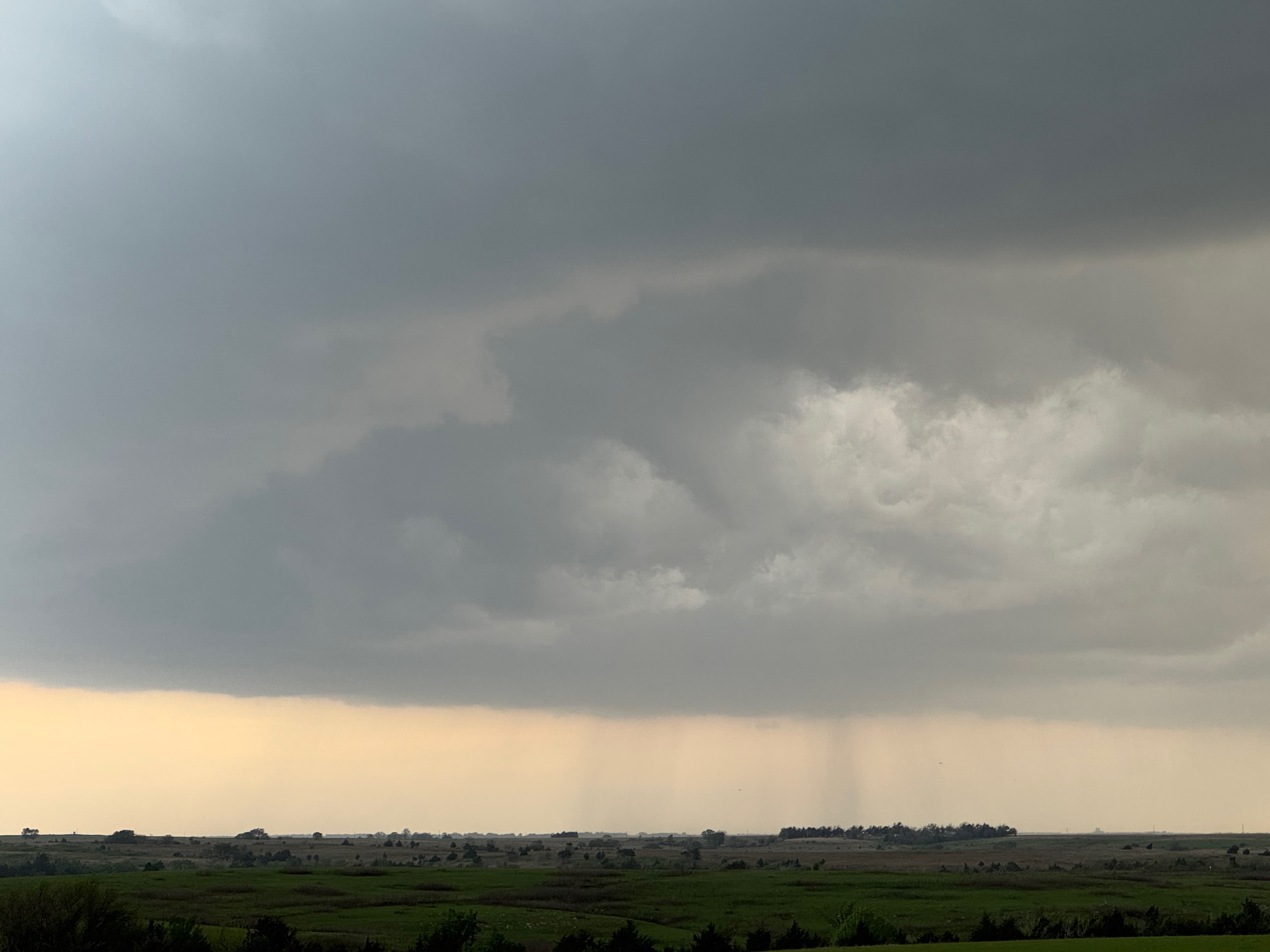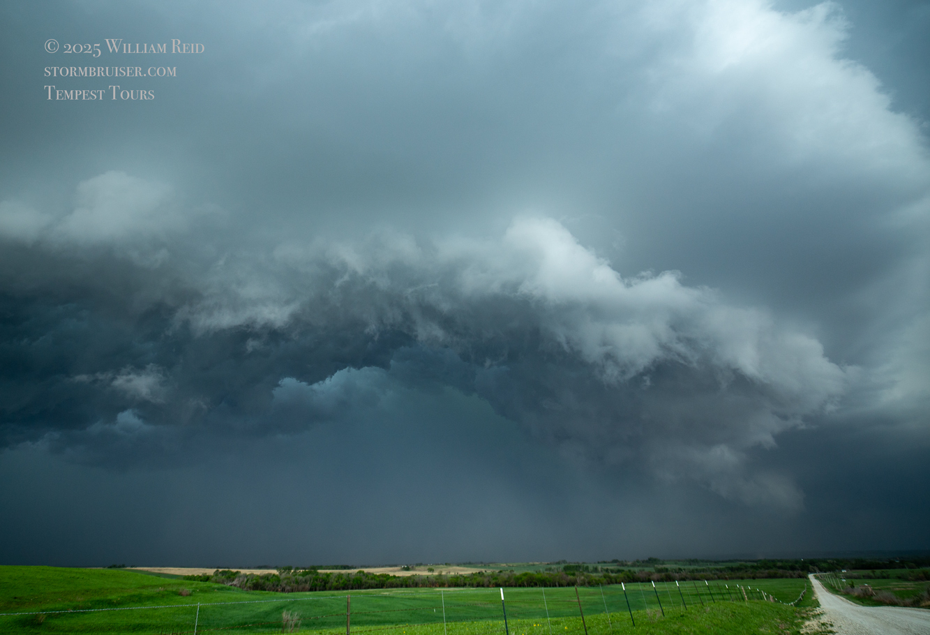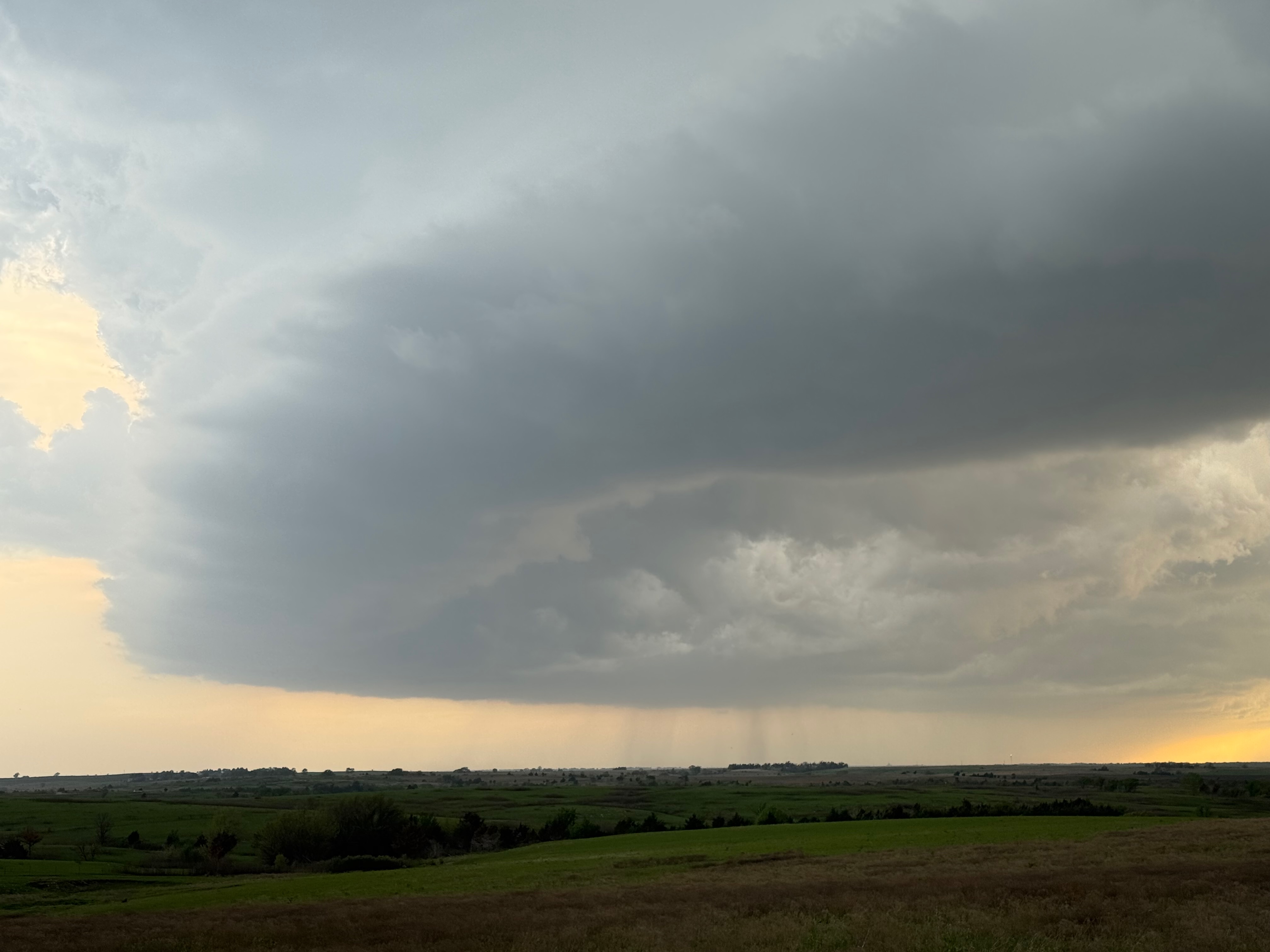 We had time to kill at a cool old church in Kelly, KS (near Seneca), and were then drawn southward towards strong development along the front near Manhattan. We positioned near Wamego and Waubaunsee and viewed some storm structure along the leading edge of activity that was moving to the northeast. This stuff already looked rather linear and was undercut. There was an inflection point here and there with an associated lowering. I didn’t see anything close to a tornado.