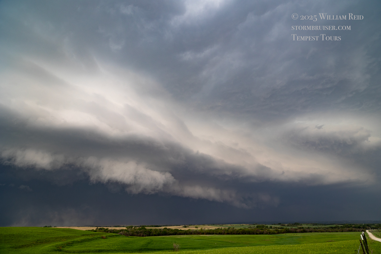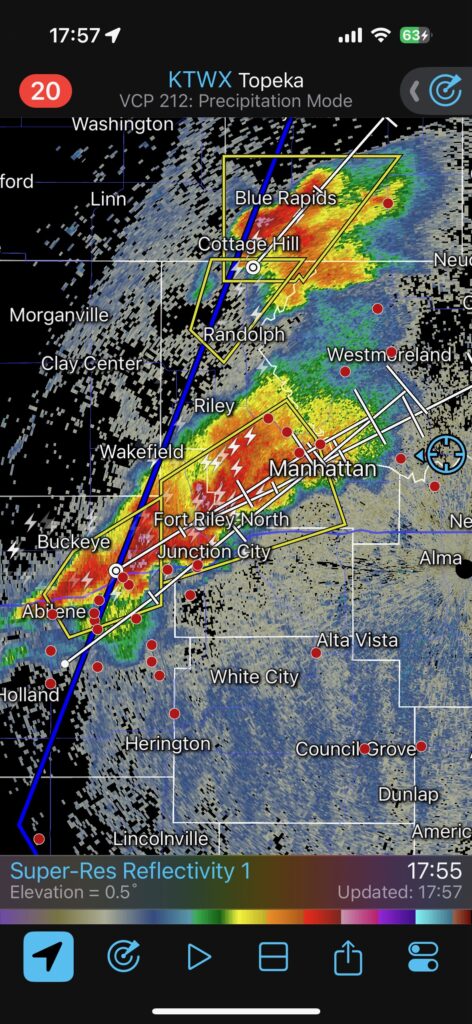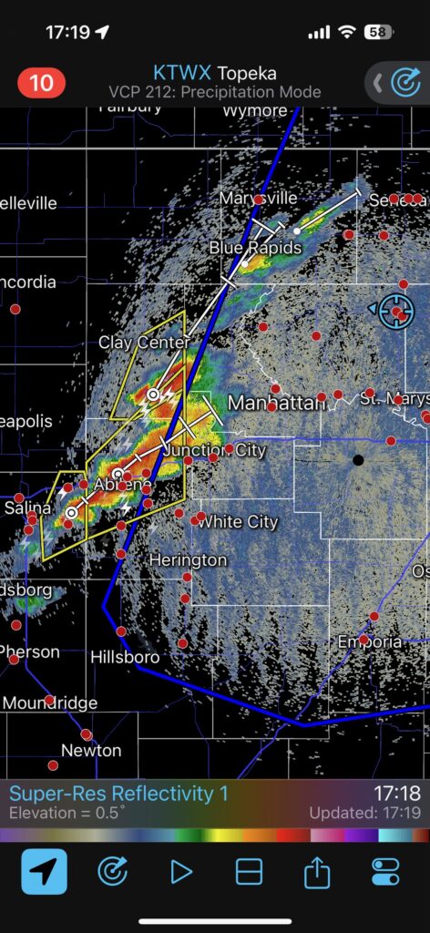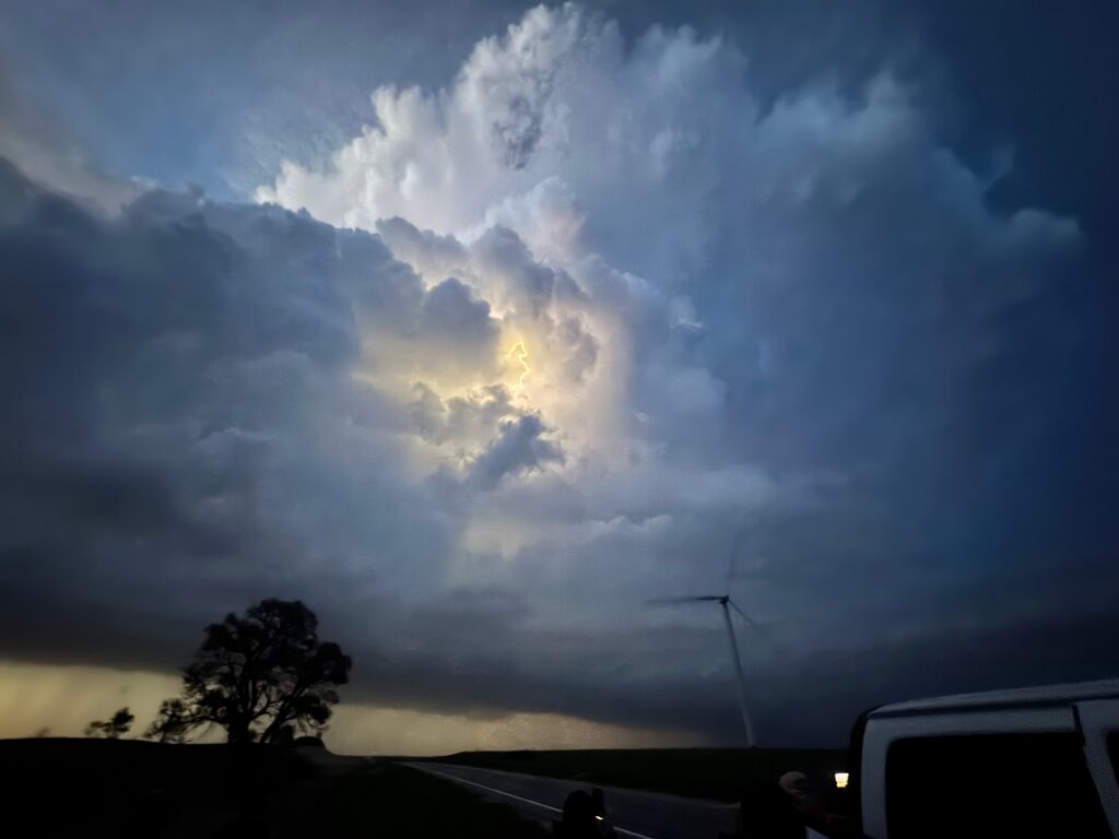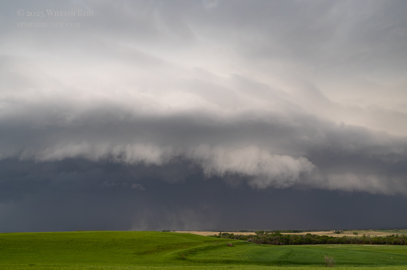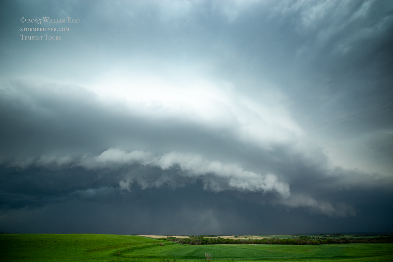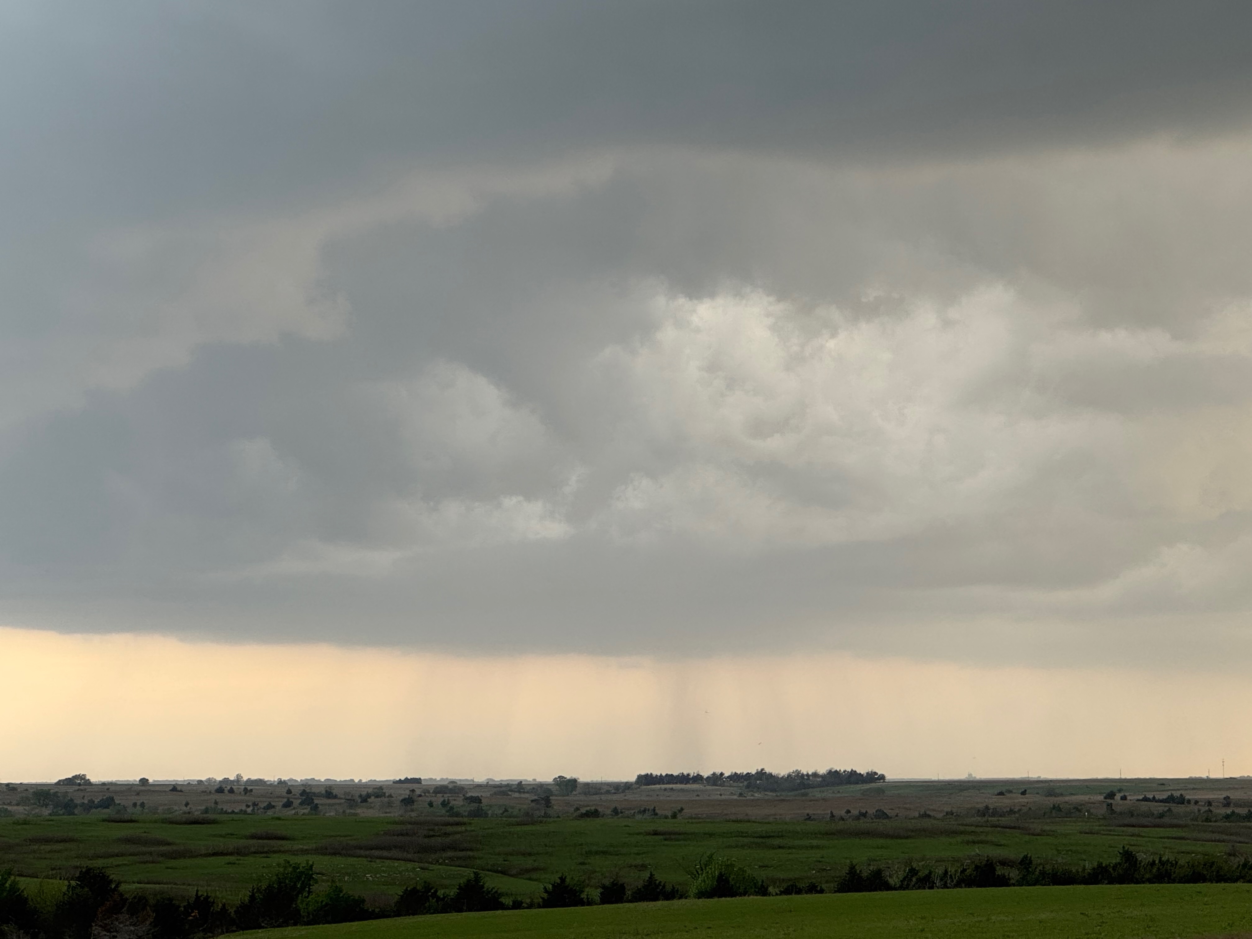 We had time to kill at a cool old church in Kelly, KS (near Seneca), and were then drawn southward towards strong development along the front near Manhattan. We positioned near Wamego and Waubaunsee and viewed some storm structure along the leading edge of activity that was moving to the northeast. This stuff already looked rather linear and was undercut. There was an inflection point here and there with an associated lowering. I didn’t see anything close to a tornado.