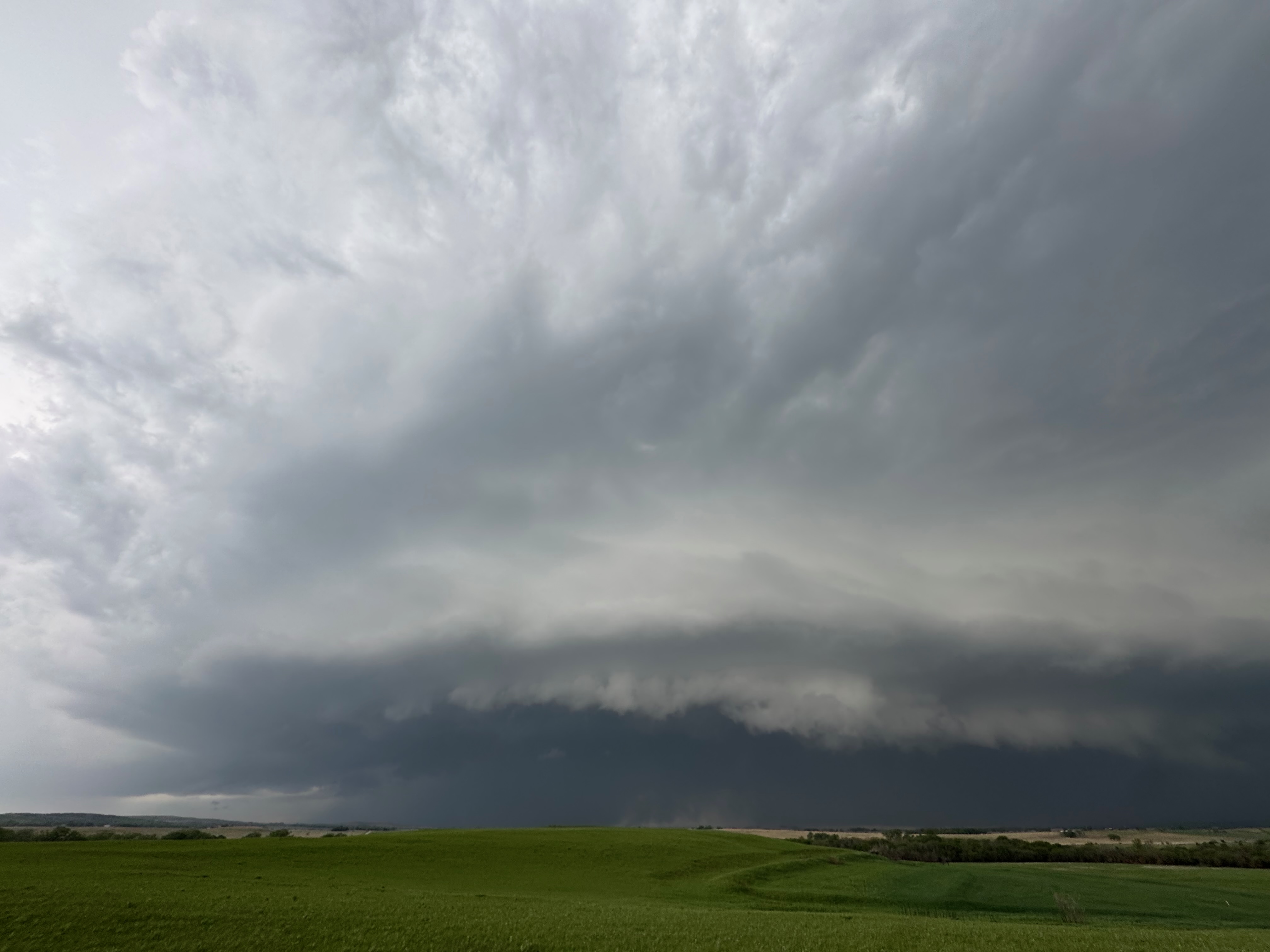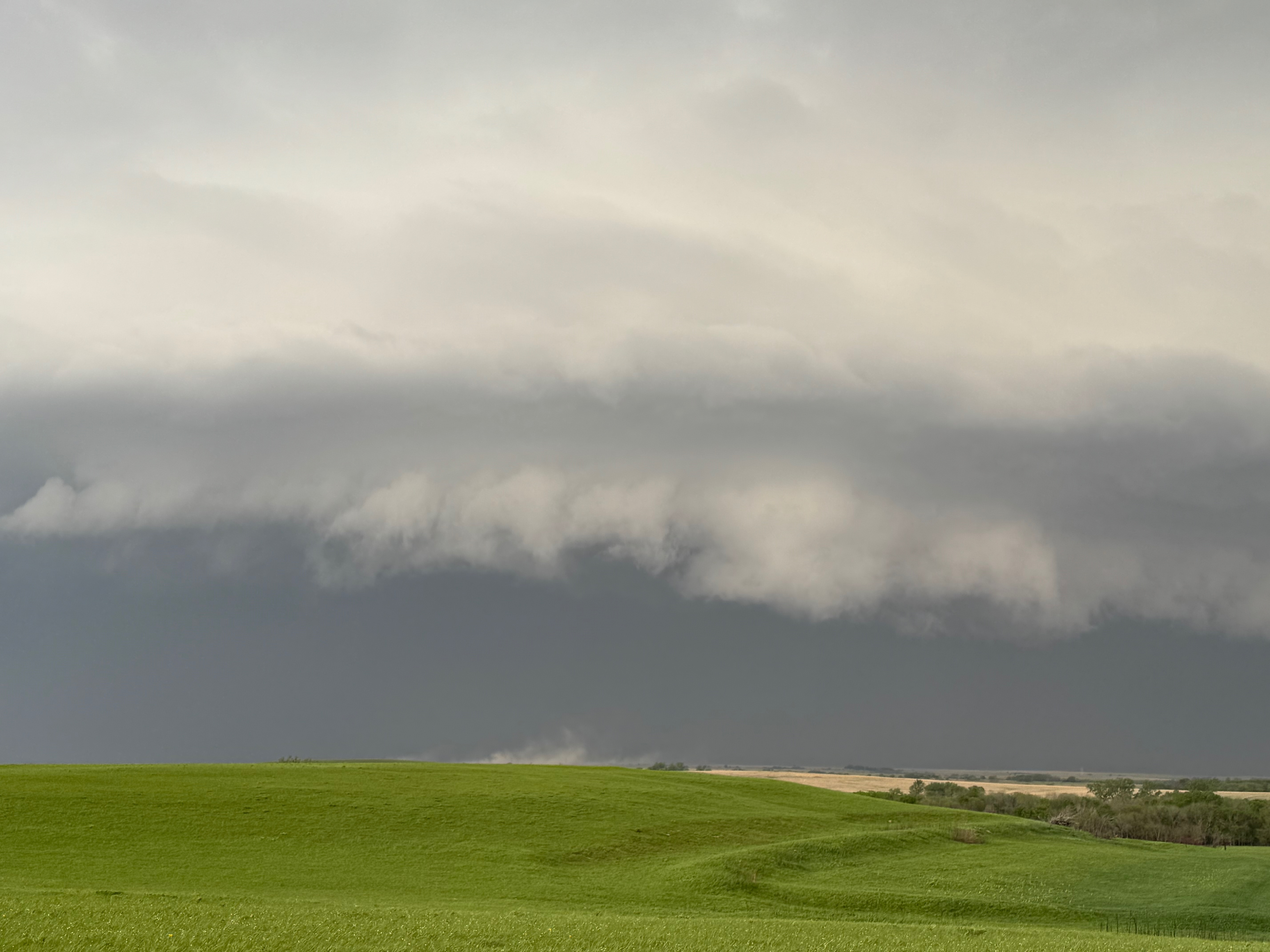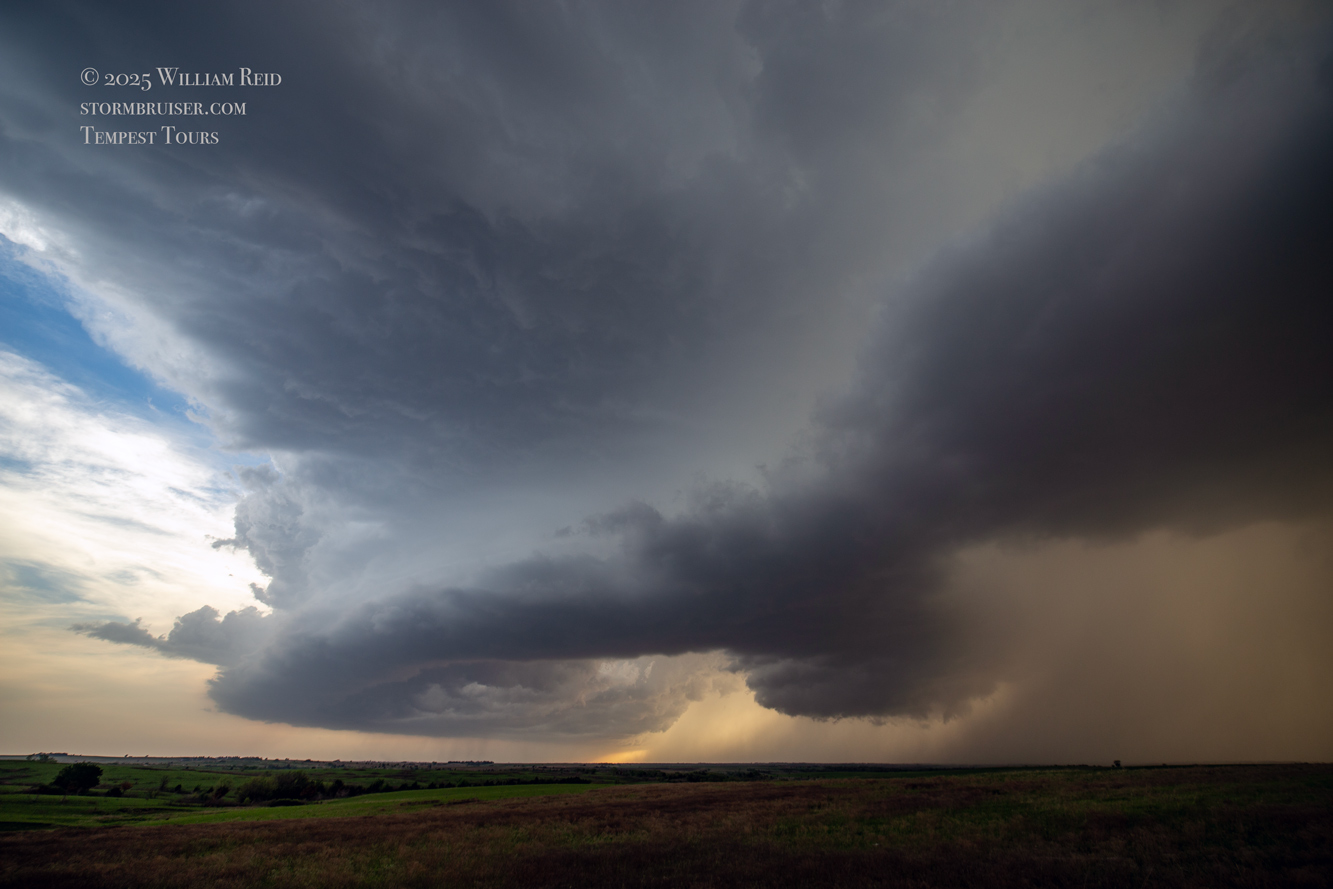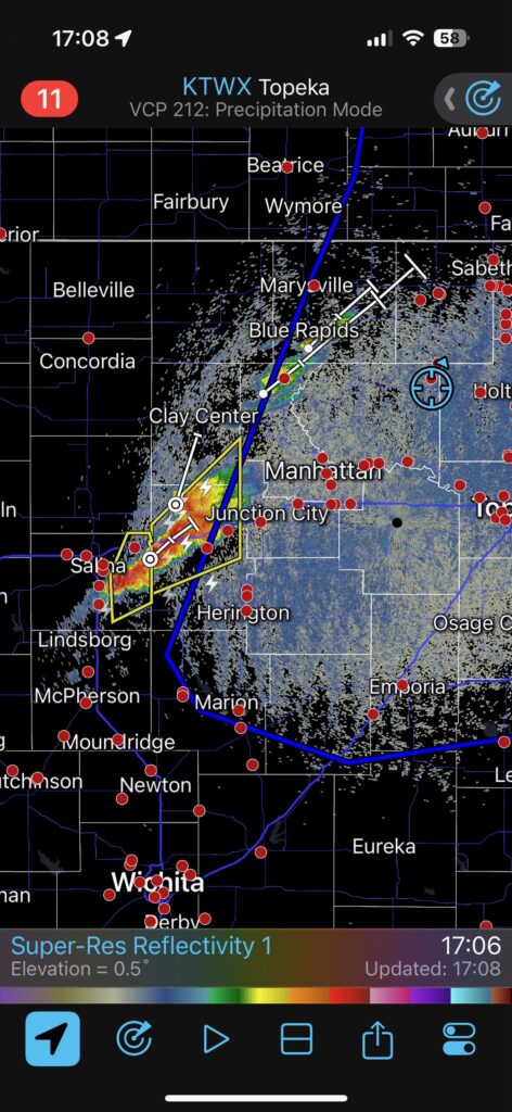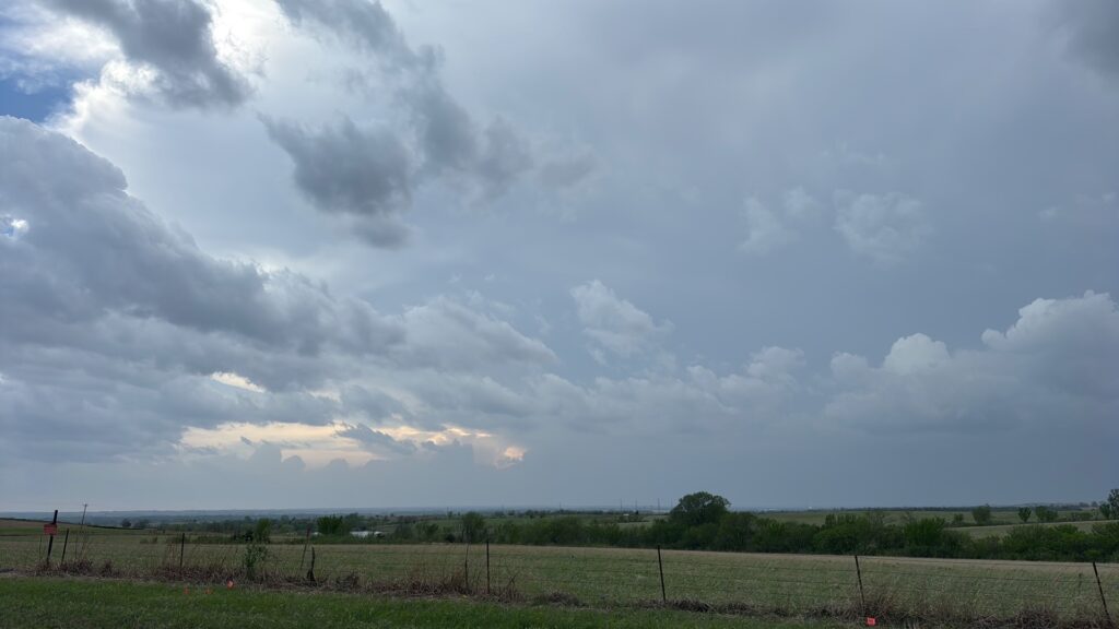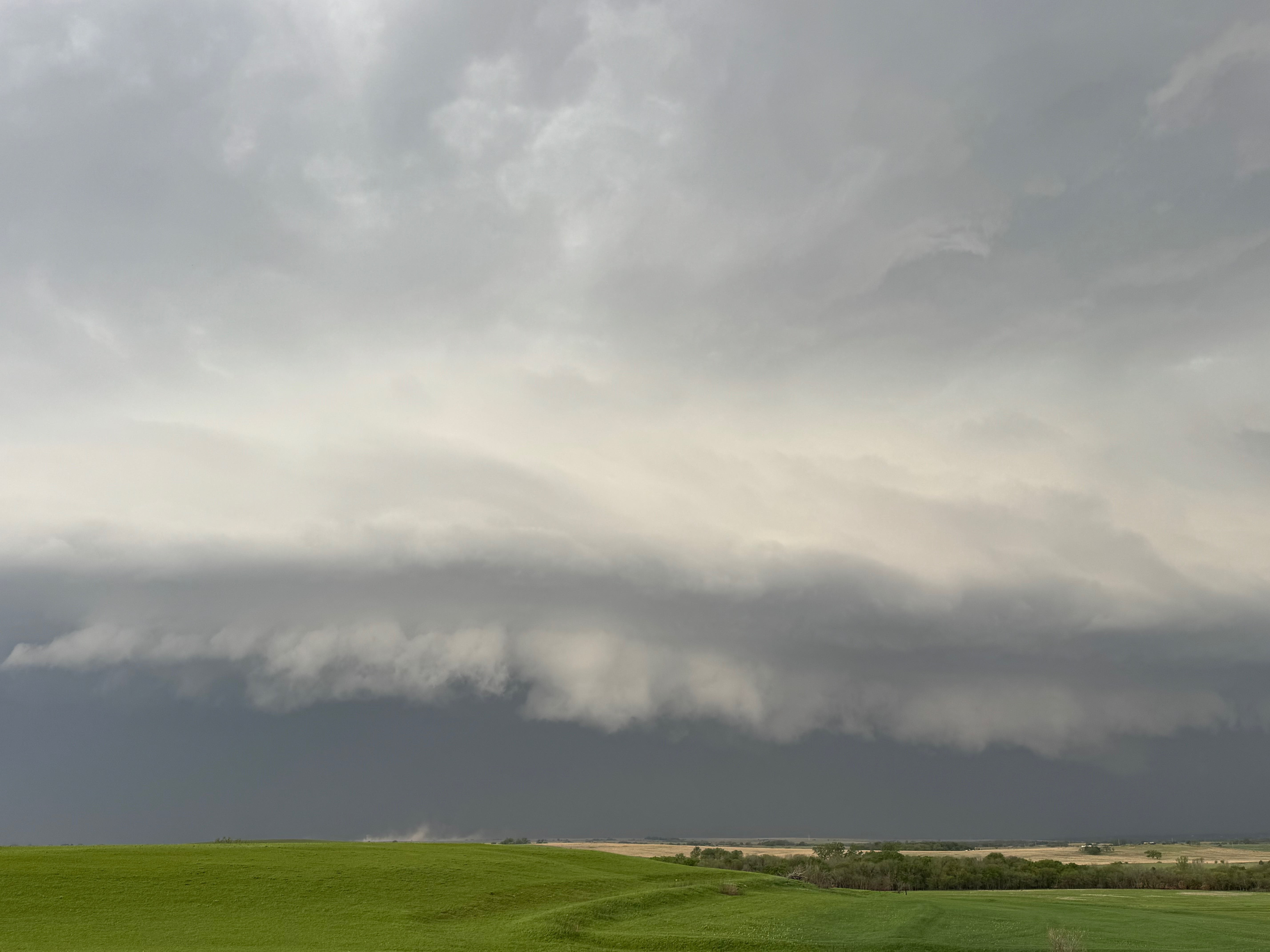 We had time to kill at a cool old church in Kelly, KS (near Seneca), and were then drawn southward towards strong development along the front near Manhattan. We positioned near Wamego and Waubaunsee and viewed some storm structure along the leading edge of activity that was moving to the northeast. This stuff already looked rather linear and was undercut. There was an inflection point here and there with an associated lowering. I didn’t see anything close to a tornado.