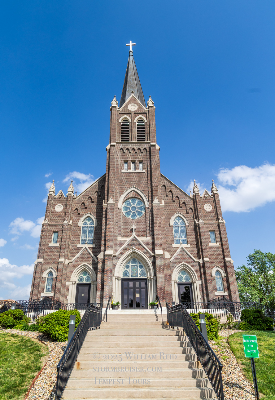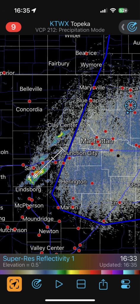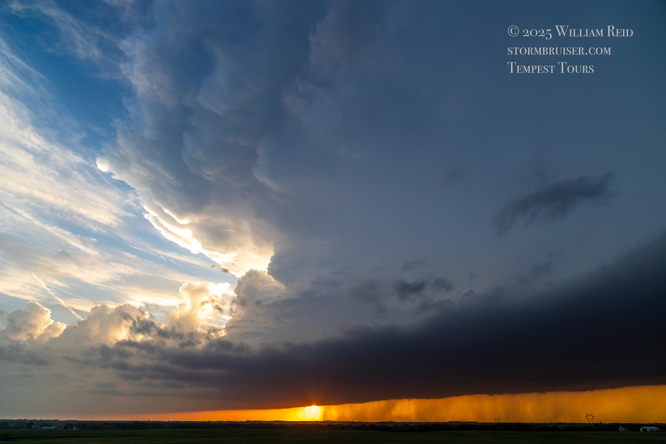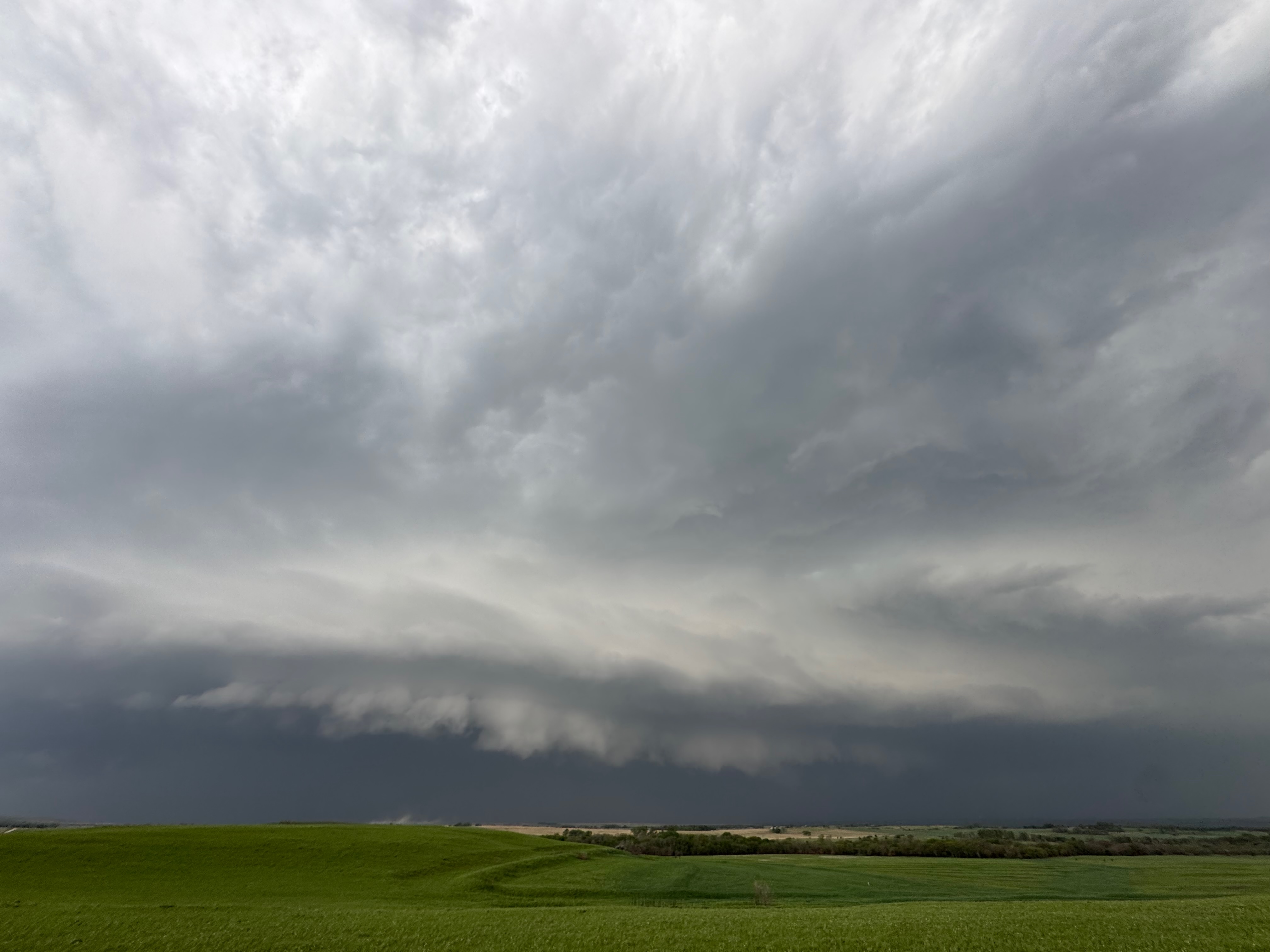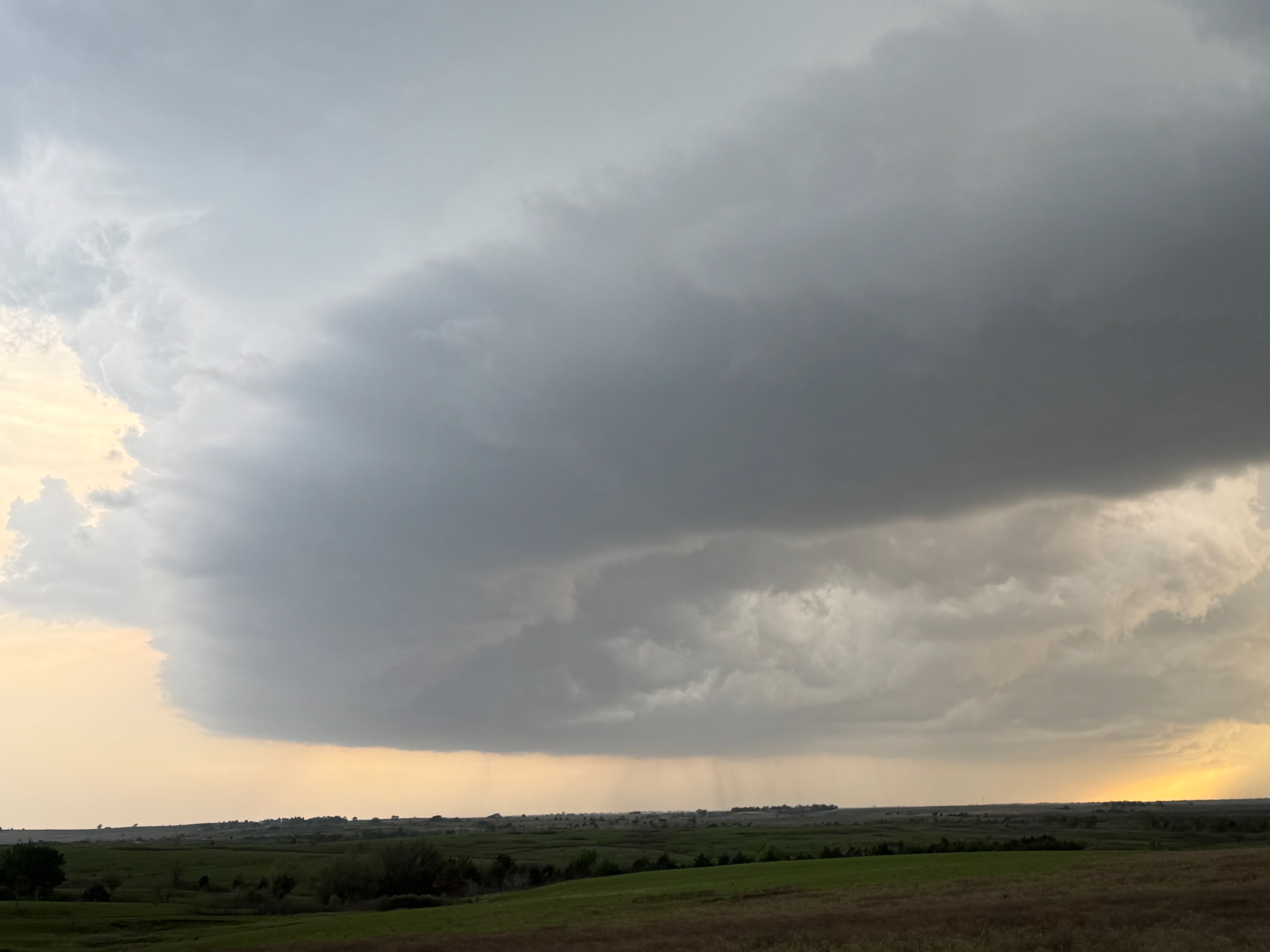 We had time to kill at a cool old church in Kelly, KS (near Seneca), and were then drawn southward towards strong development along the front near Manhattan. We positioned near Wamego and Waubaunsee and viewed some storm structure along the leading edge of activity that was moving to the northeast. This stuff already looked rather linear and was undercut. There was an inflection point here and there with an associated lowering. I didn’t see anything close to a tornado.