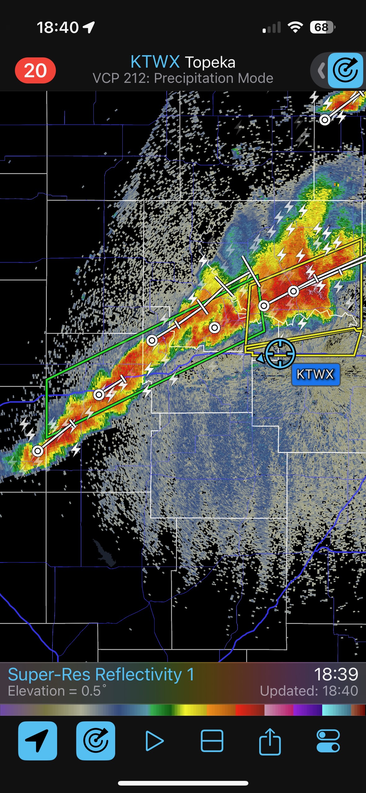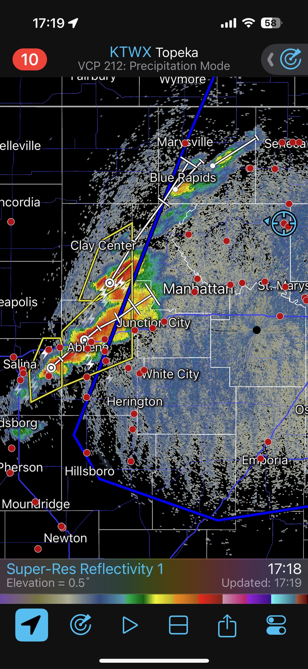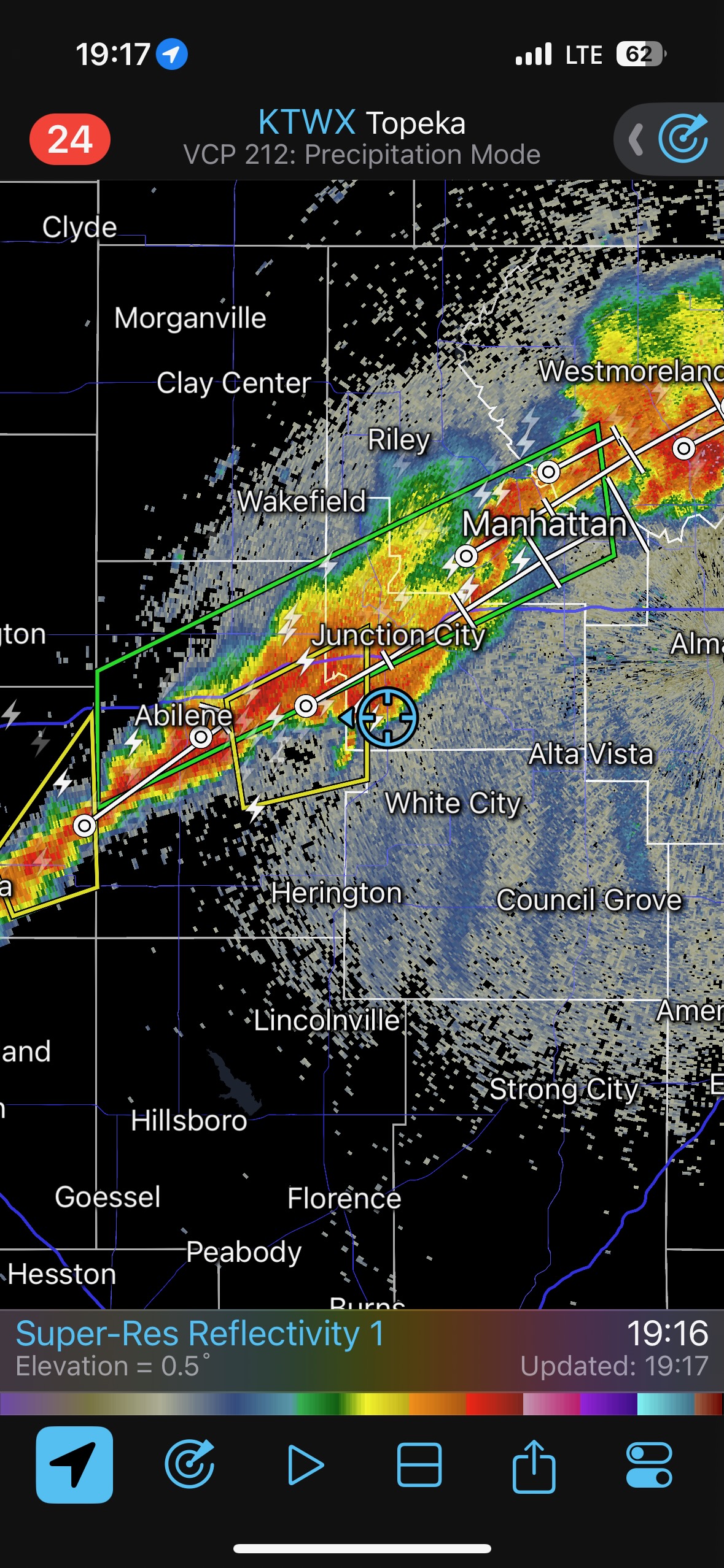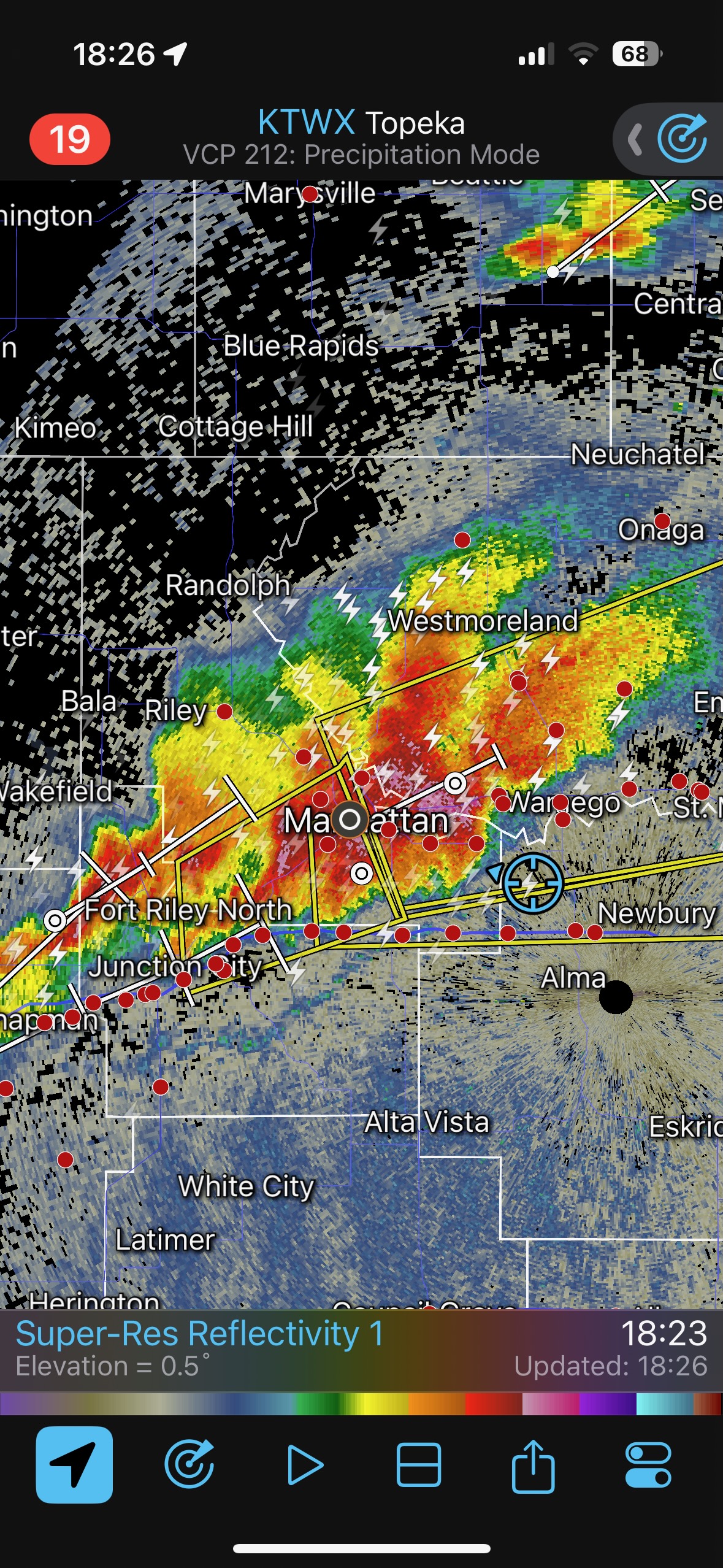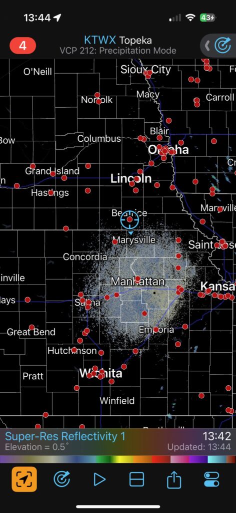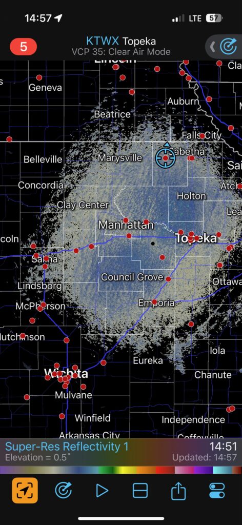 We had time to kill at a cool old church in Kelly, KS (near Seneca), and were then drawn southward towards strong development along the front near Manhattan. We positioned near Wamego and Waubaunsee and viewed some storm structure along the leading edge of activity that was moving to the northeast. This stuff already looked rather linear and was undercut. There was an inflection point here and there with an associated lowering. I didn’t see anything close to a tornado.