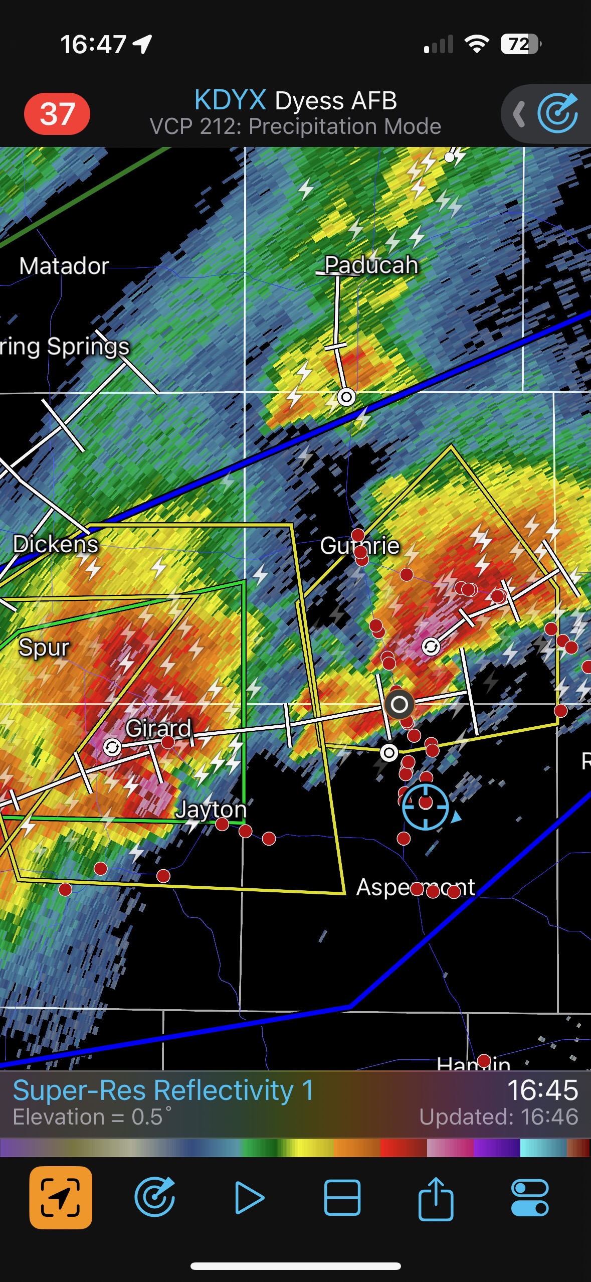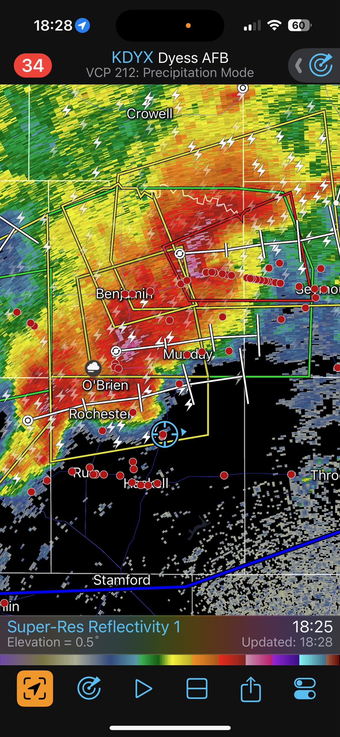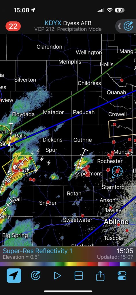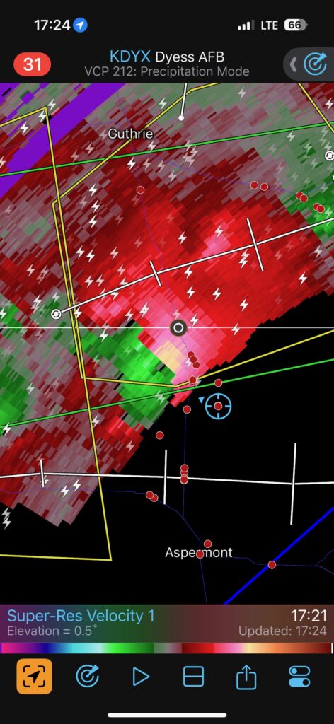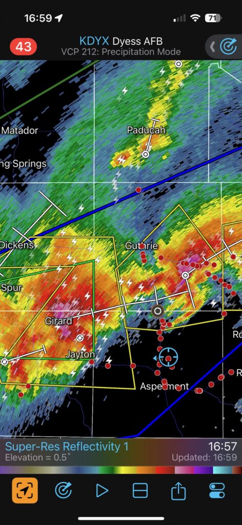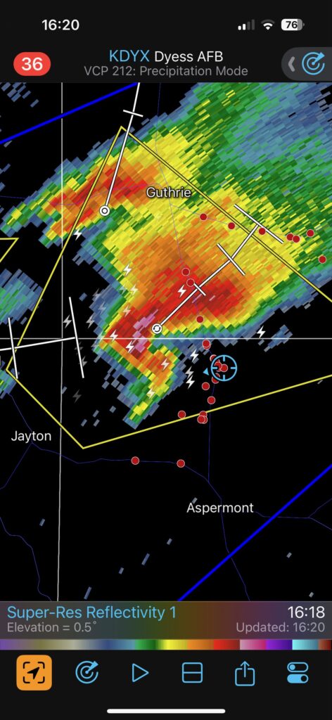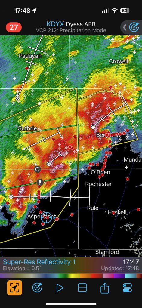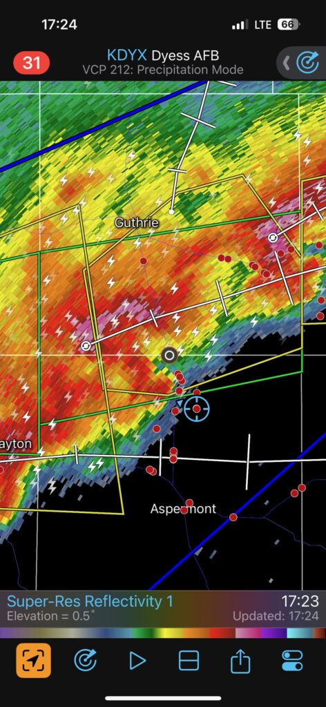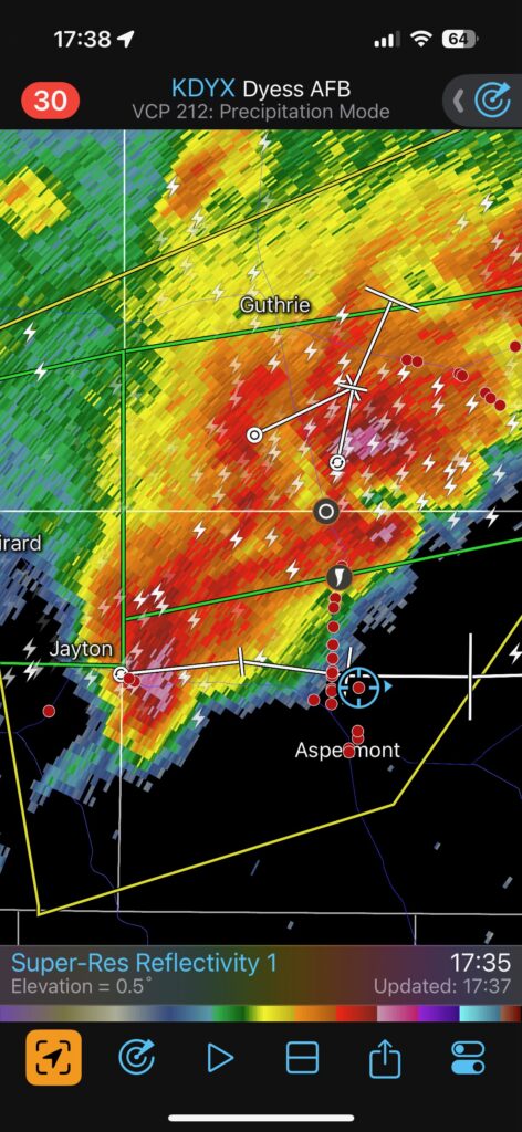 We tried to get northeast eventually for a very nasty storm west of Seymour. This one wreaked havoc with large hail and very strong winds…but it was a little too distant to catch.