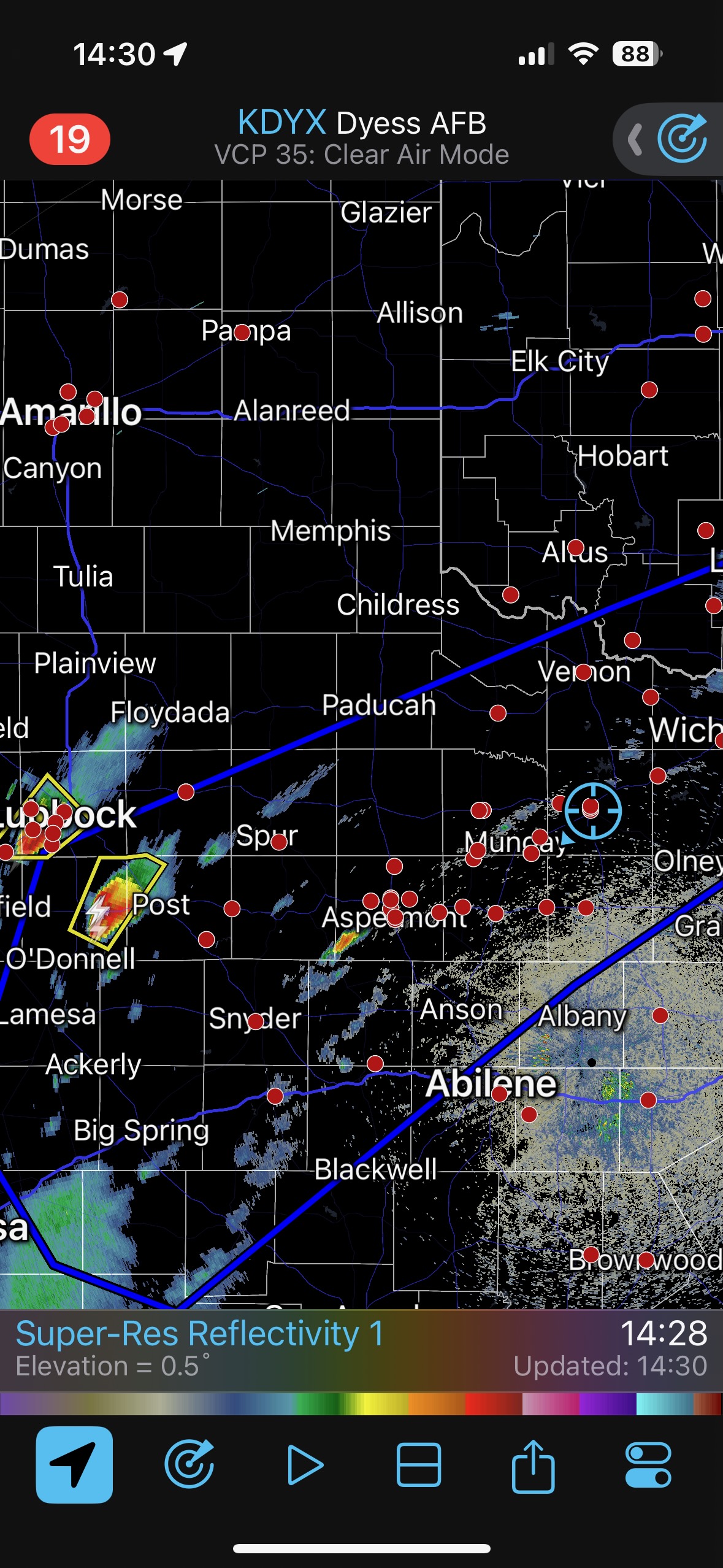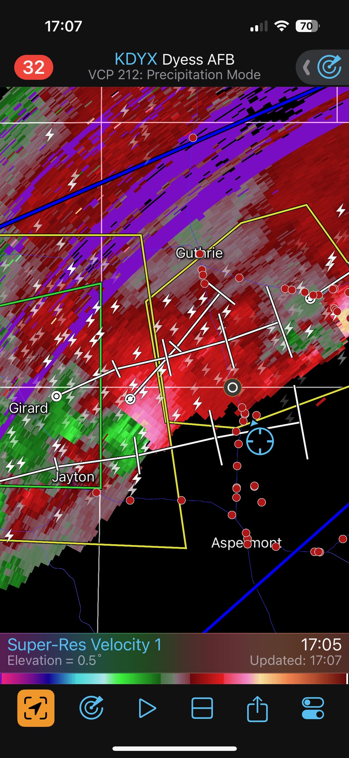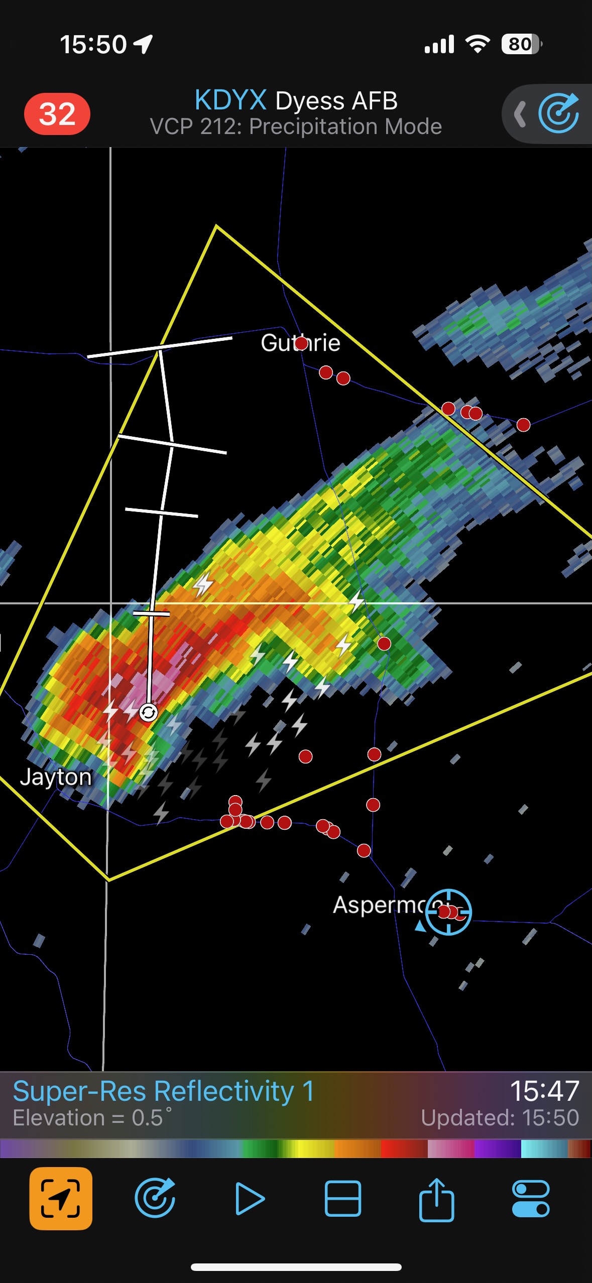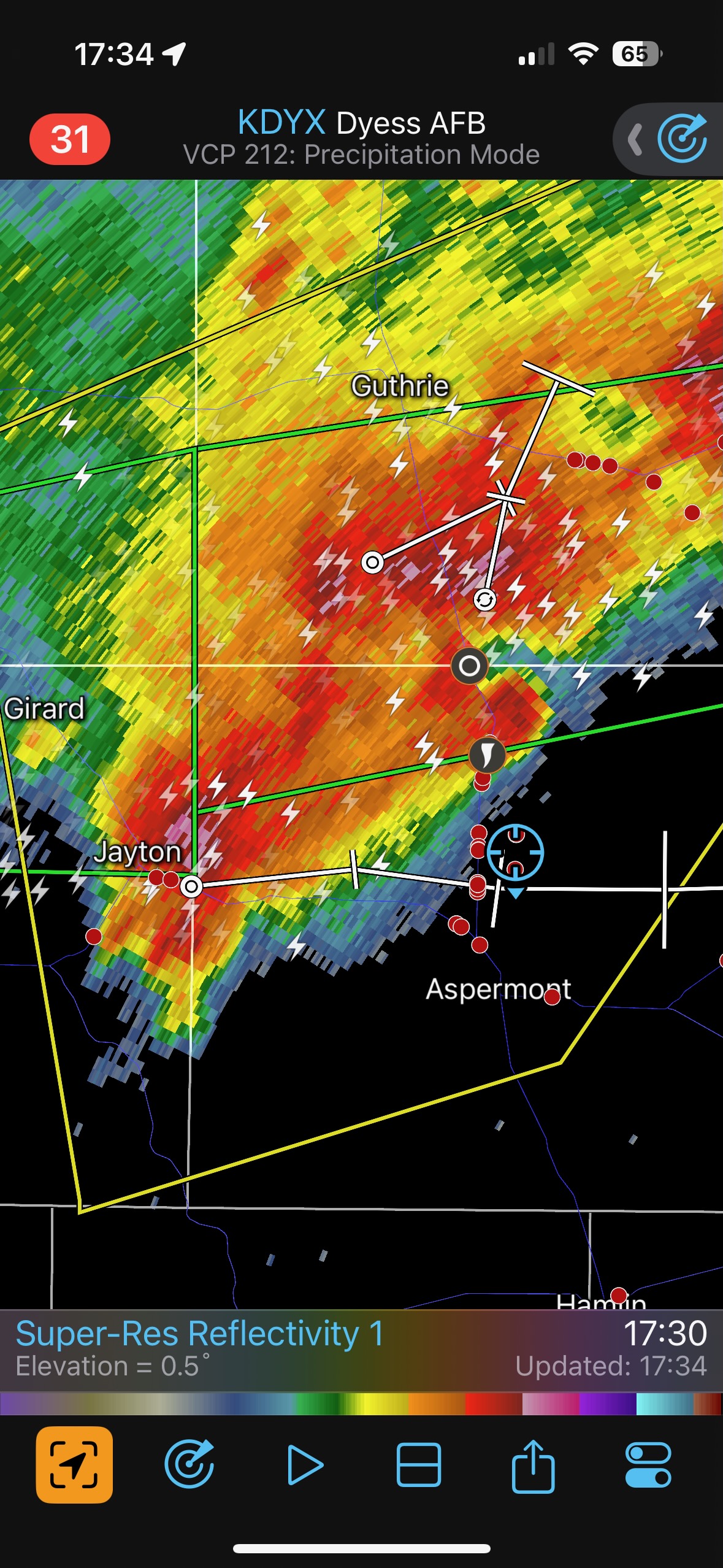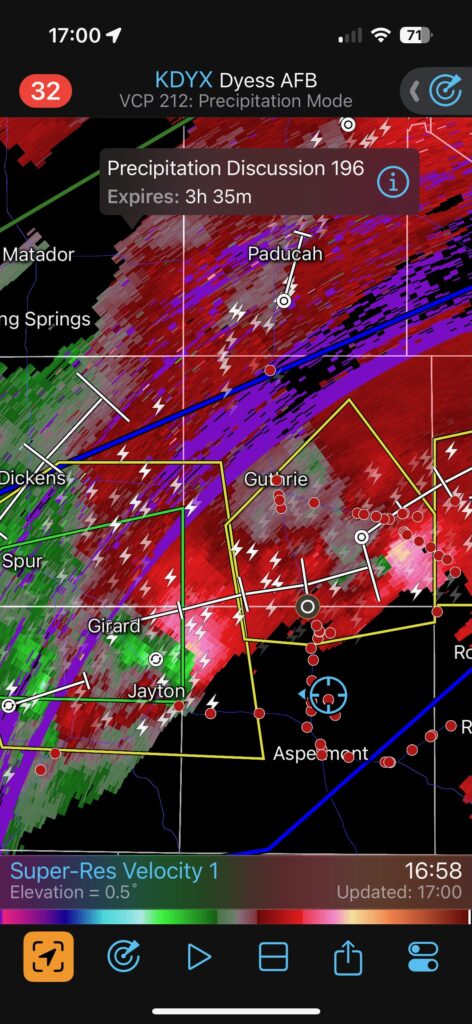 We tried to get northeast eventually for a very nasty storm west of Seymour. This one wreaked havoc with large hail and very strong winds…but it was a little too distant to catch.