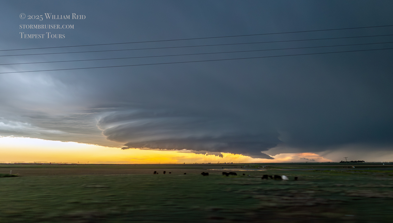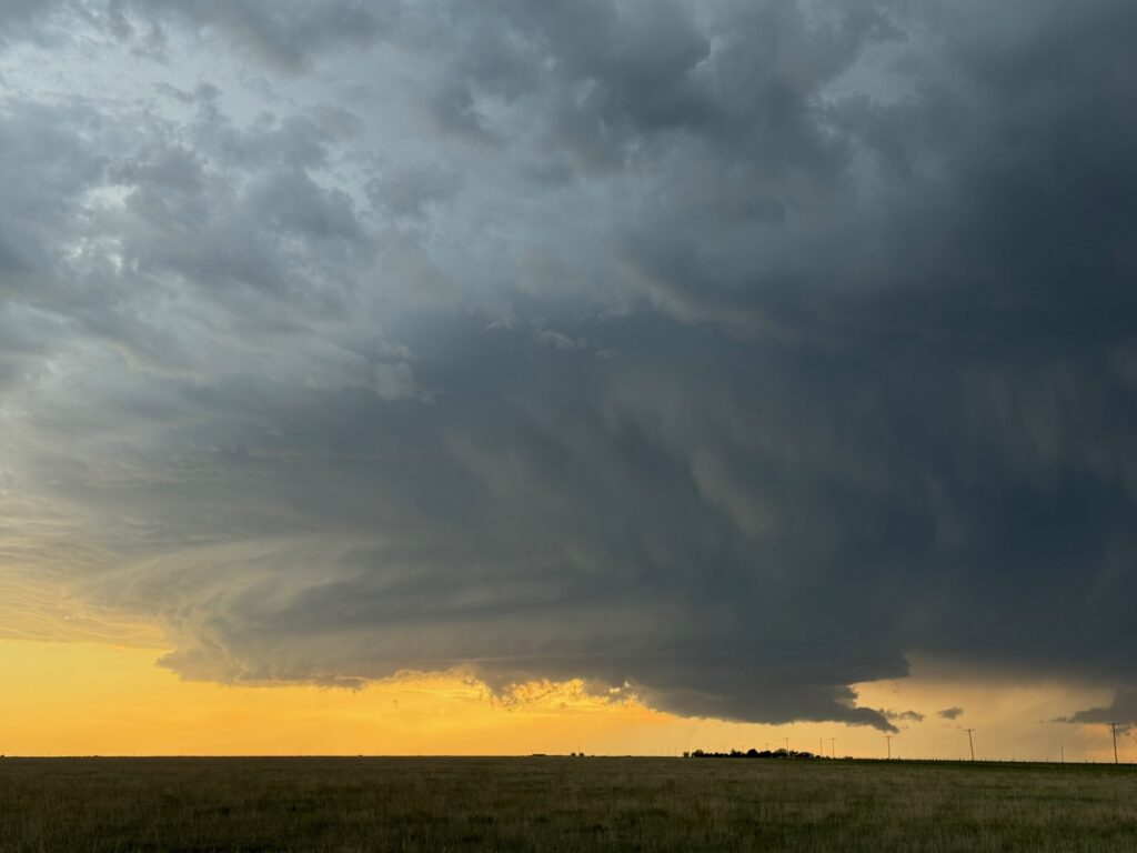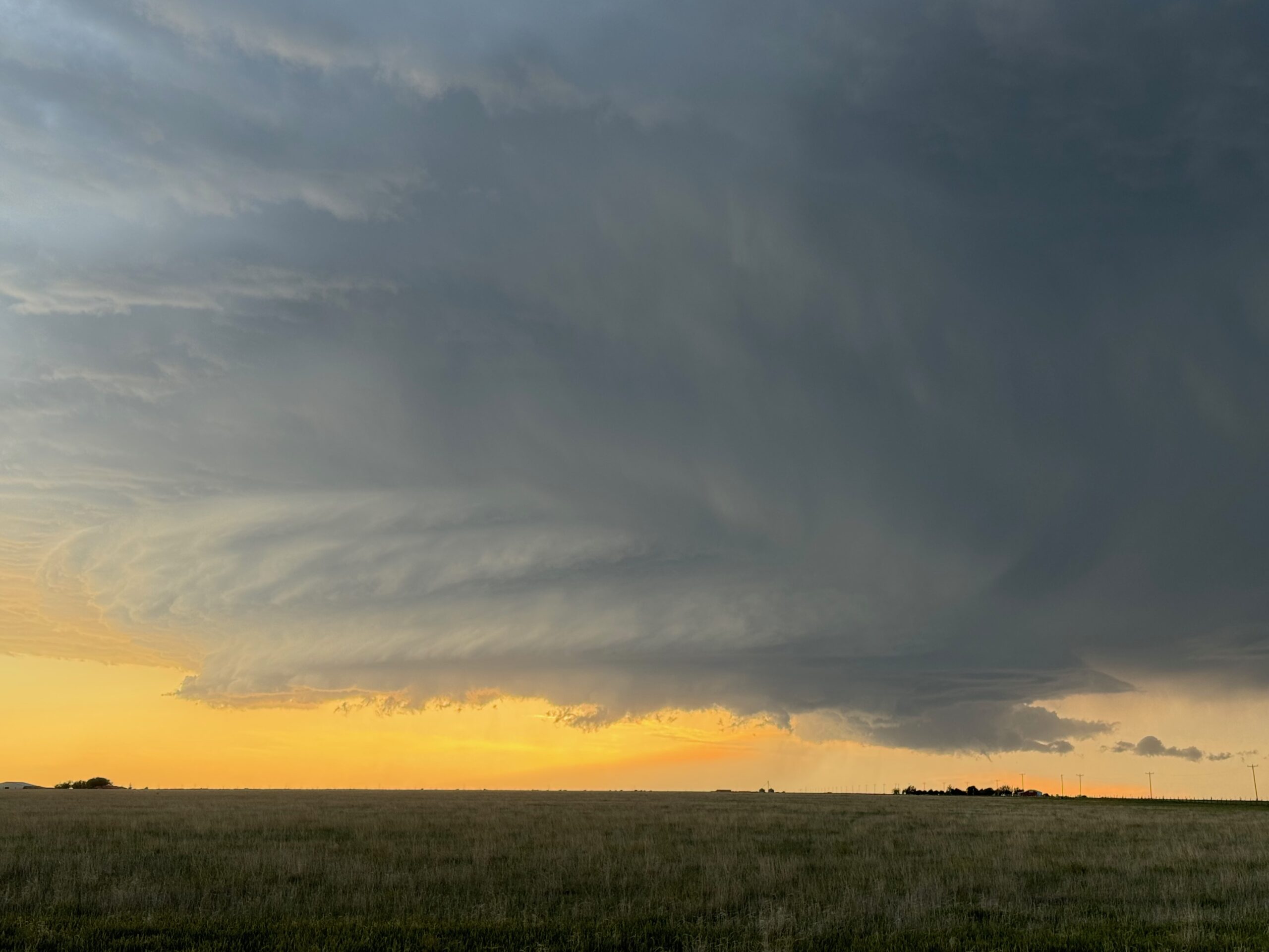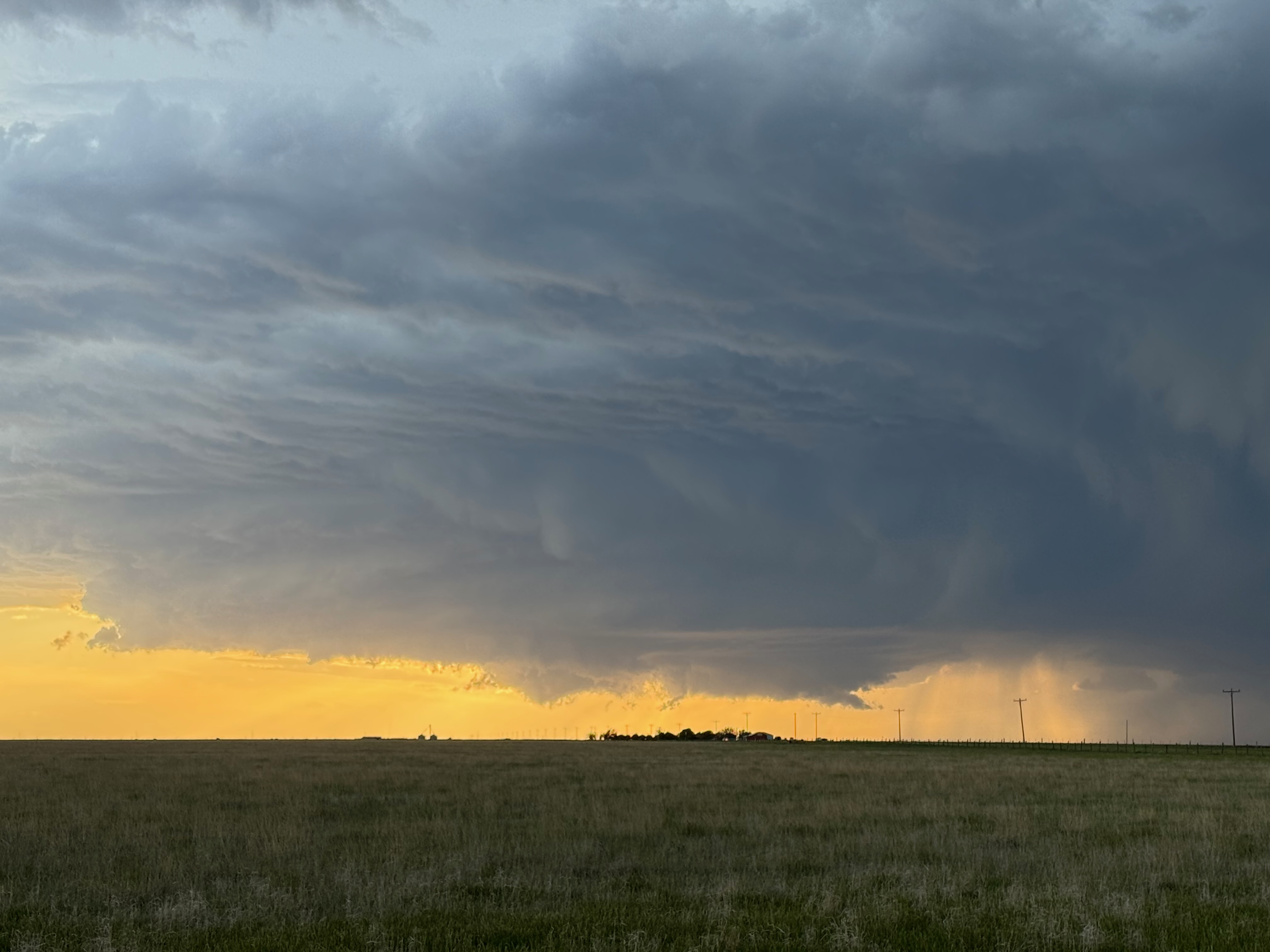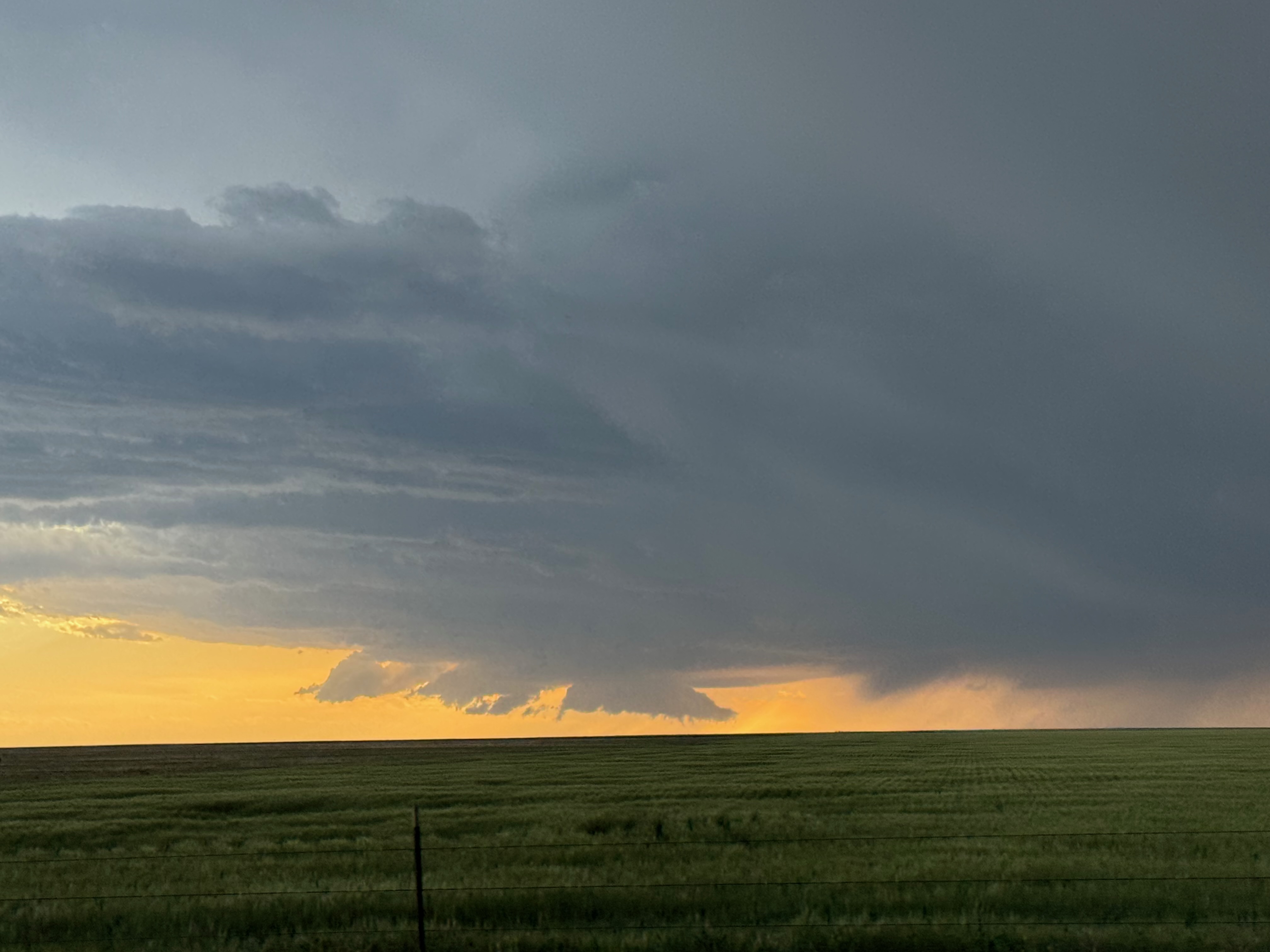 The railroad and flower pics below were a little WNW of Clayton. As these hailers approached it seemed prudent to get south towards the tail-end storm, which was ramping up east of Tucumcari. We got east of this one a bit SSW of Adrian on 214, and watched the base on the south end take on a fantastic rounded and sculpted look. It was Panhandle Magic in May! The storm was hedging more to the ESE, and this base was to our WSW. Unfortunately, road signs were adamant that 214 was closed due to flooding somewhere along the stretch southward to Friona. We could not get in front of the storm as desired…apparently. I didn’t “go for it.” We went the long way around, back east to 385 and south to Hereford. We had great looks at the supercell structure at dusk along this stretch, but the storm was somewhat distant.