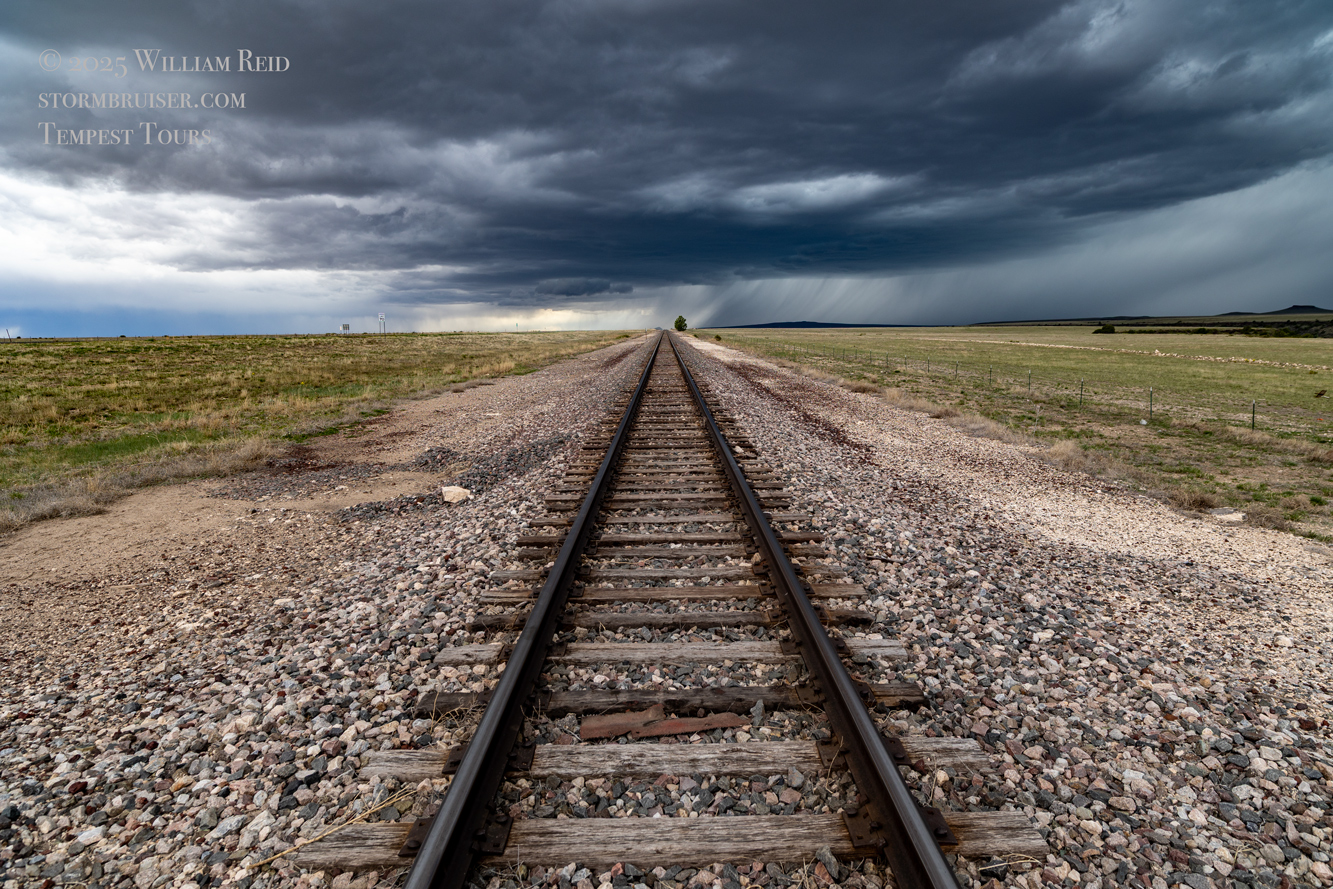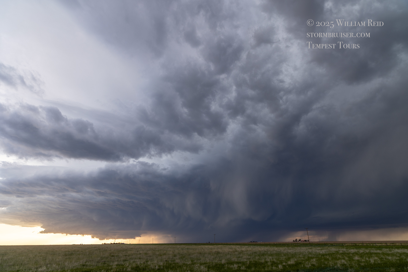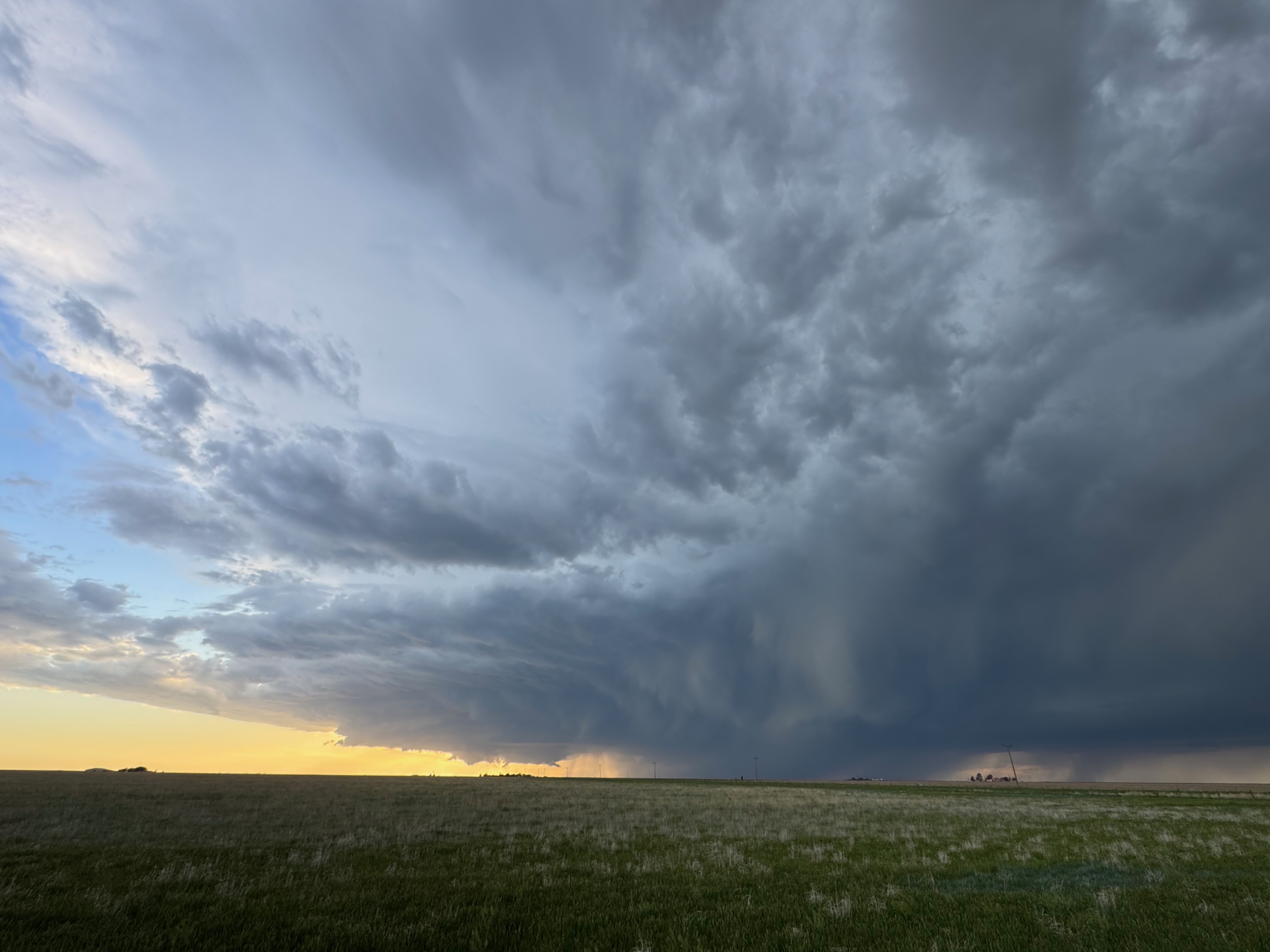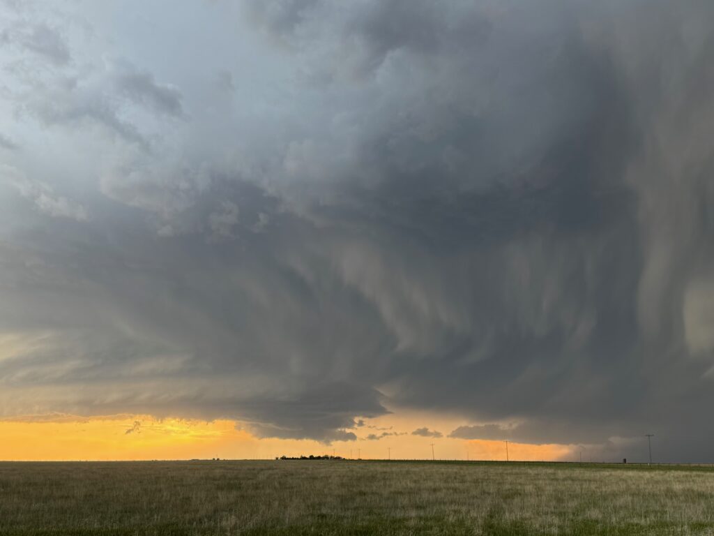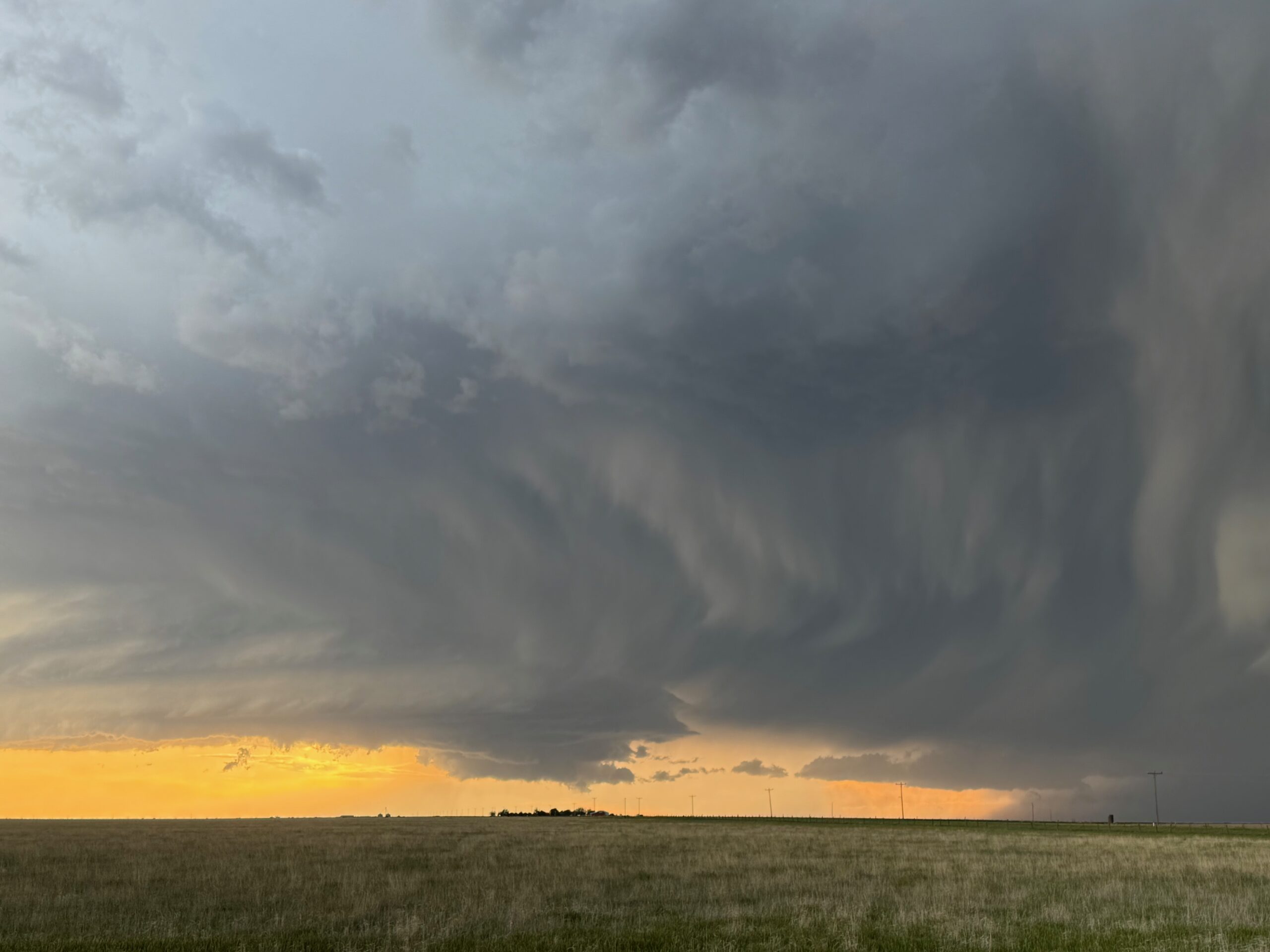 The railroad and flower pics below were a little WNW of Clayton. As these hailers approached it seemed prudent to get south towards the tail-end storm, which was ramping up east of Tucumcari. We got east of this one a bit SSW of Adrian on 214, and watched the base on the south end take on a fantastic rounded and sculpted look. It was Panhandle Magic in May! The storm was hedging more to the ESE, and this base was to our WSW. Unfortunately, road signs were adamant that 214 was closed due to flooding somewhere along the stretch southward to Friona. We could not get in front of the storm as desired…apparently. I didn’t “go for it.” We went the long way around, back east to 385 and south to Hereford. We had great looks at the supercell structure at dusk along this stretch, but the storm was somewhat distant.