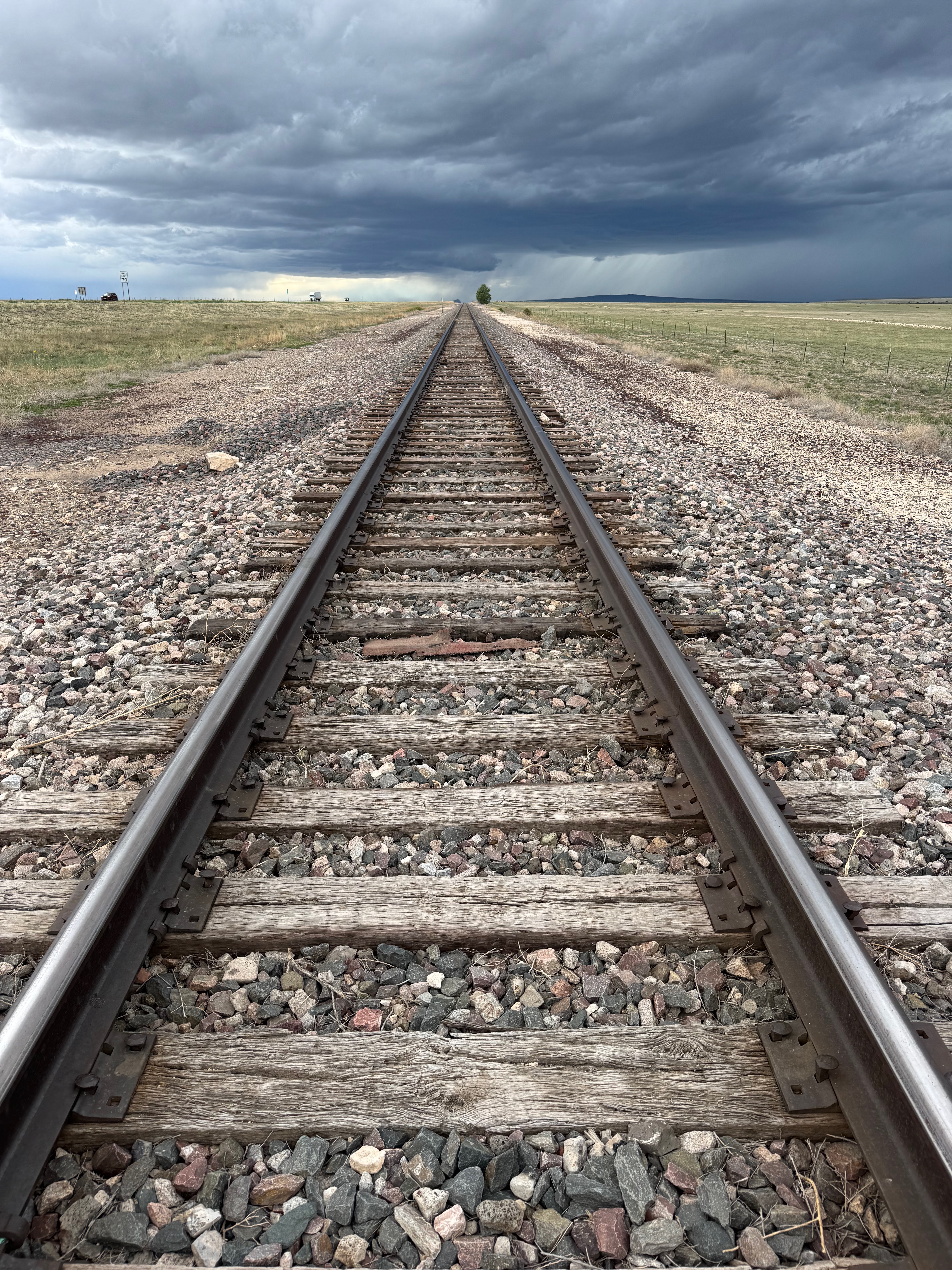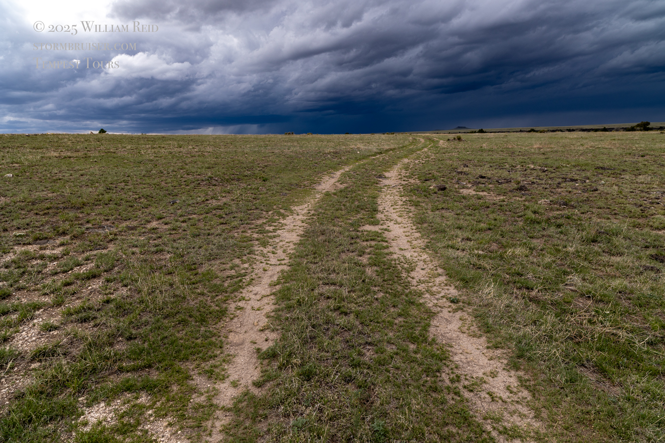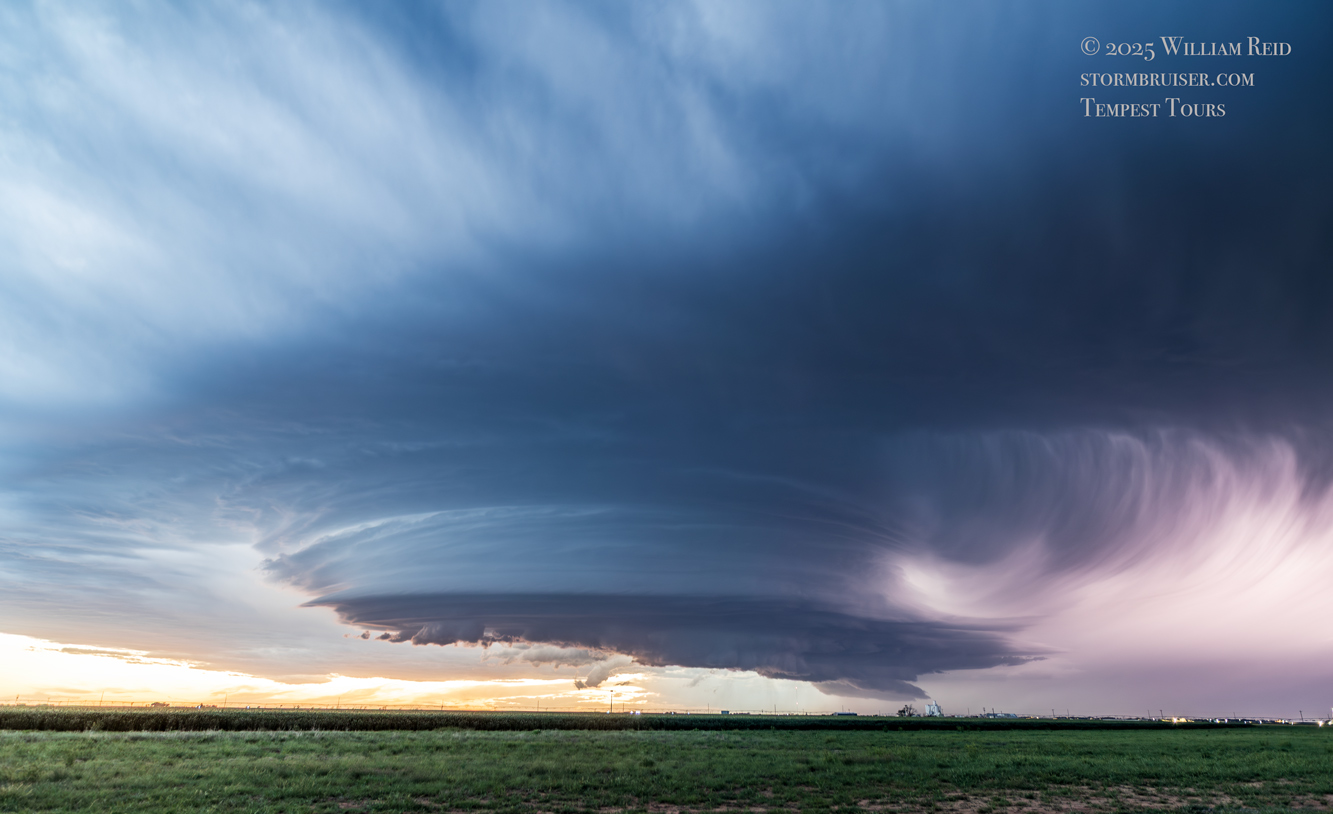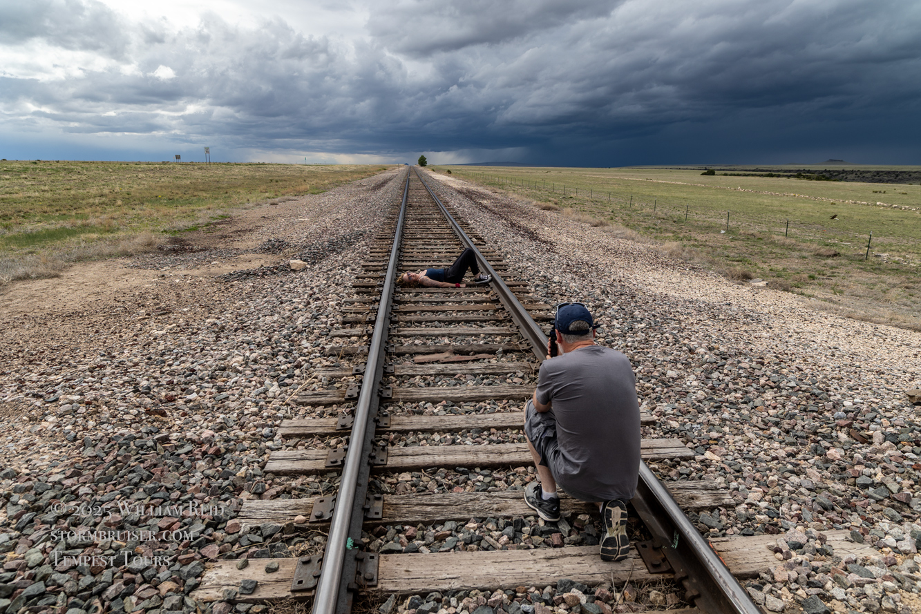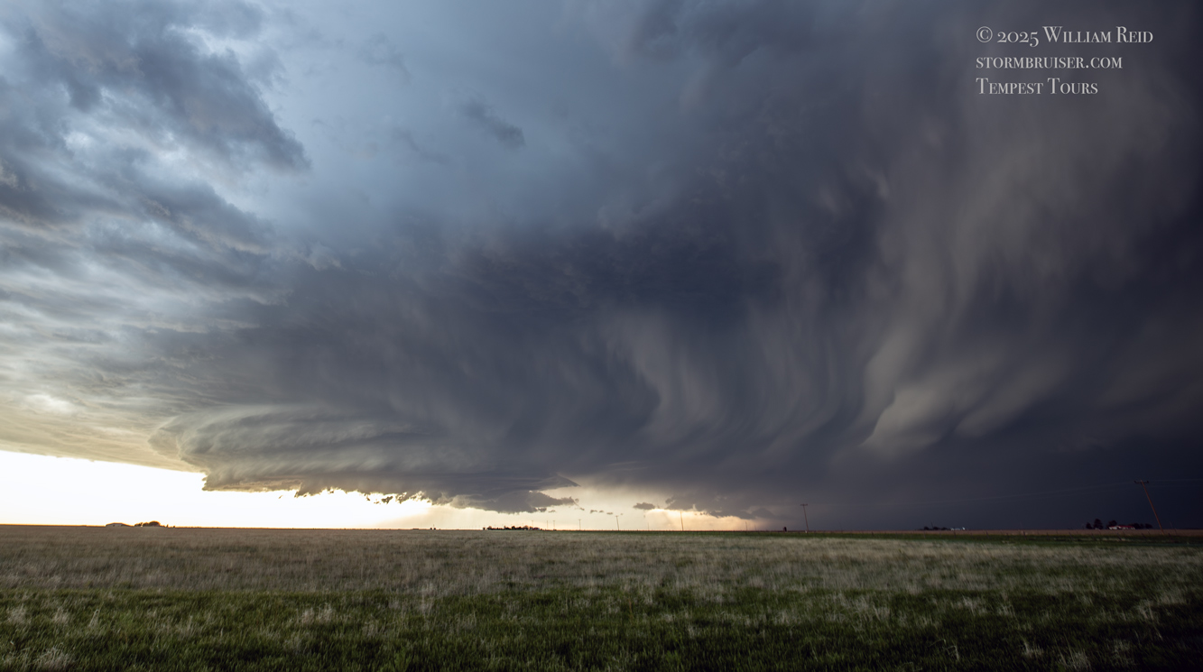The railroad and flower pics below were a little WNW of Clayton. As these hailers approached it seemed prudent to get south towards the tail-end storm, which was ramping up east of Tucumcari. We got east of this one a bit SSW of Adrian on 214, and watched the base on the south end take on a fantastic rounded and sculpted look. It was Panhandle Magic in May! The storm was hedging more to the ESE, and this base was to our WSW. Unfortunately, road signs were adamant that 214 was closed due to flooding somewhere along the stretch southward to Friona. We could not get in front of the storm as desired…apparently. I didn’t “go for it.” We went the long way around, back east to 385 and south to Hereford. We had great looks at the supercell structure at dusk along this stretch, but the storm was somewhat distant.