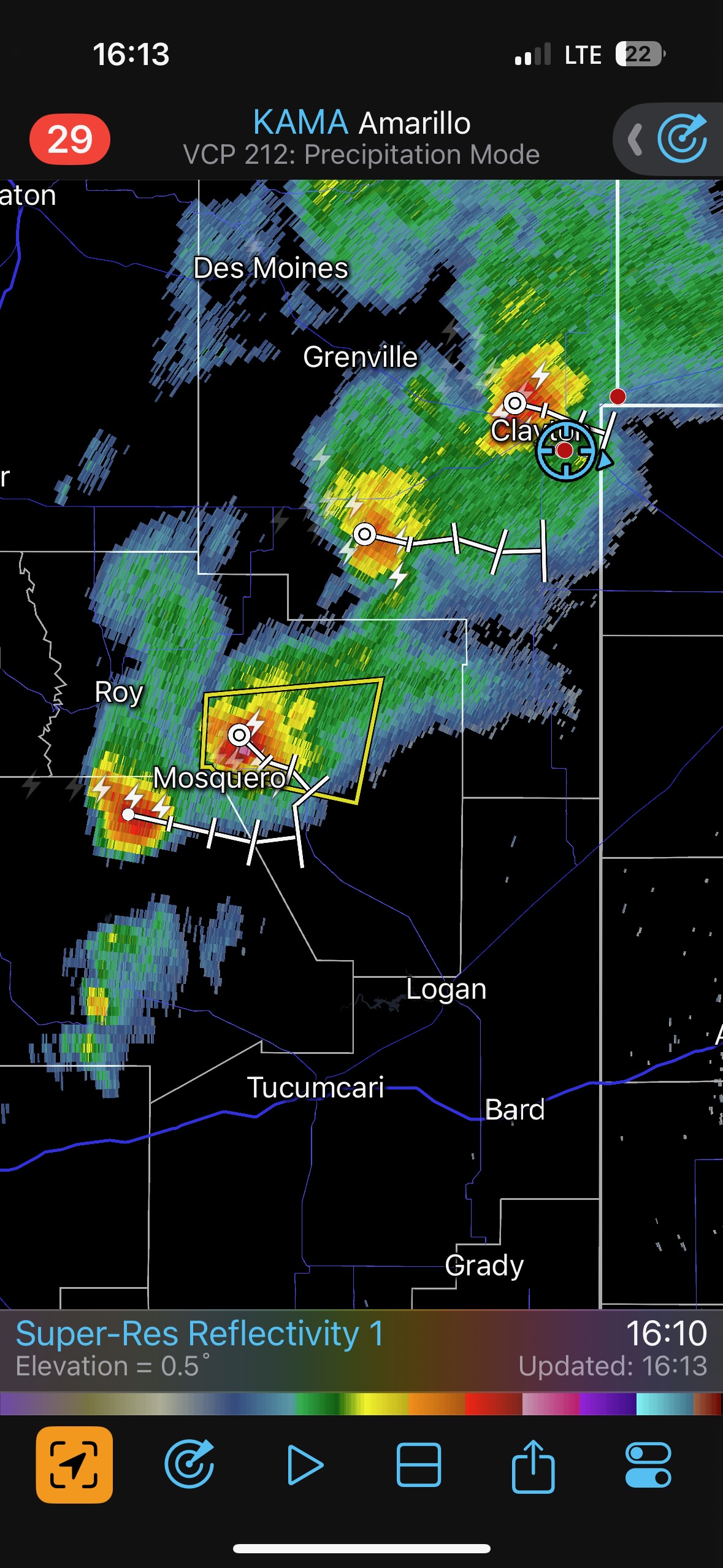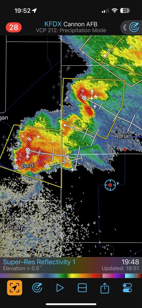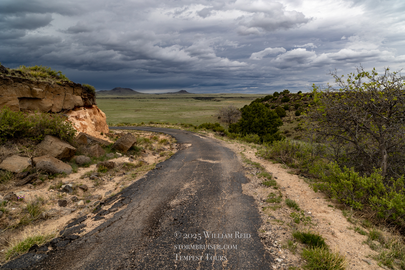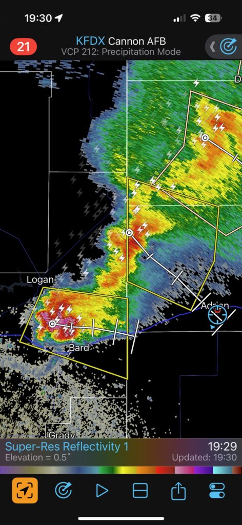 We headed northwestward from Turkey towards Clayton to watch high-based stuff on the high terrain. Severe prospects weren’t looking especially good as dew points were barely over 40F. But, there was some upslope flow and reasonably good flow aloft to provide the shear required for supercells. See the SPC mesoscale discussions above for some surface observations.