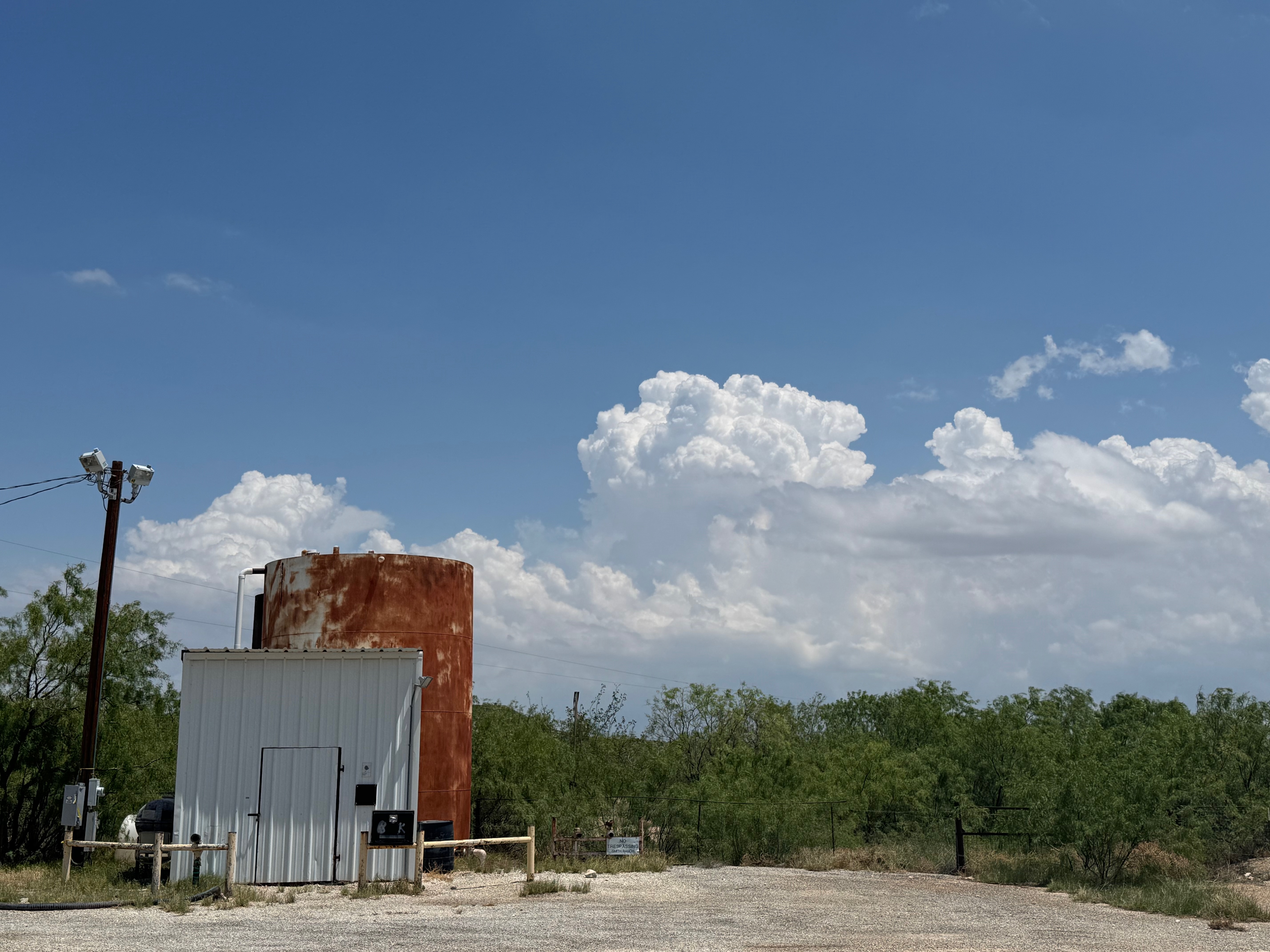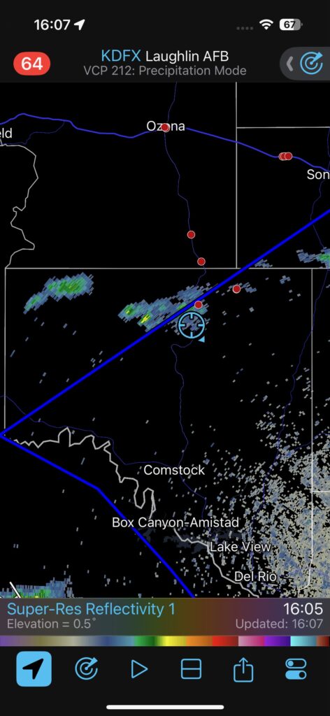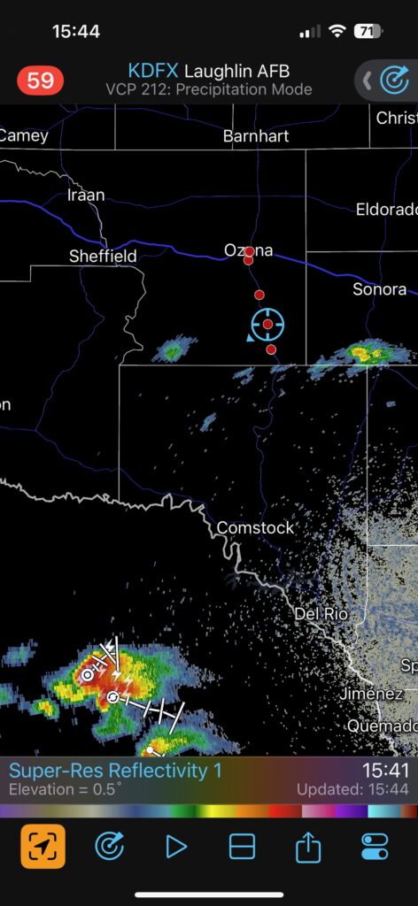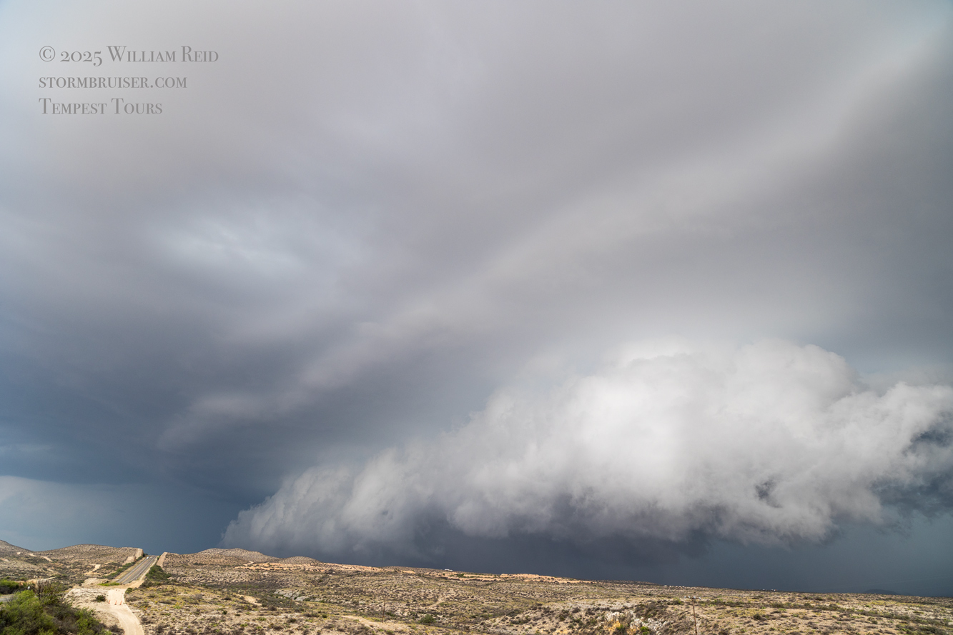 A new, crisp and strong updraft dragged us from Sheffield to Ozona on I-10. It looked like we were in Fat City as it turned more to the southeast, but the storm would not take the next step and go severe. A second attempt to our west sputtered near Juno on Highway 163. We killed some time and twiddled our thumbs some at Juno…it was looking like this play along the sagging front was going to bust. But, there was intense convection south of the Rio Grande, in the mountains of Mexico, to our south. Any right-moving supercell out of this development would not be a chase candidate, but luck was on our side! A left-mover was coming towards the river!