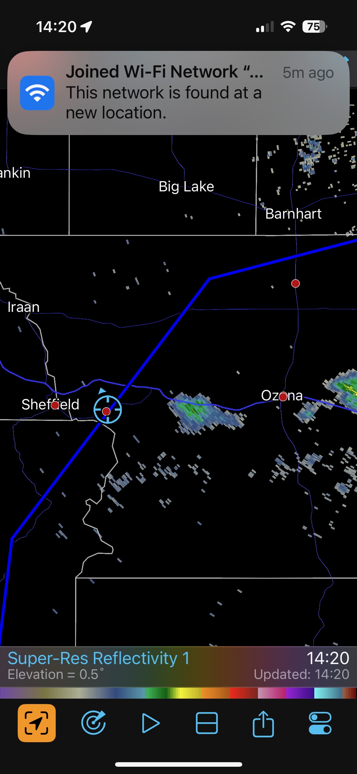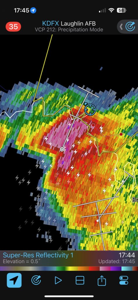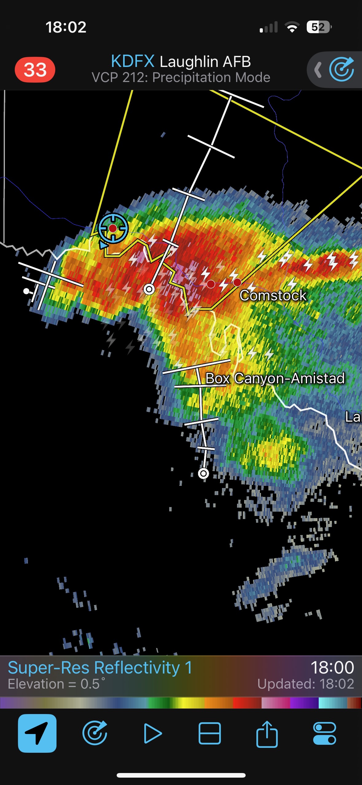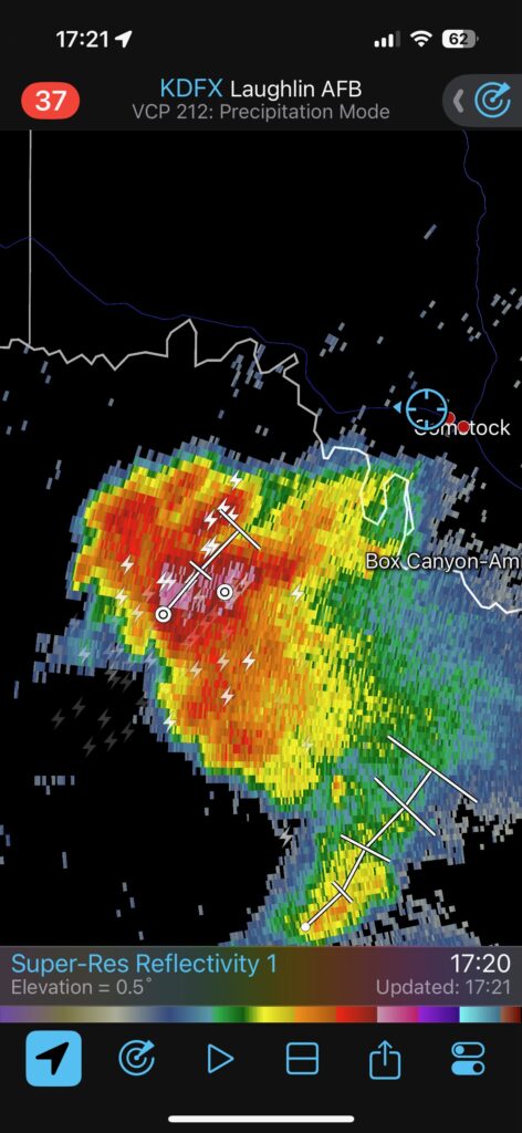 A new, crisp and strong updraft dragged us from Sheffield to Ozona on I-10. It looked like we were in Fat City as it turned more to the southeast, but the storm would not take the next step and go severe. A second attempt to our west sputtered near Juno on Highway 163. We killed some time and twiddled our thumbs some at Juno…it was looking like this play along the sagging front was going to bust. But, there was intense convection south of the Rio Grande, in the mountains of Mexico, to our south. Any right-moving supercell out of this development would not be a chase candidate, but luck was on our side! A left-mover was coming towards the river!