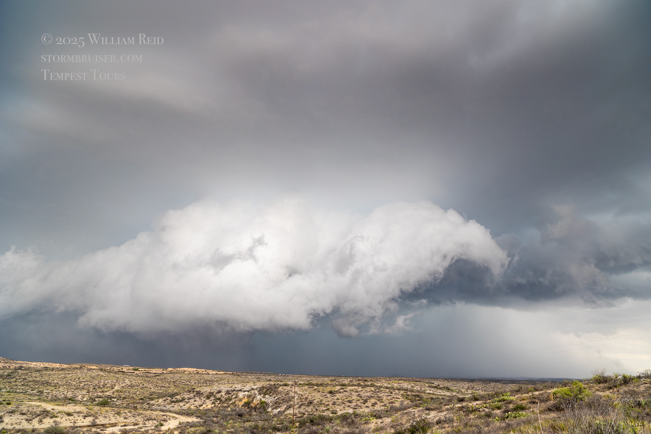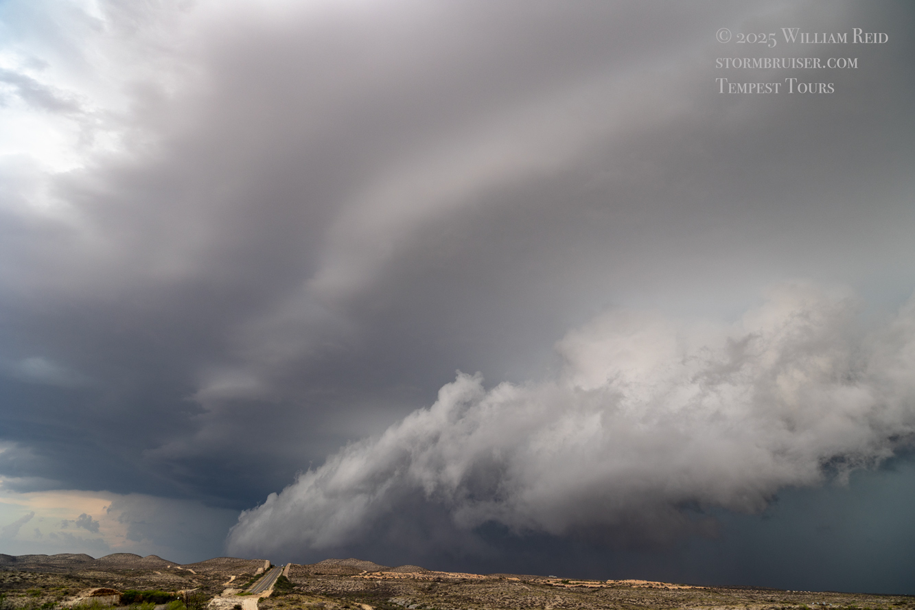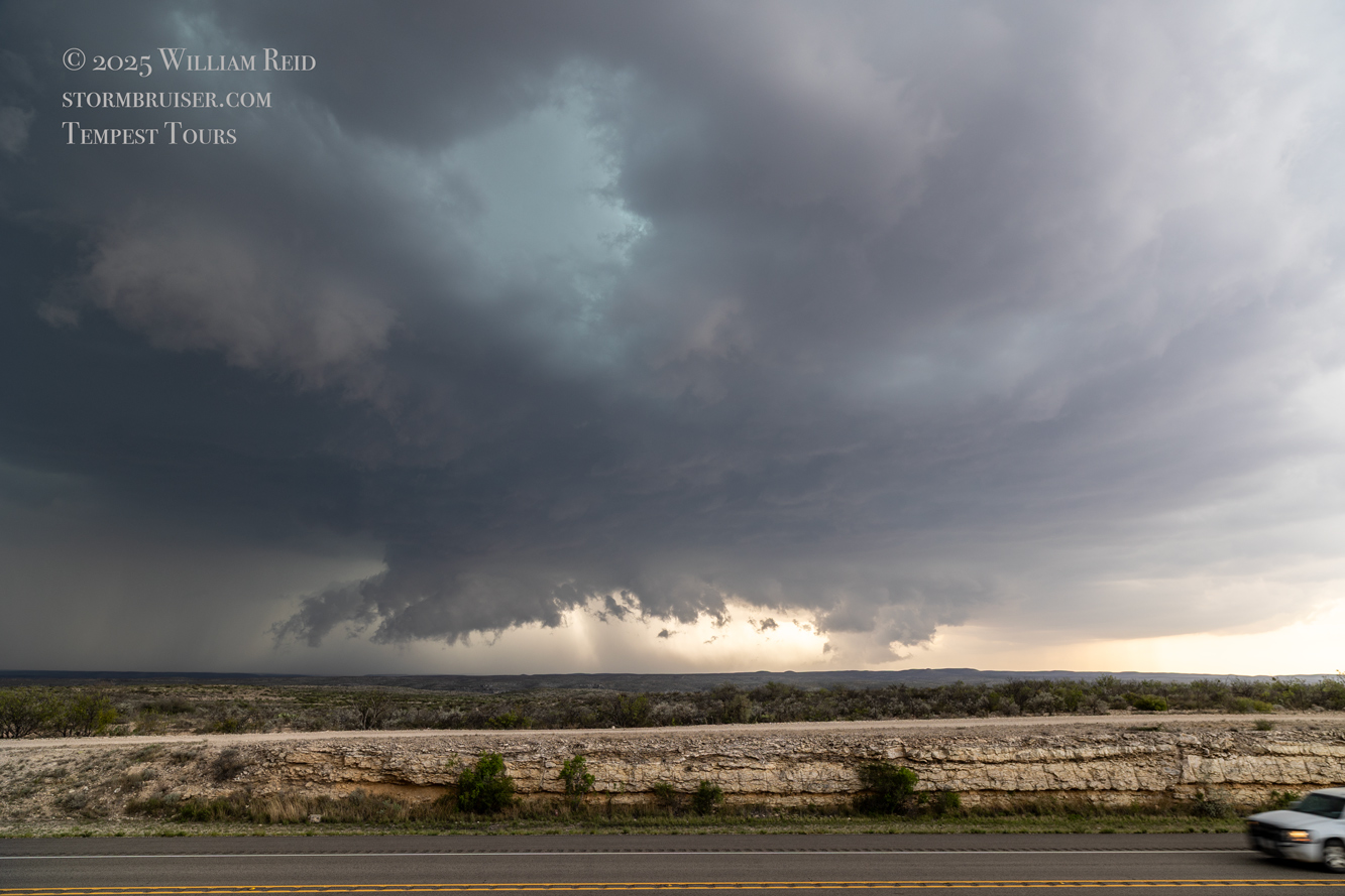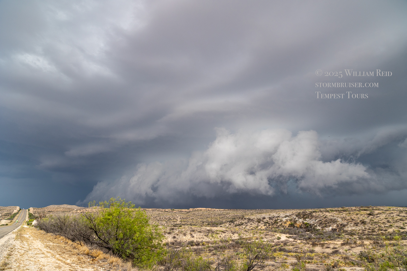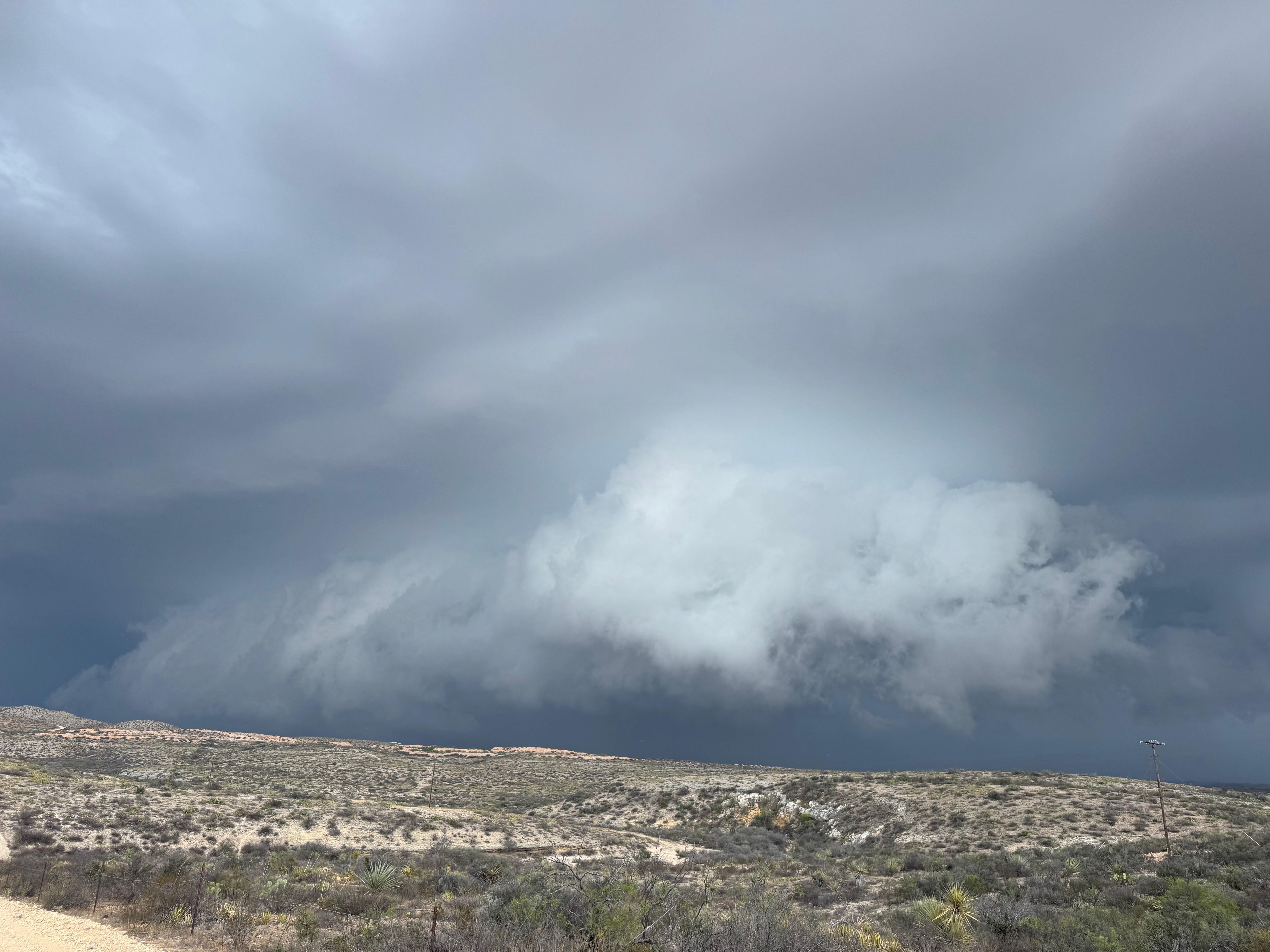 We made our way to Comstock, did a quick pit stop, and then headed west towards Langtry to get in front of the beastly left-mover. It sported some nice lowerings and a splendid shelfie-cow-catcher front end. To avoid the hail core we had to scoot a few miles to the west. The storm covered U.S. 90 just to our east and blew a semi-truck over. We looked a little bit for large hail and did not come across any.