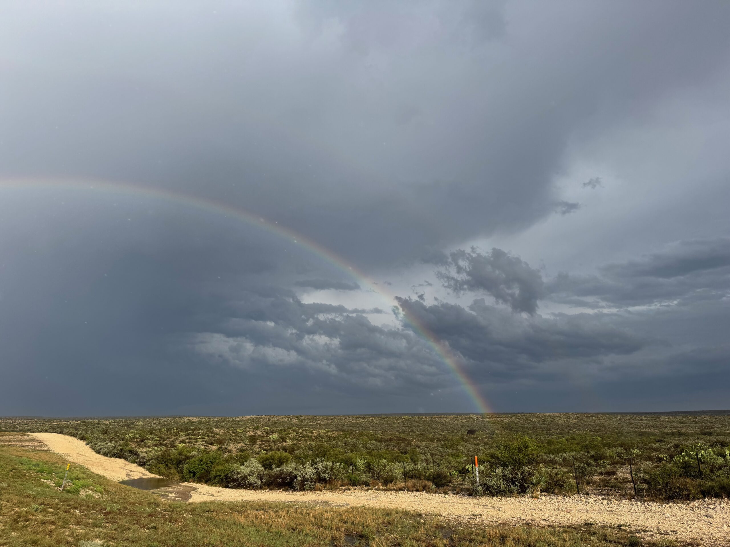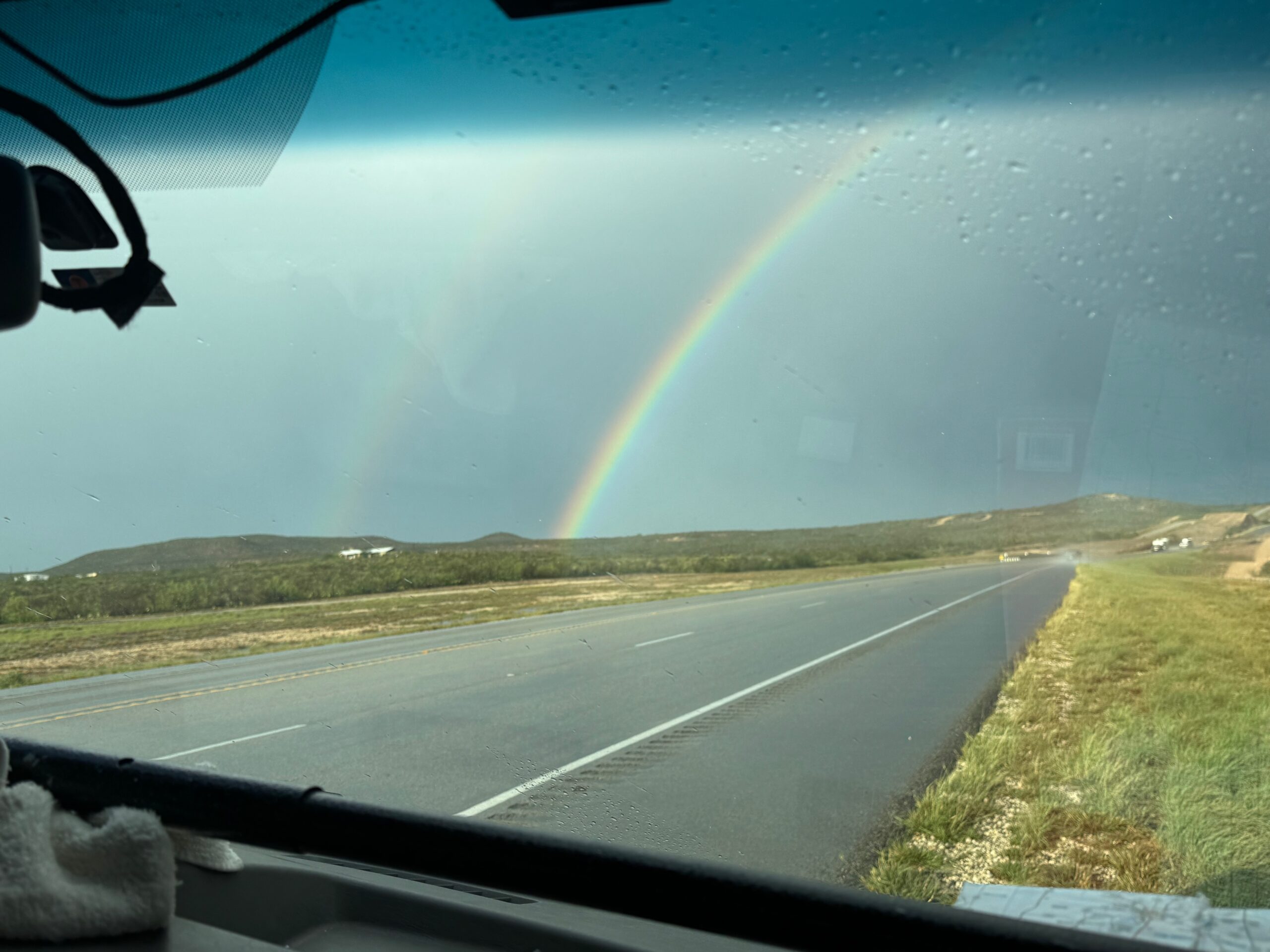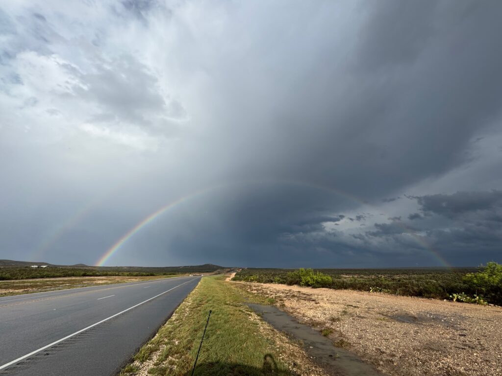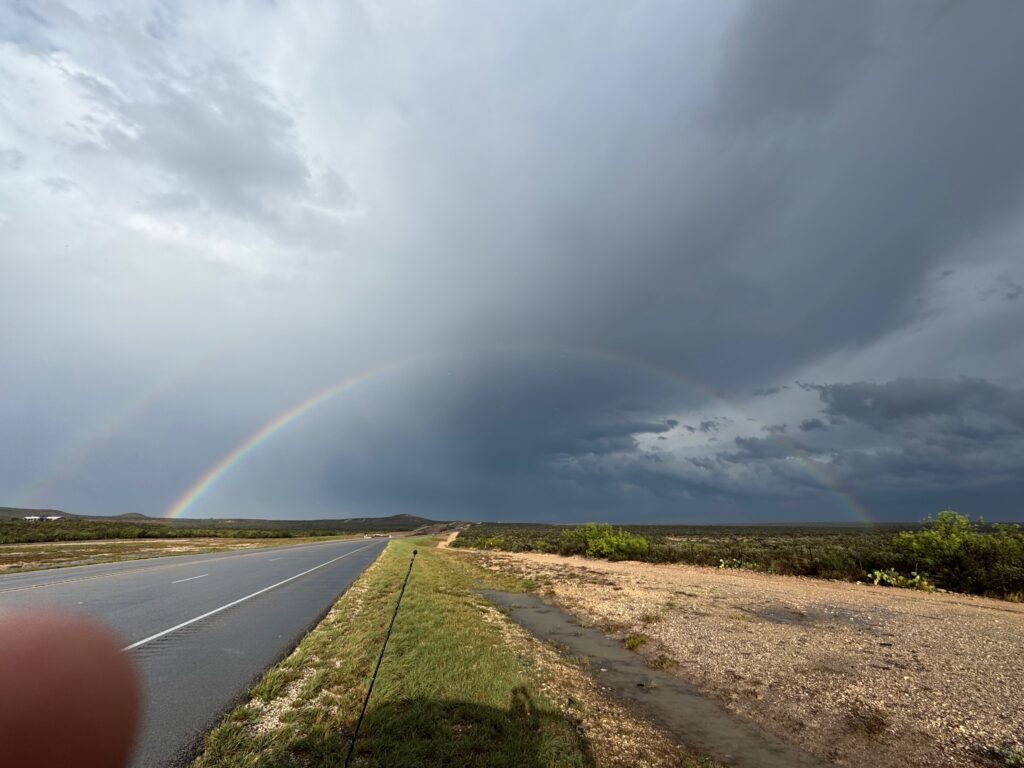 The storm lost its punch as it continued to the NNE into cooler air behind the front. We stopped at the Pecos River viewpoint along U.S. 90 and had a double rainbow to photograph, too.