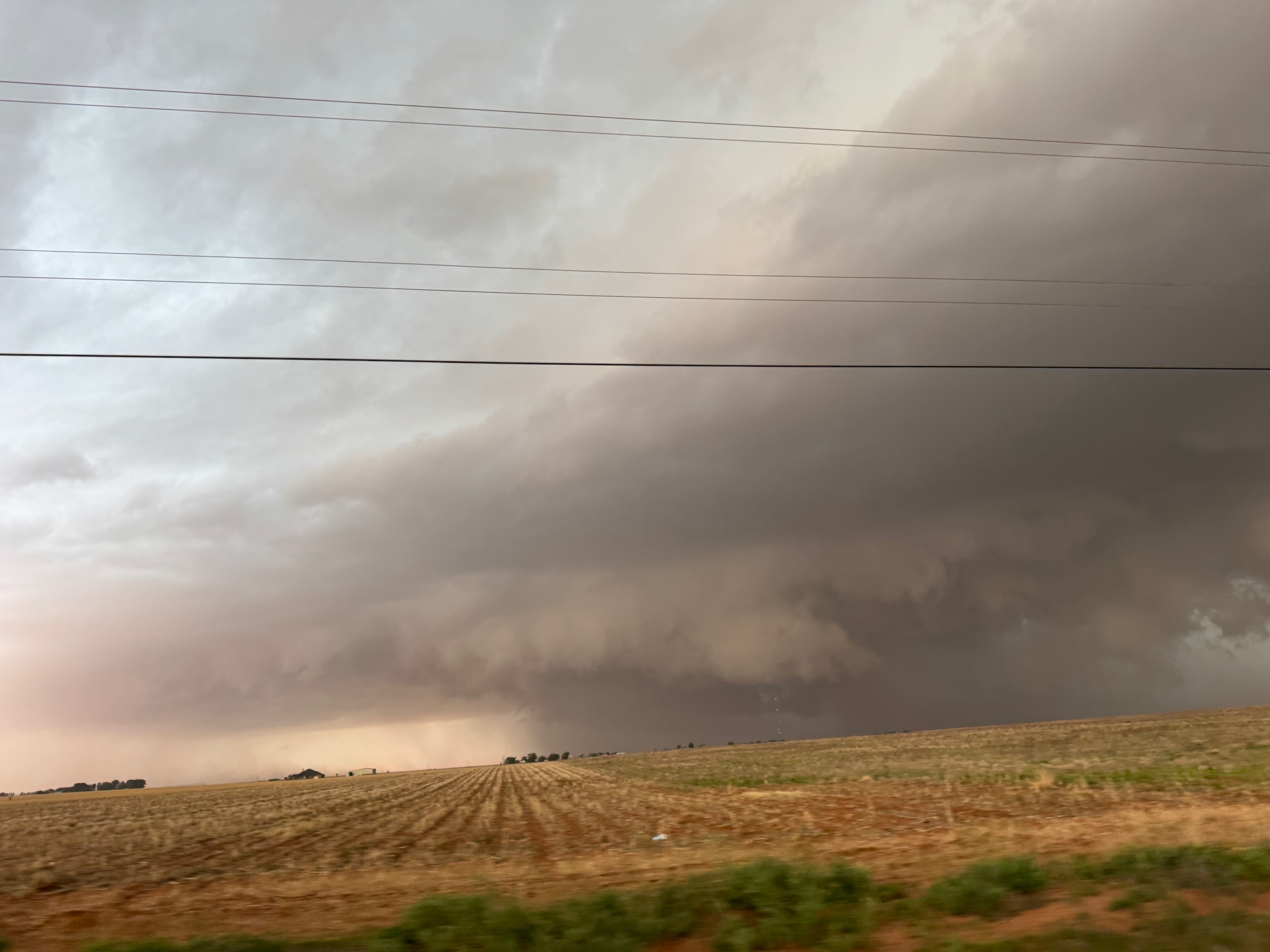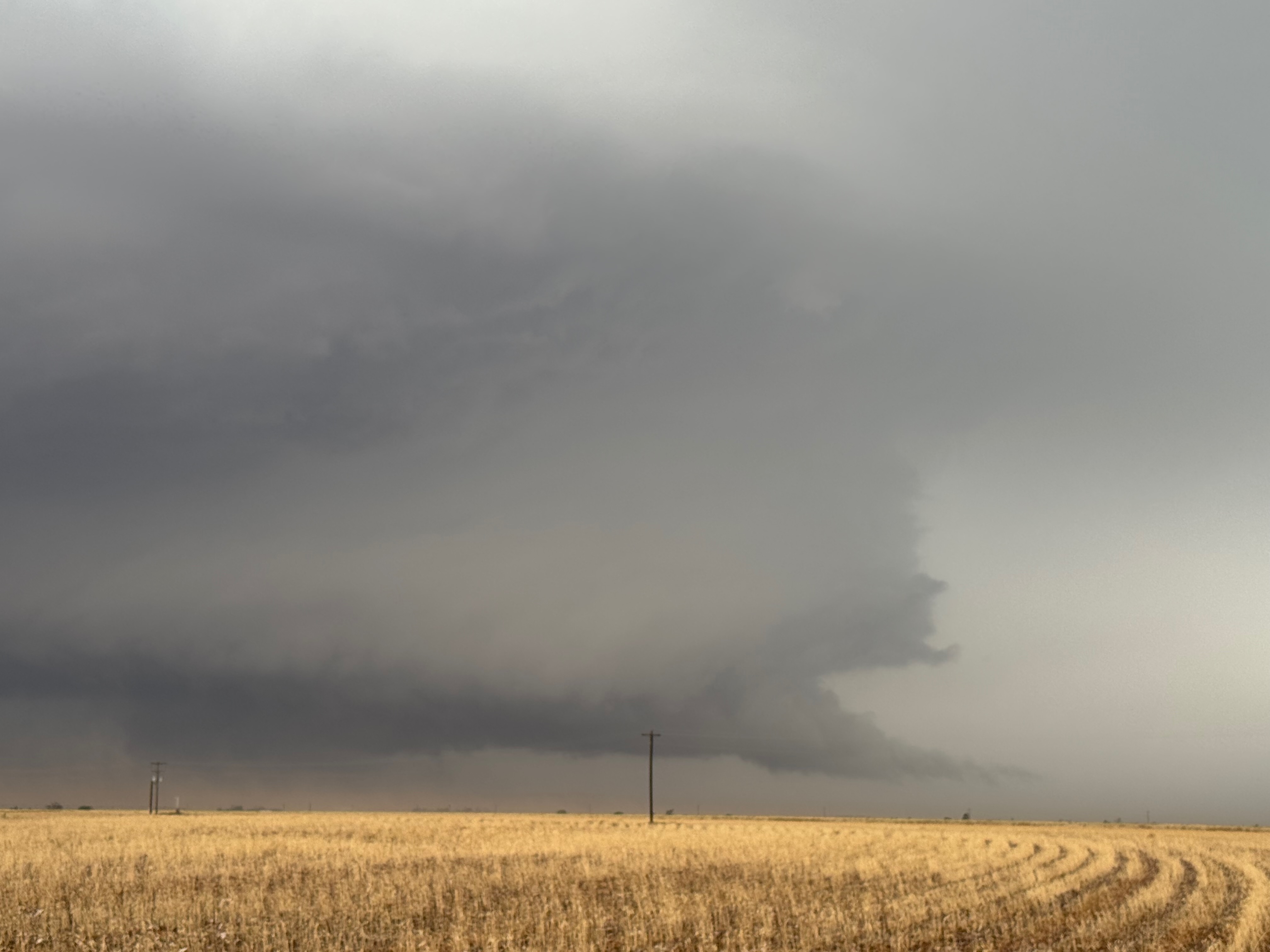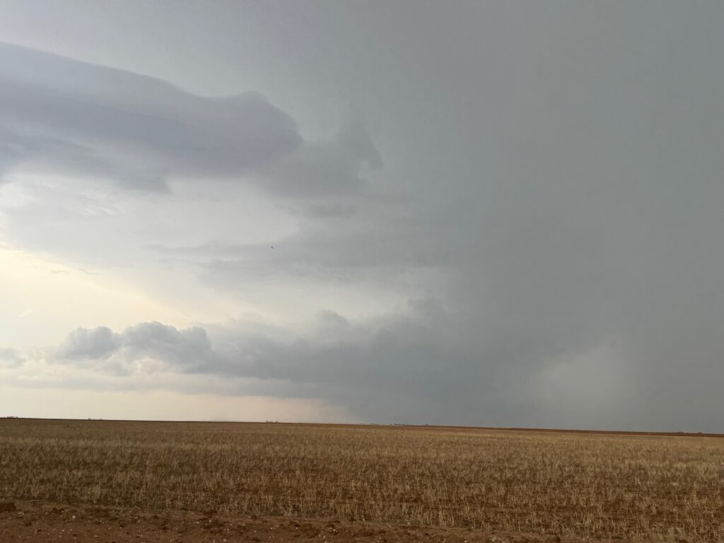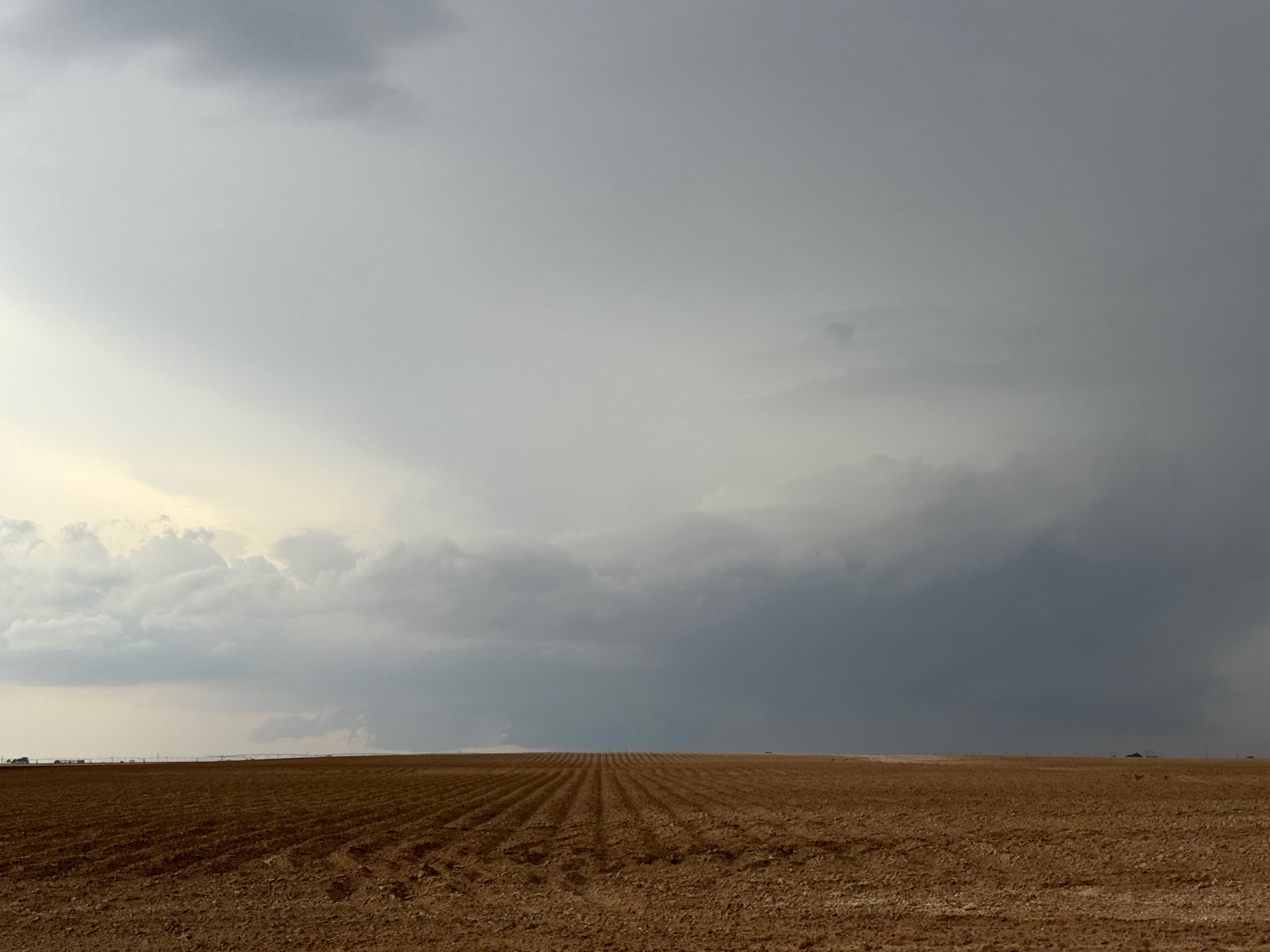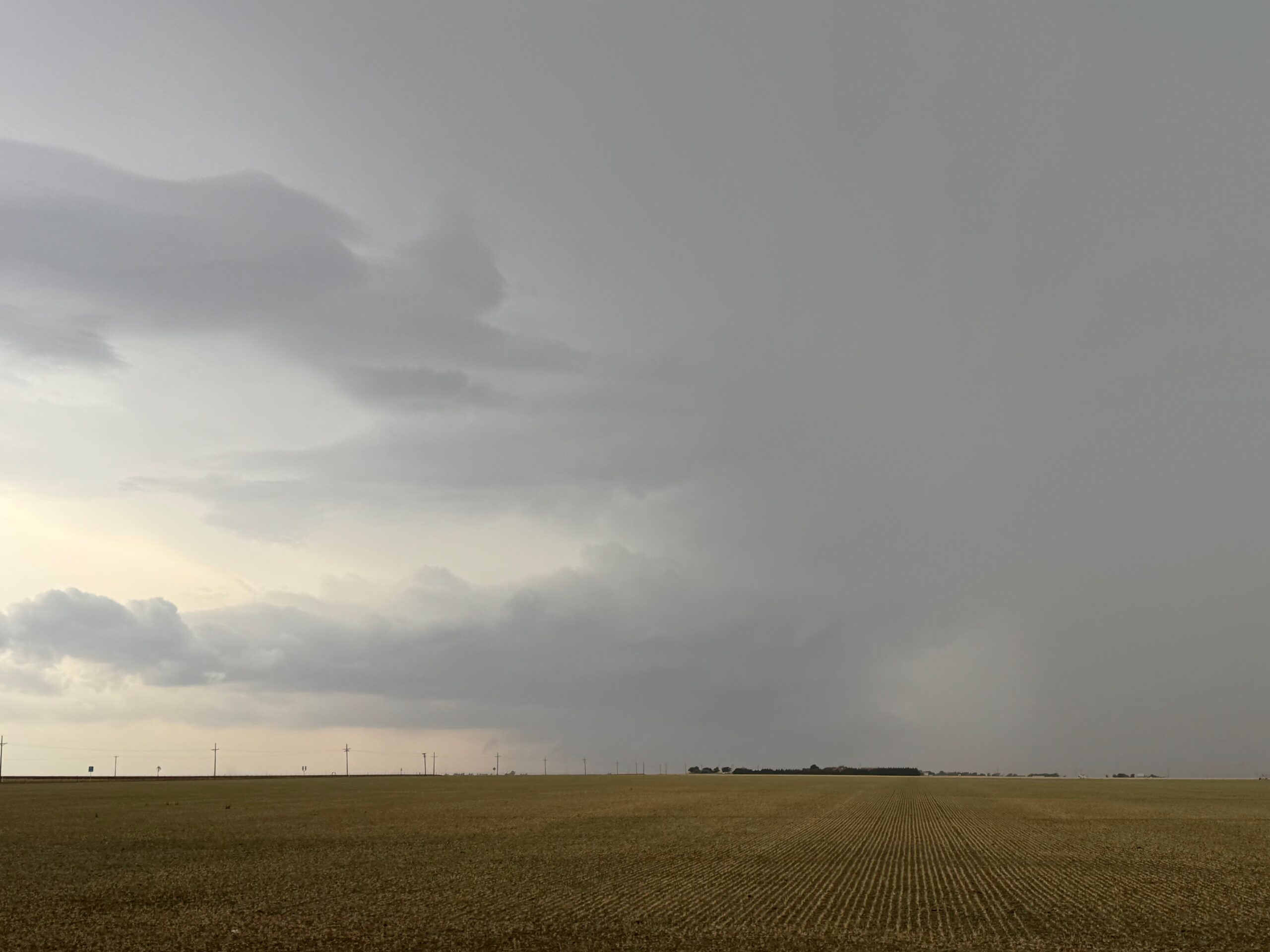 This was a fun chase. We had to boogie south from Pampa after lunch to get south of a front that was sagging south, just south of Lubbock. I know, I used the word “south” a little too much in that sentence. Too bad. Our departure from Pampa was a little delayed as one in our group had to visit urgent care. Warm and moist air was just south of the E-W front, and SPC showed a 5% tornado risk. We dropped south from Wolfforth to position east of severe storm near Brownfield. This gave us a good look at storm structure. The action area featured decent lowerings and wall clouds and laminar sides. A tornado or two was/were reported from this storm near Brownfield. These were described as “brief” and/or “landspout” and we did not observe a tornado.
