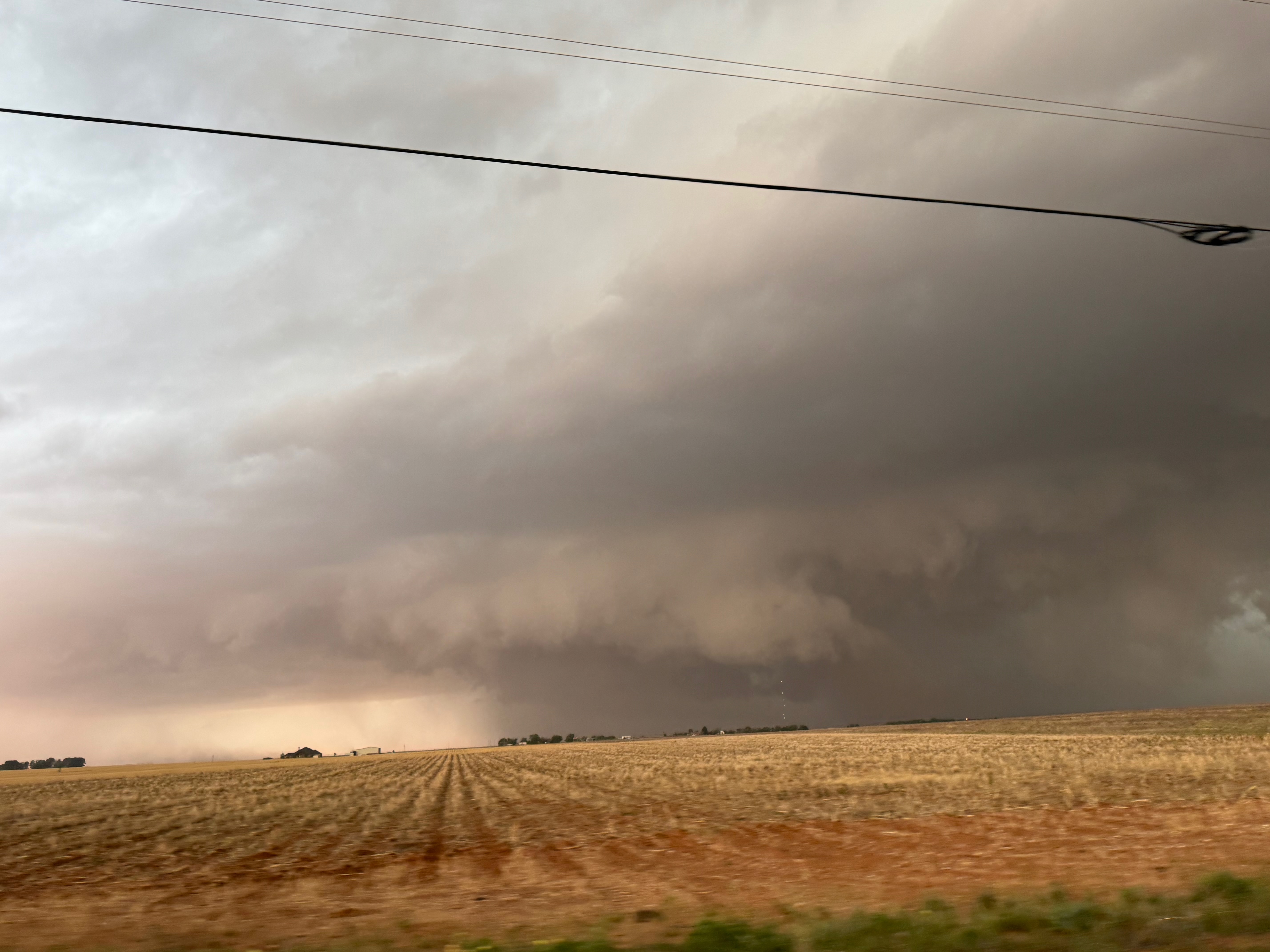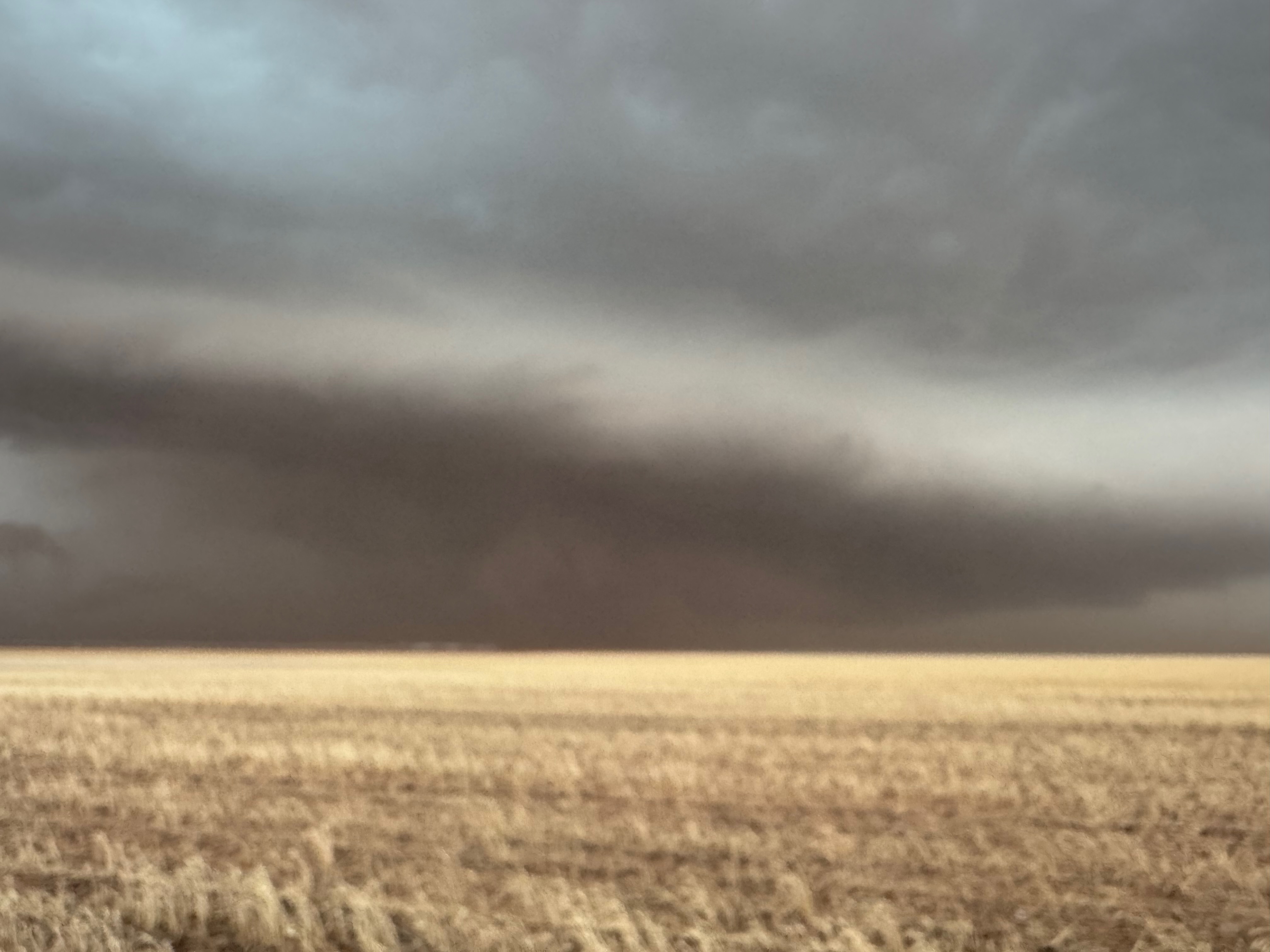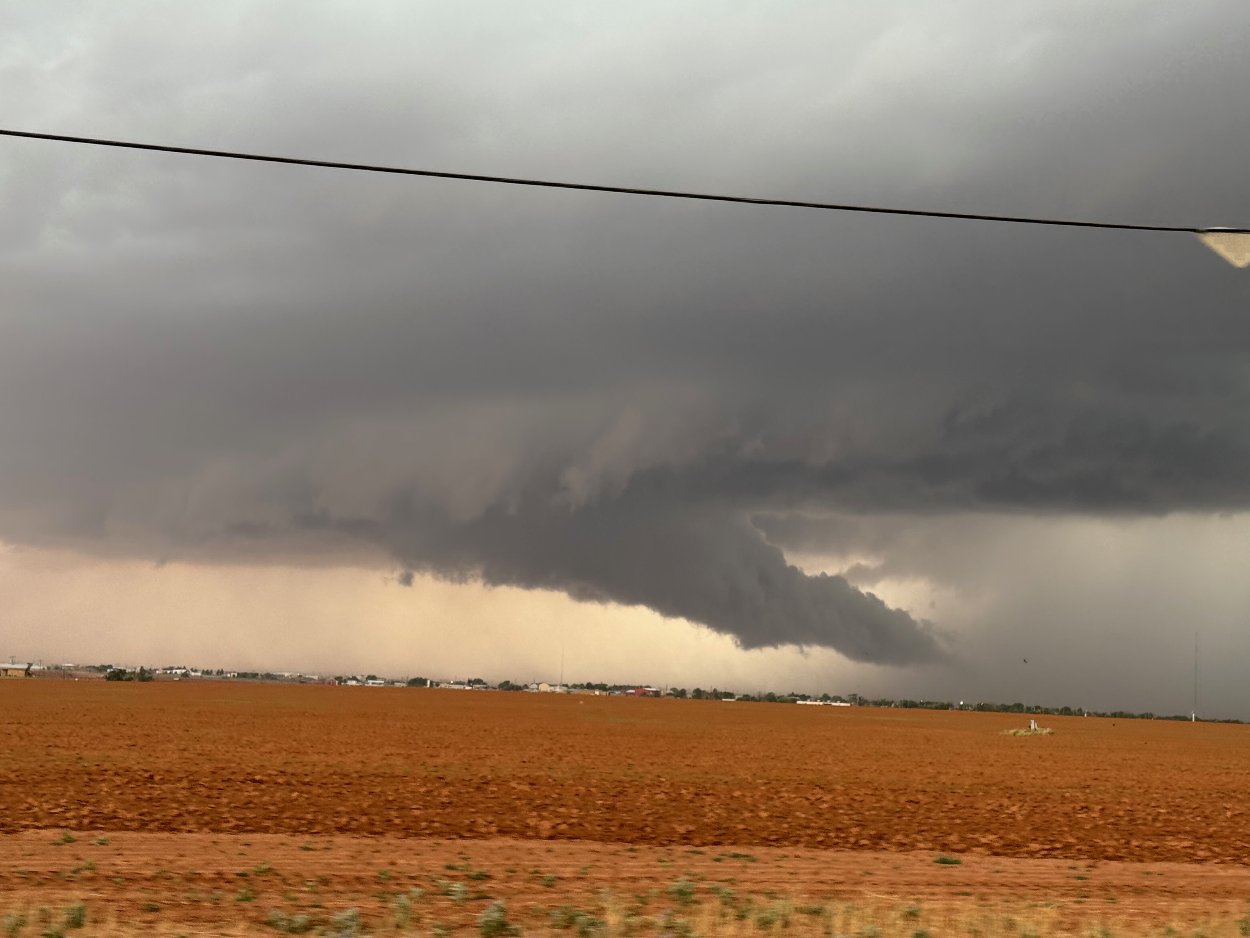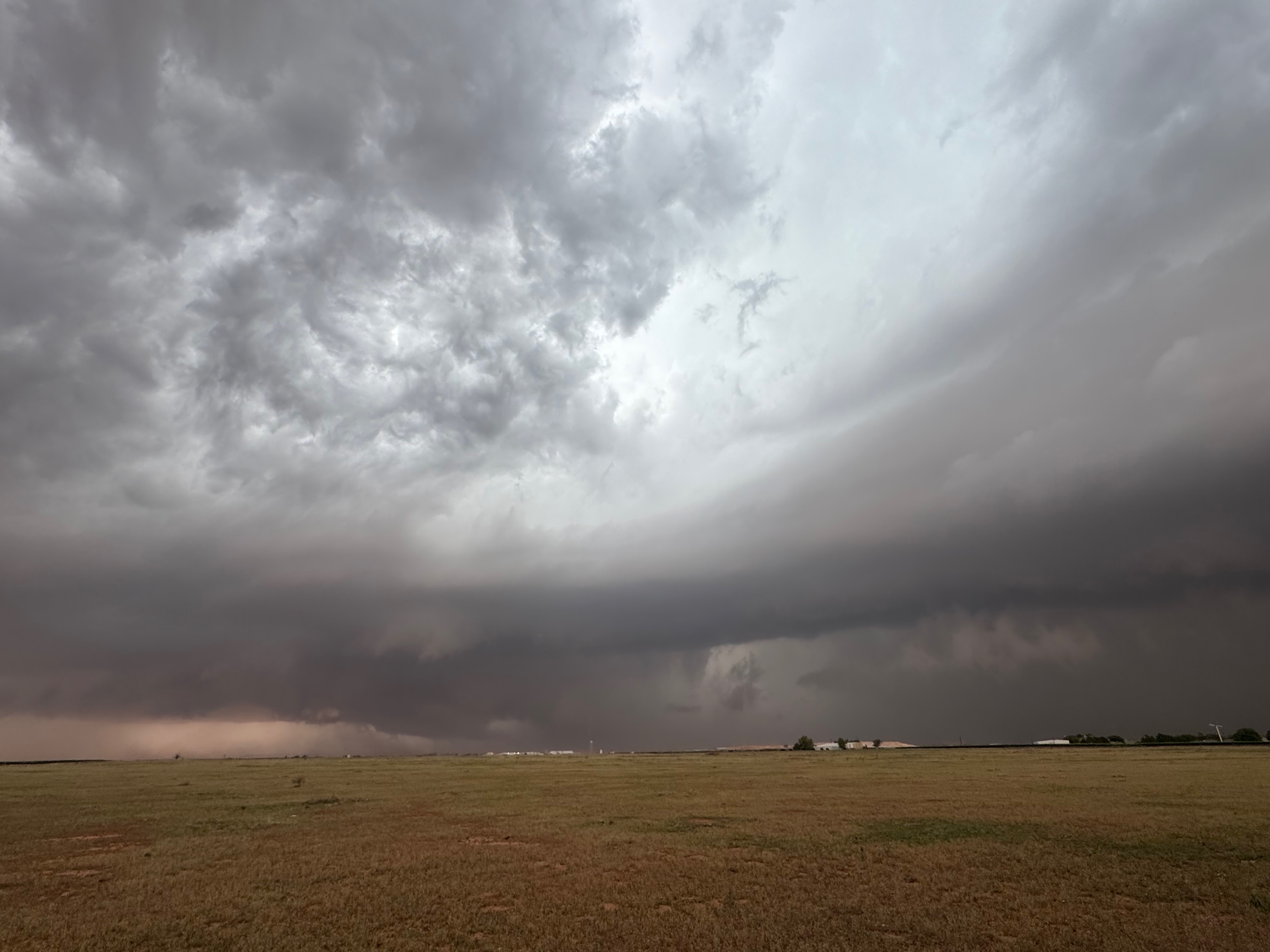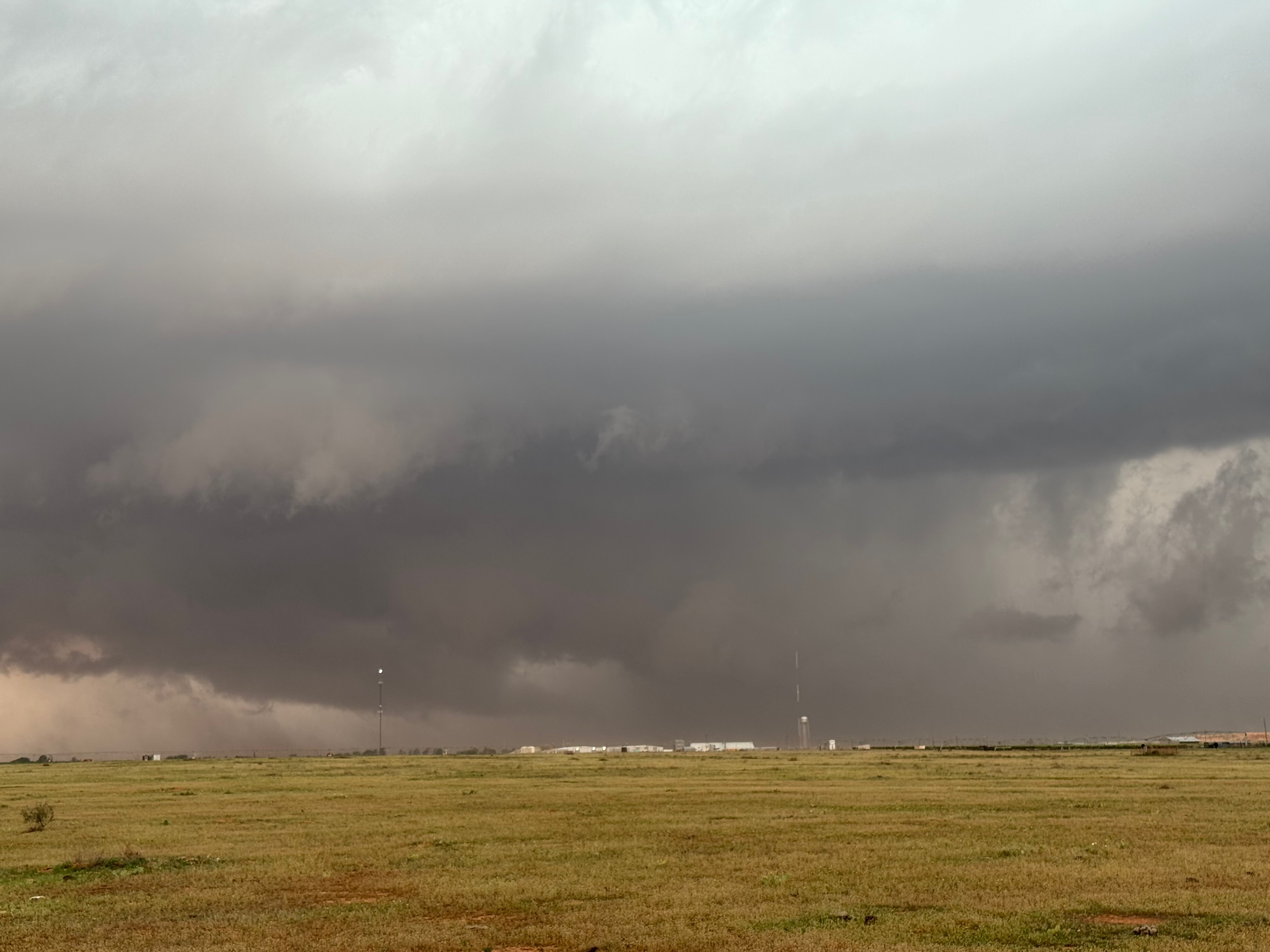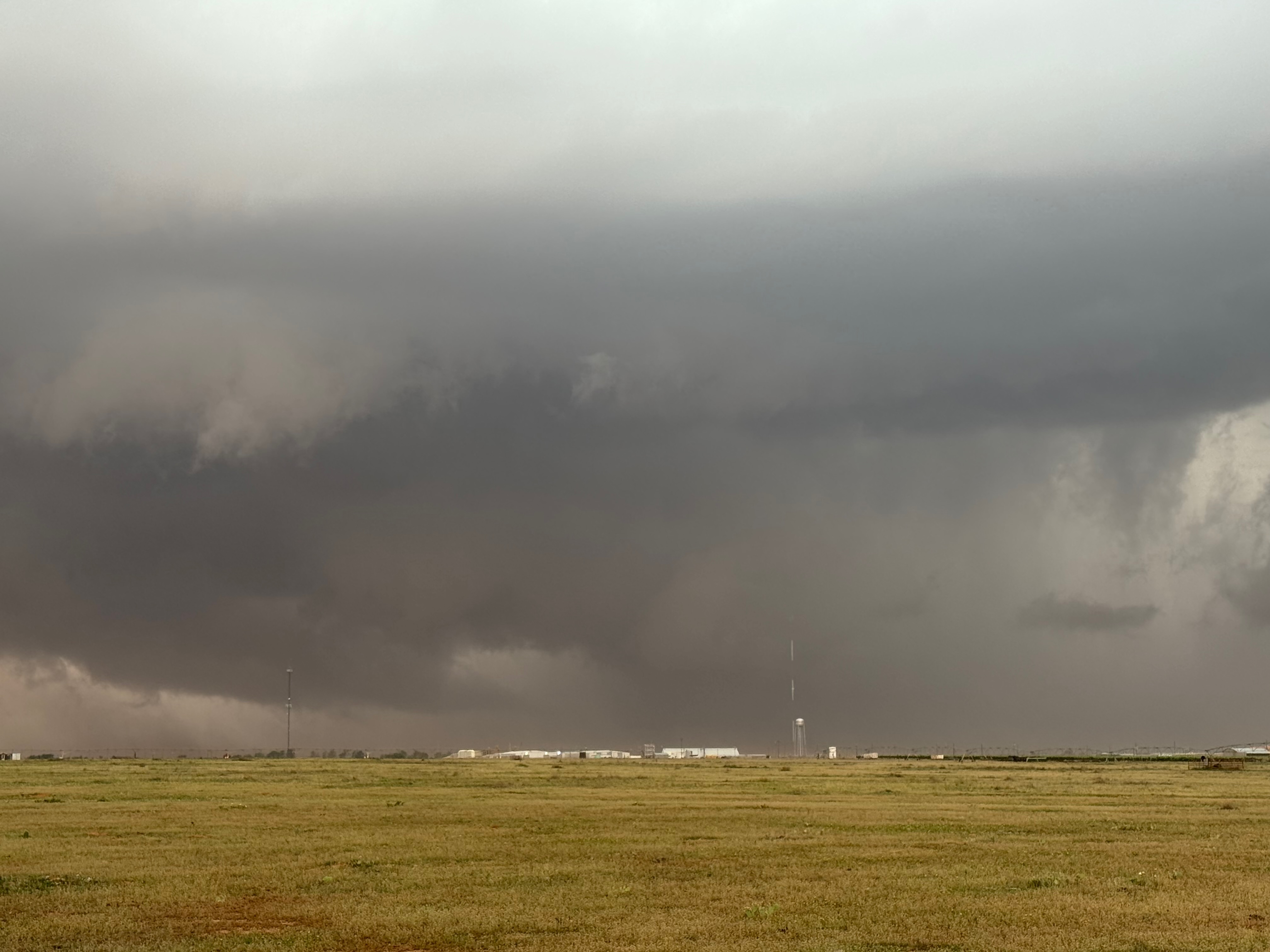 This was a fun chase. We had to boogie south from Pampa after lunch to get south of a front that was sagging south, just south of Lubbock. I know, I used the word “south” a little too much in that sentence. Too bad. Our departure from Pampa was a little delayed as one in our group had to visit urgent care. Warm and moist air was just south of the E-W front, and SPC showed a 5% tornado risk. We dropped south from Wolfforth to position east of severe storm near Brownfield. This gave us a good look at storm structure. The action area featured decent lowerings and wall clouds and laminar sides. A tornado or two was/were reported from this storm near Brownfield. These were described as “brief” and/or “landspout” and we did not observe a tornado.