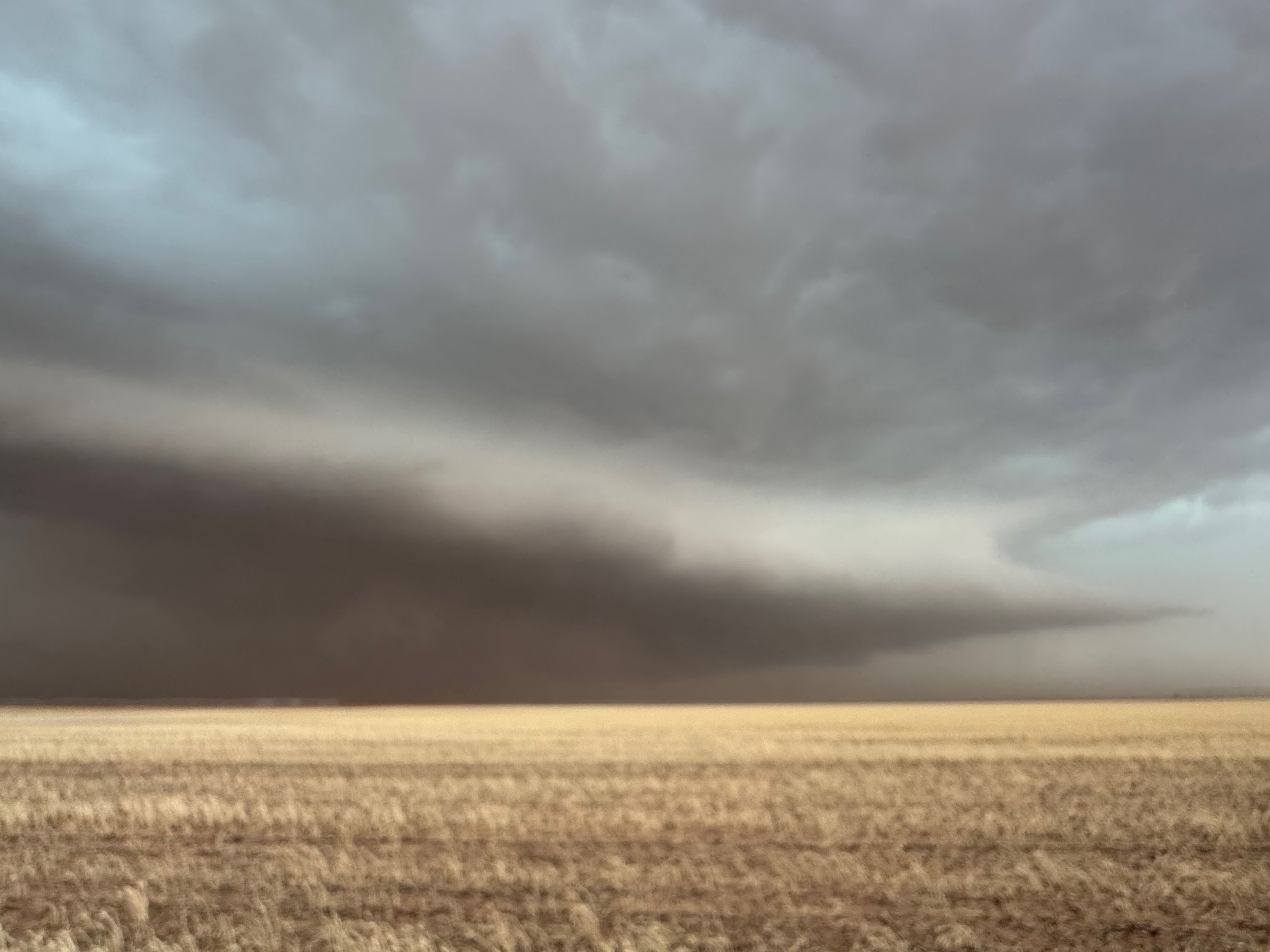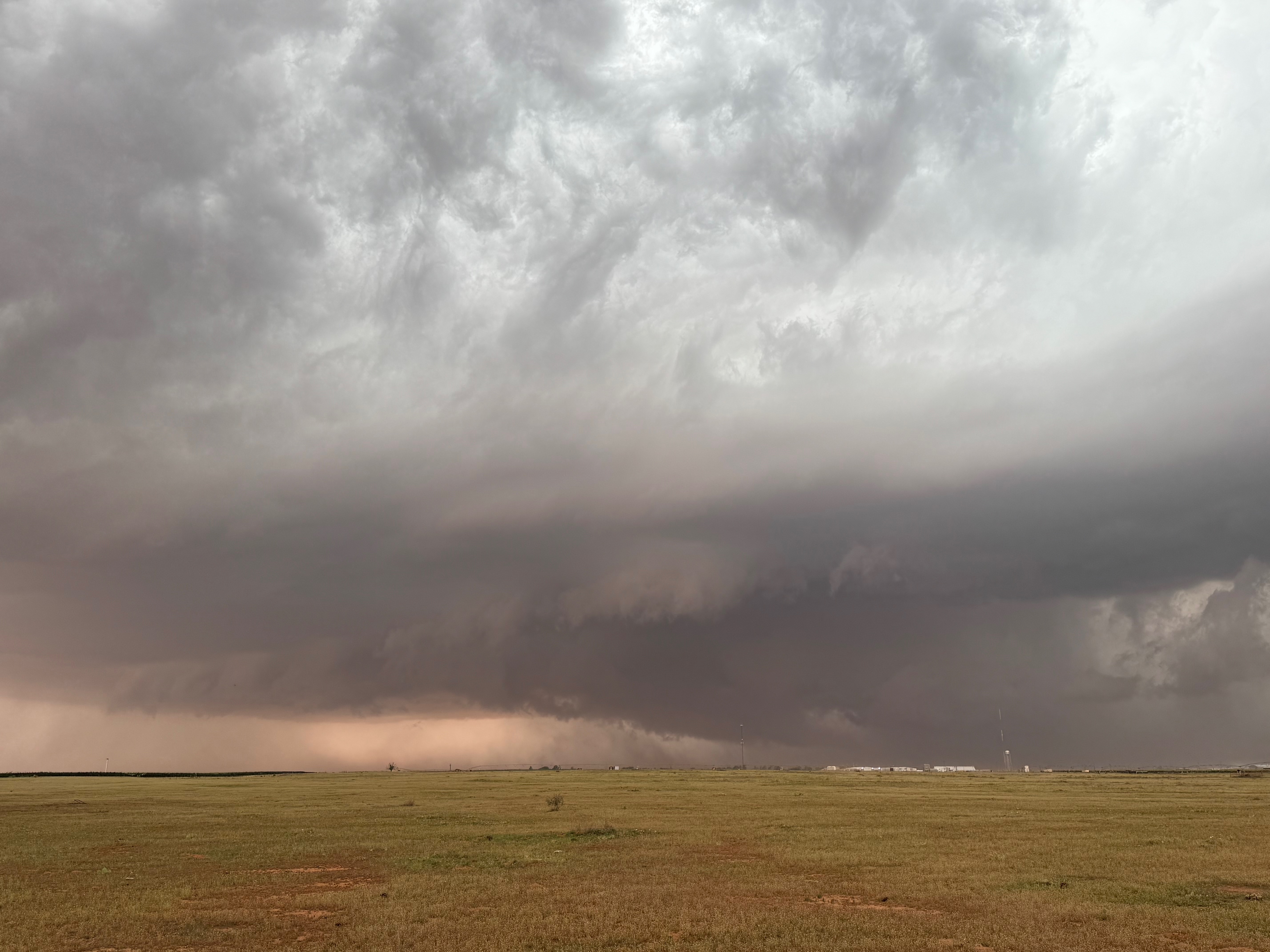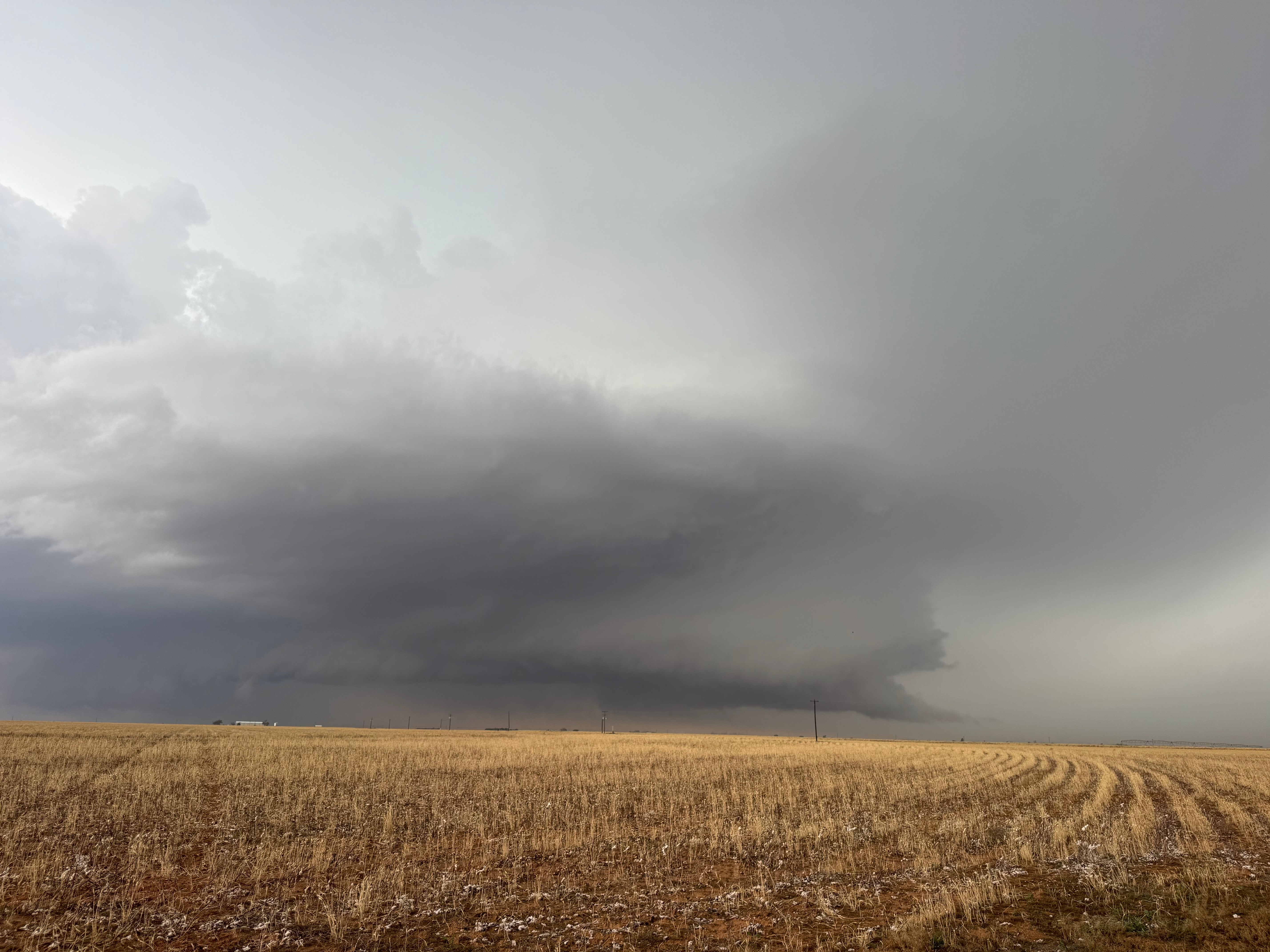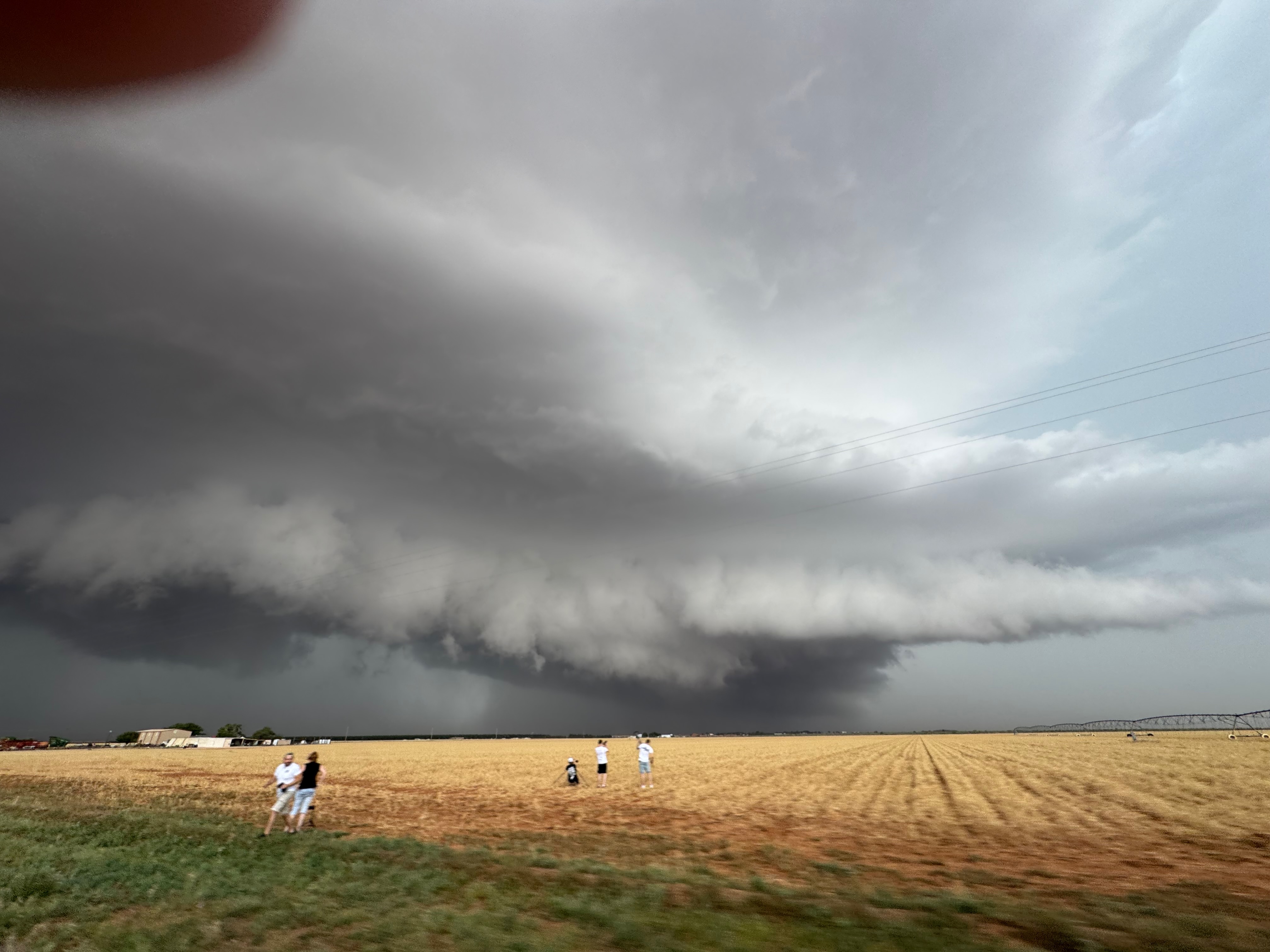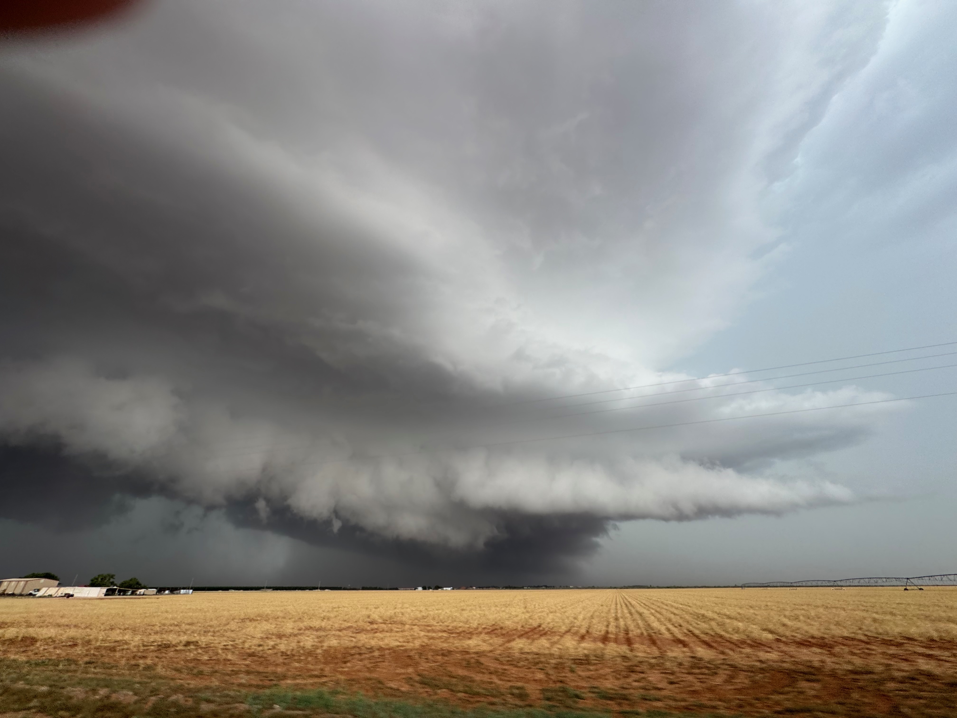 This was a fun chase. We had to boogie south from Pampa after lunch to get south of a front that was sagging south, just south of Lubbock. I know, I used the word “south” a little too much in that sentence. Too bad. Our departure from Pampa was a little delayed as one in our group had to visit urgent care. Warm and moist air was just south of the E-W front, and SPC showed a 5% tornado risk. We dropped south from Wolfforth to position east of severe storm near Brownfield. This gave us a good look at storm structure. The action area featured decent lowerings and wall clouds and laminar sides. A tornado or two was/were reported from this storm near Brownfield. These were described as “brief” and/or “landspout” and we did not observe a tornado.
