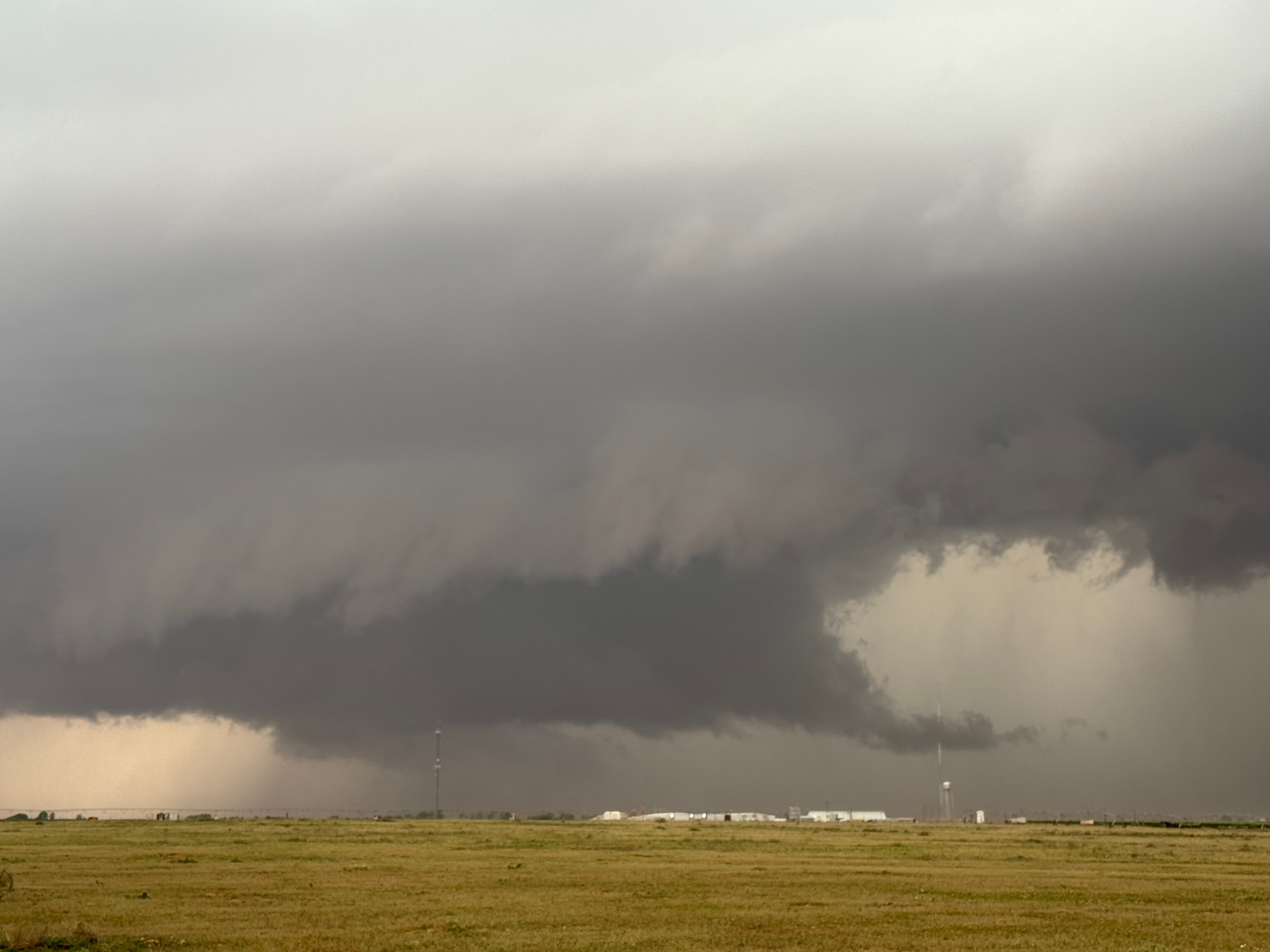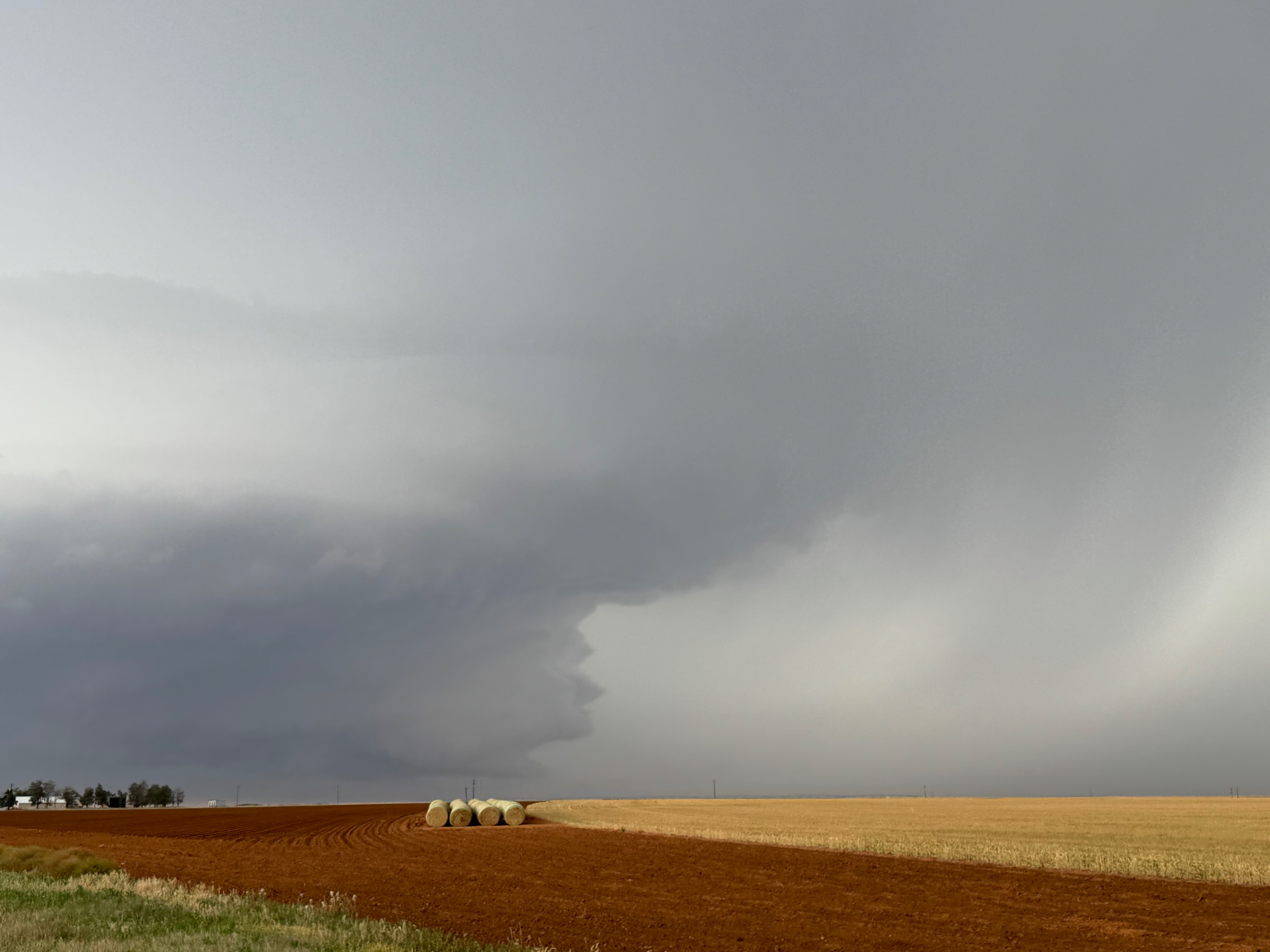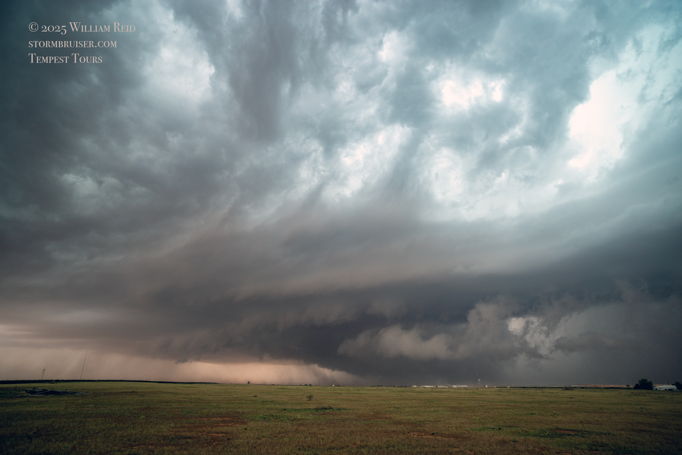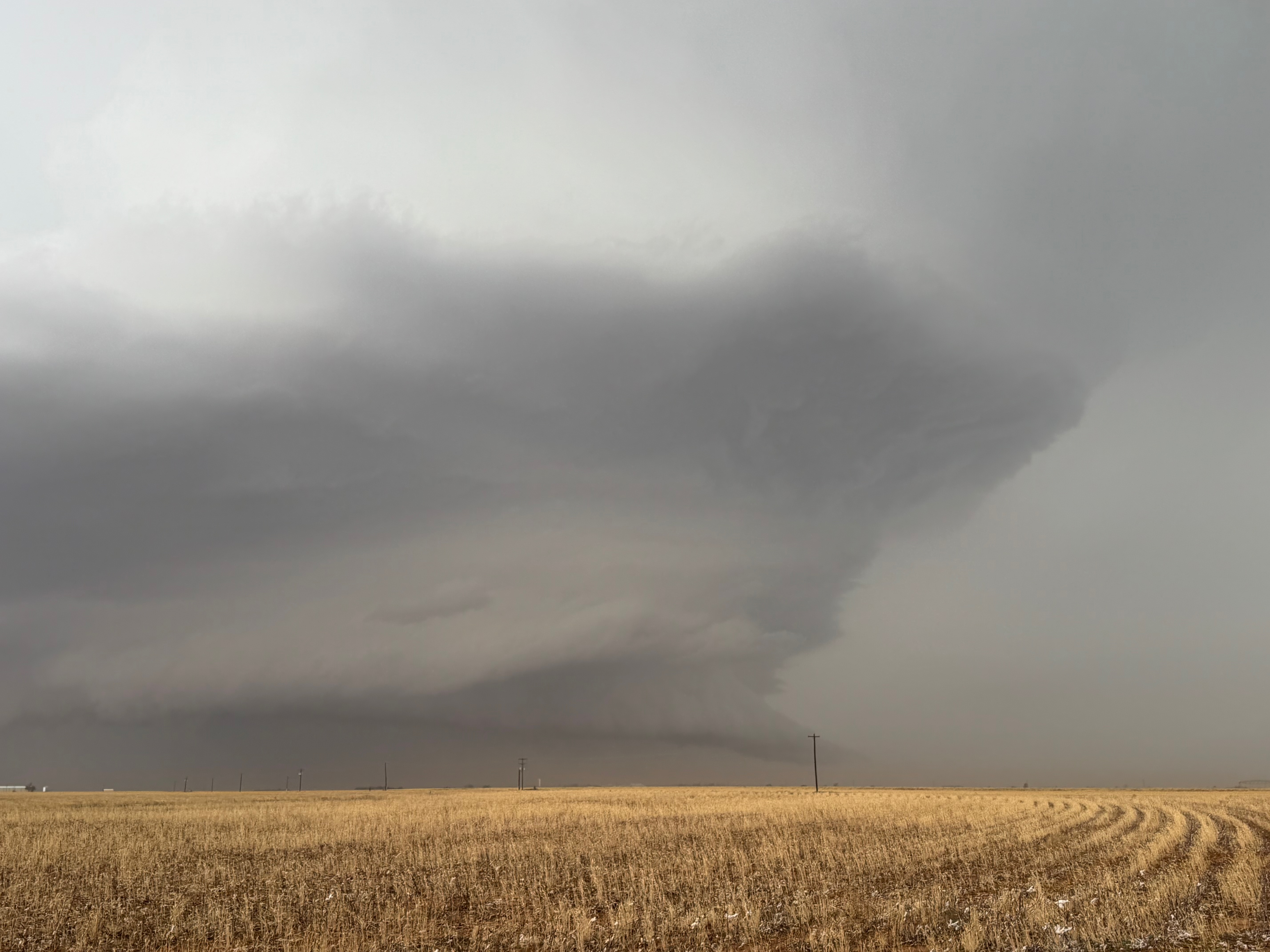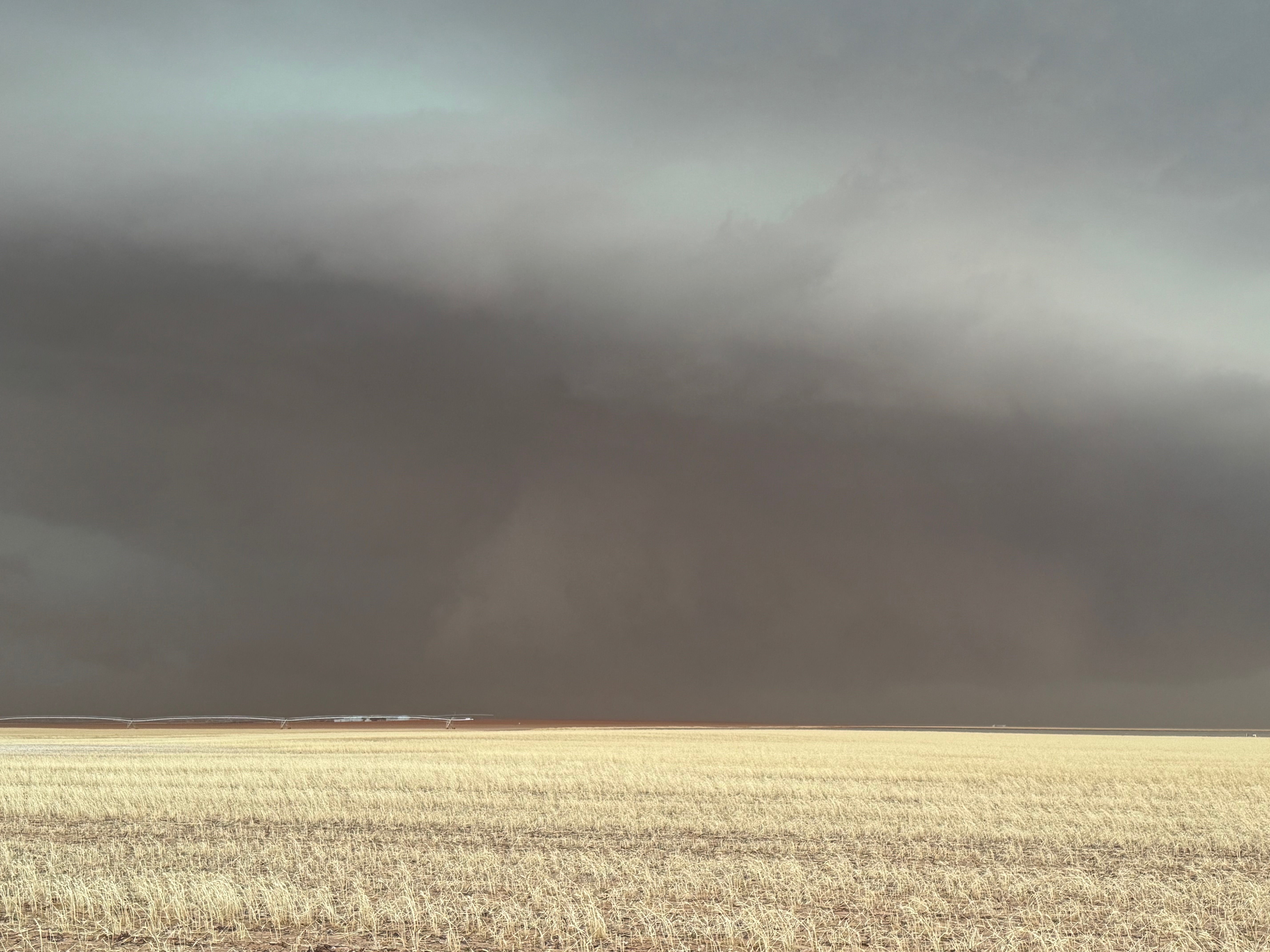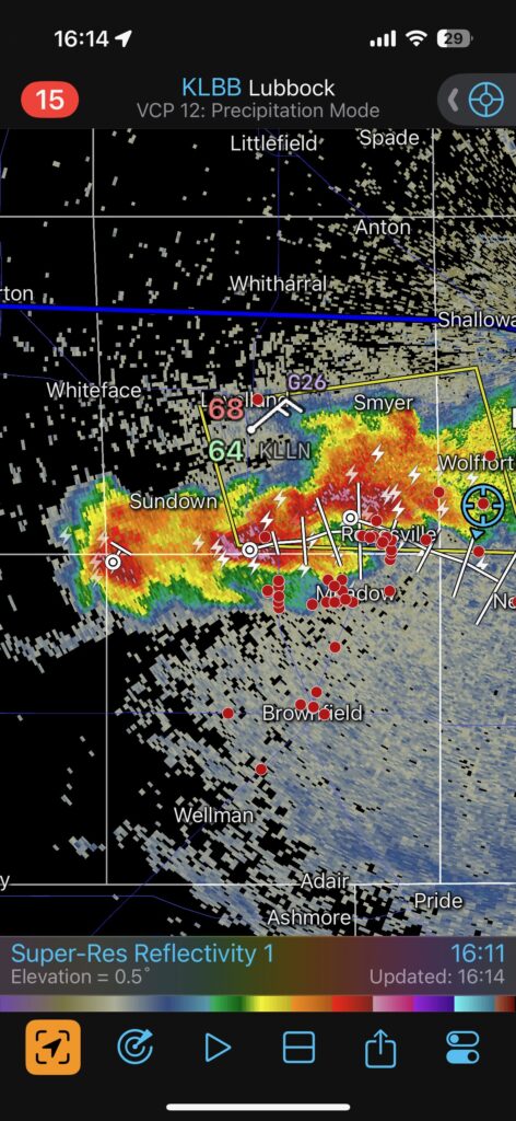 This was a fun chase. We had to boogie south from Pampa after lunch to get south of a front that was sagging south, just south of Lubbock. I know, I used the word “south” a little too much in that sentence. Too bad. Our departure from Pampa was a little delayed as one in our group had to visit urgent care. Warm and moist air was just south of the E-W front, and SPC showed a 5% tornado risk. We dropped south from Wolfforth to position east of severe storm near Brownfield. This gave us a good look at storm structure. The action area featured decent lowerings and wall clouds and laminar sides. A tornado or two was/were reported from this storm near Brownfield. These were described as “brief” and/or “landspout” and we did not observe a tornado.