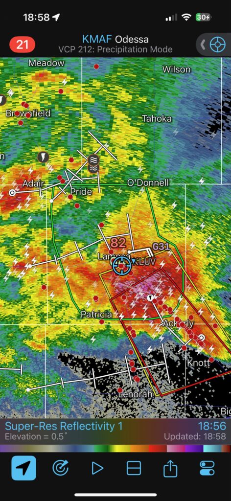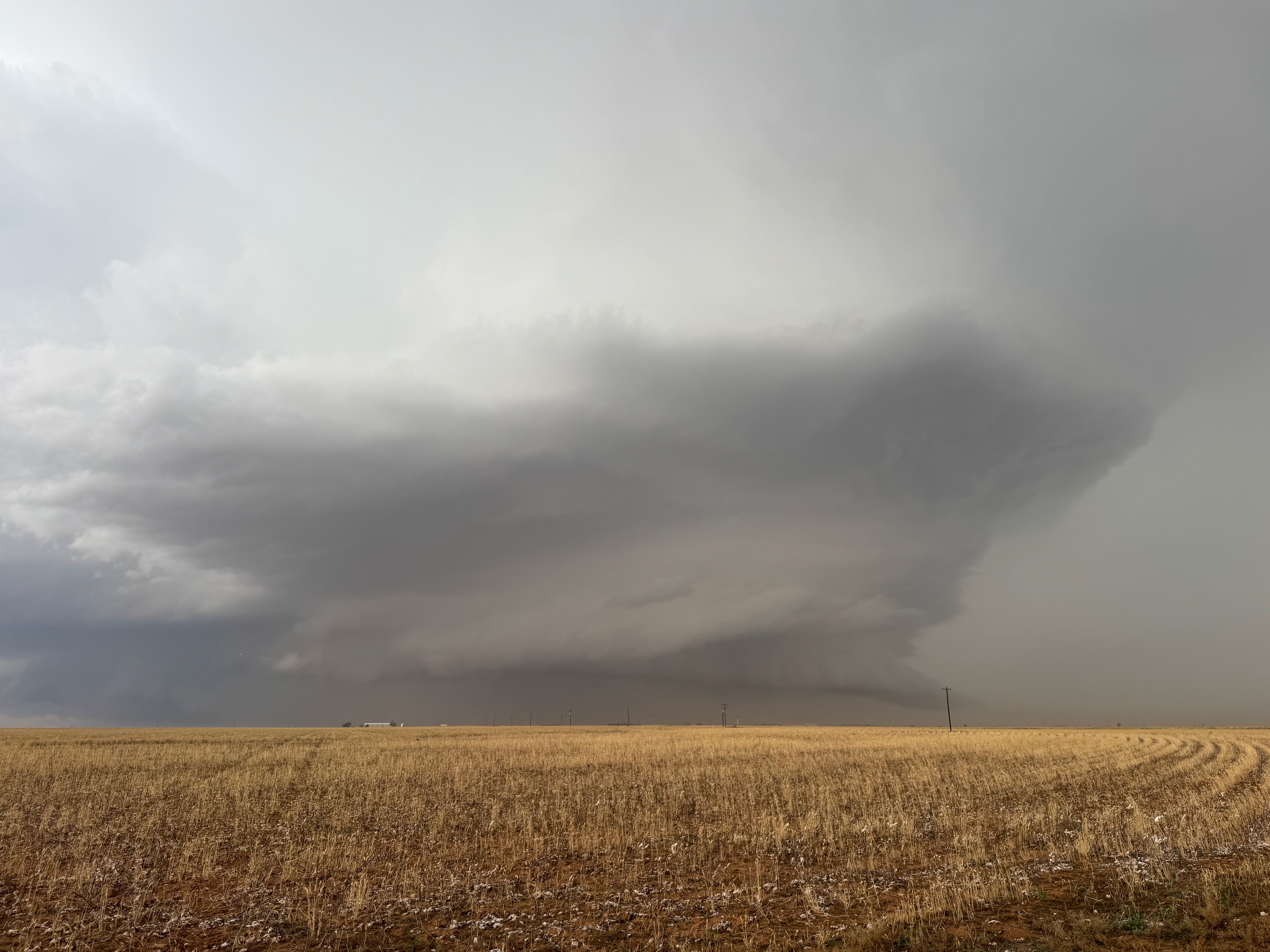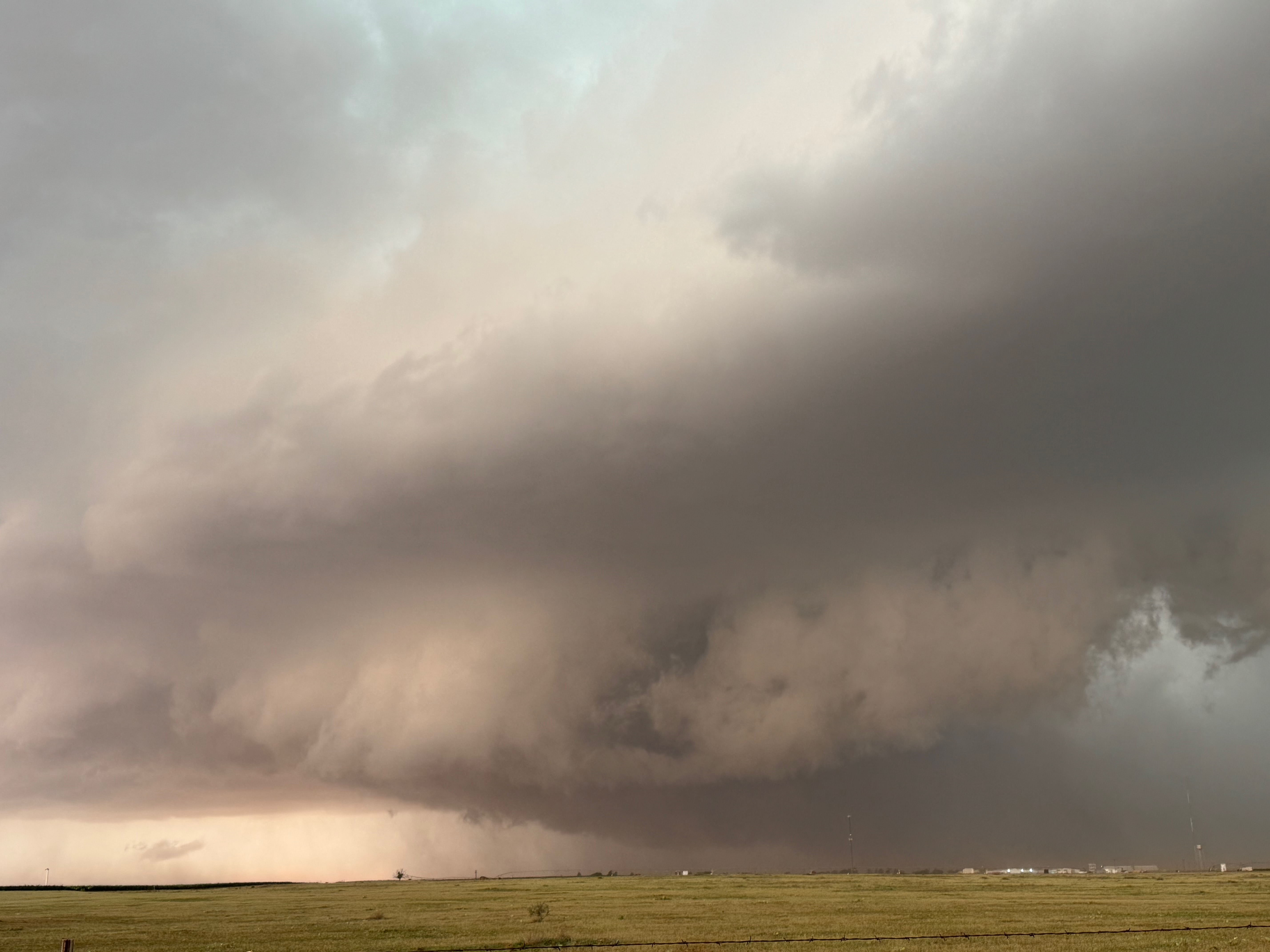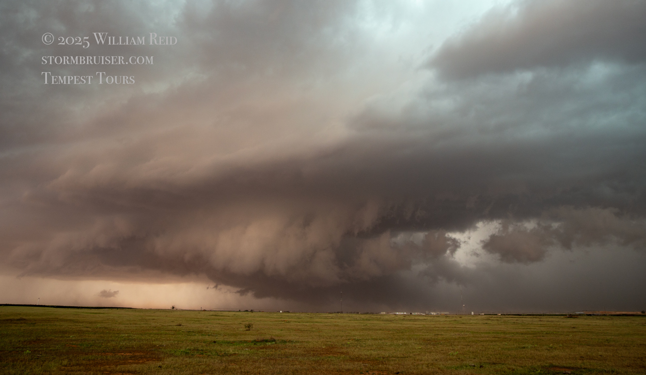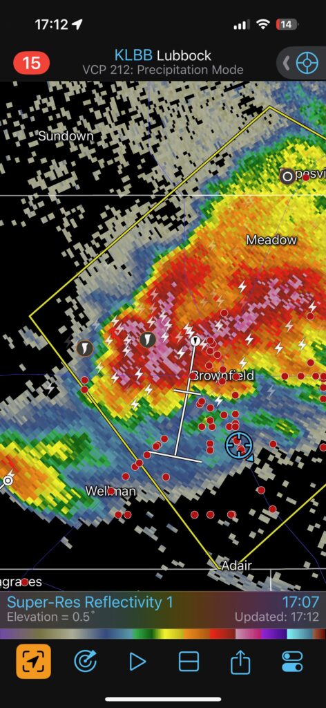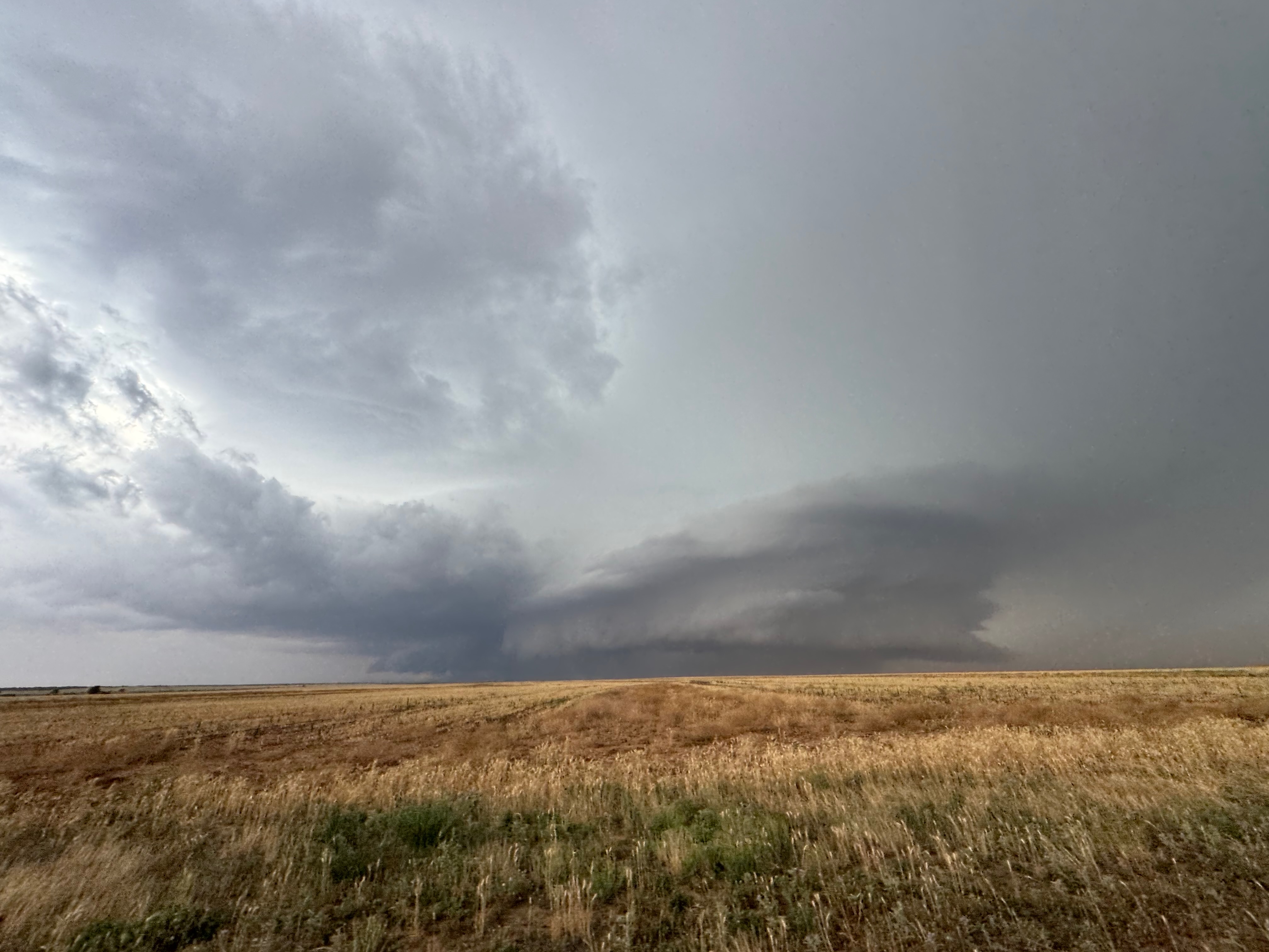 This was a fun chase. We had to boogie south from Pampa after lunch to get south of a front that was sagging south, just south of Lubbock. I know, I used the word “south” a little too much in that sentence. Too bad. Our departure from Pampa was a little delayed as one in our group had to visit urgent care. Warm and moist air was just south of the E-W front, and SPC showed a 5% tornado risk. We dropped south from Wolfforth to position east of severe storm near Brownfield. This gave us a good look at storm structure. The action area featured decent lowerings and wall clouds and laminar sides. A tornado or two was/were reported from this storm near Brownfield. These were described as “brief” and/or “landspout” and we did not observe a tornado.
