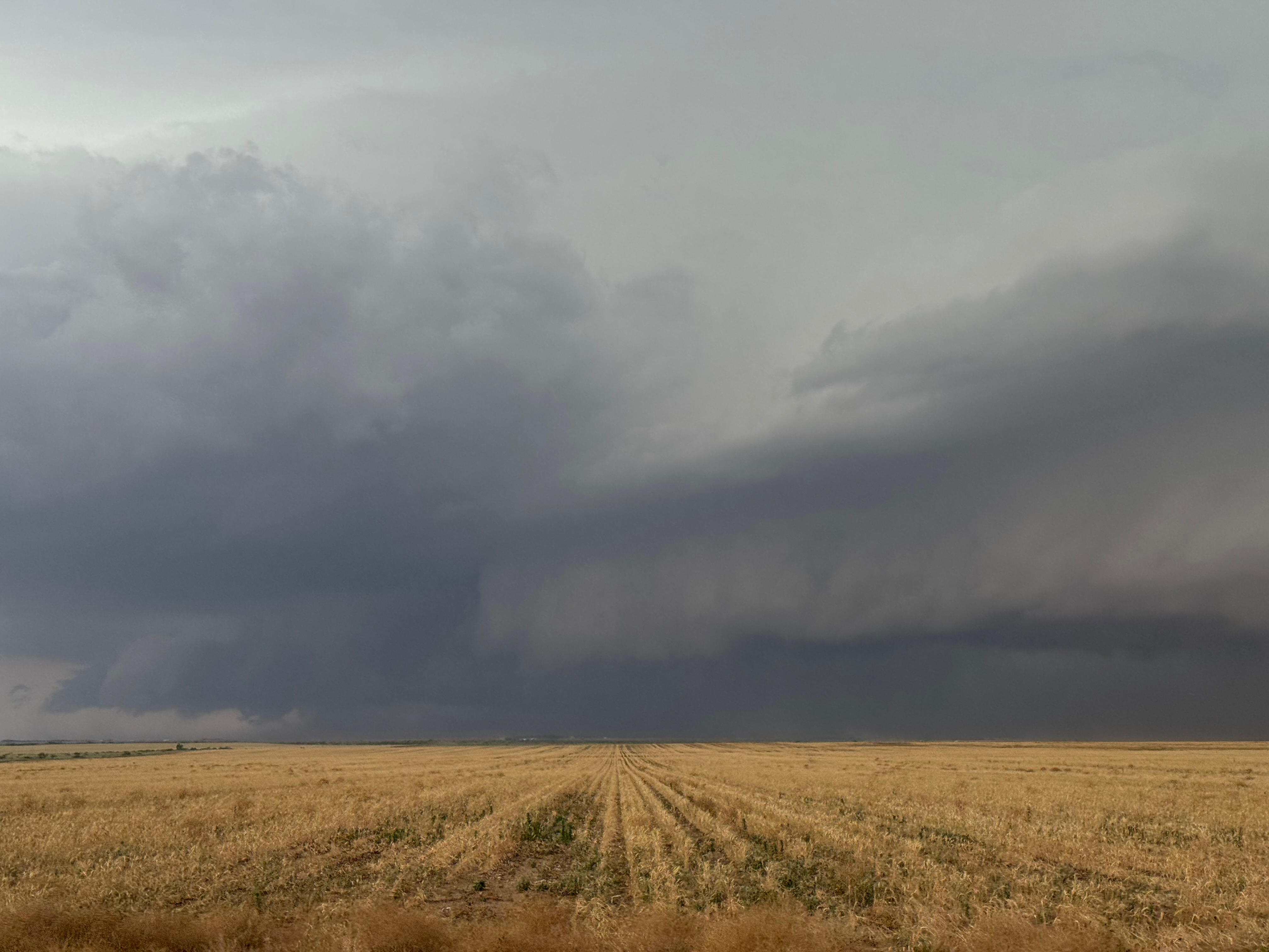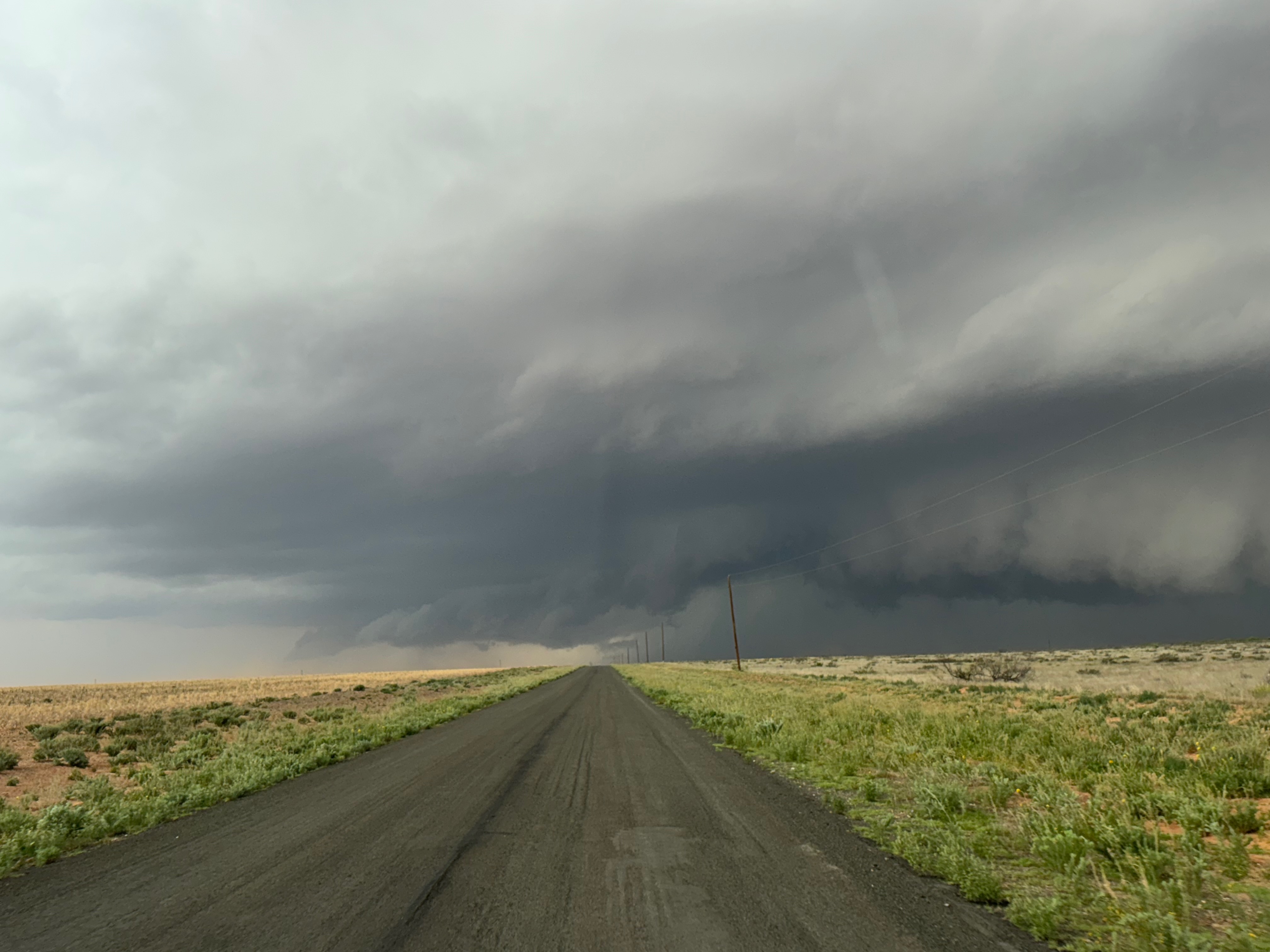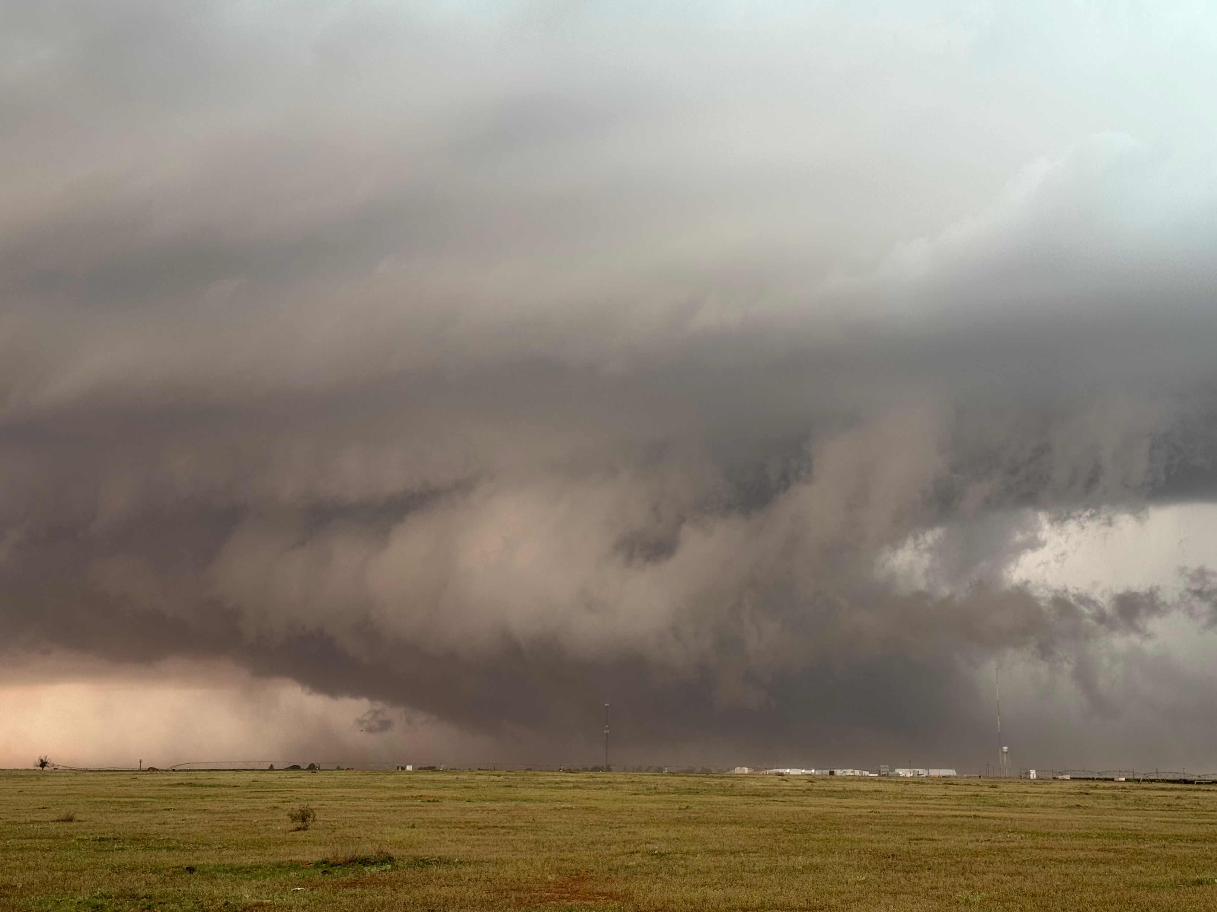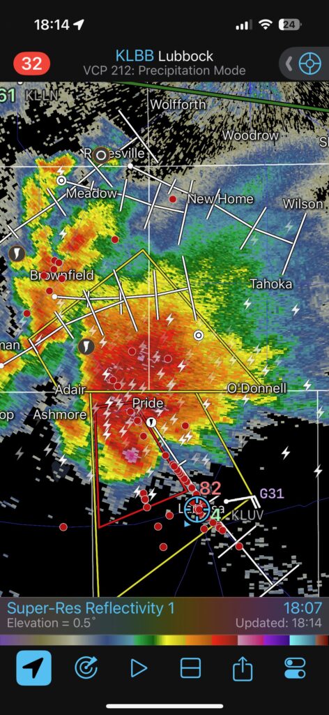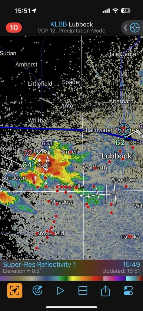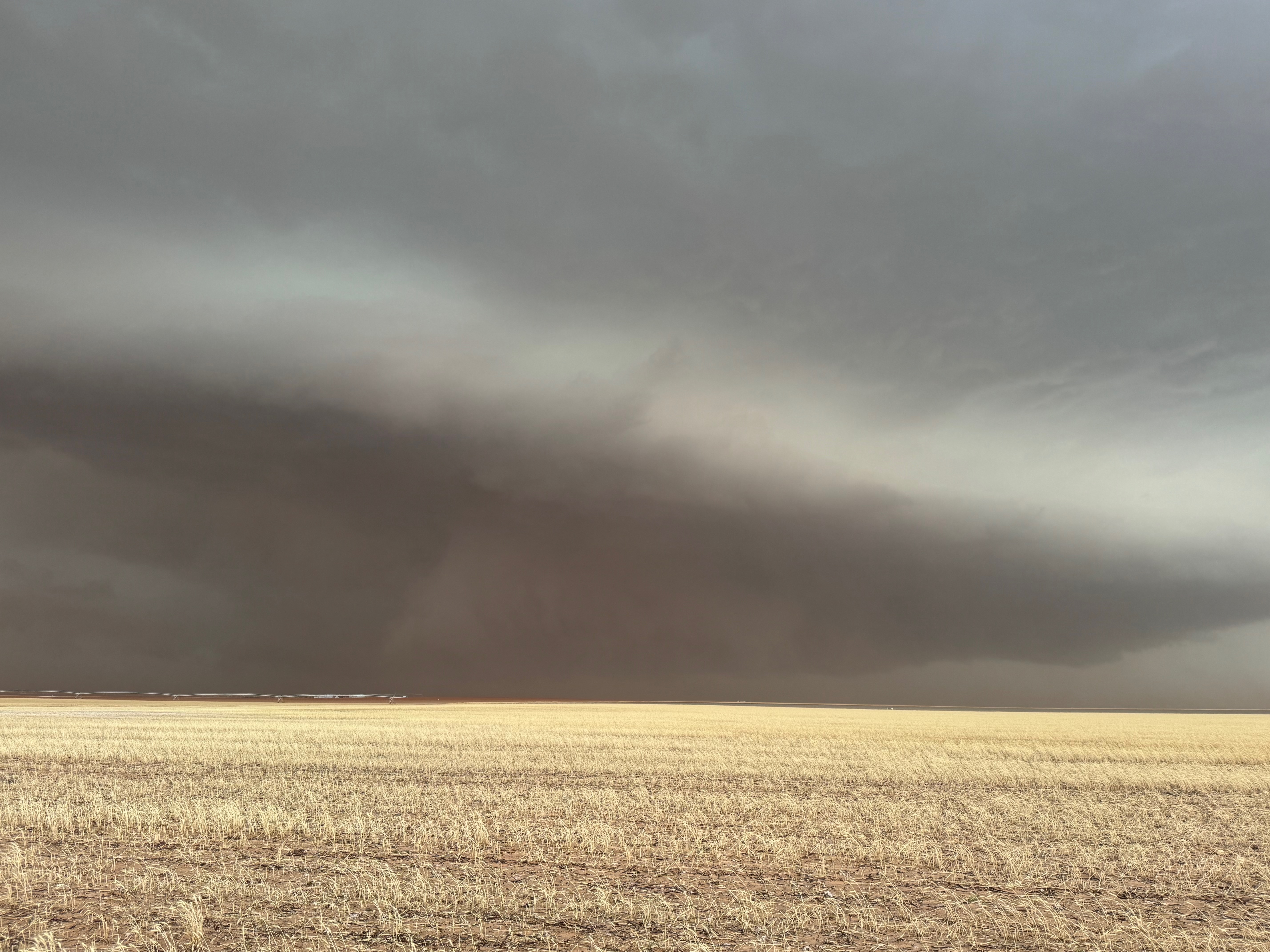 This was a fun chase. We had to boogie south from Pampa after lunch to get south of a front that was sagging south, just south of Lubbock. I know, I used the word “south” a little too much in that sentence. Too bad. Our departure from Pampa was a little delayed as one in our group had to visit urgent care. Warm and moist air was just south of the E-W front, and SPC showed a 5% tornado risk. We dropped south from Wolfforth to position east of severe storm near Brownfield. This gave us a good look at storm structure. The action area featured decent lowerings and wall clouds and laminar sides. A tornado or two was/were reported from this storm near Brownfield. These were described as “brief” and/or “landspout” and we did not observe a tornado.