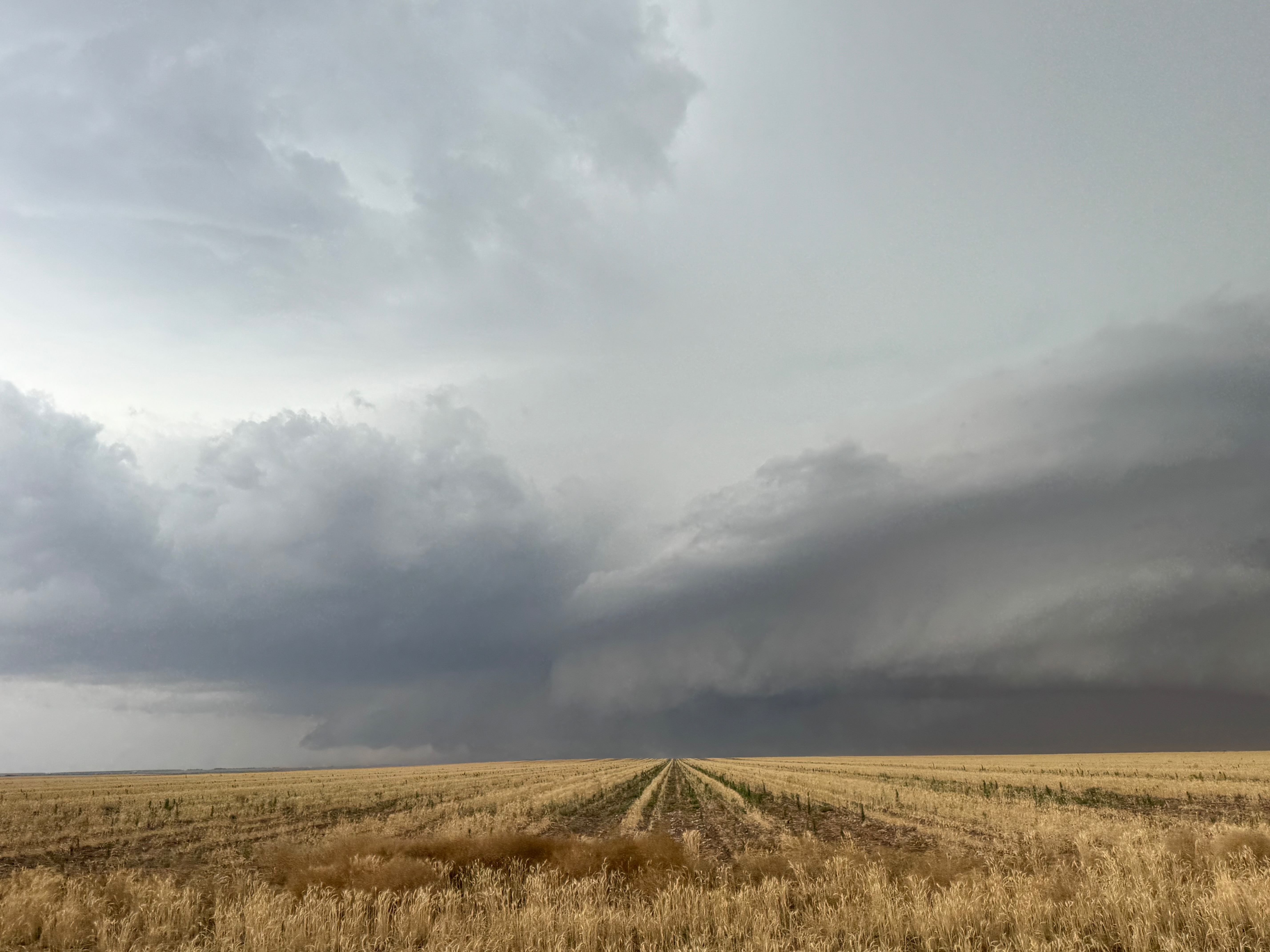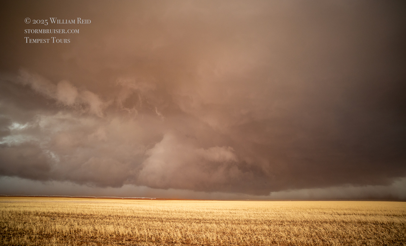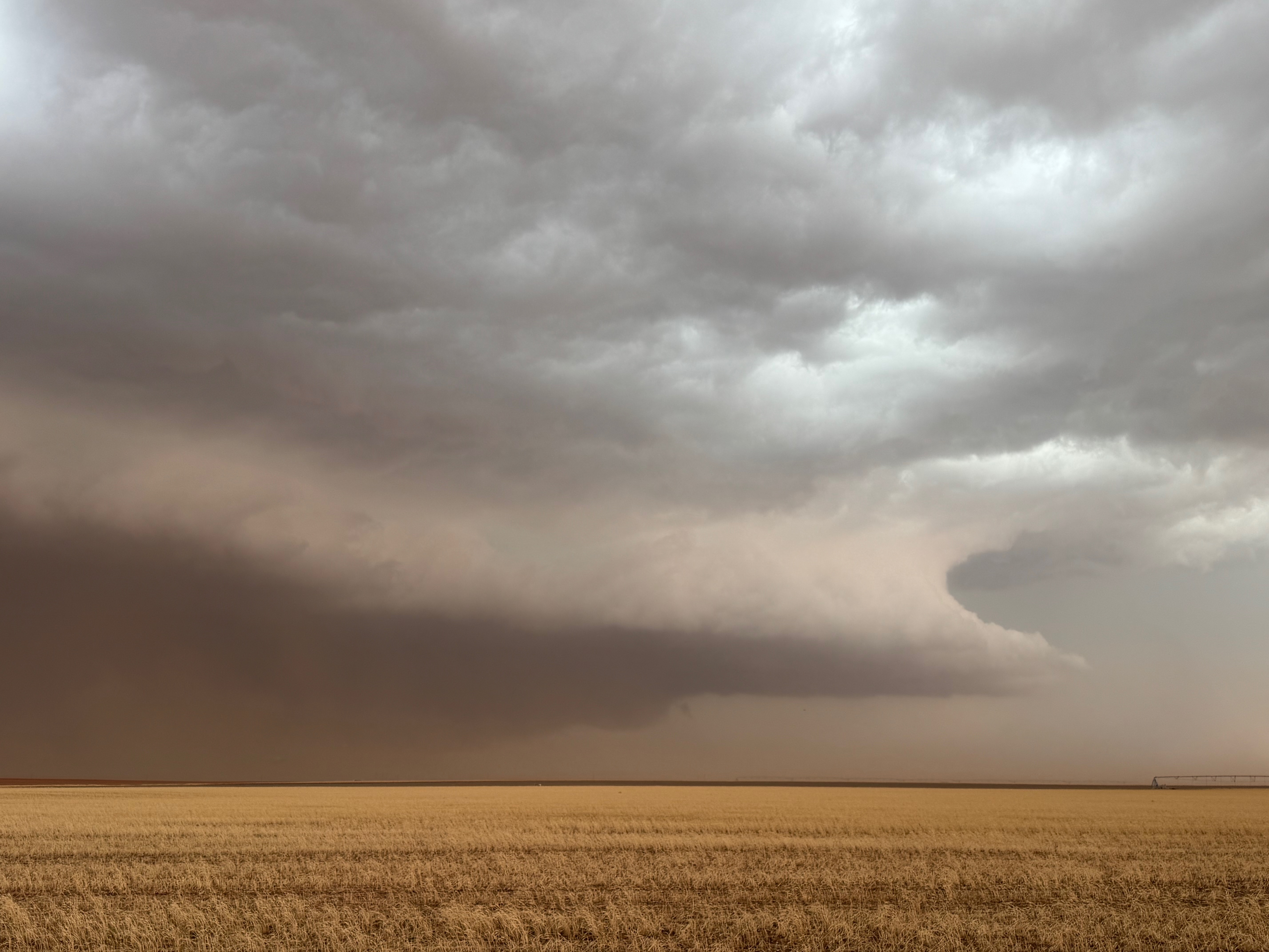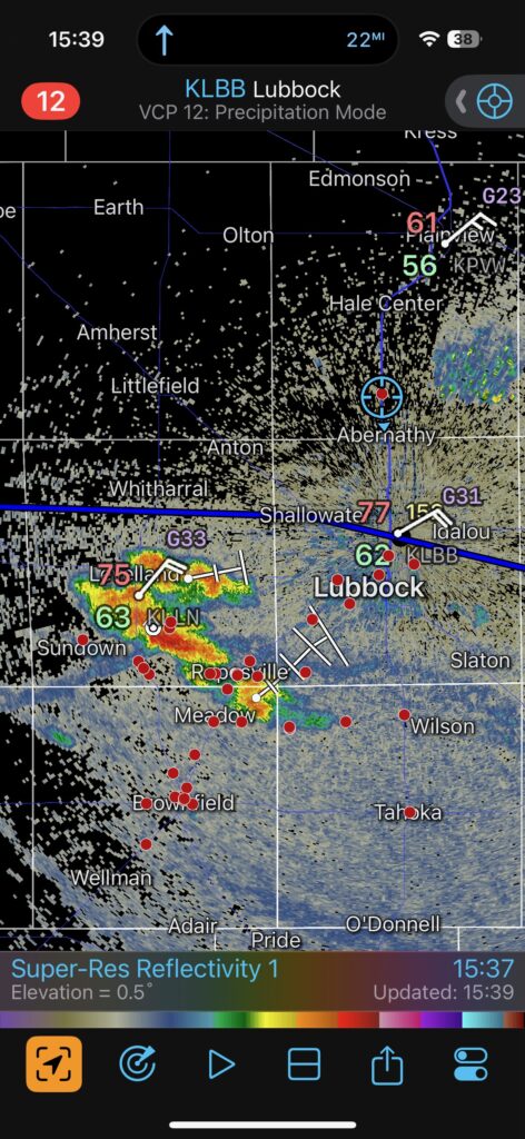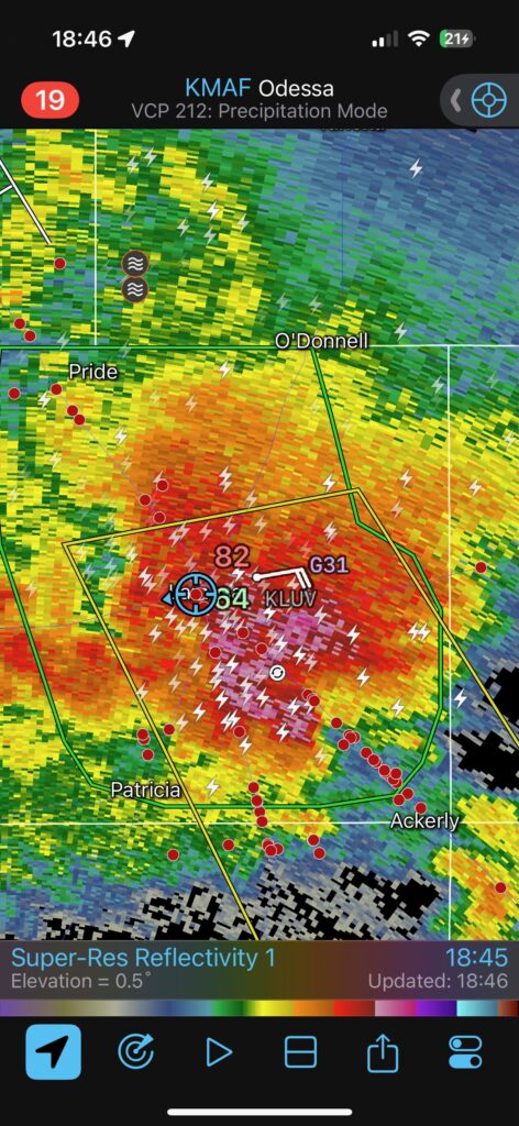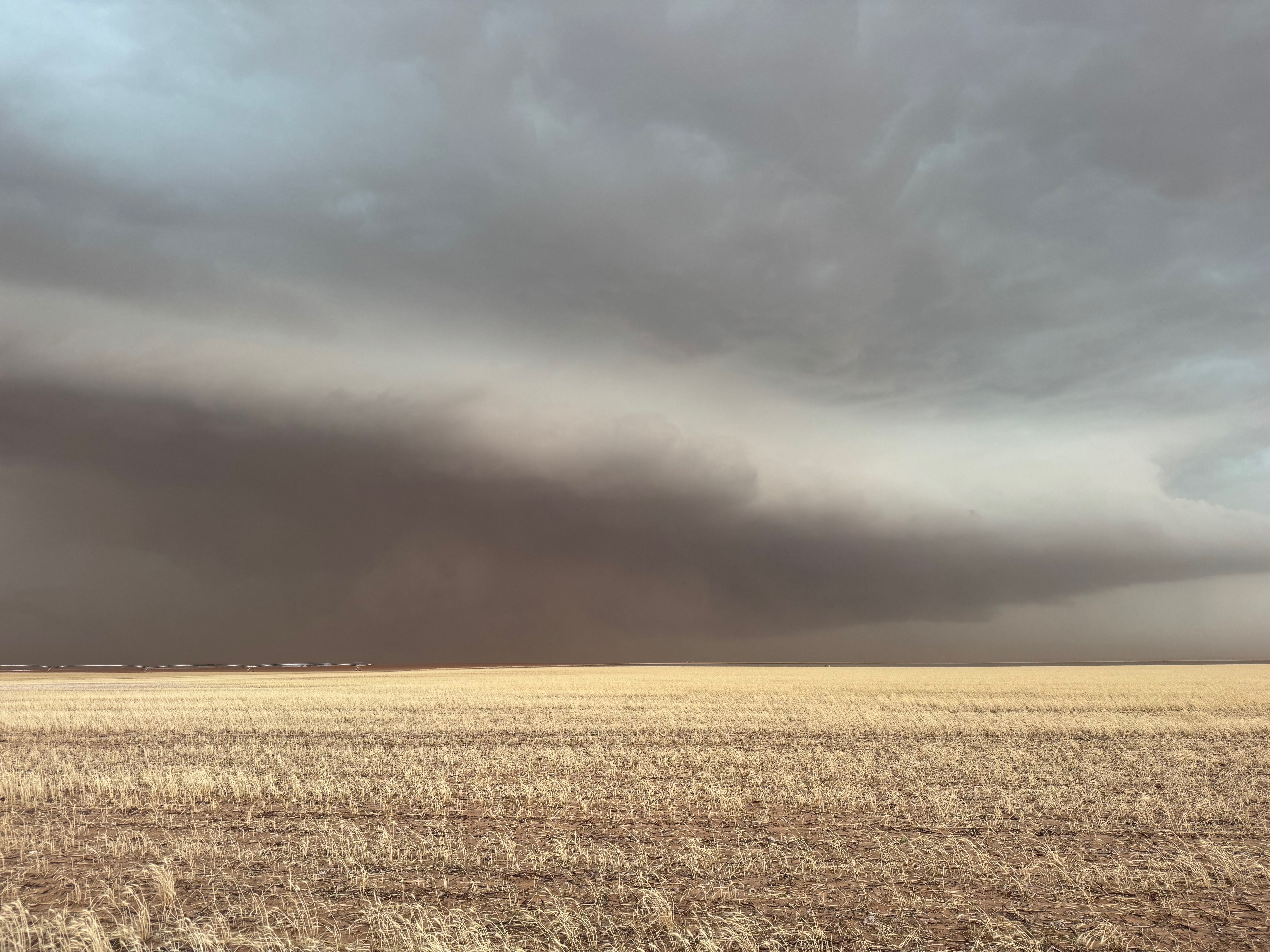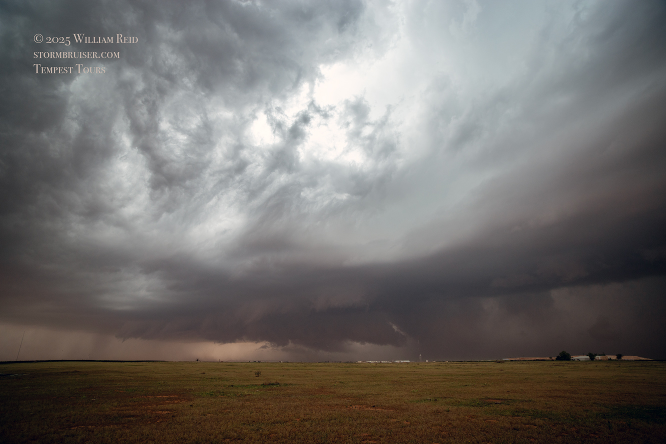 This was a fun chase. We had to boogie south from Pampa after lunch to get south of a front that was sagging south, just south of Lubbock. I know, I used the word “south” a little too much in that sentence. Too bad. Our departure from Pampa was a little delayed as one in our group had to visit urgent care. Warm and moist air was just south of the E-W front, and SPC showed a 5% tornado risk. We dropped south from Wolfforth to position east of severe storm near Brownfield. This gave us a good look at storm structure. The action area featured decent lowerings and wall clouds and laminar sides. A tornado or two was/were reported from this storm near Brownfield. These were described as “brief” and/or “landspout” and we did not observe a tornado.