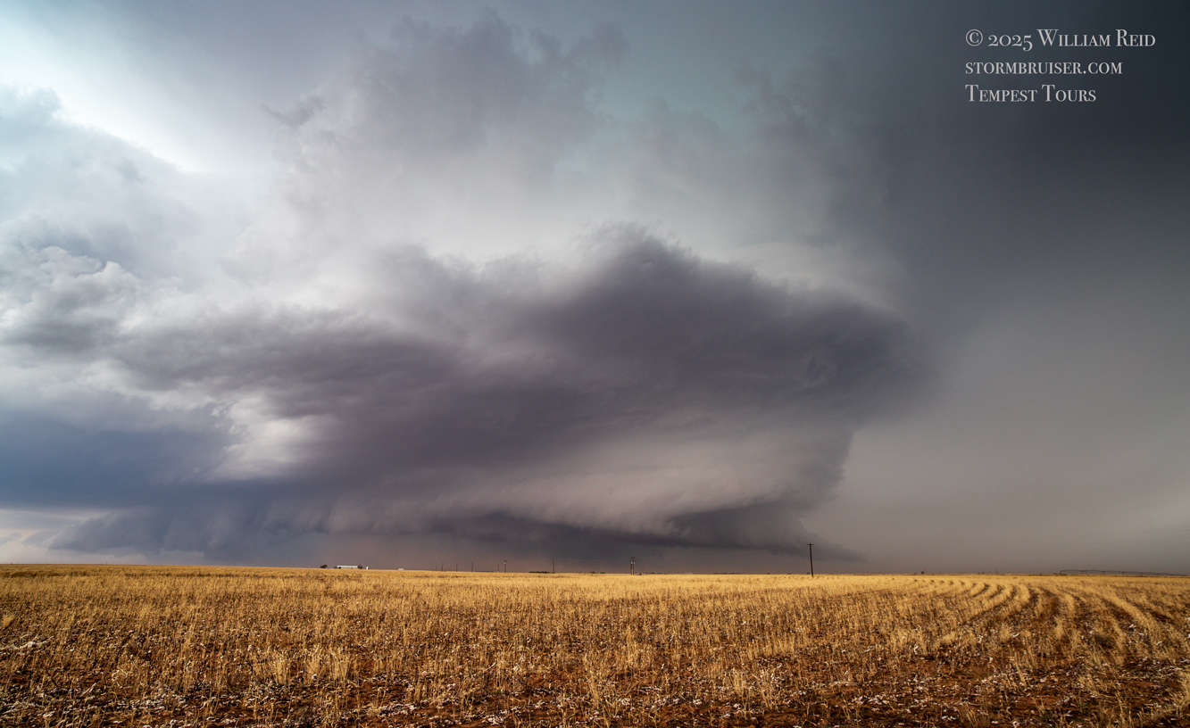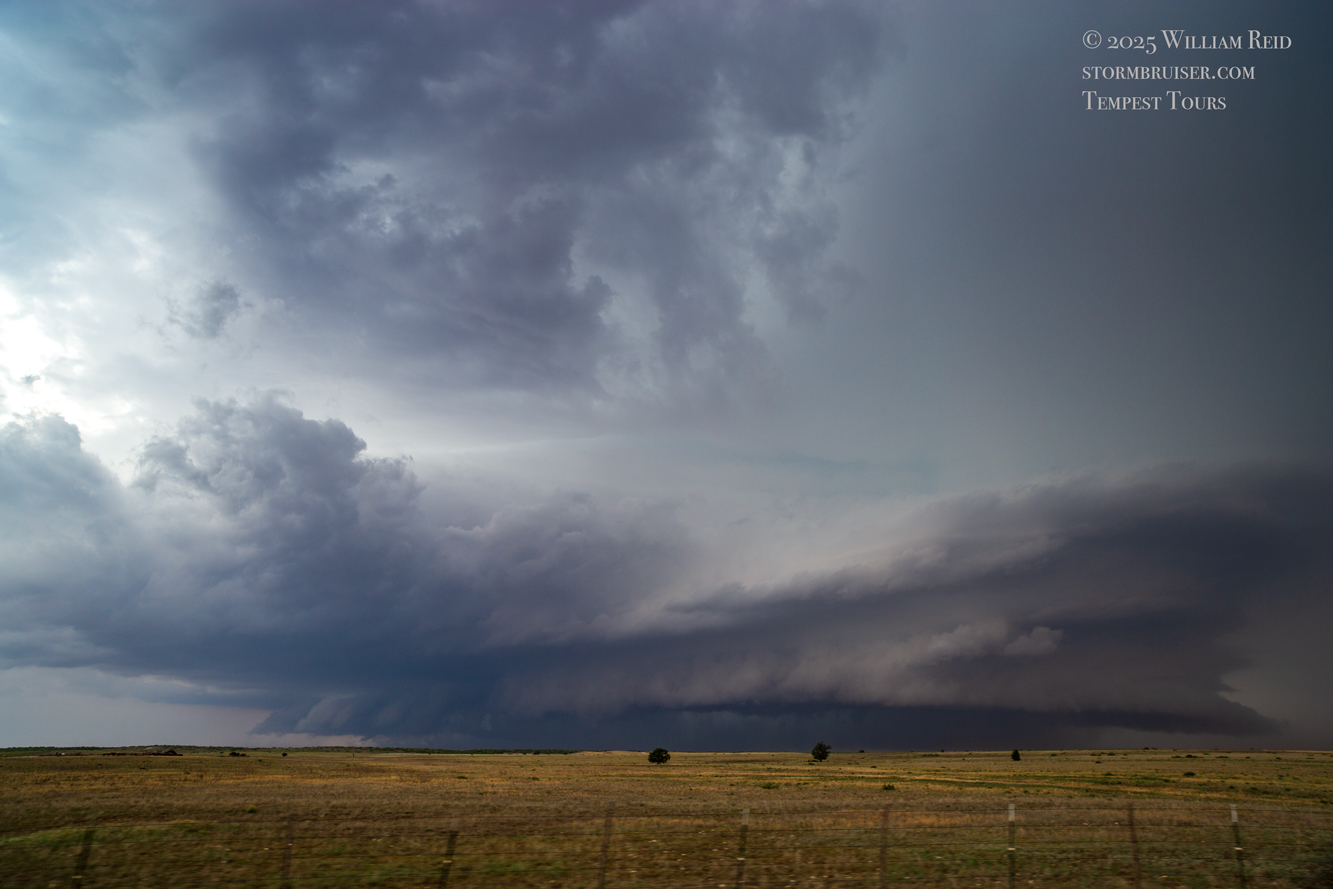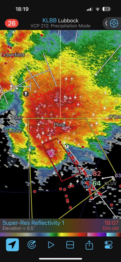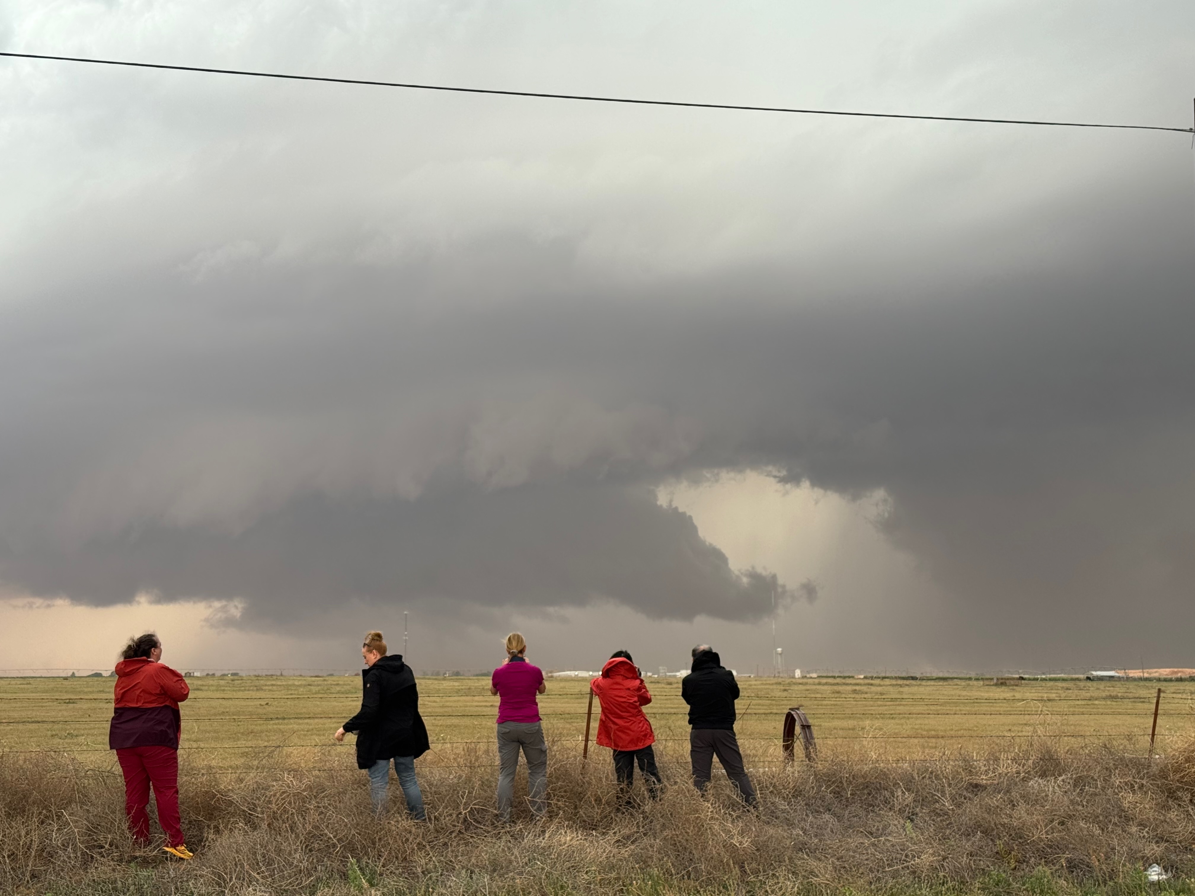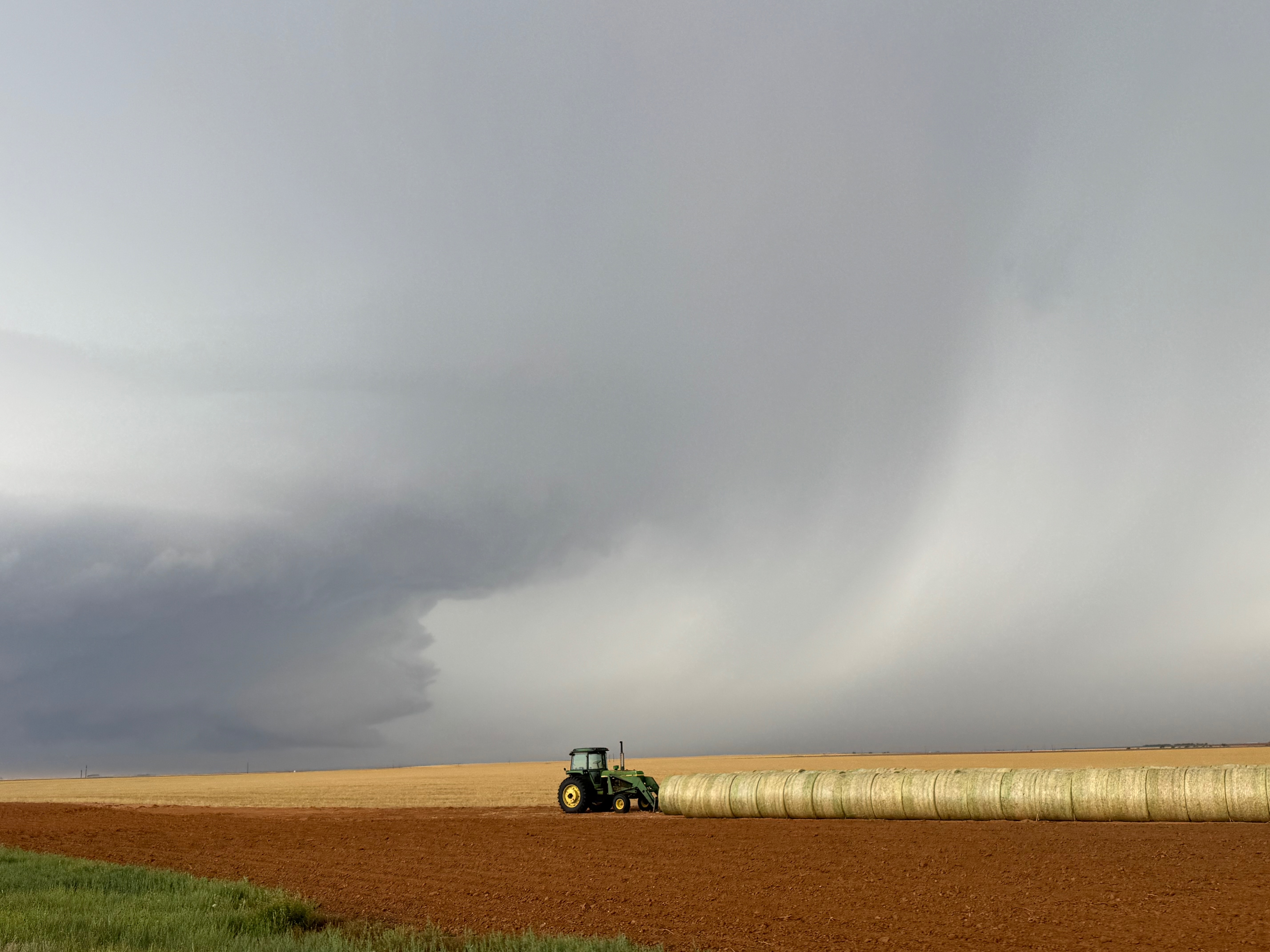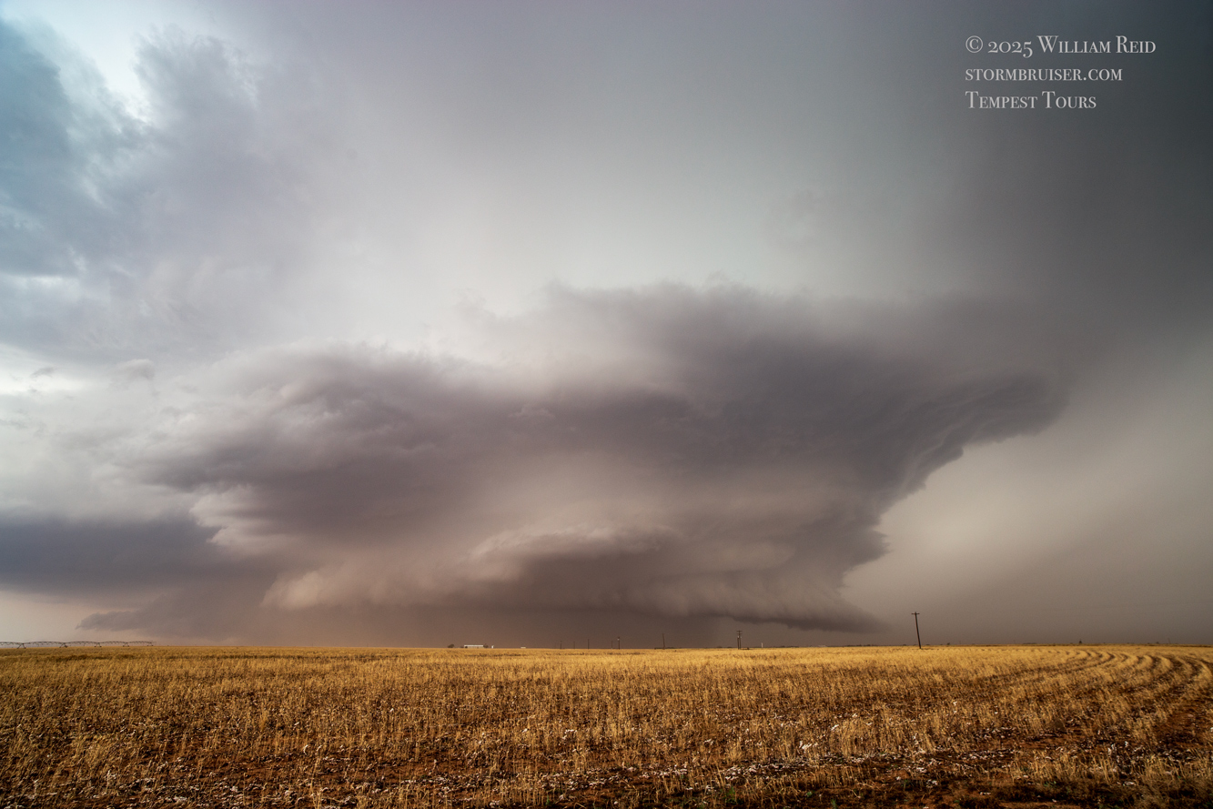 This was a fun chase. We had to boogie south from Pampa after lunch to get south of a front that was sagging south, just south of Lubbock. I know, I used the word “south” a little too much in that sentence. Too bad. Our departure from Pampa was a little delayed as one in our group had to visit urgent care. Warm and moist air was just south of the E-W front, and SPC showed a 5% tornado risk. We dropped south from Wolfforth to position east of severe storm near Brownfield. This gave us a good look at storm structure. The action area featured decent lowerings and wall clouds and laminar sides. A tornado or two was/were reported from this storm near Brownfield. These were described as “brief” and/or “landspout” and we did not observe a tornado.
