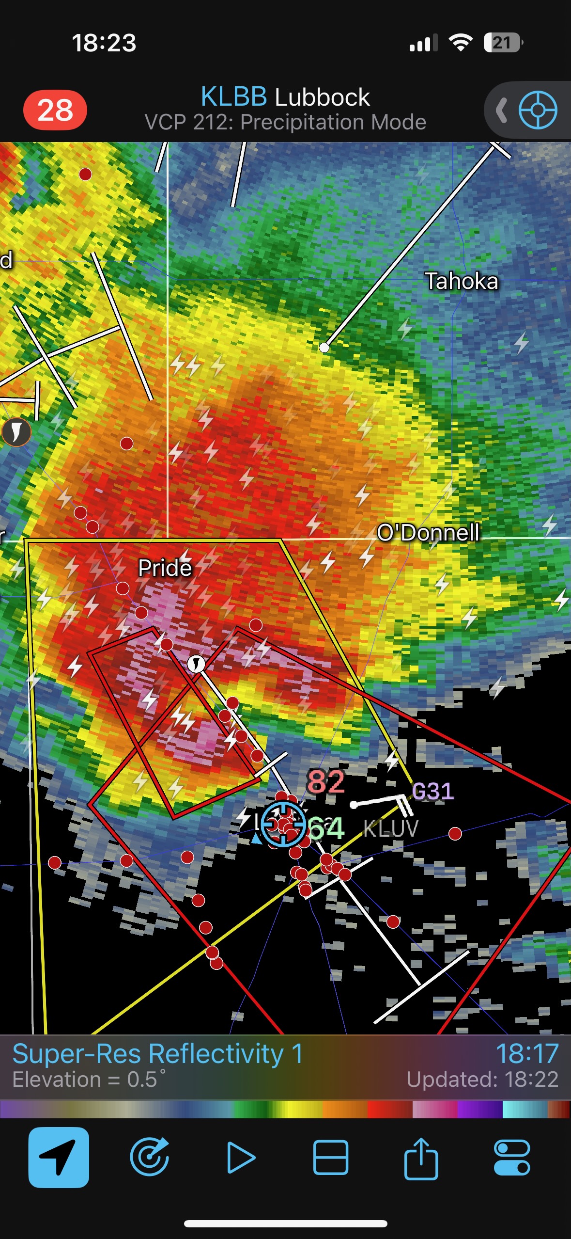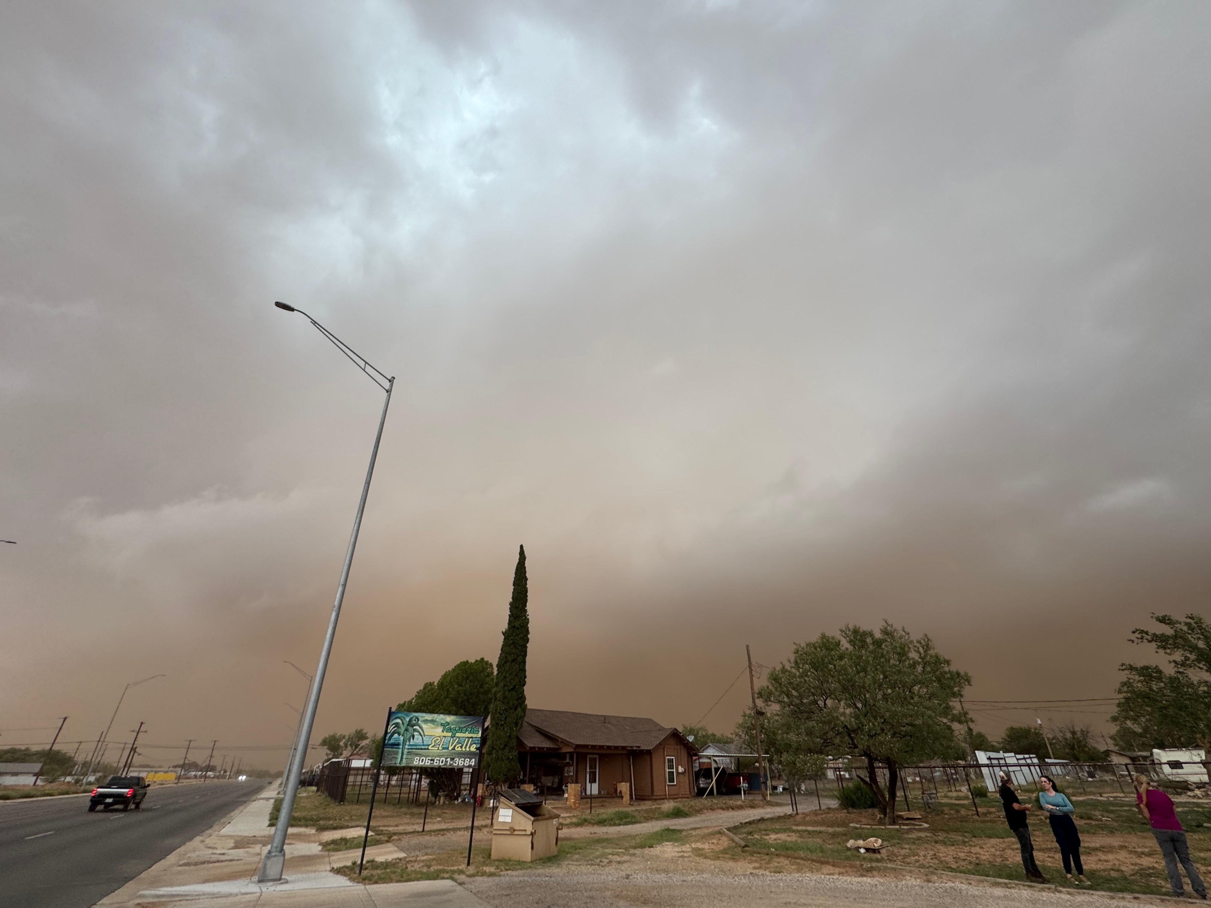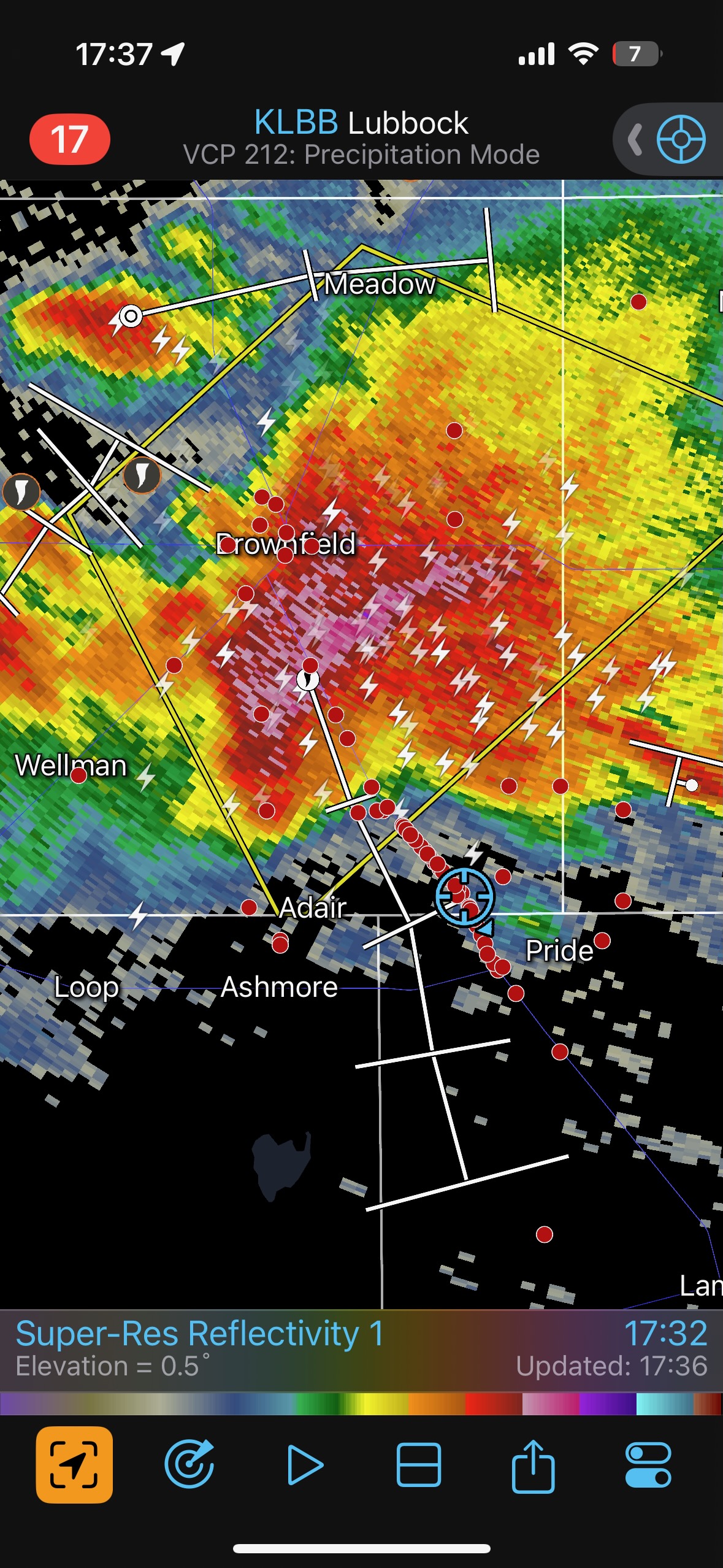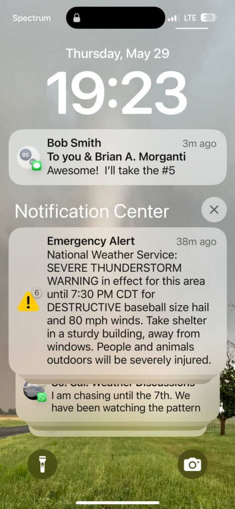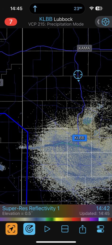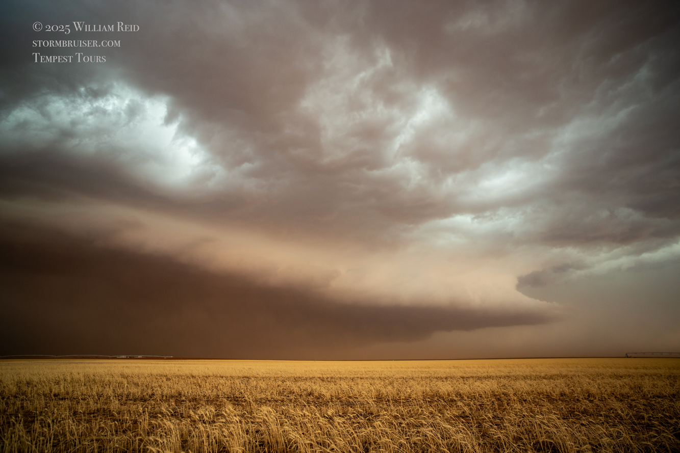 This was a fun chase. We had to boogie south from Pampa after lunch to get south of a front that was sagging south, just south of Lubbock. I know, I used the word “south” a little too much in that sentence. Too bad. Our departure from Pampa was a little delayed as one in our group had to visit urgent care. Warm and moist air was just south of the E-W front, and SPC showed a 5% tornado risk. We dropped south from Wolfforth to position east of severe storm near Brownfield. This gave us a good look at storm structure. The action area featured decent lowerings and wall clouds and laminar sides. A tornado or two was/were reported from this storm near Brownfield. These were described as “brief” and/or “landspout” and we did not observe a tornado.