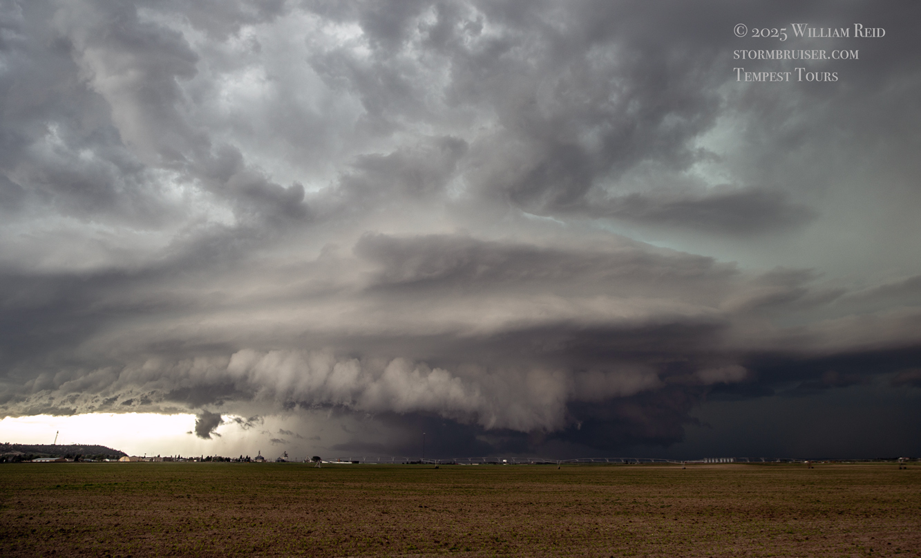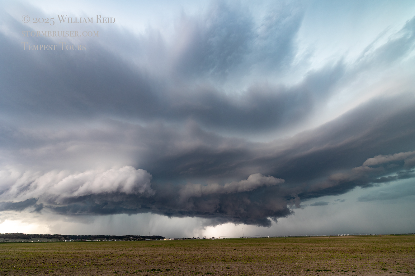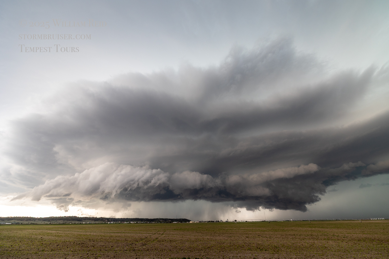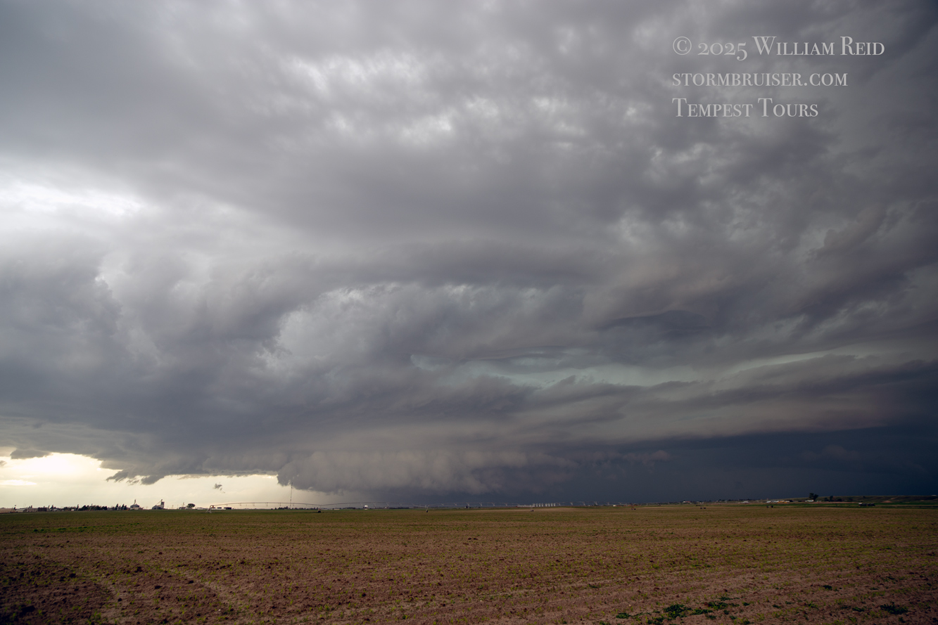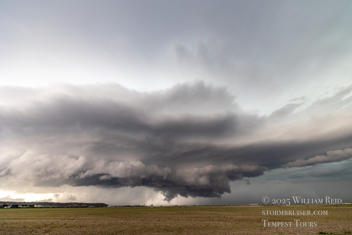 This was the first day of Tour 6. We were anticipating a good severe weather day, and fortunately we were fairly close to a target area. However, I was waffling heavily between SW Nebraska and the Cheyenne Ridge towards Cheyenne. After the BBQ lunch in Fort Morgan I decided to try the Cheyenne Ridge play. We found our way in front of a nicely-structured supercell that was approaching Pine Bluffs, Wyoming, near the Nebraska border. The low-level shear and instability weren’t quite right for a good tornado risk, but we did observe a big honking wall cloud. See the Canon pics below, and additional narrative below.