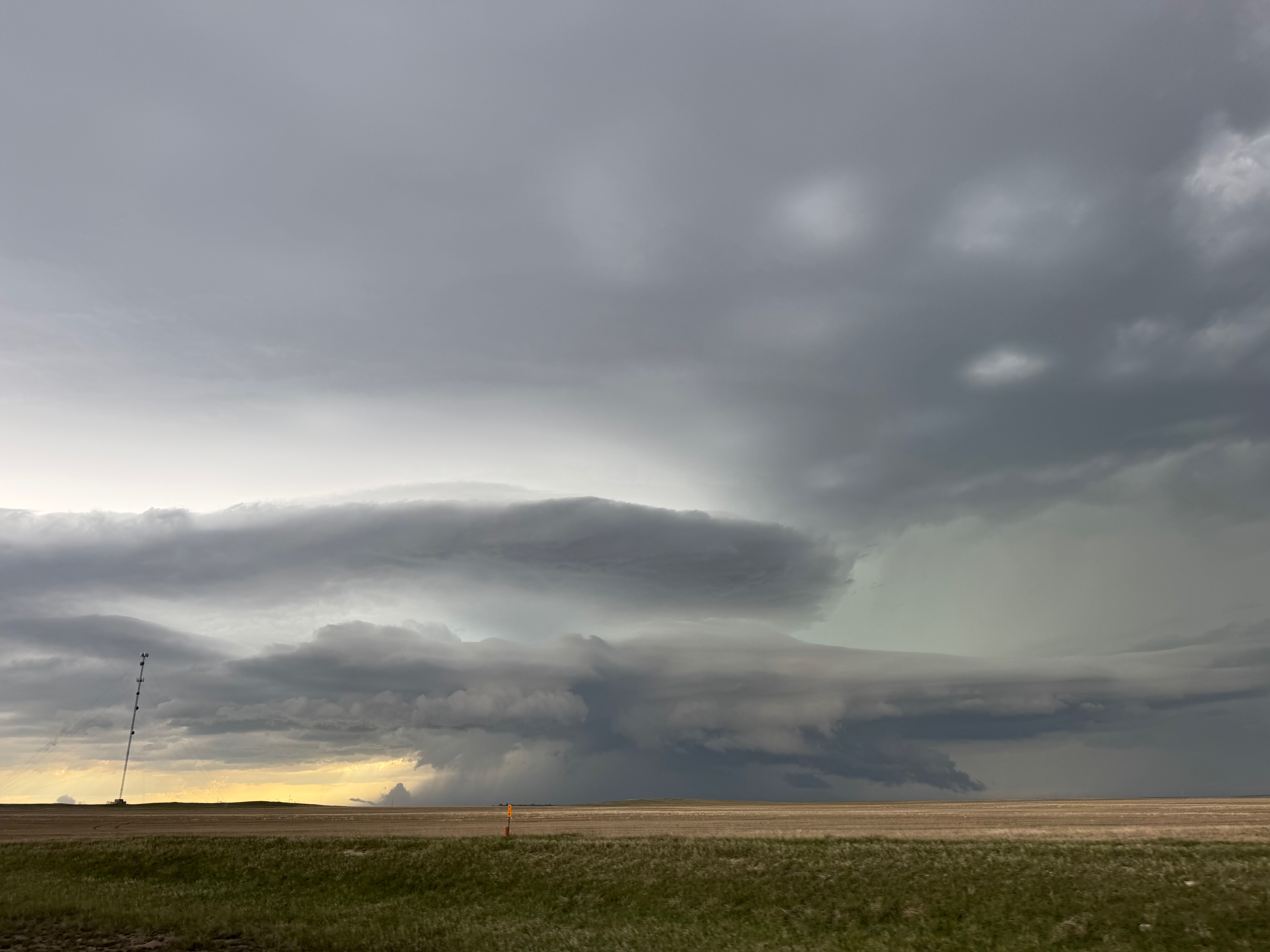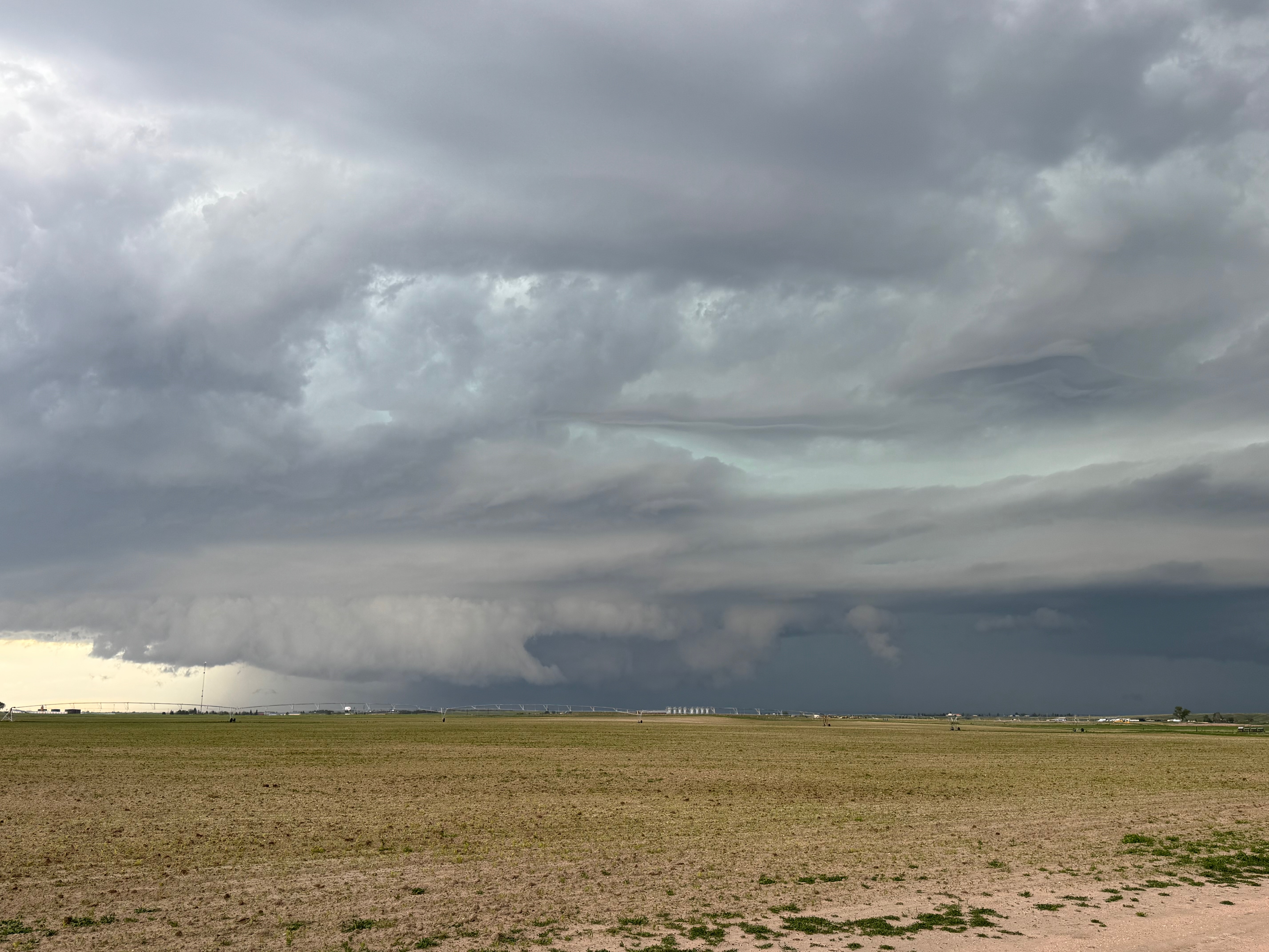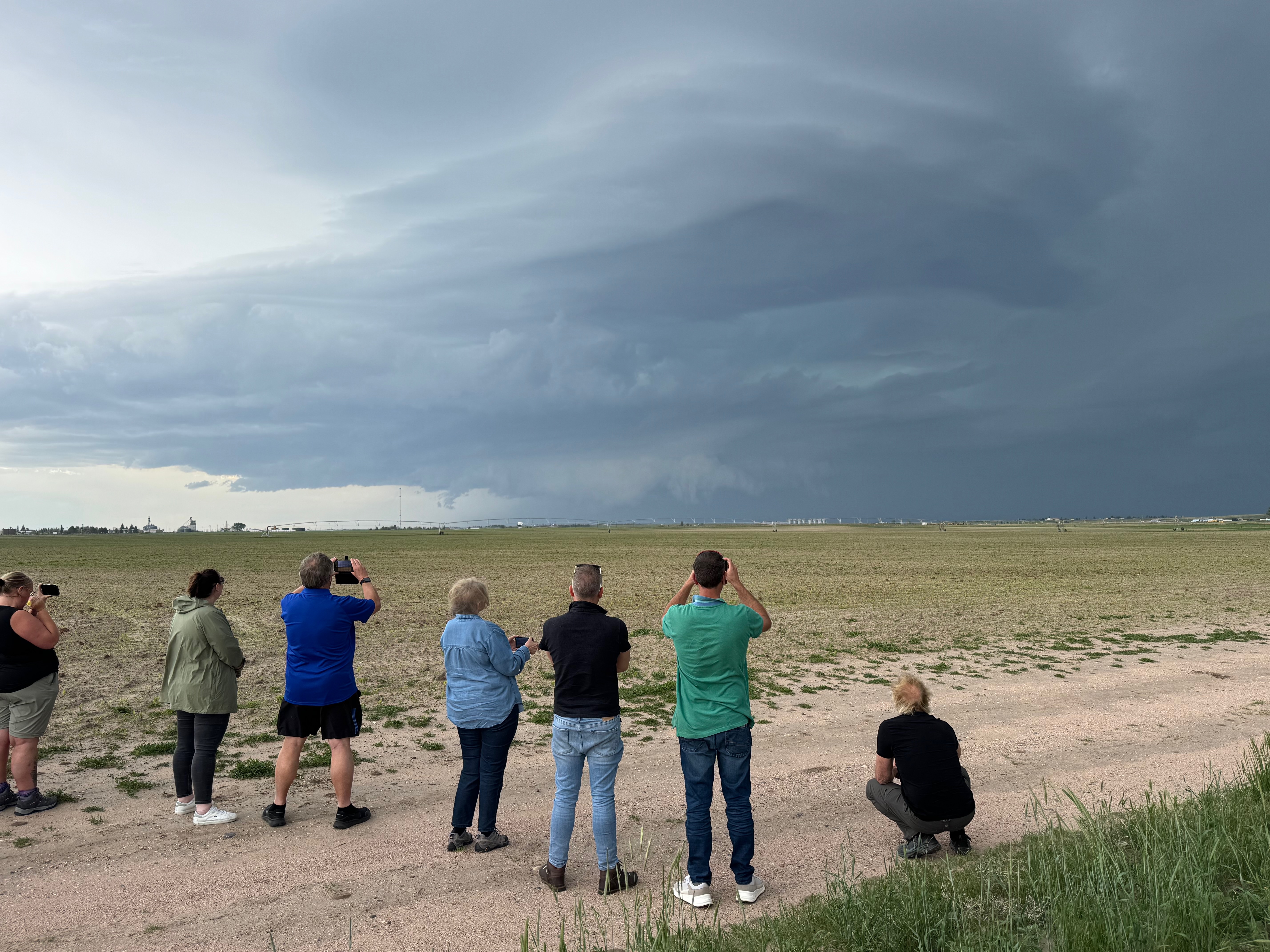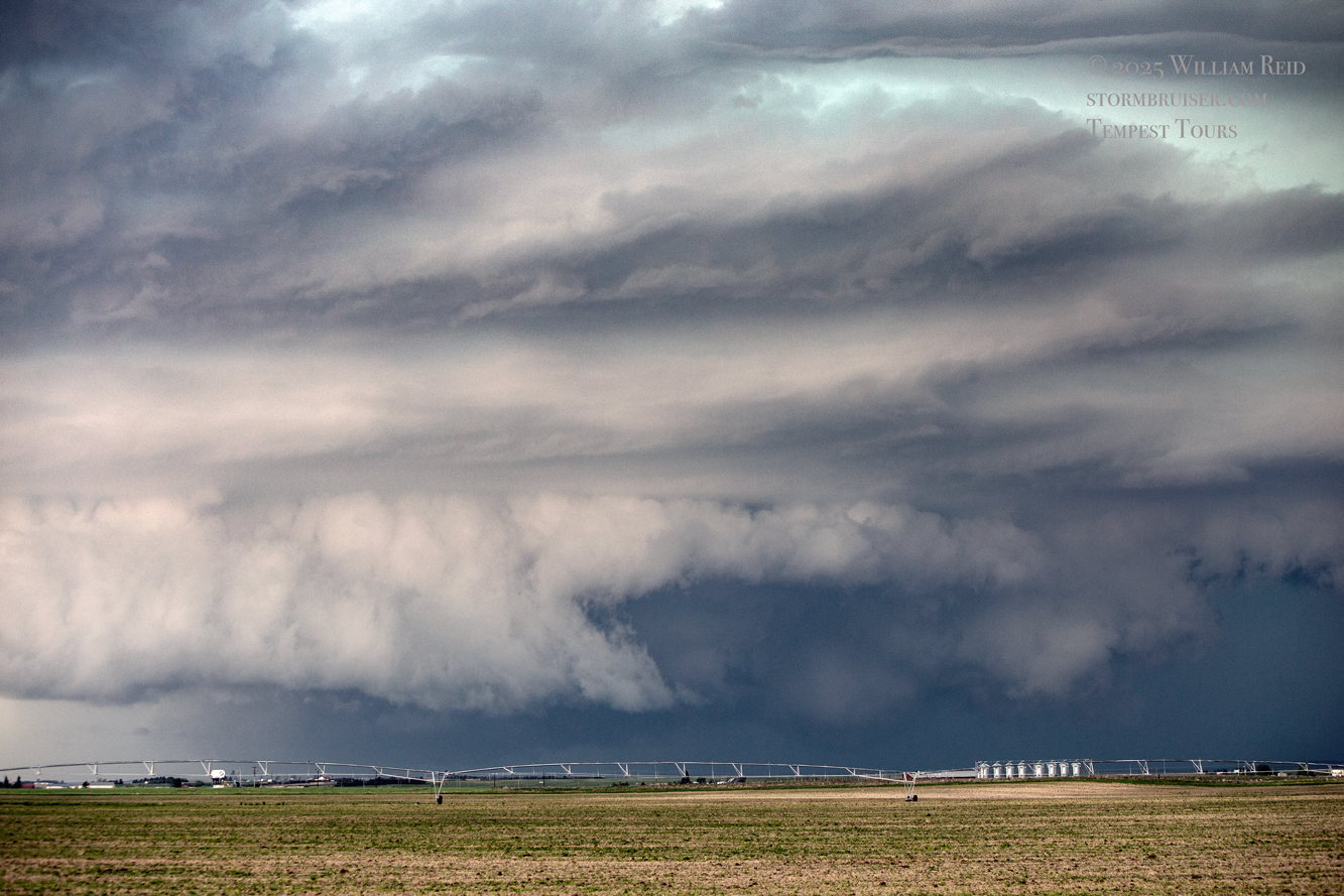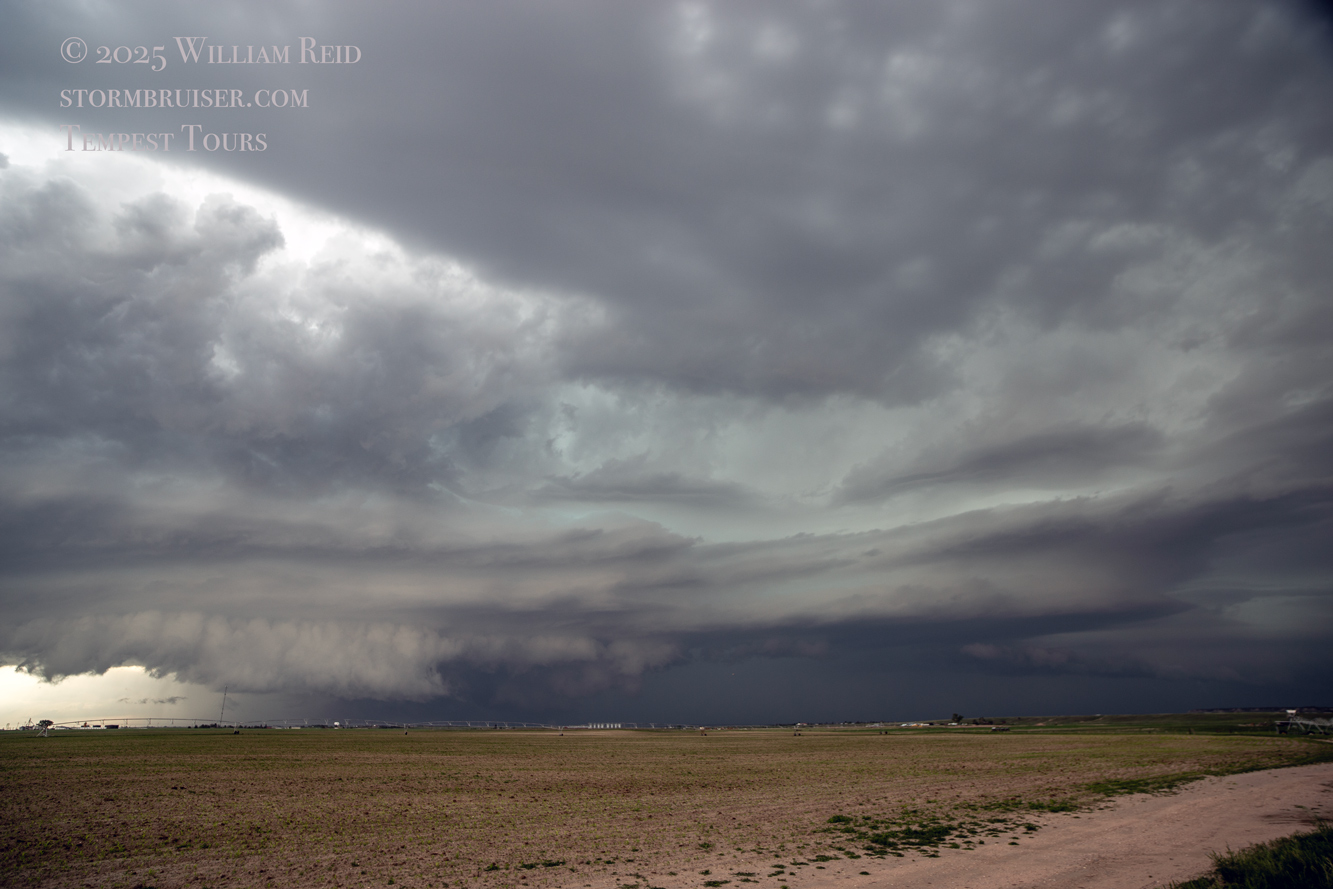 This was the first day of Tour 6. We were anticipating a good severe weather day, and fortunately we were fairly close to a target area. However, I was waffling heavily between SW Nebraska and the Cheyenne Ridge towards Cheyenne. After the BBQ lunch in Fort Morgan I decided to try the Cheyenne Ridge play. We found our way in front of a nicely-structured supercell that was approaching Pine Bluffs, Wyoming, near the Nebraska border. The low-level shear and instability weren’t quite right for a good tornado risk, but we did observe a big honking wall cloud. See the Canon pics below, and additional narrative below.