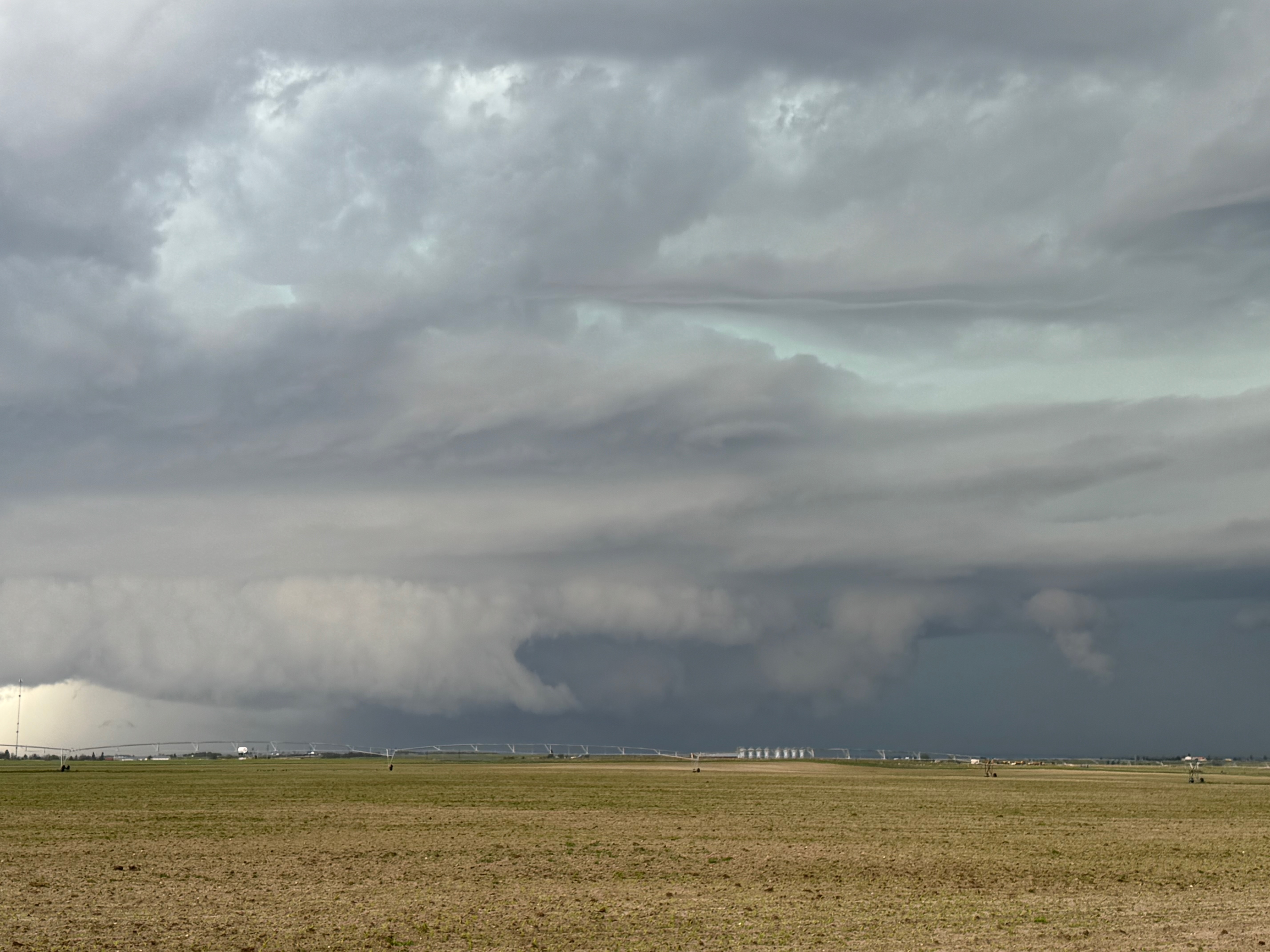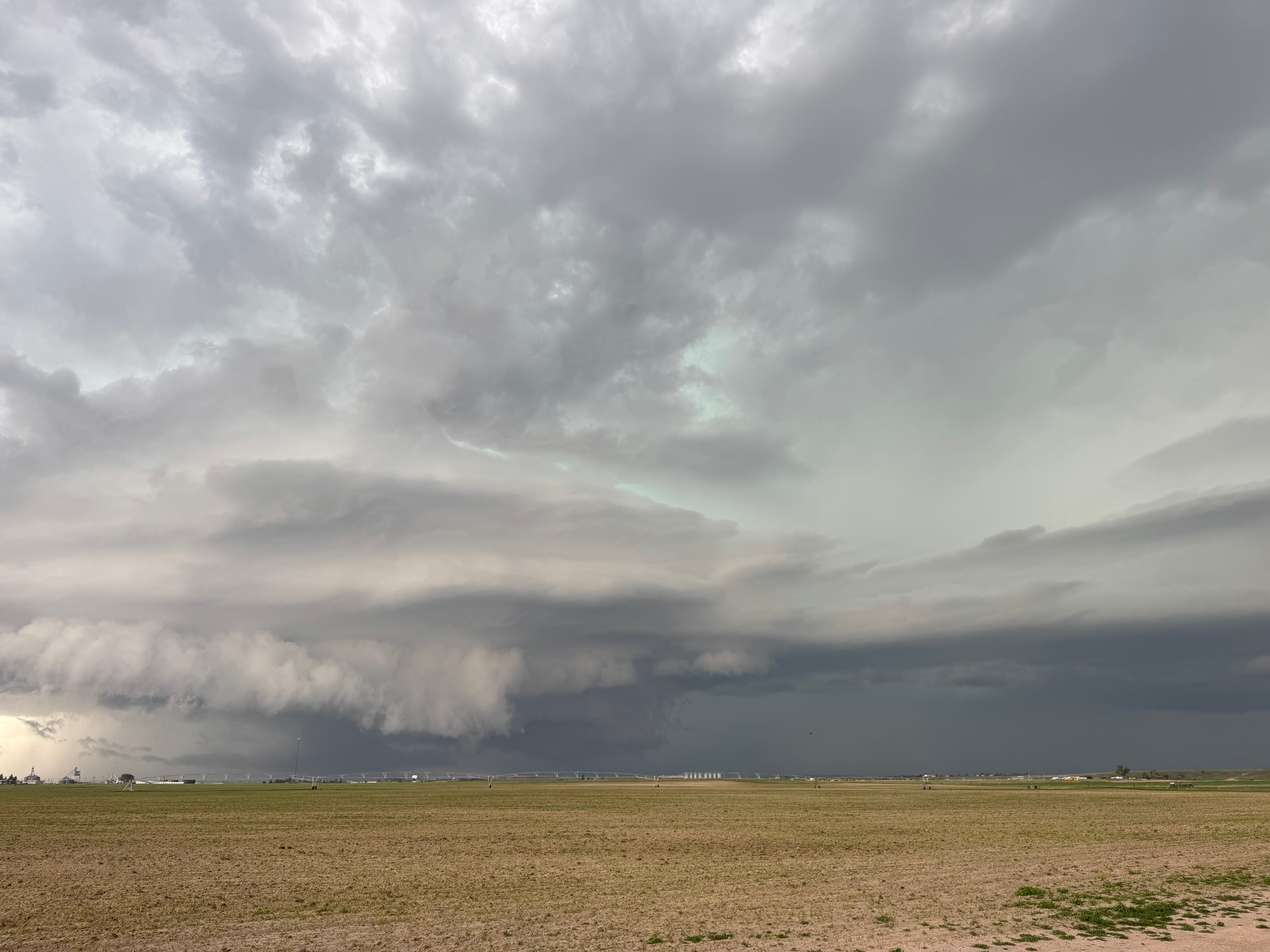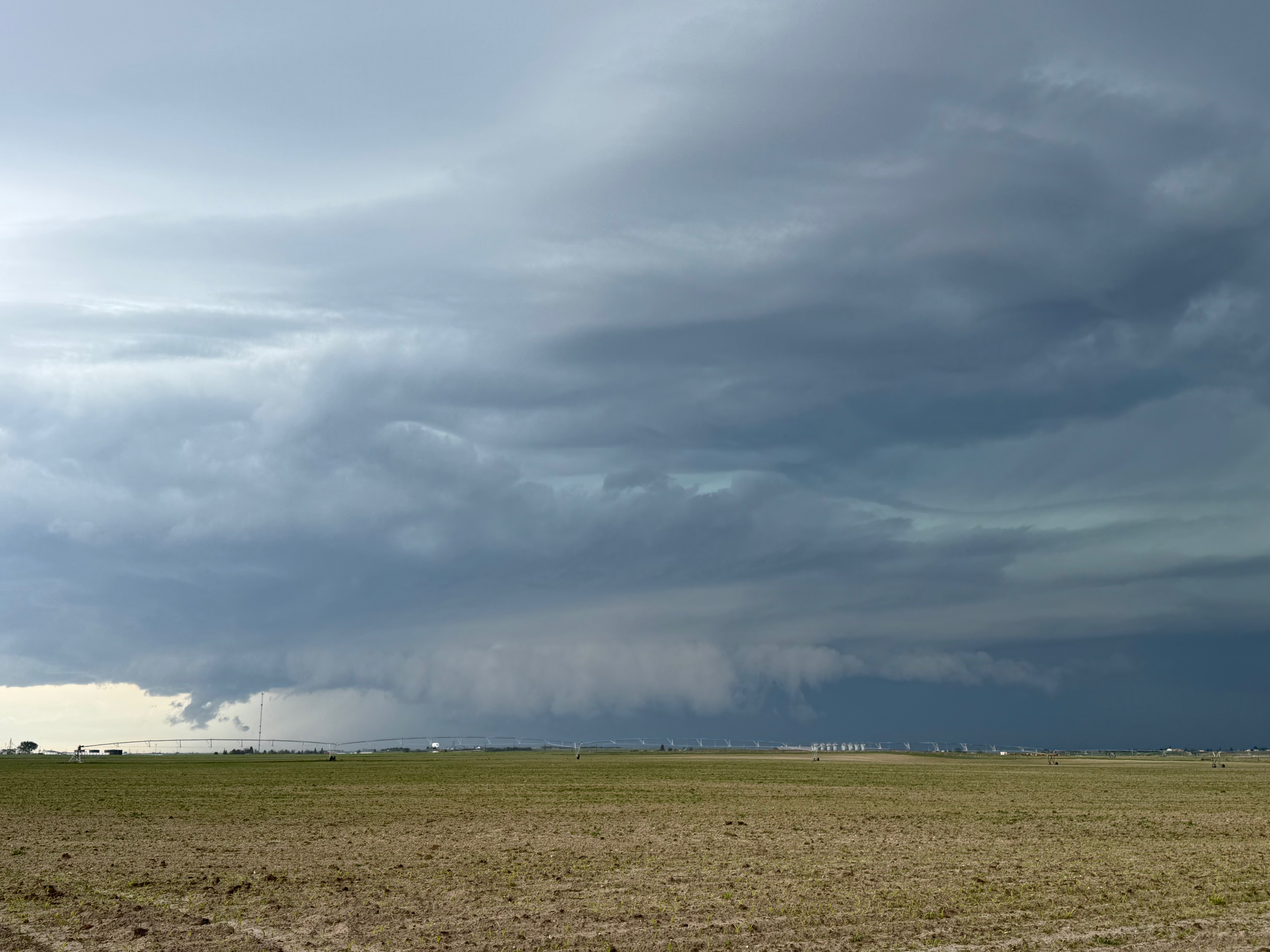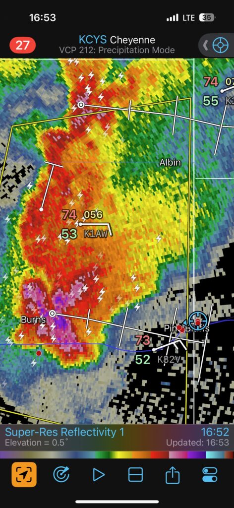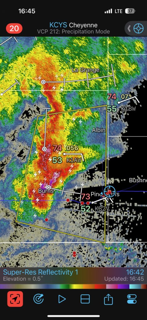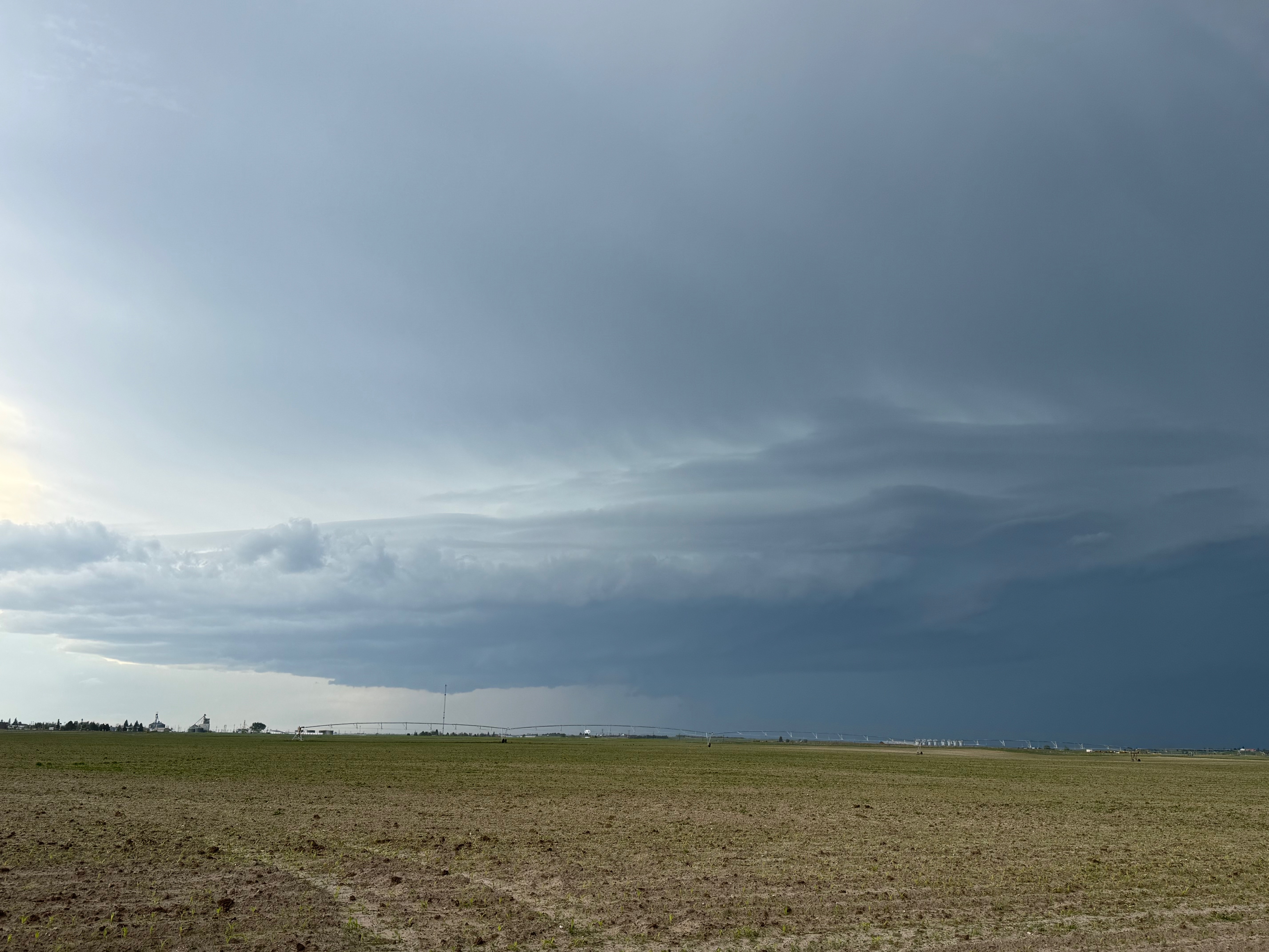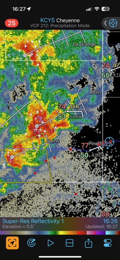 This was the first day of Tour 6. We were anticipating a good severe weather day, and fortunately we were fairly close to a target area. However, I was waffling heavily between SW Nebraska and the Cheyenne Ridge towards Cheyenne. After the BBQ lunch in Fort Morgan I decided to try the Cheyenne Ridge play. We found our way in front of a nicely-structured supercell that was approaching Pine Bluffs, Wyoming, near the Nebraska border. The low-level shear and instability weren’t quite right for a good tornado risk, but we did observe a big honking wall cloud. See the Canon pics below, and additional narrative below.