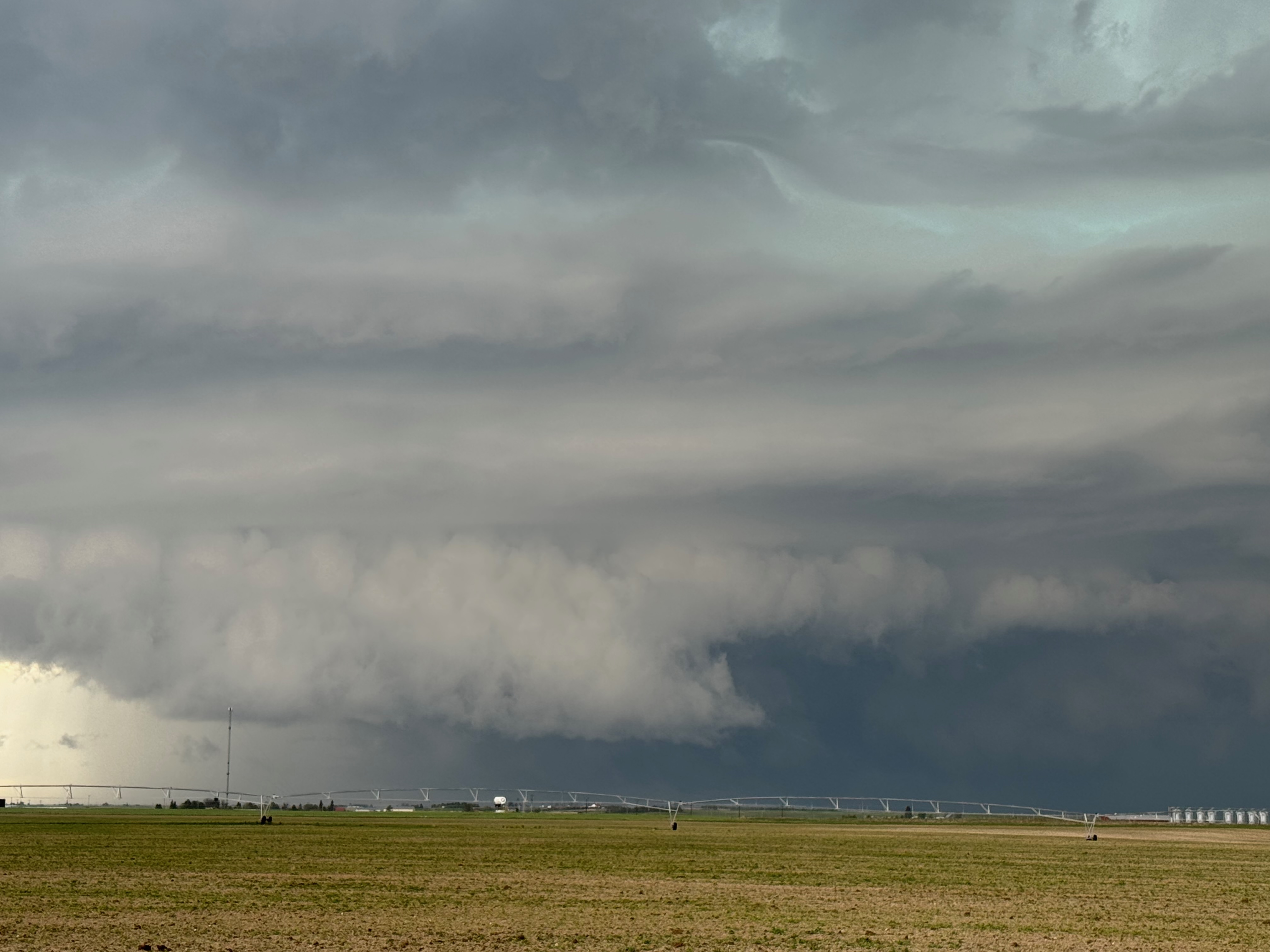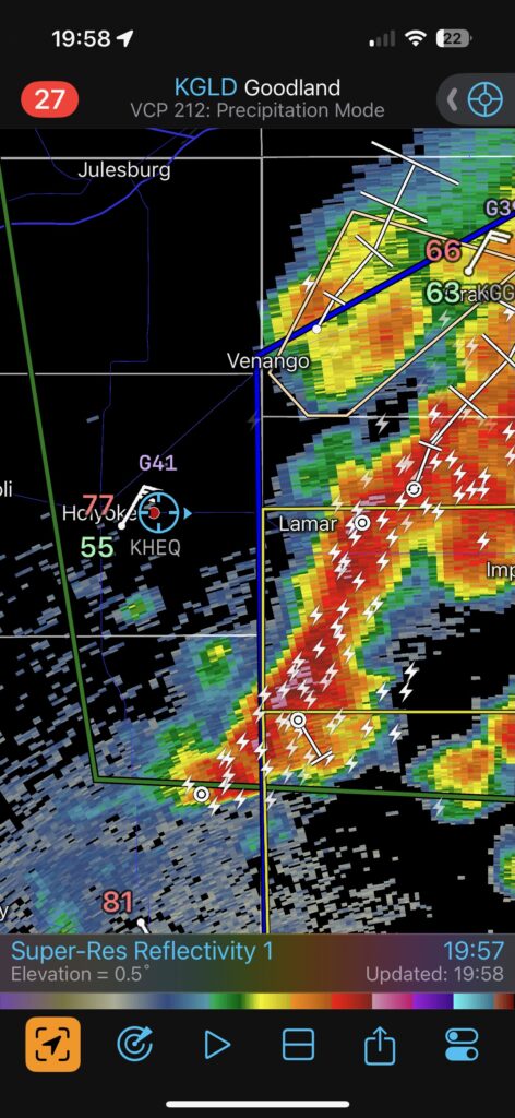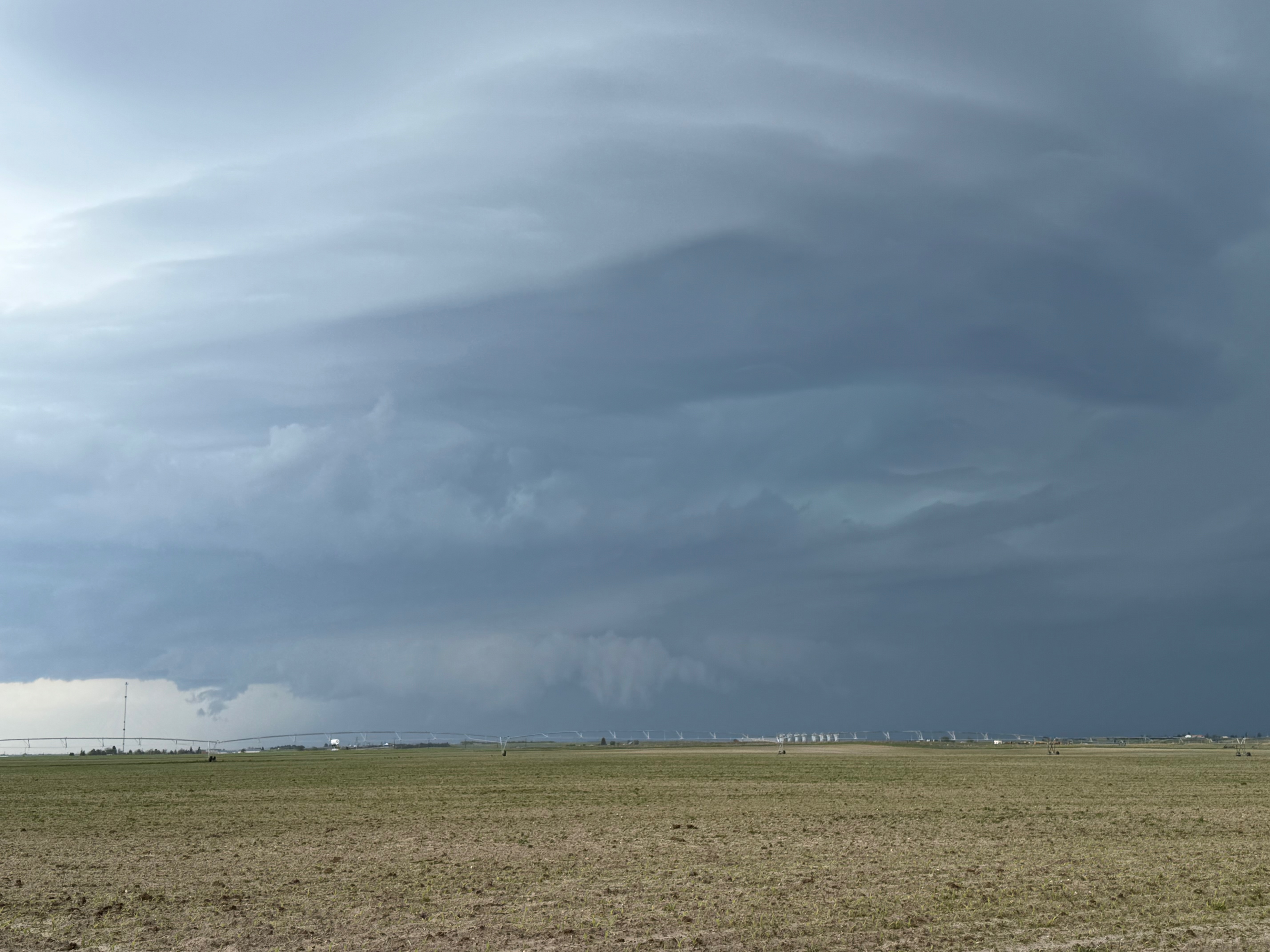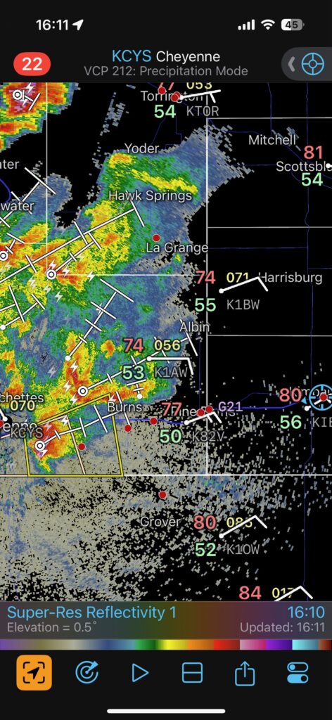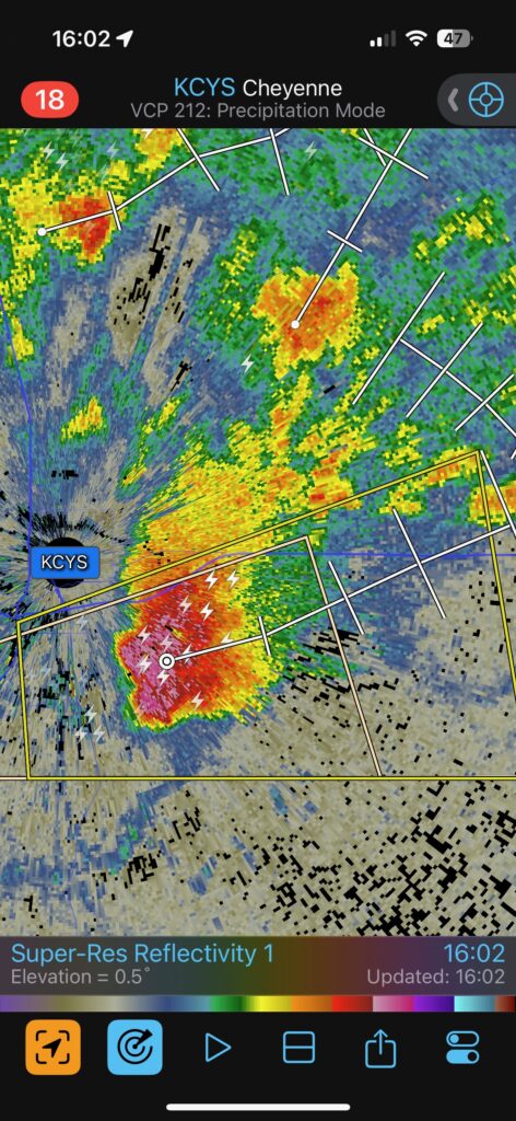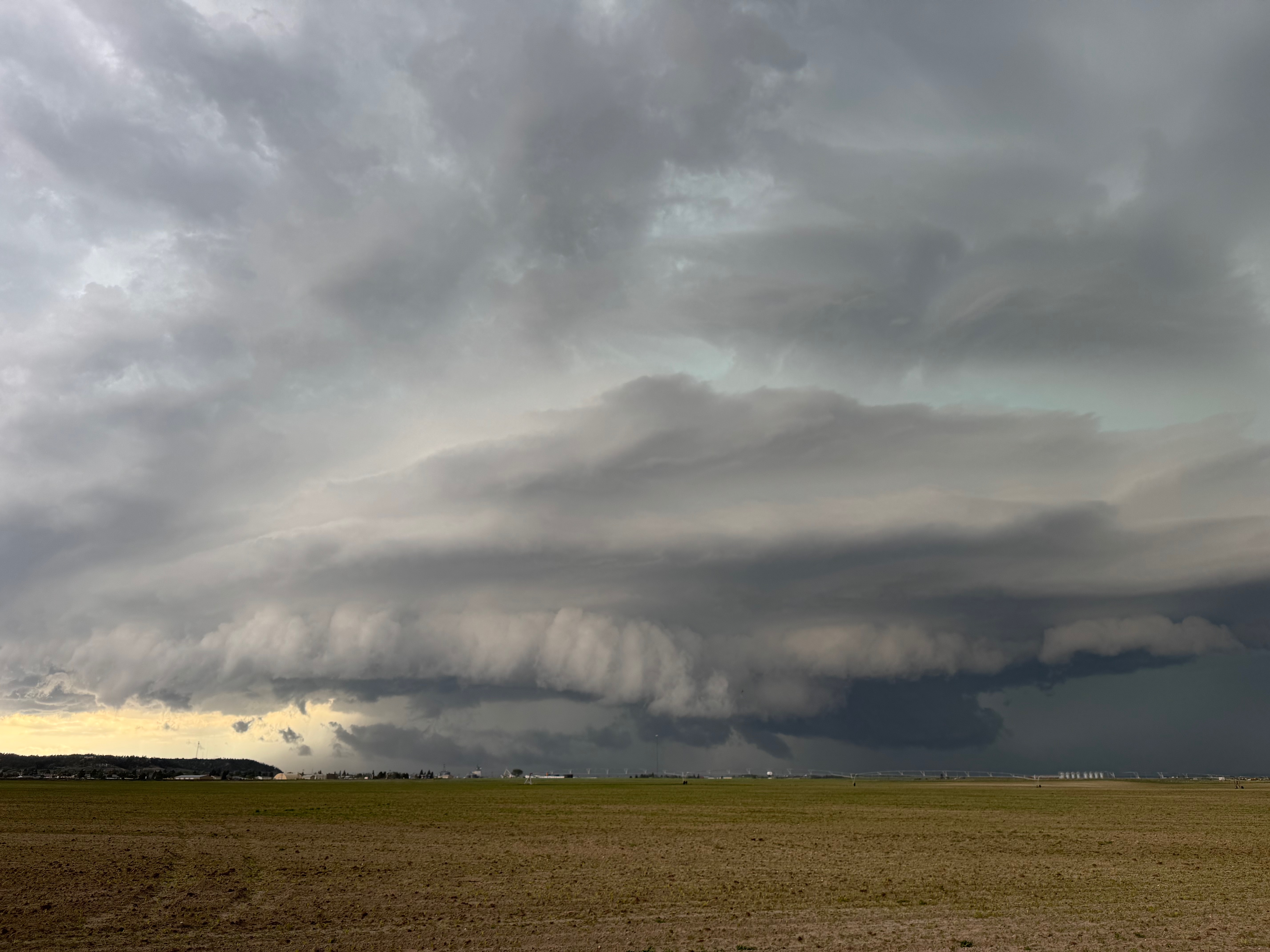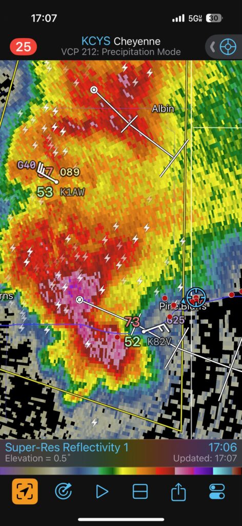 This was the first day of Tour 6. We were anticipating a good severe weather day, and fortunately we were fairly close to a target area. However, I was waffling heavily between SW Nebraska and the Cheyenne Ridge towards Cheyenne. After the BBQ lunch in Fort Morgan I decided to try the Cheyenne Ridge play. We found our way in front of a nicely-structured supercell that was approaching Pine Bluffs, Wyoming, near the Nebraska border. The low-level shear and instability weren’t quite right for a good tornado risk, but we did observe a big honking wall cloud. See the Canon pics below, and additional narrative below.