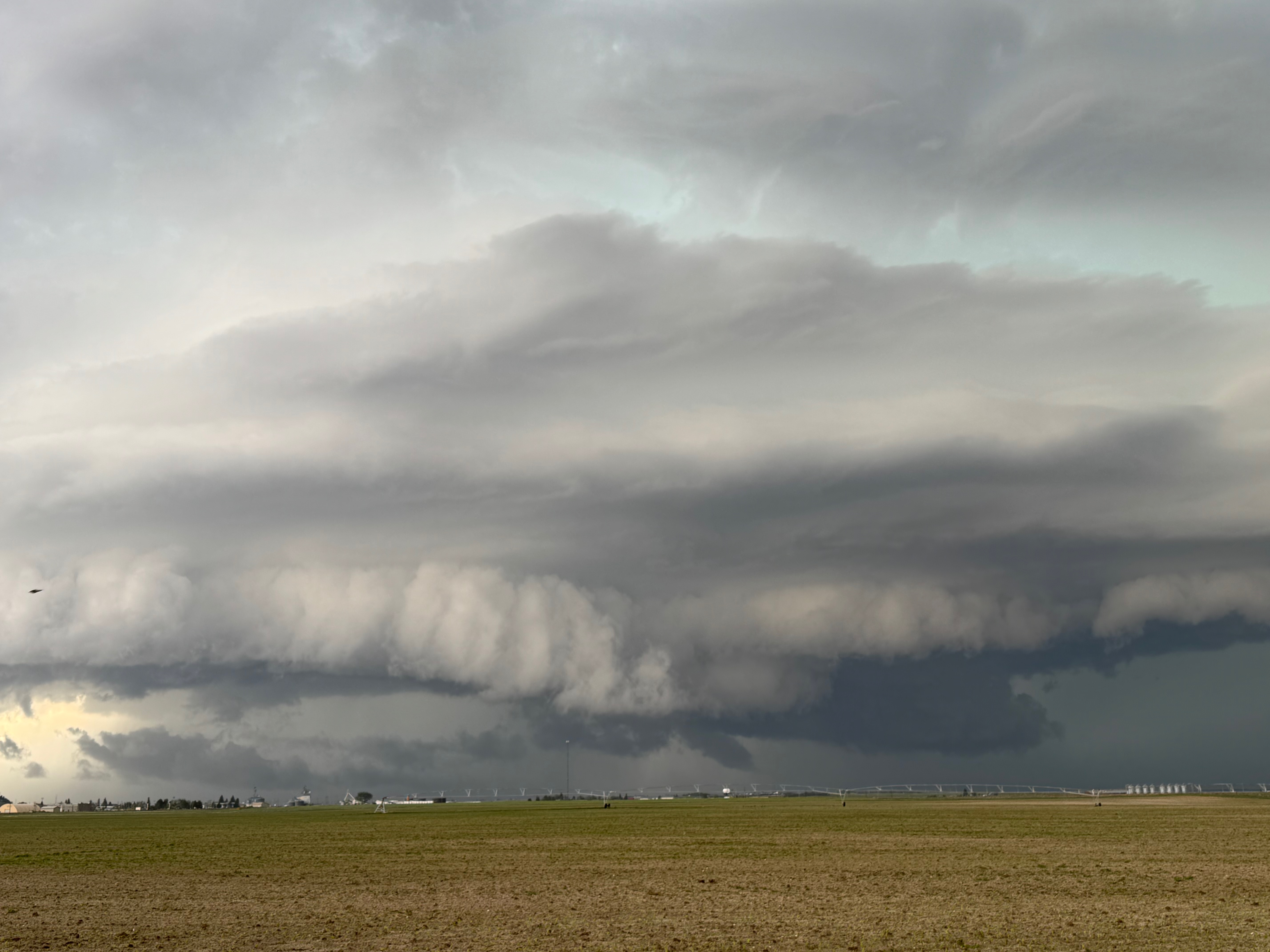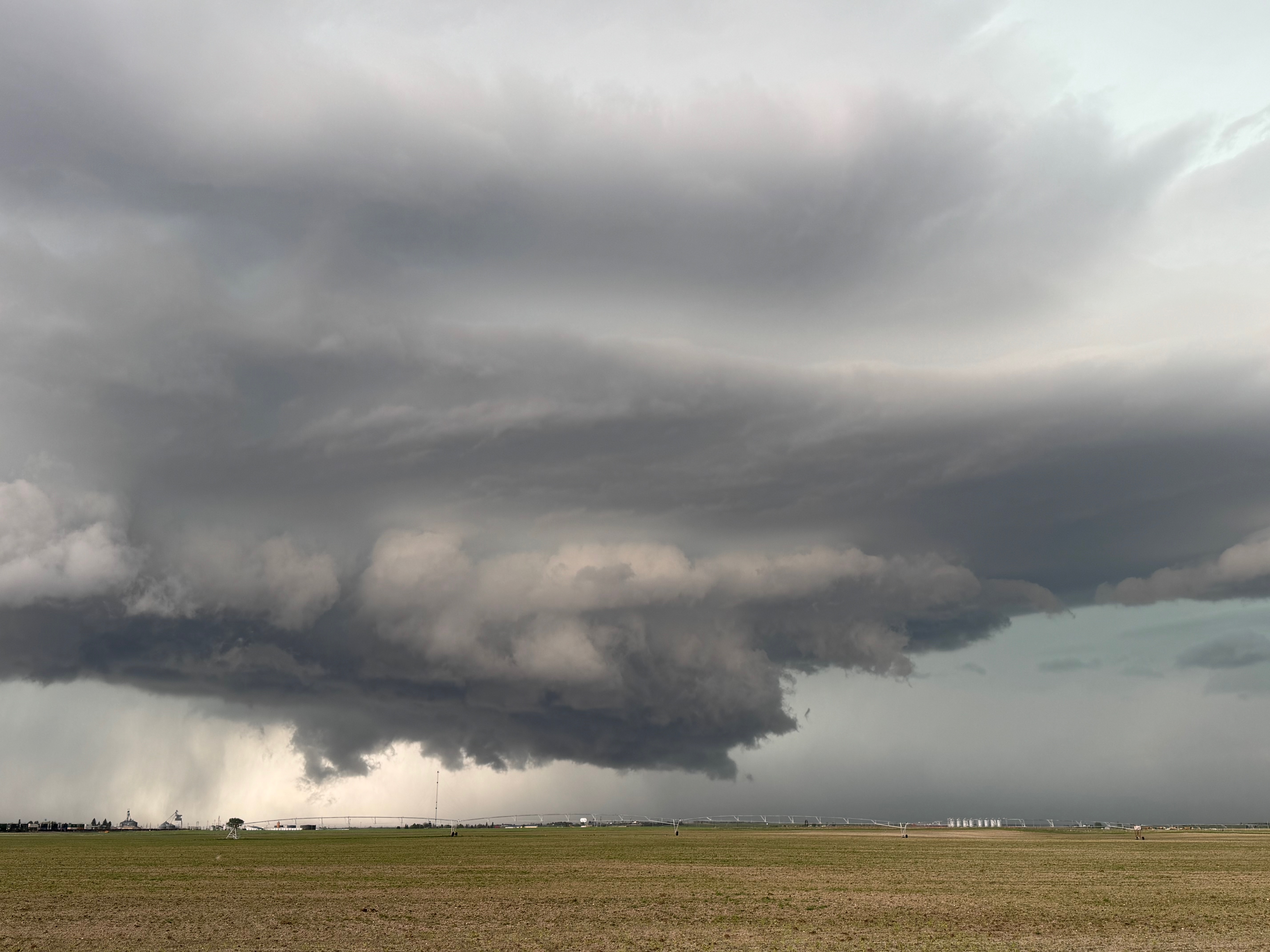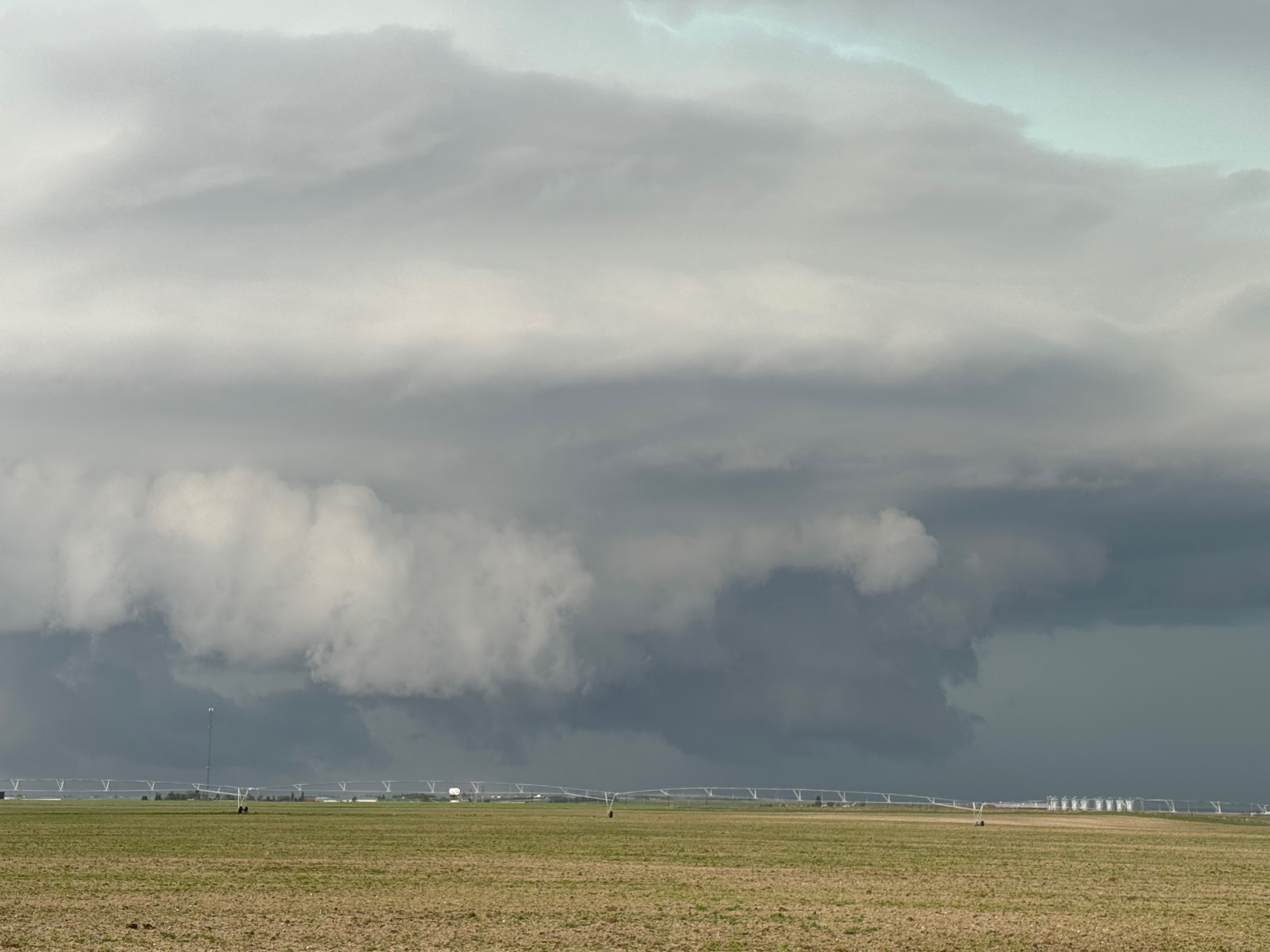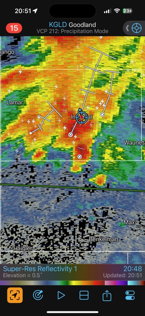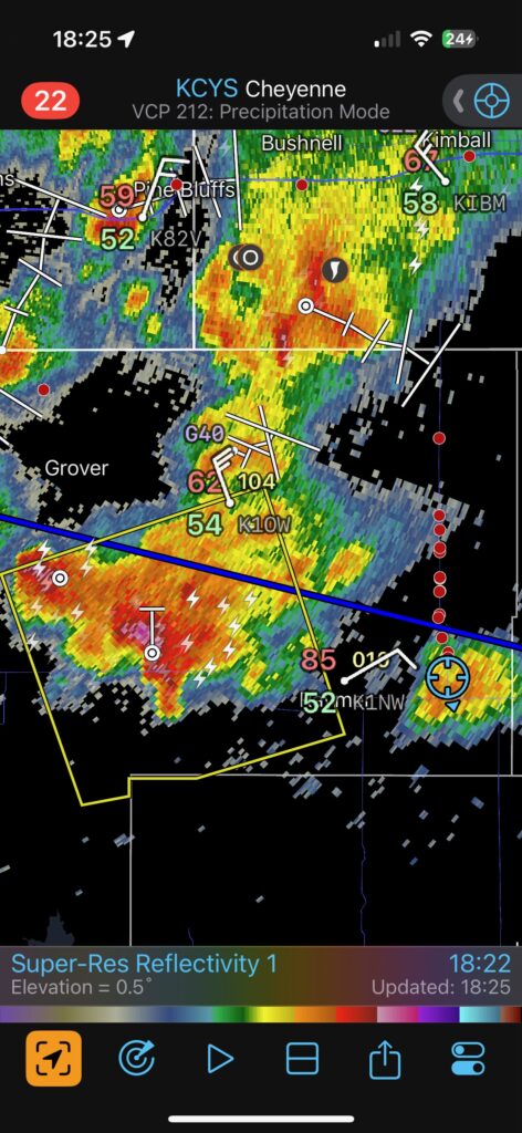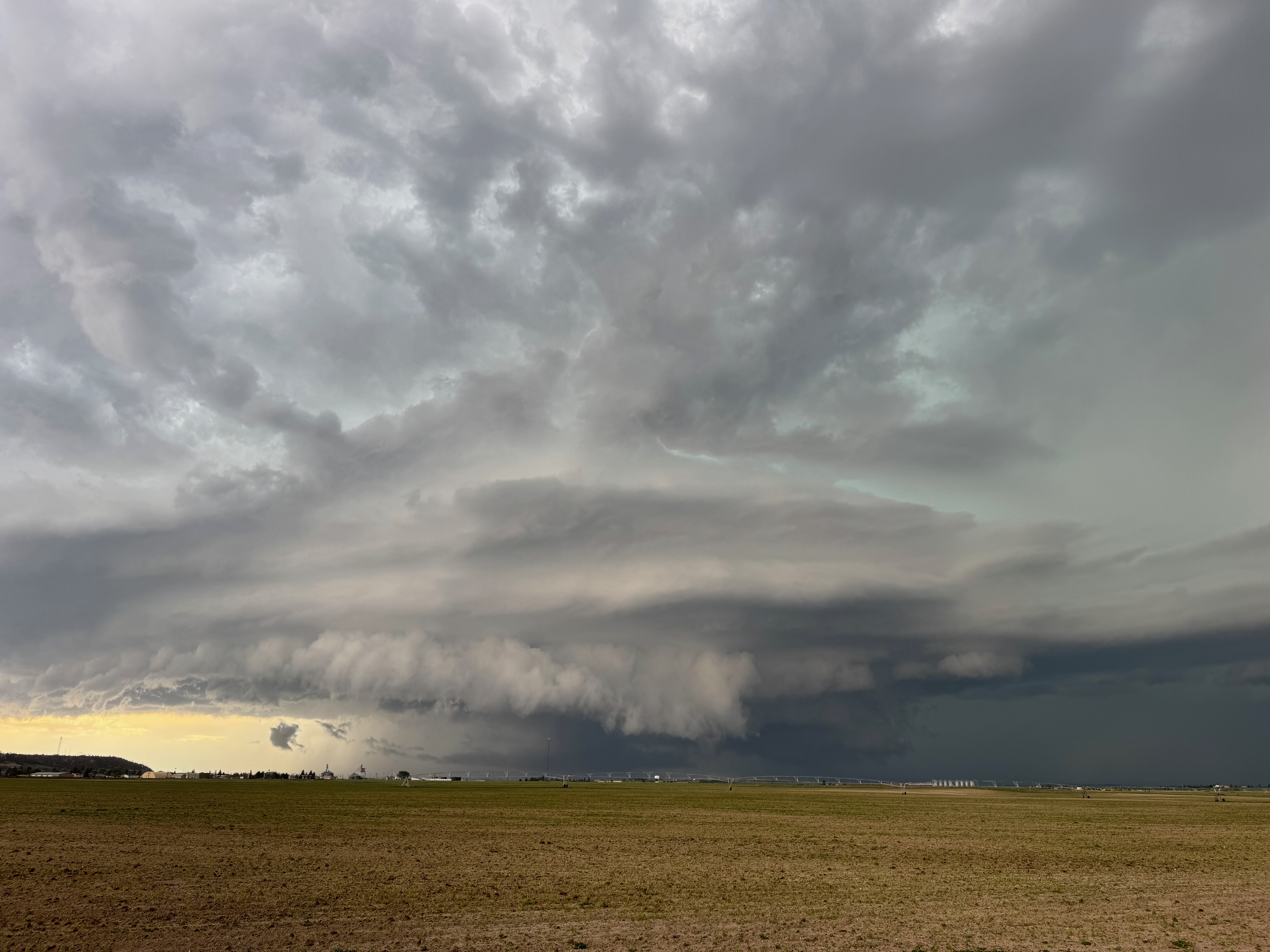 This was the first day of Tour 6. We were anticipating a good severe weather day, and fortunately we were fairly close to a target area. However, I was waffling heavily between SW Nebraska and the Cheyenne Ridge towards Cheyenne. After the BBQ lunch in Fort Morgan I decided to try the Cheyenne Ridge play. We found our way in front of a nicely-structured supercell that was approaching Pine Bluffs, Wyoming, near the Nebraska border. The low-level shear and instability weren’t quite right for a good tornado risk, but we did observe a big honking wall cloud. See the Canon pics below, and additional narrative below.