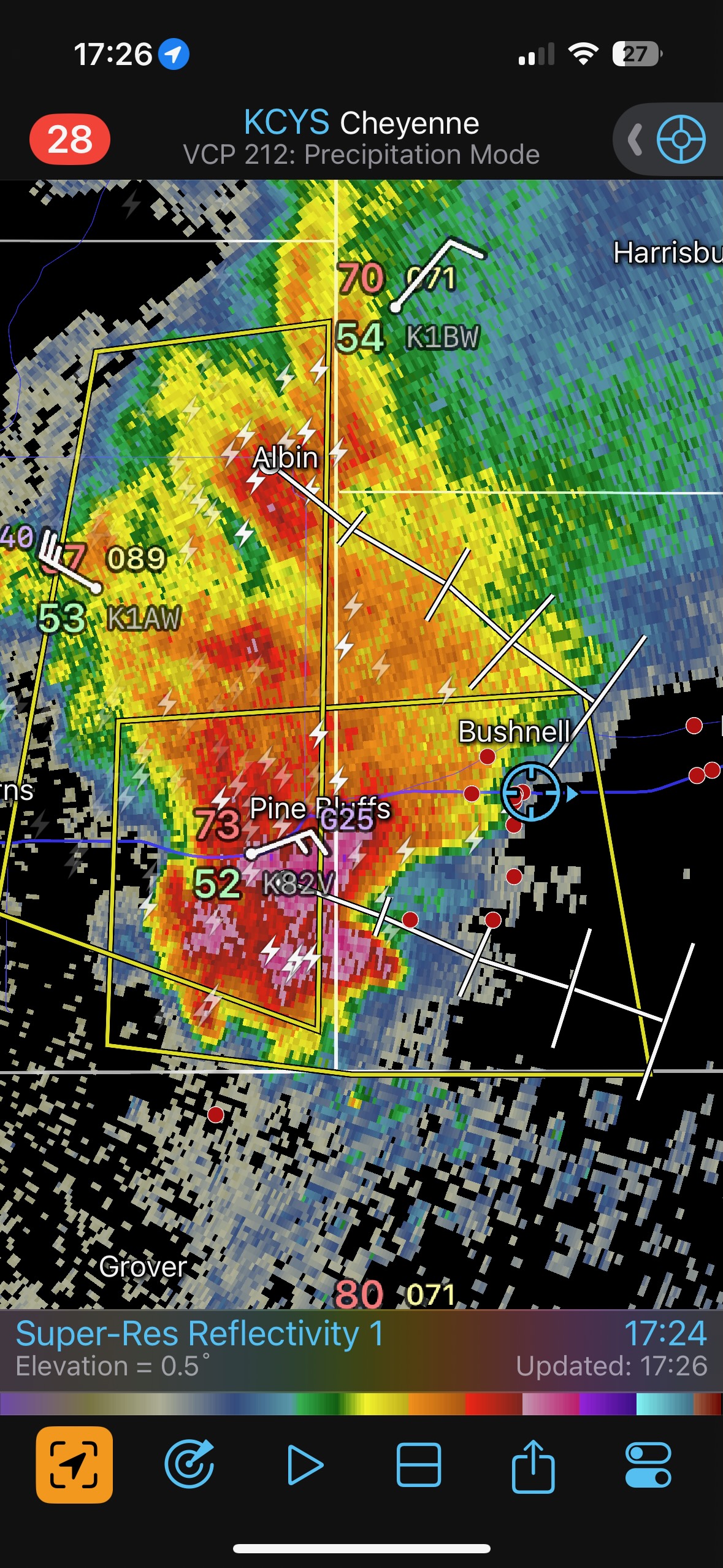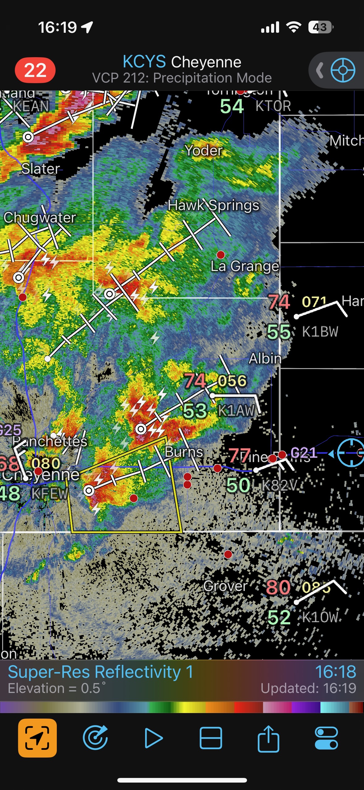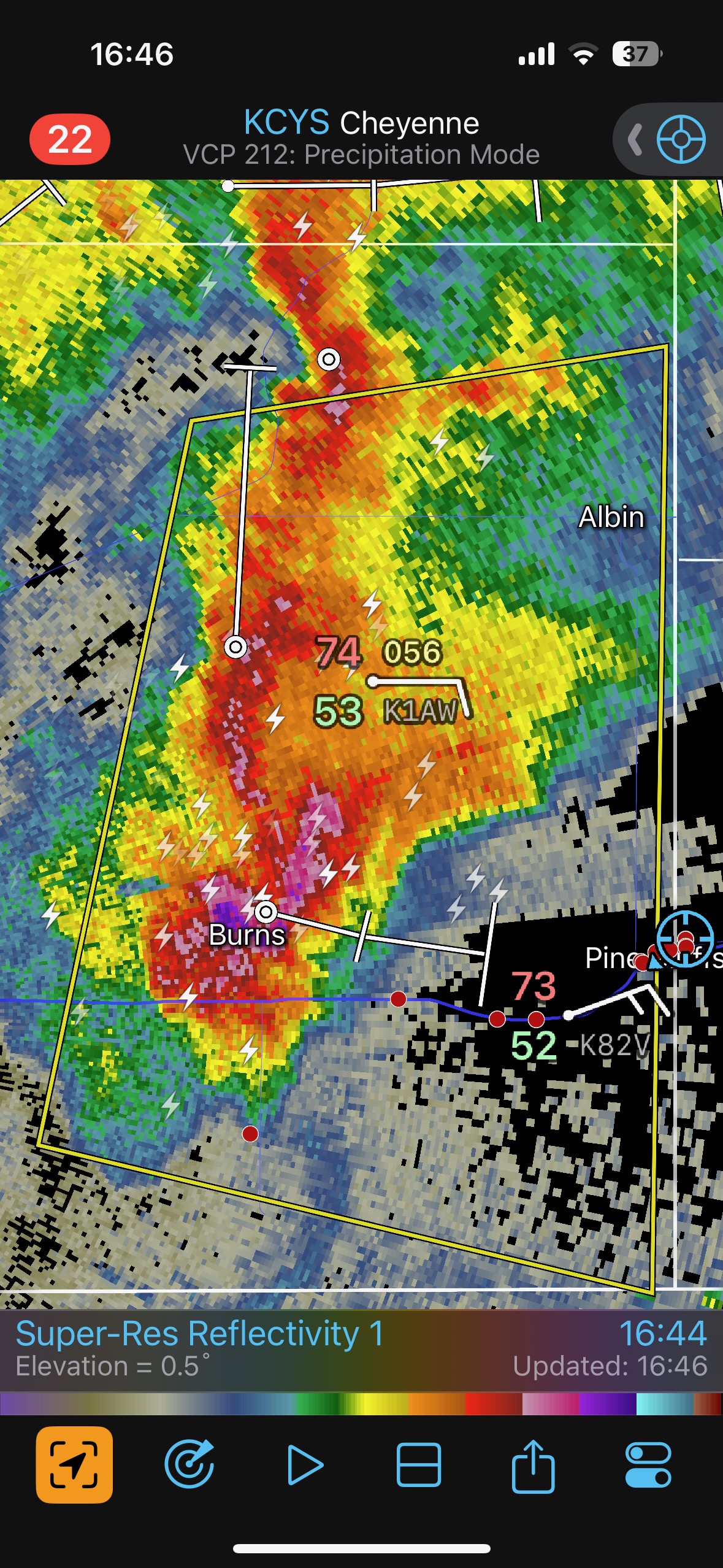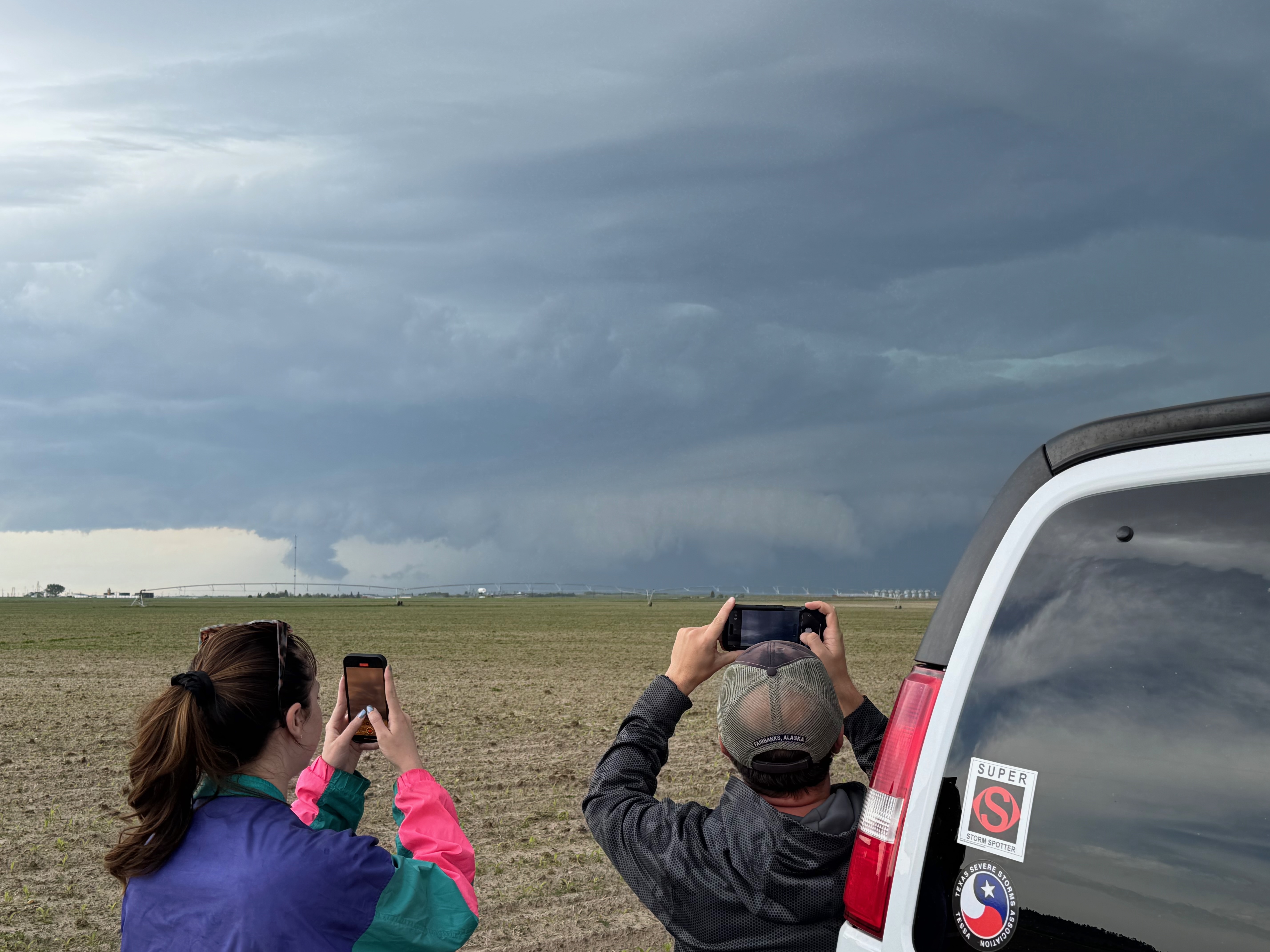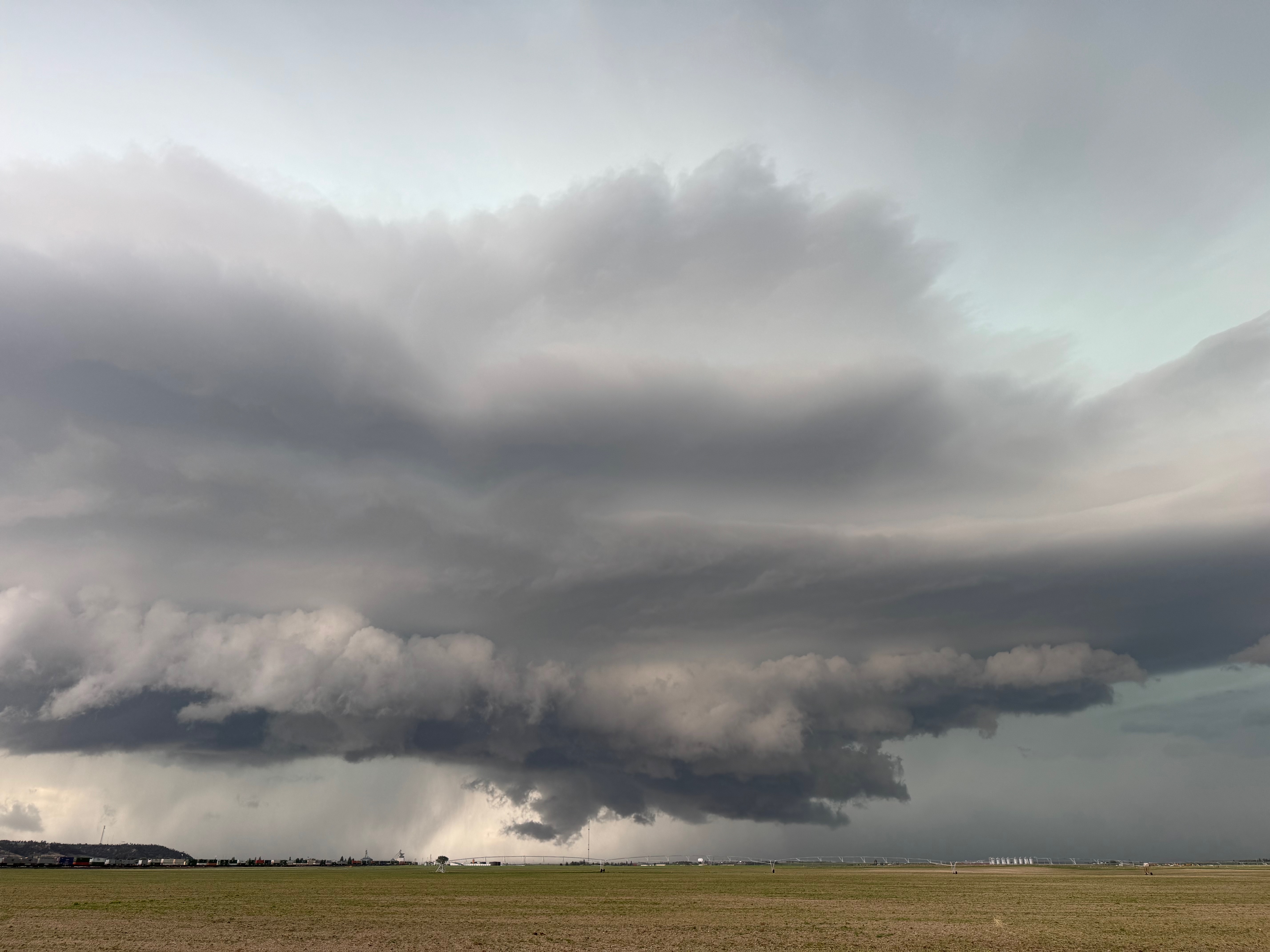 This was the first day of Tour 6. We were anticipating a good severe weather day, and fortunately we were fairly close to a target area. However, I was waffling heavily between SW Nebraska and the Cheyenne Ridge towards Cheyenne. After the BBQ lunch in Fort Morgan I decided to try the Cheyenne Ridge play. We found our way in front of a nicely-structured supercell that was approaching Pine Bluffs, Wyoming, near the Nebraska border. The low-level shear and instability weren’t quite right for a good tornado risk, but we did observe a big honking wall cloud. See the Canon pics below, and additional narrative below.
