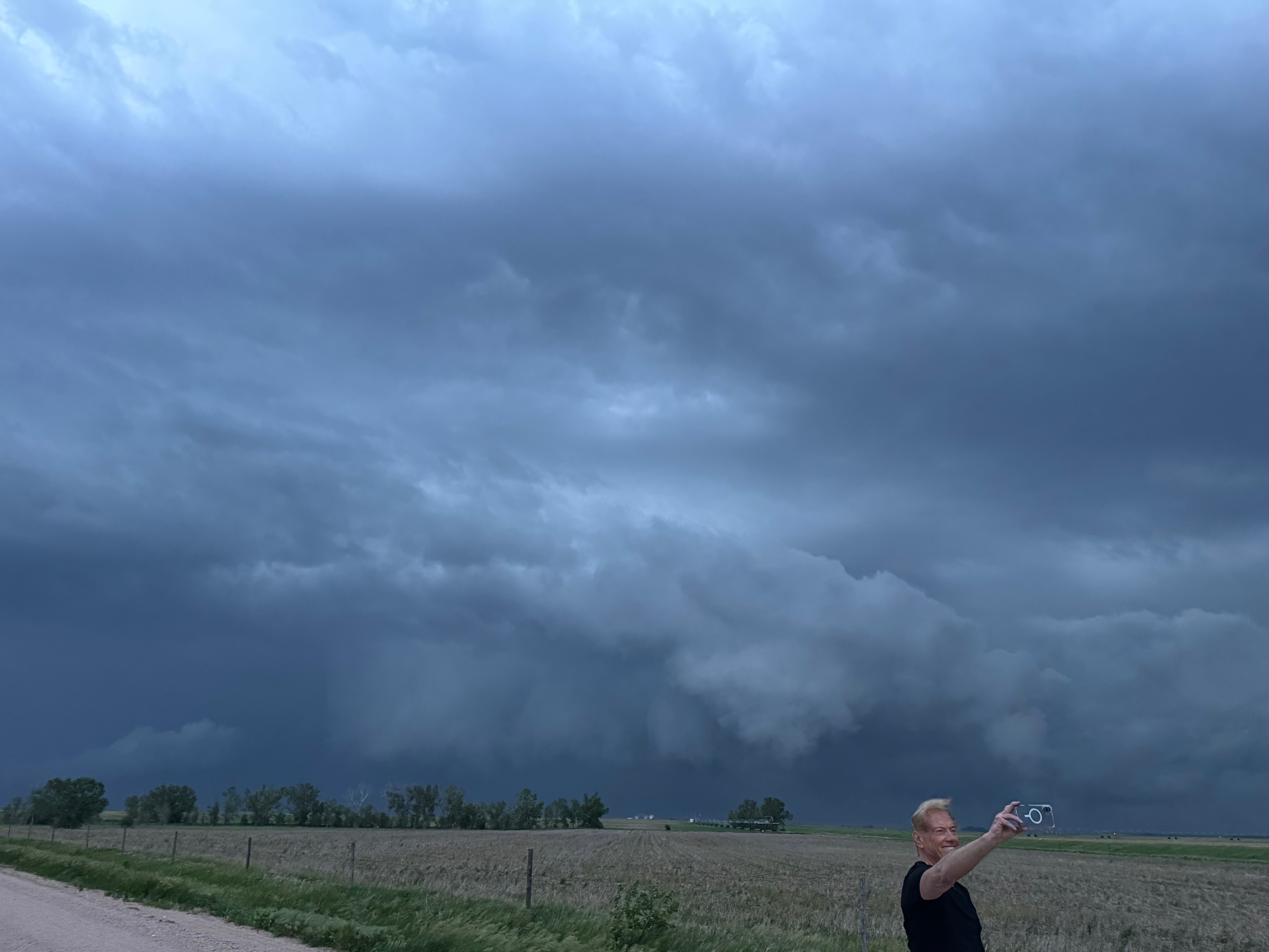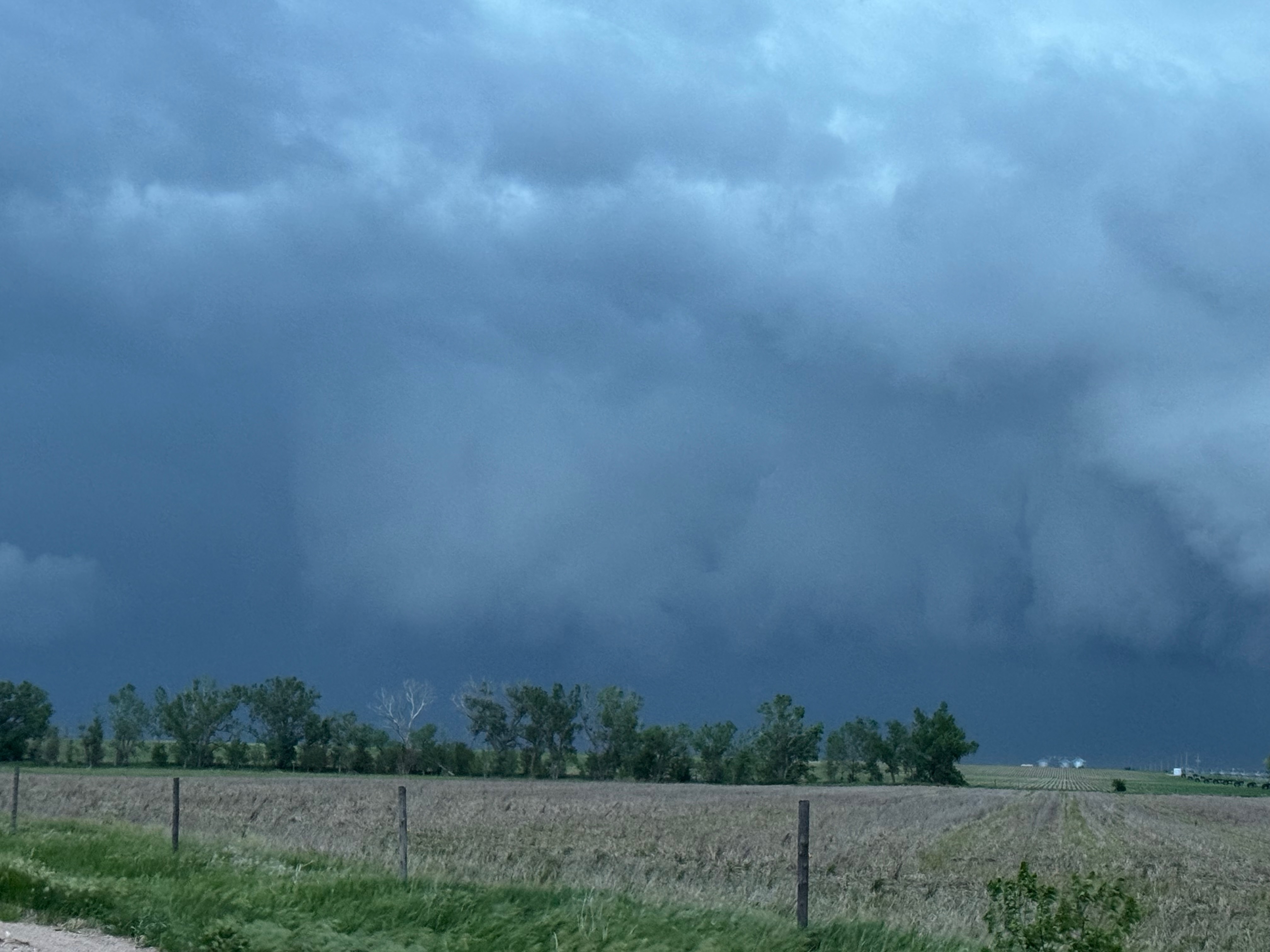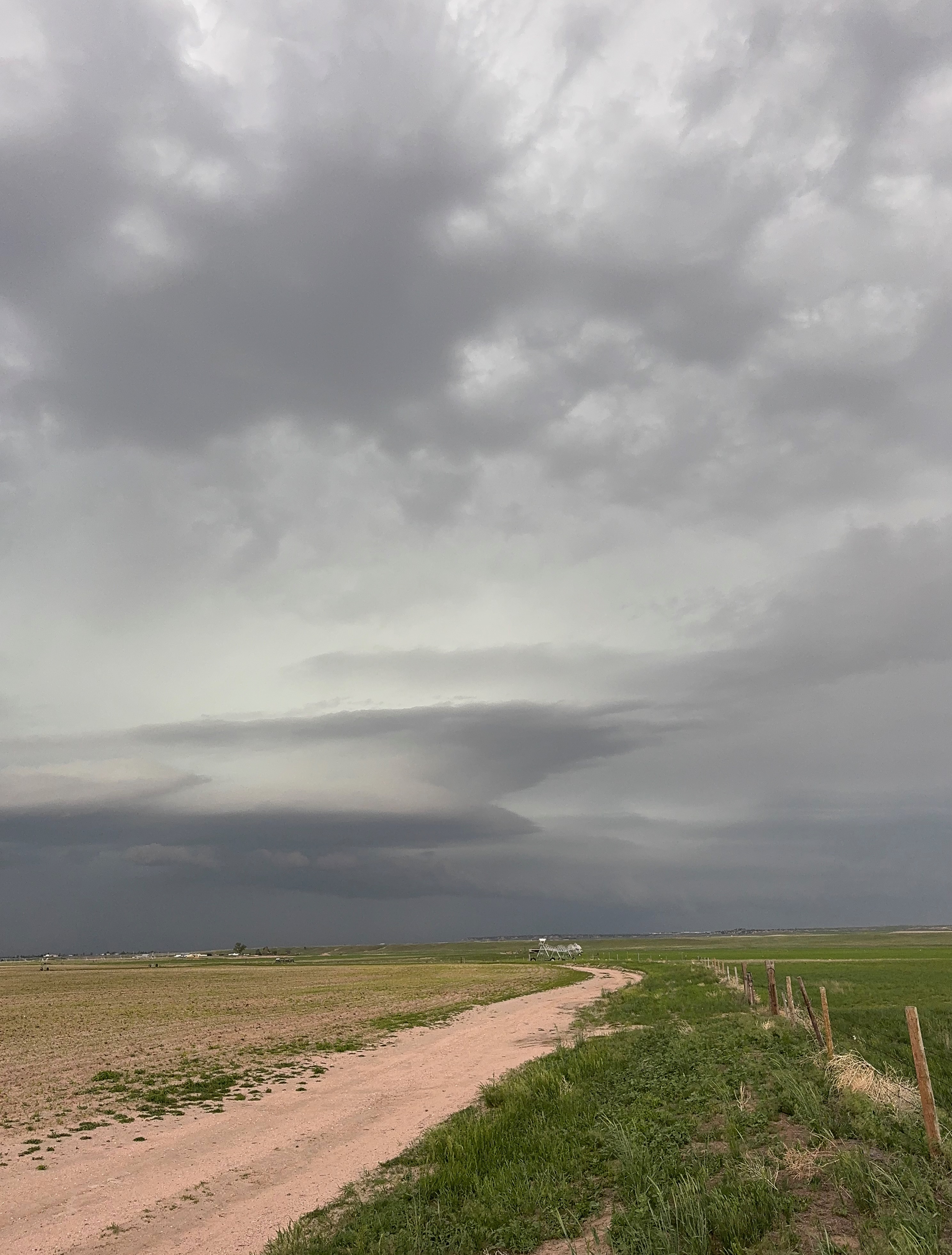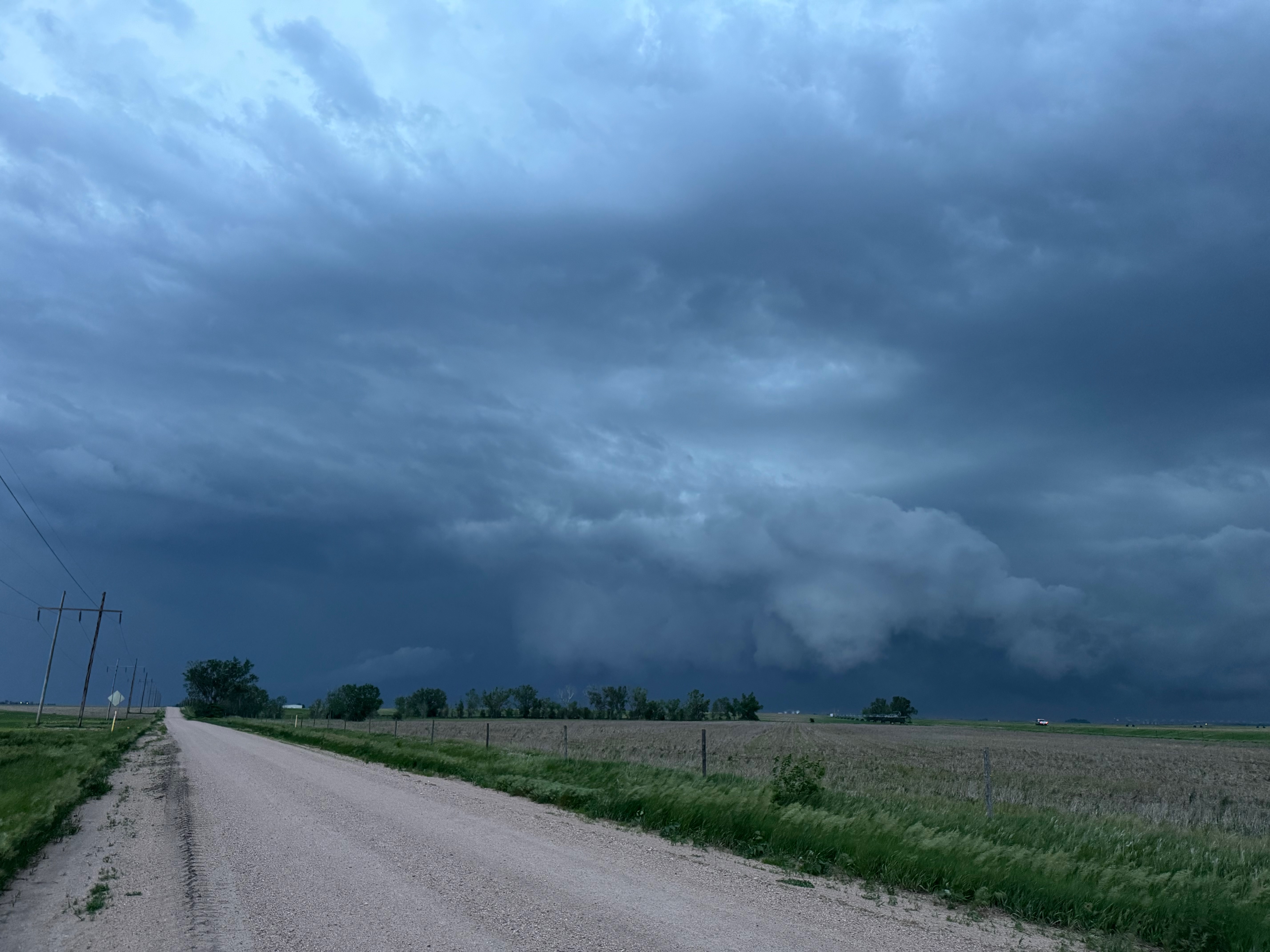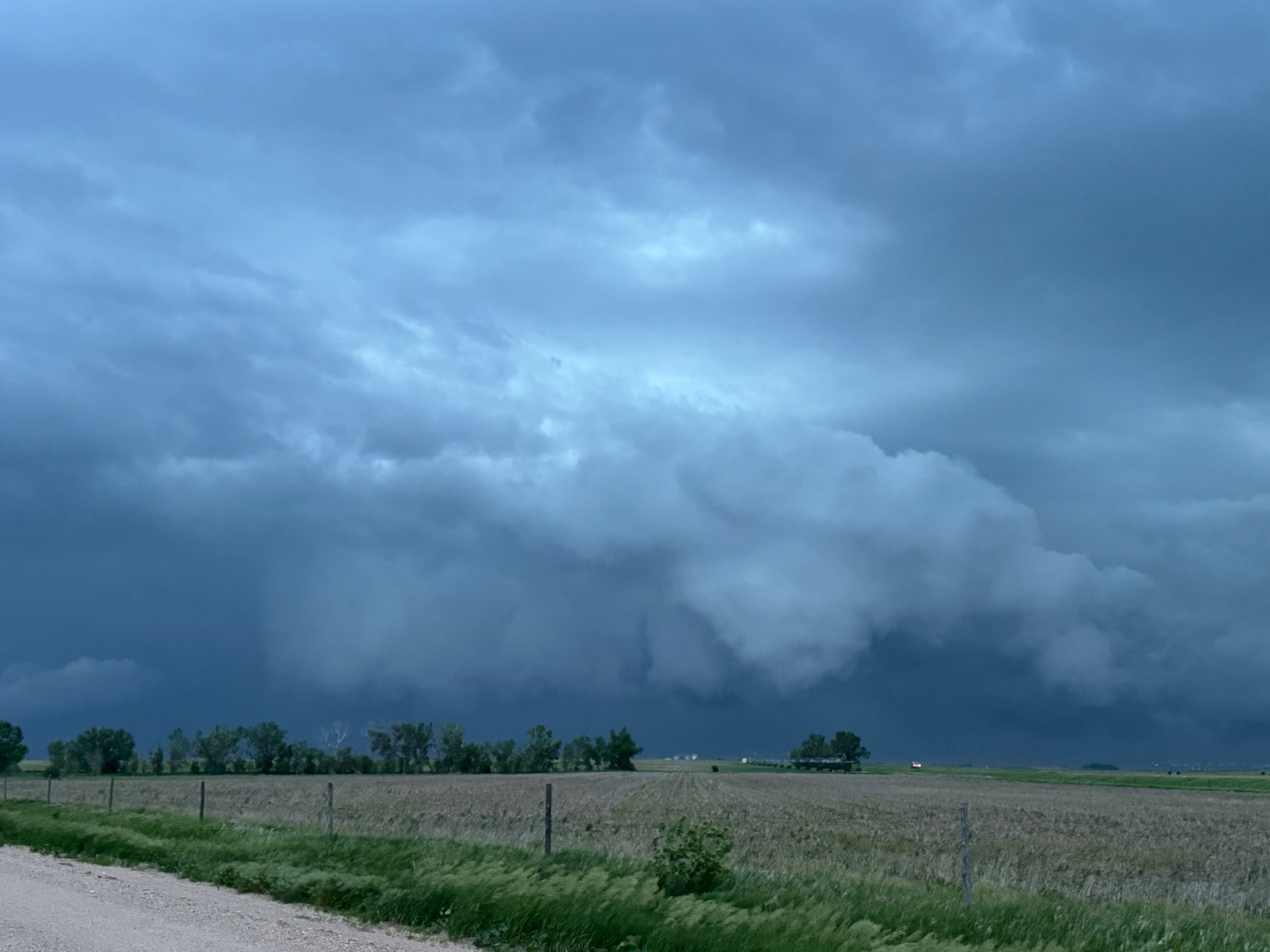 Our Cheyenne Ridge severe storm was moving to the ESE, so we scooted east to Kimball and southward into Colorado (first three images below). The storm started to look less organized when we reached Highway 14, and I decided to blast east towards Sterling and Holyoke. We were leaving behind a new updraft or two near Raymer, and one of these became tornado-warned with decent structure. But we were at Sterling for a pit stop at the time. I elected to keep going east to the strong activity near the CO/NE border. We finally came up behind some very strong storms with interesting lowerings west of Imperial (last 6 pics below). But this was now a linear mess. We battled very heavy rain into Imperial and gave up the chase.