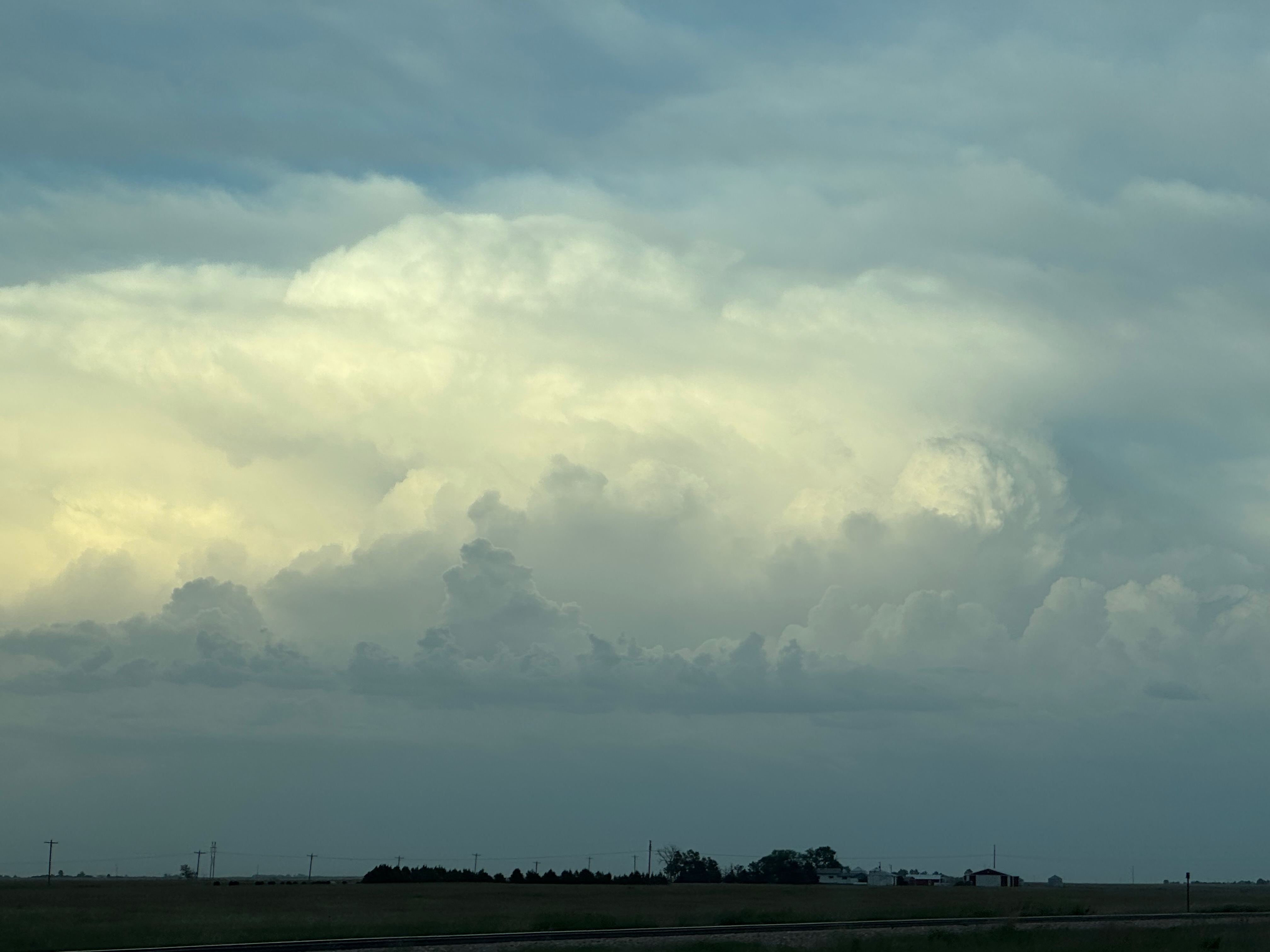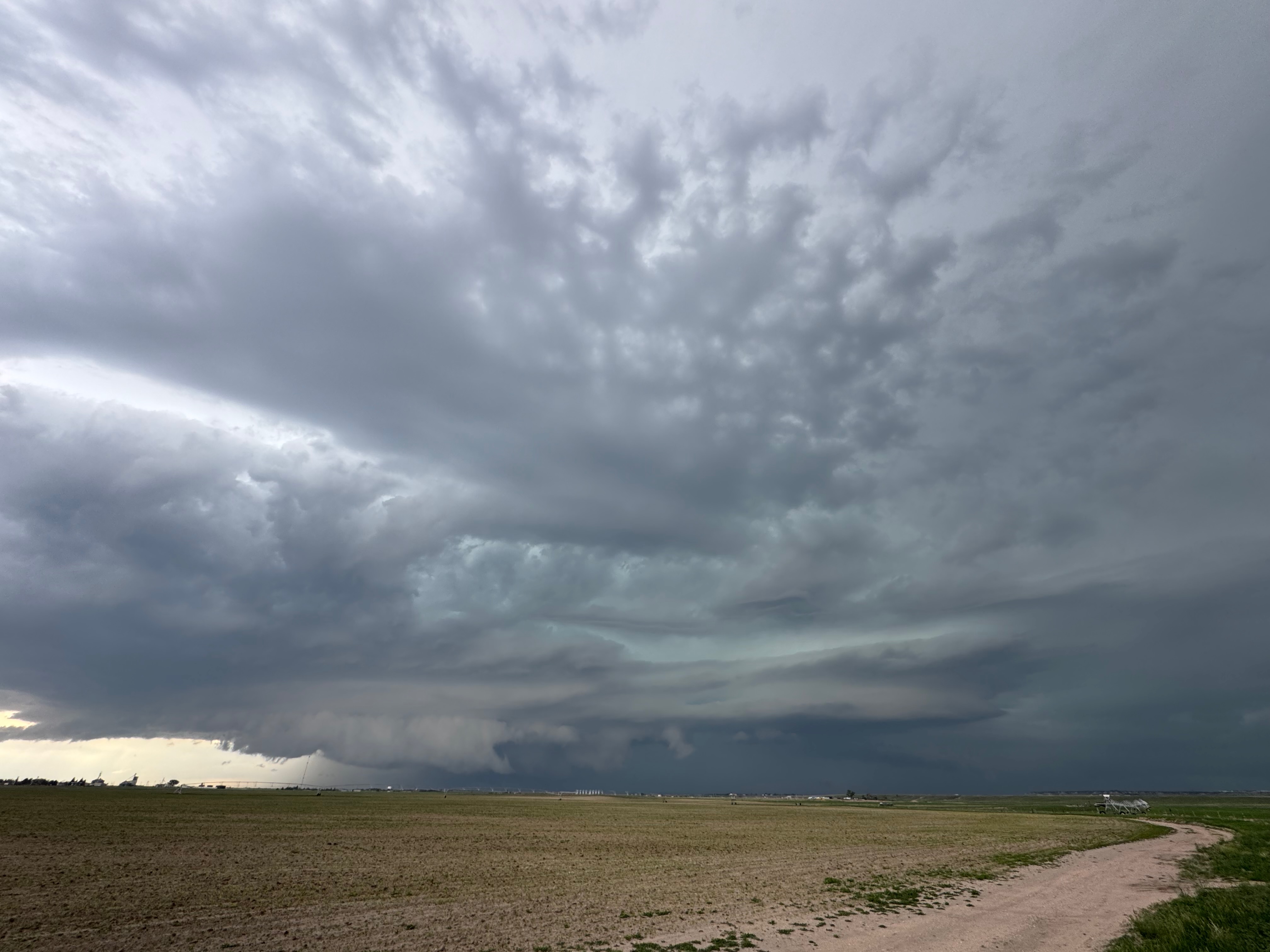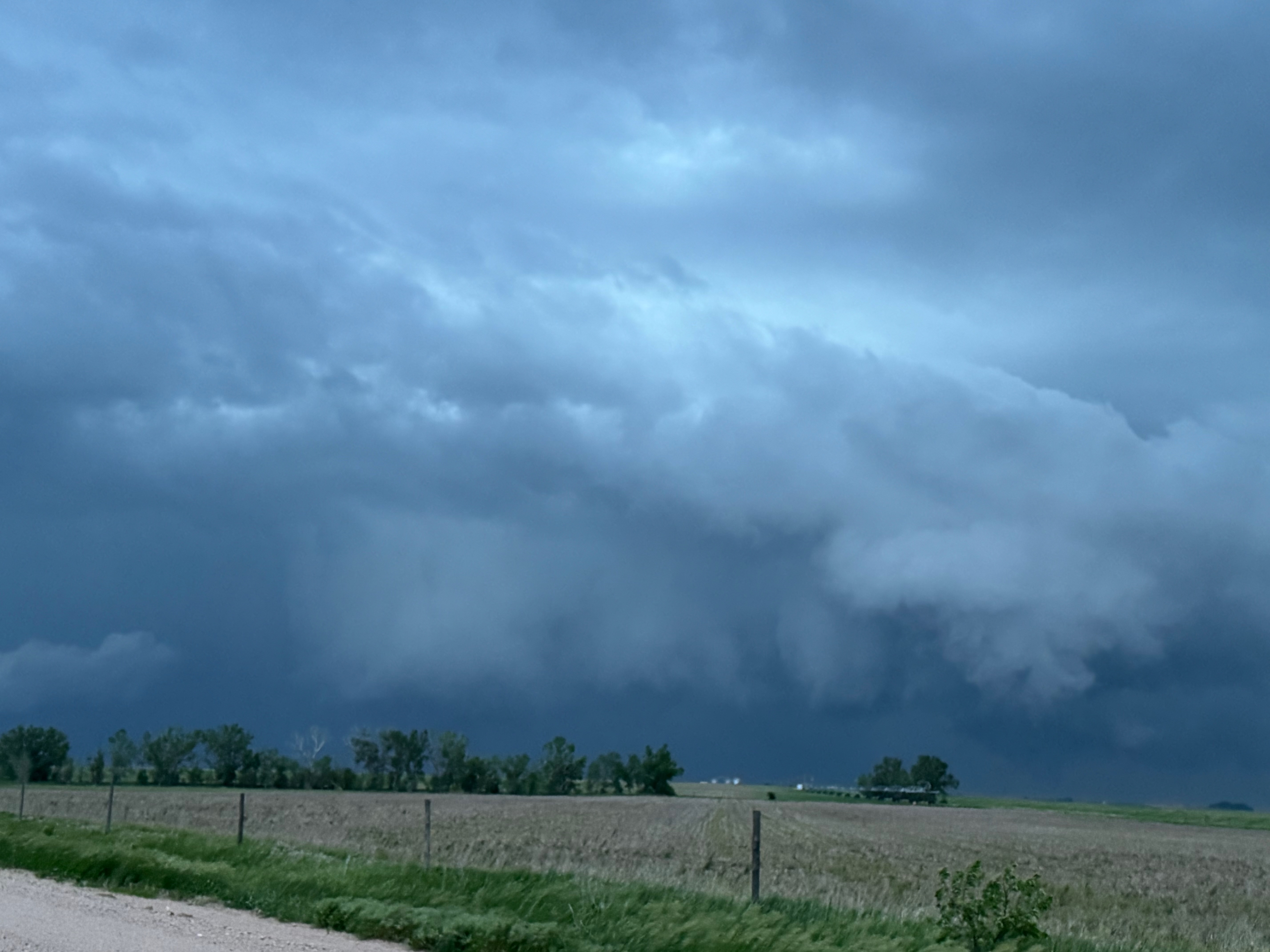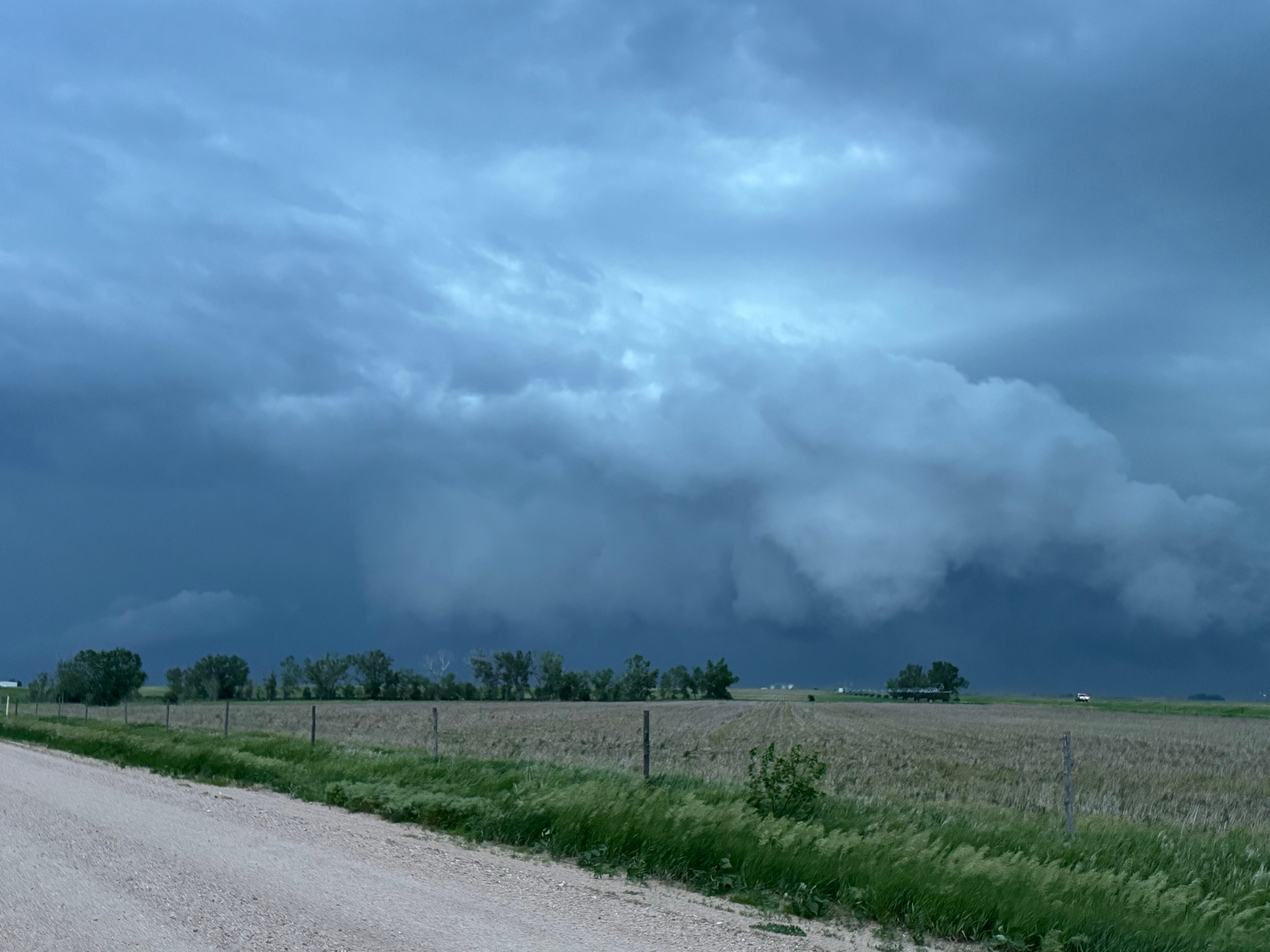 Our Cheyenne Ridge severe storm was moving to the ESE, so we scooted east to Kimball and southward into Colorado (first three images below). The storm started to look less organized when we reached Highway 14, and I decided to blast east towards Sterling and Holyoke. We were leaving behind a new updraft or two near Raymer, and one of these became tornado-warned with decent structure. But we were at Sterling for a pit stop at the time. I elected to keep going east to the strong activity near the CO/NE border. We finally came up behind some very strong storms with interesting lowerings west of Imperial (last 6 pics below). But this was now a linear mess. We battled very heavy rain into Imperial and gave up the chase.