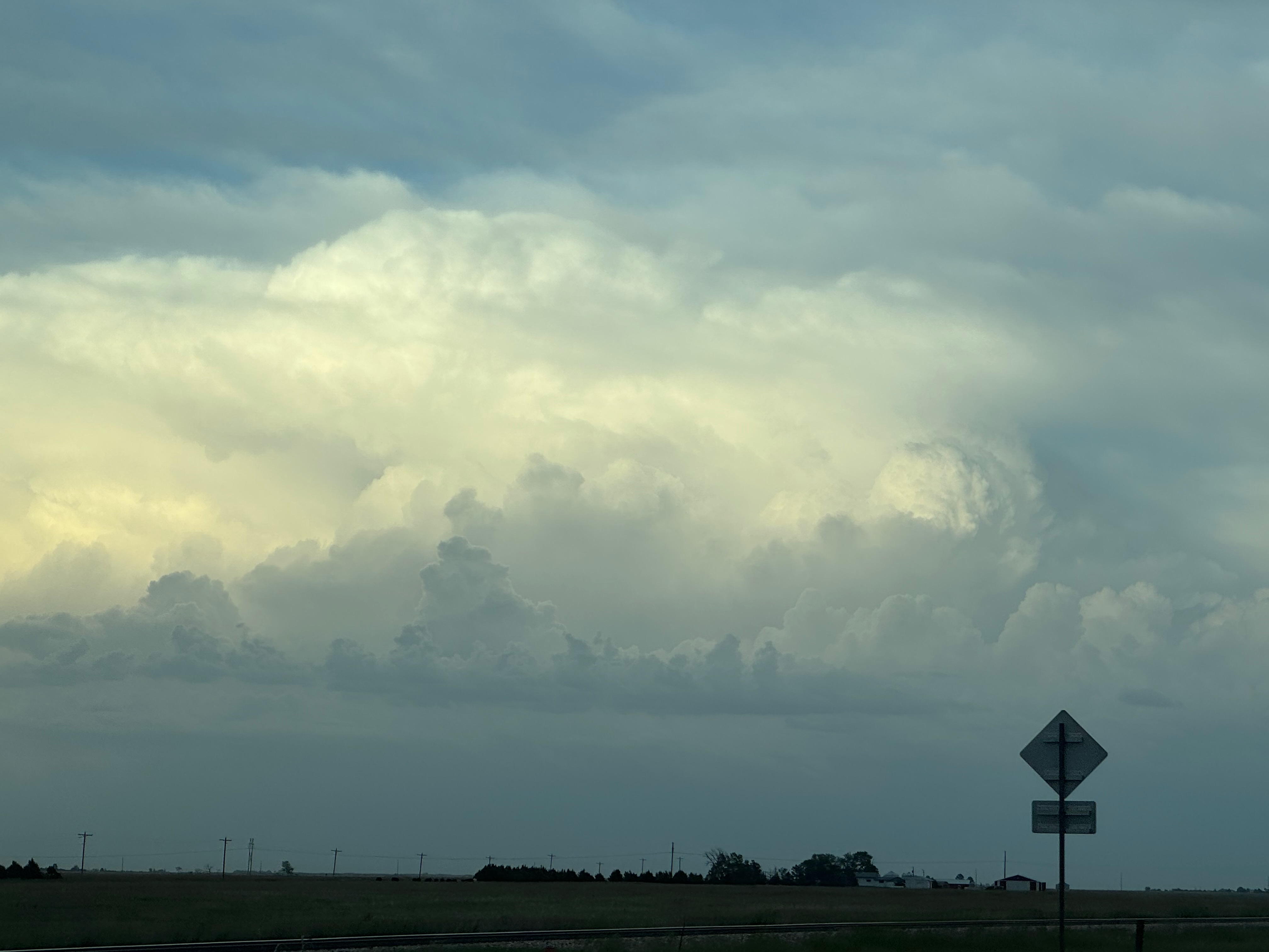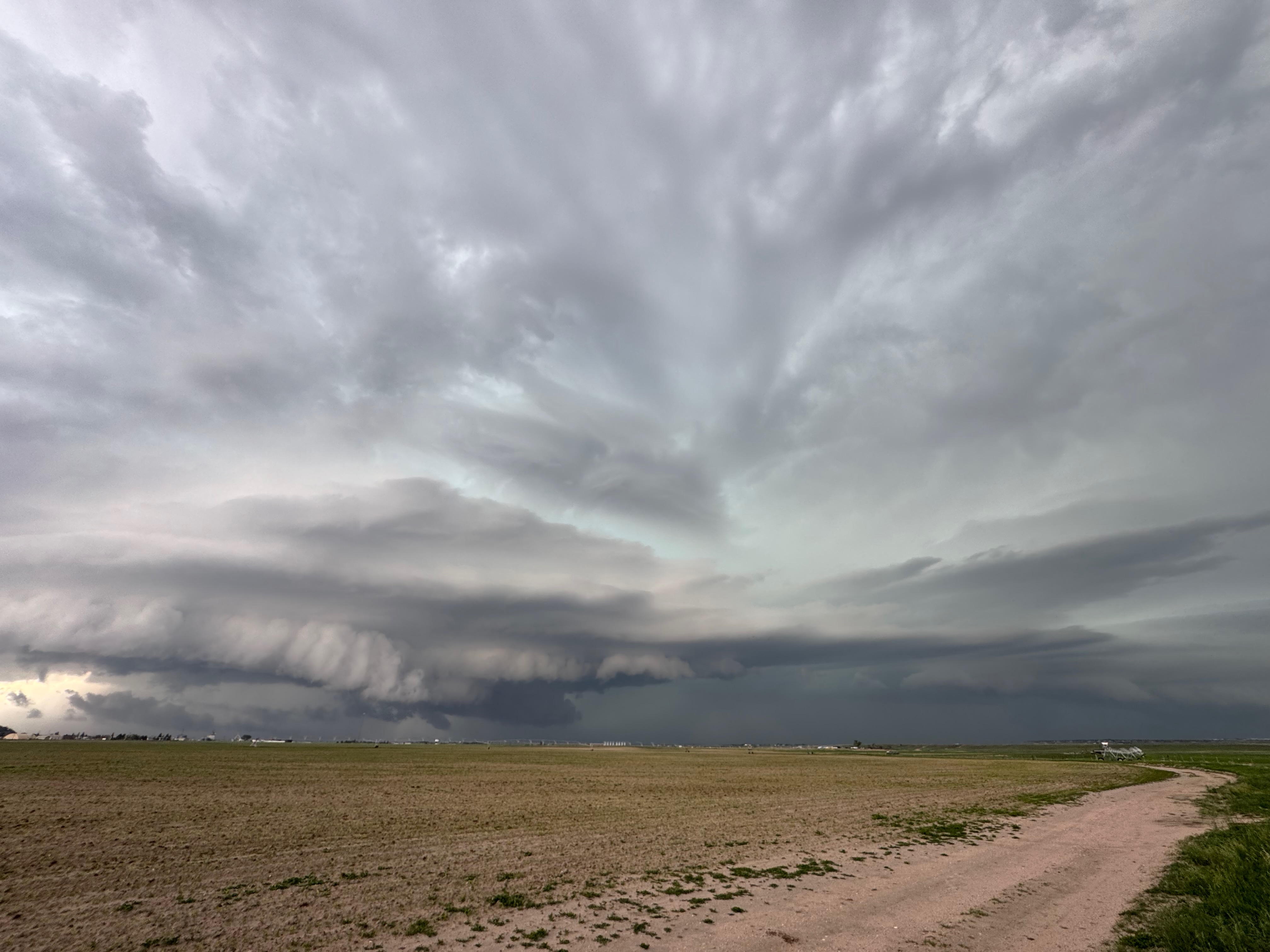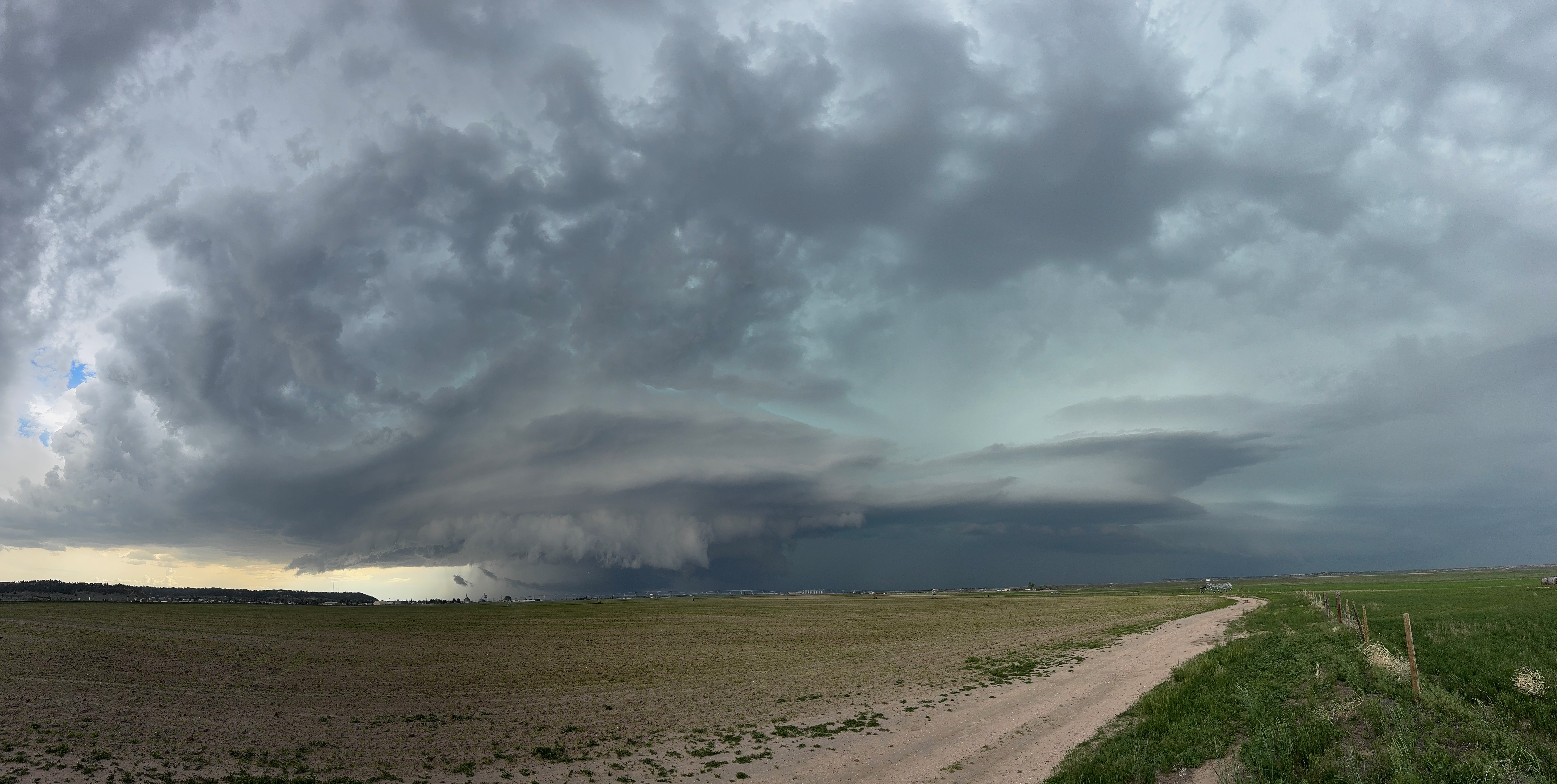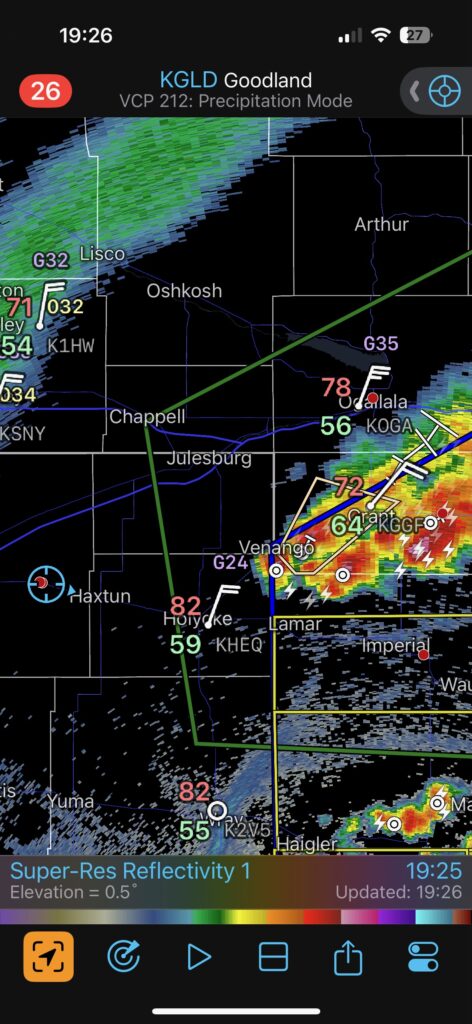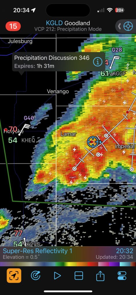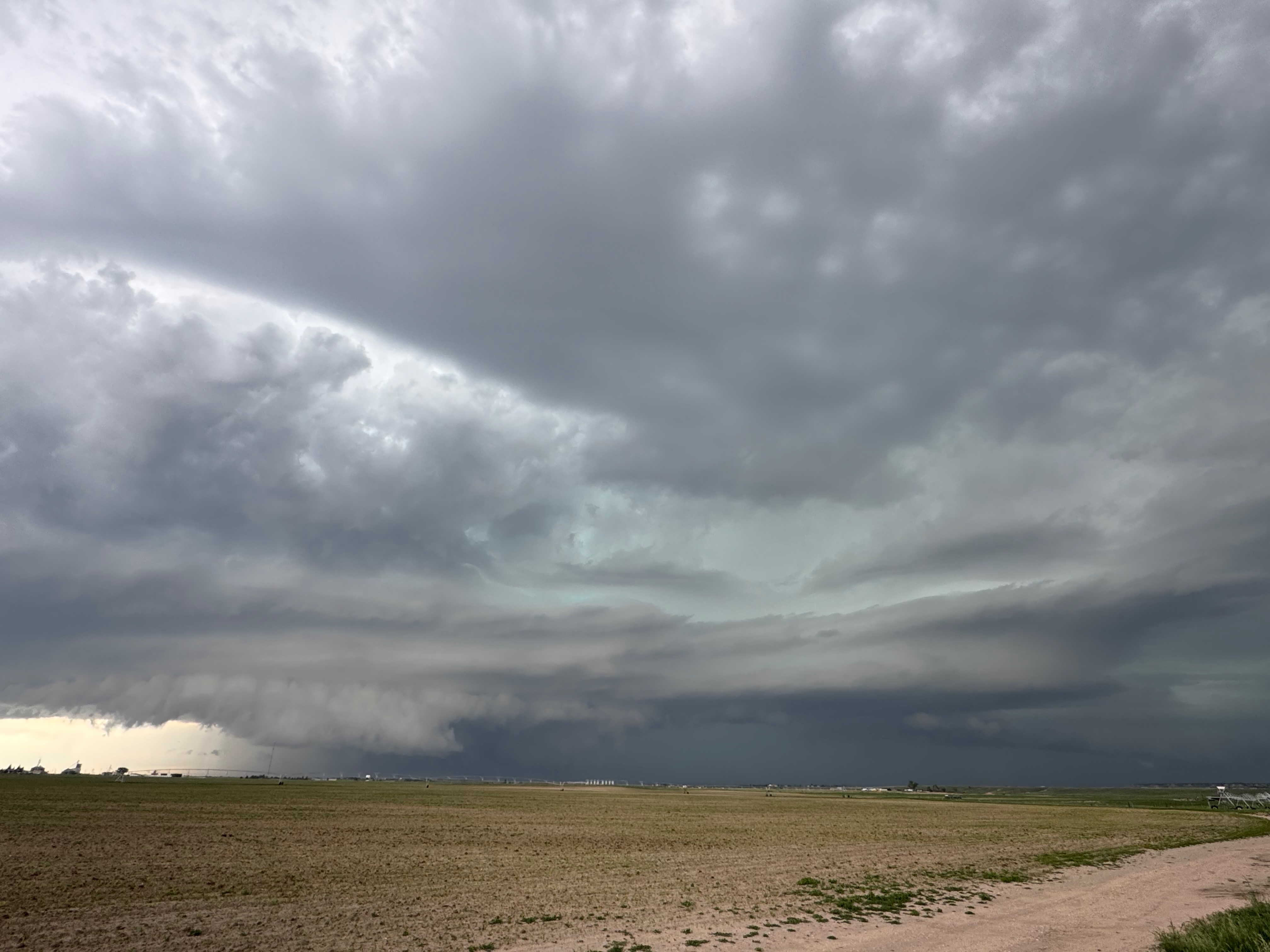 Our Cheyenne Ridge severe storm was moving to the ESE, so we scooted east to Kimball and southward into Colorado (first three images below). The storm started to look less organized when we reached Highway 14, and I decided to blast east towards Sterling and Holyoke. We were leaving behind a new updraft or two near Raymer, and one of these became tornado-warned with decent structure. But we were at Sterling for a pit stop at the time. I elected to keep going east to the strong activity near the CO/NE border. We finally came up behind some very strong storms with interesting lowerings west of Imperial (last 6 pics below). But this was now a linear mess. We battled very heavy rain into Imperial and gave up the chase.