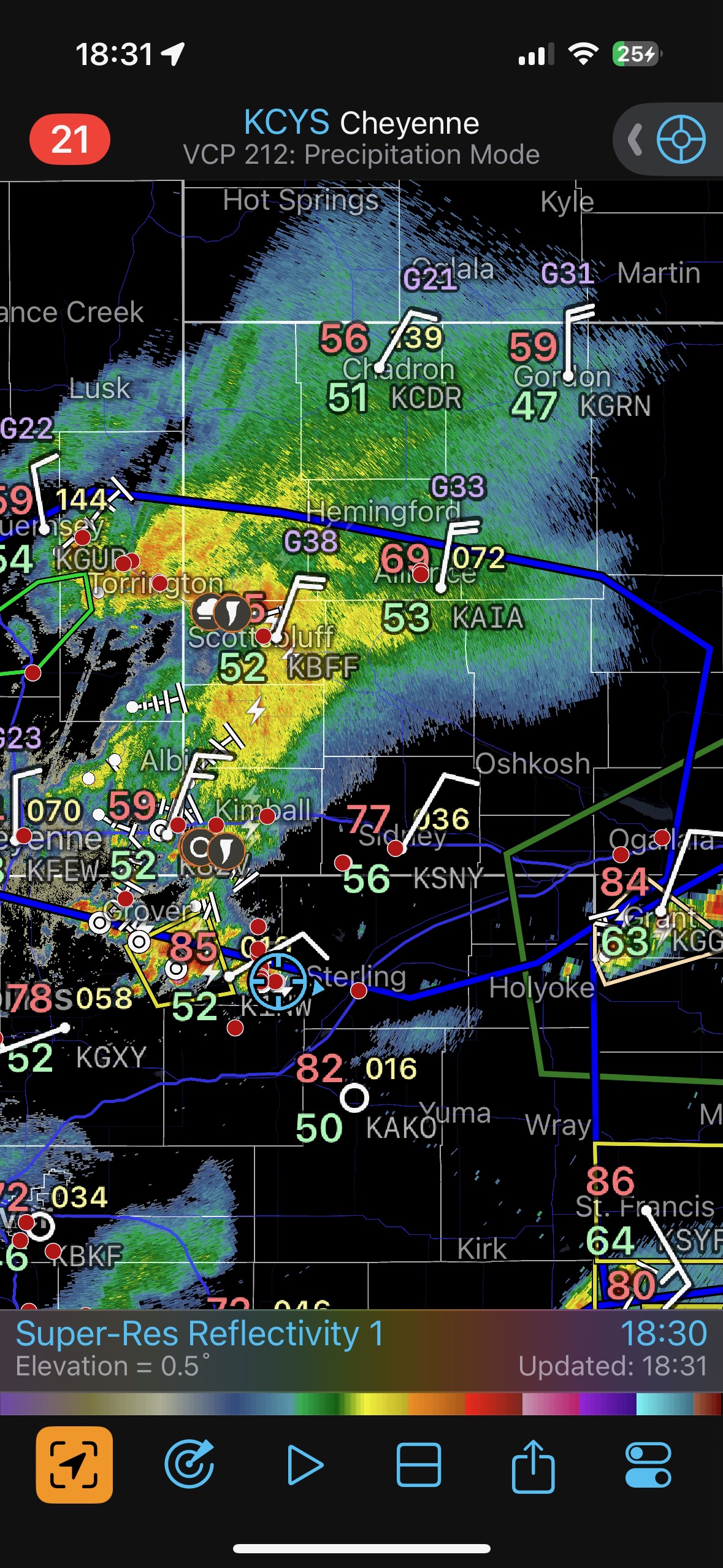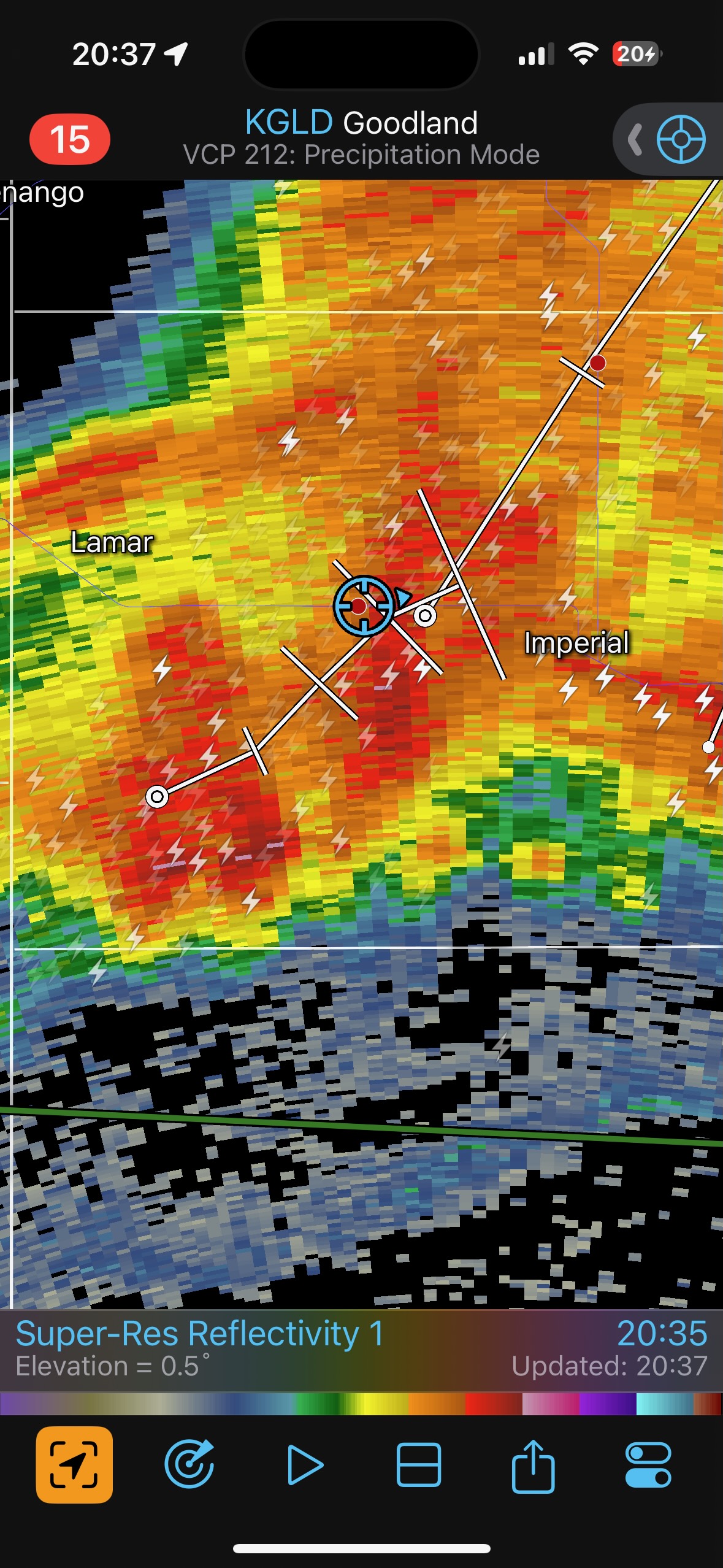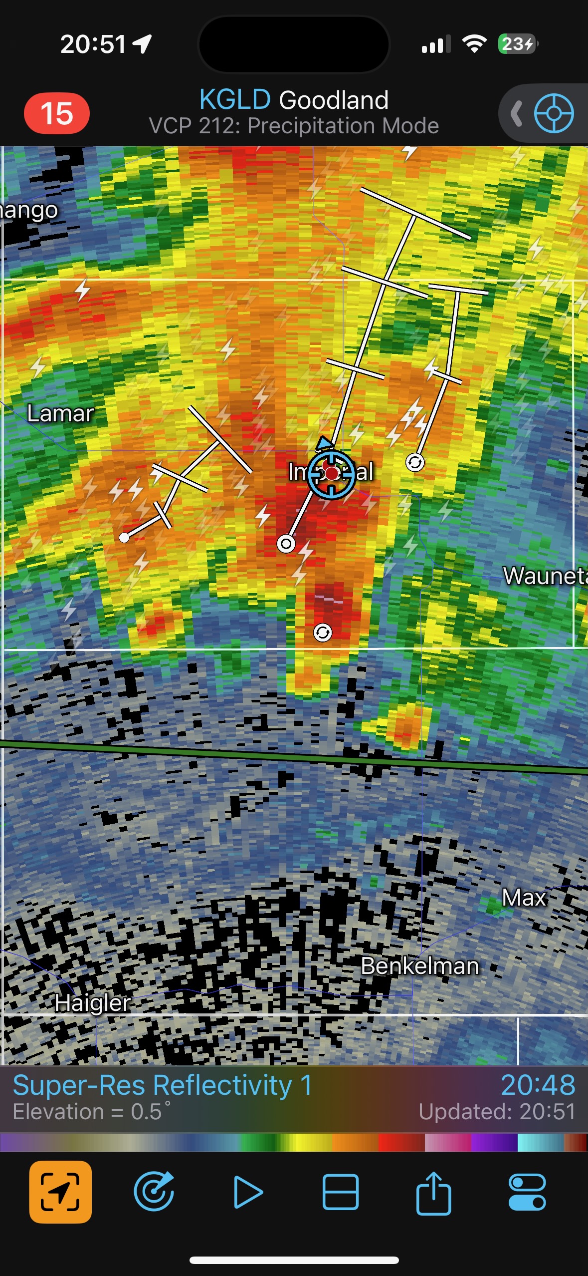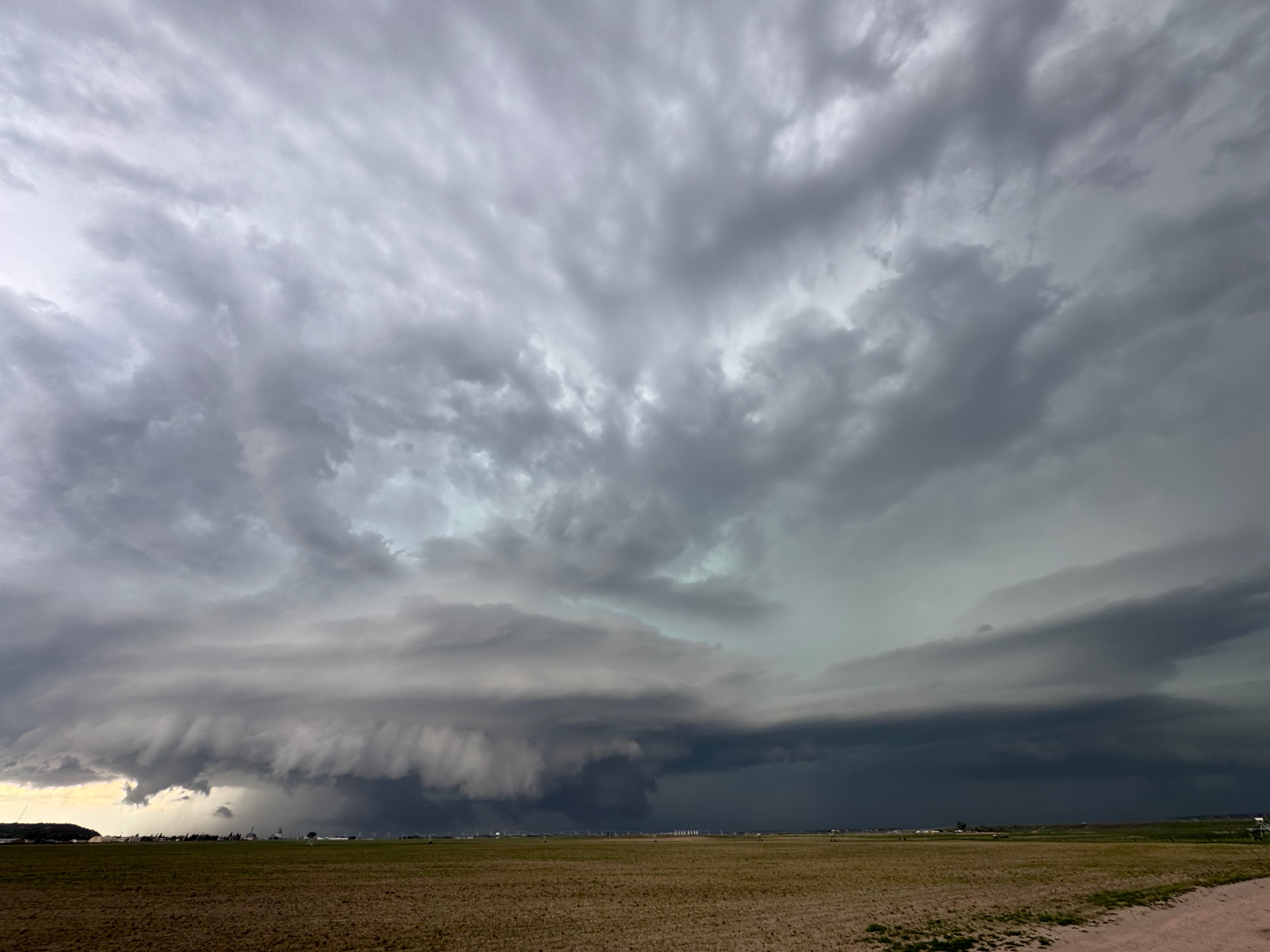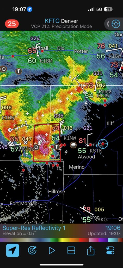 Our Cheyenne Ridge severe storm was moving to the ESE, so we scooted east to Kimball and southward into Colorado (first three images below). The storm started to look less organized when we reached Highway 14, and I decided to blast east towards Sterling and Holyoke. We were leaving behind a new updraft or two near Raymer, and one of these became tornado-warned with decent structure. But we were at Sterling for a pit stop at the time. I elected to keep going east to the strong activity near the CO/NE border. We finally came up behind some very strong storms with interesting lowerings west of Imperial (last 6 pics below). But this was now a linear mess. We battled very heavy rain into Imperial and gave up the chase.