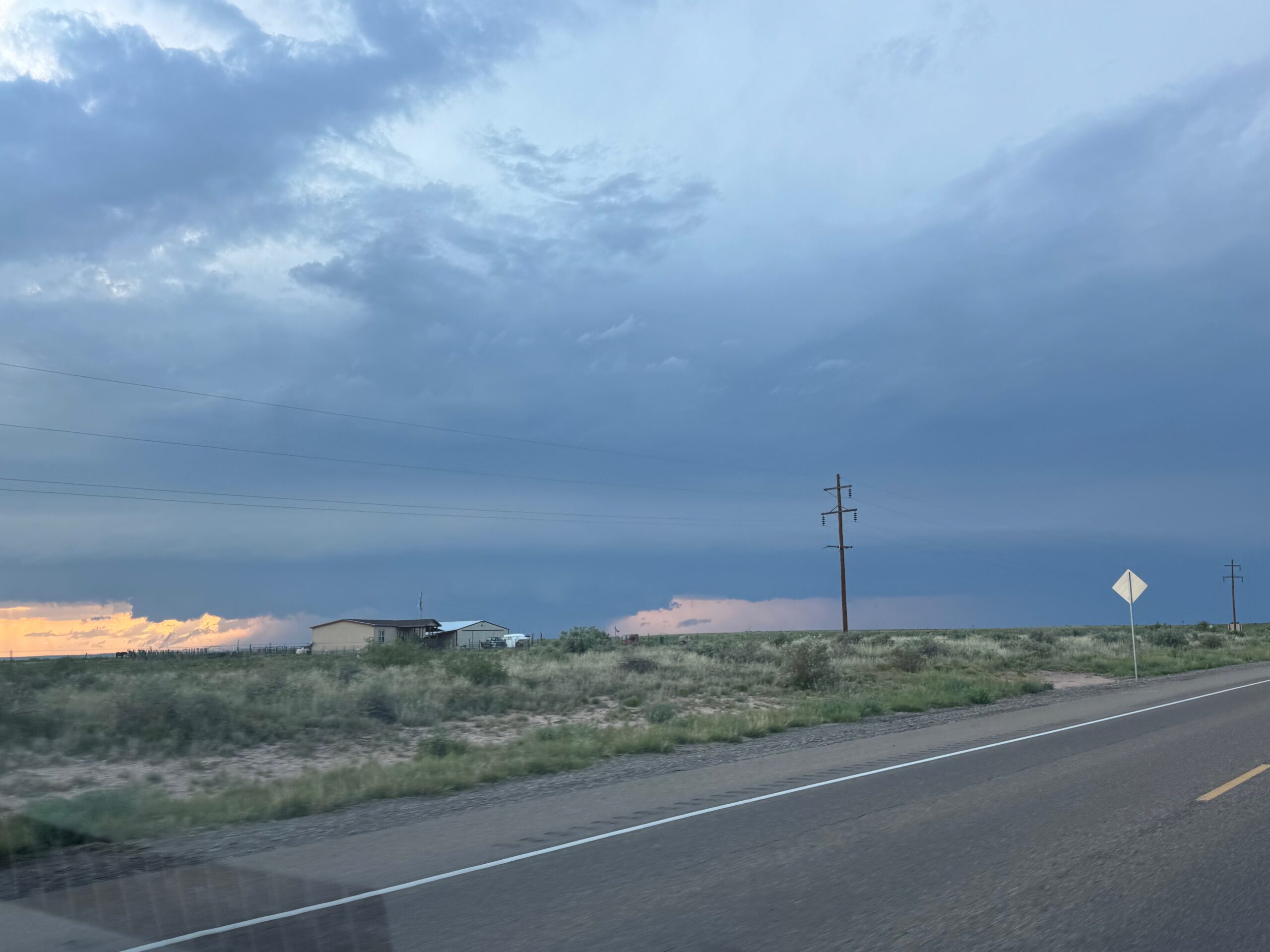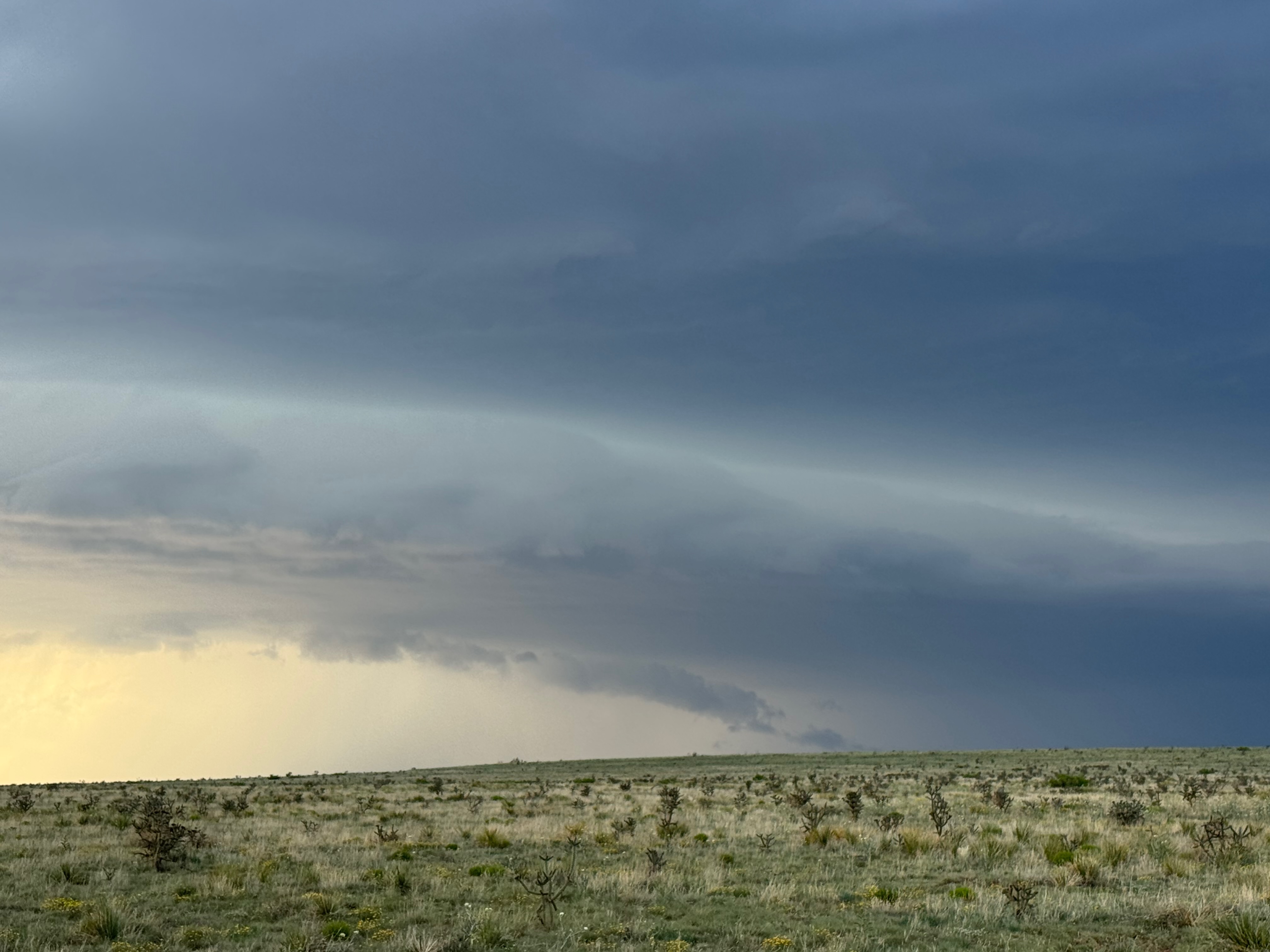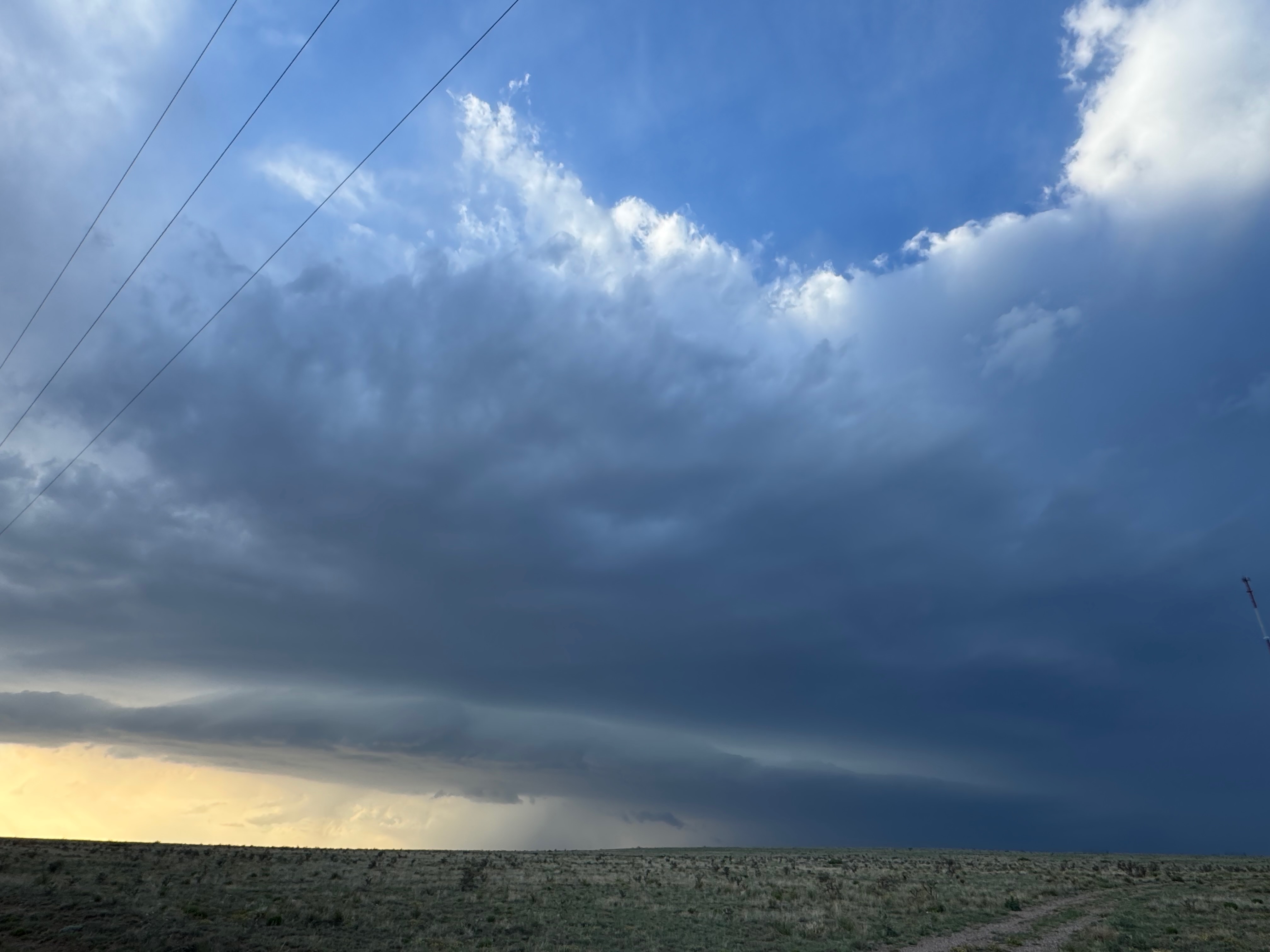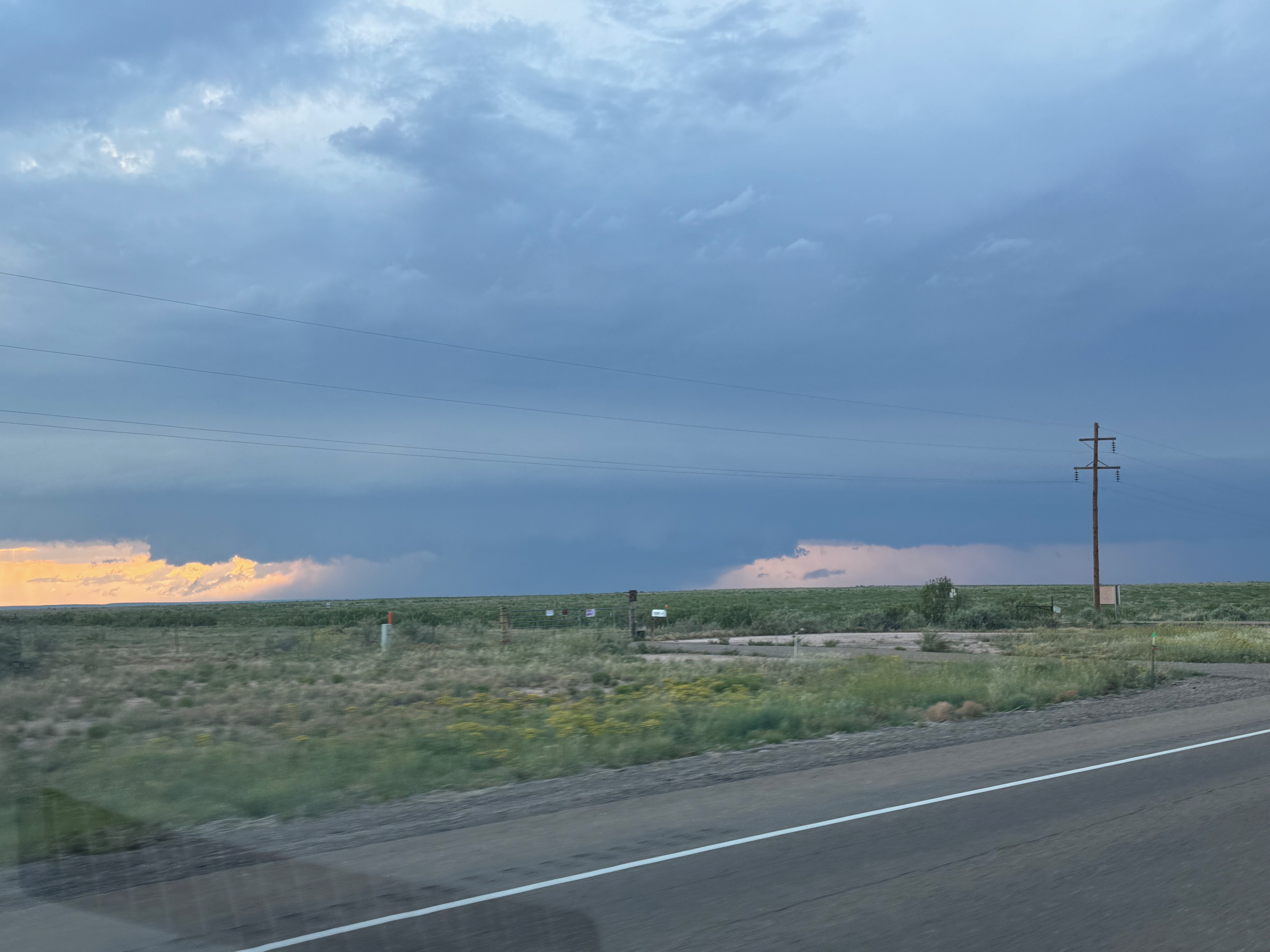 Moisture and shear and upslope flow were good enough for severe storms in east-central New Mexico on this chase day. We headed to Tucumcari and Vaughn. There was some high-based junk around Vaughn. From there we checked out stronger stuff coming out of the Moriarty area along I-40 (second and third photos in the second batch below, around 4:35 p.m.). This stuff looked cold and outflowy. We went back east again to intercept a new updraft that was southwest of Santa Rosa. It looked big and beefy, and eventually we had a good look at the organized storm base that was northwest of Fort Sumner (see last several images below).