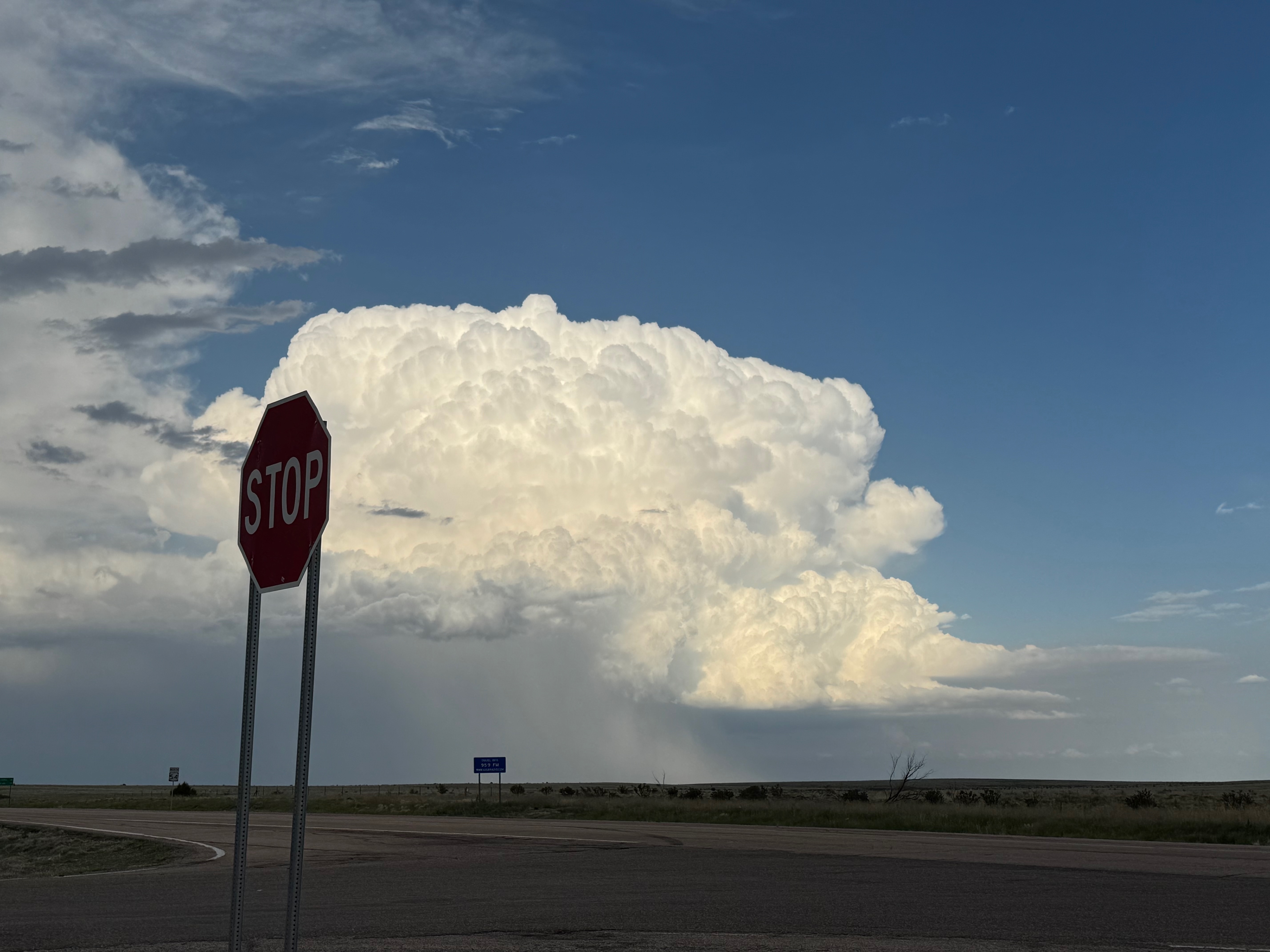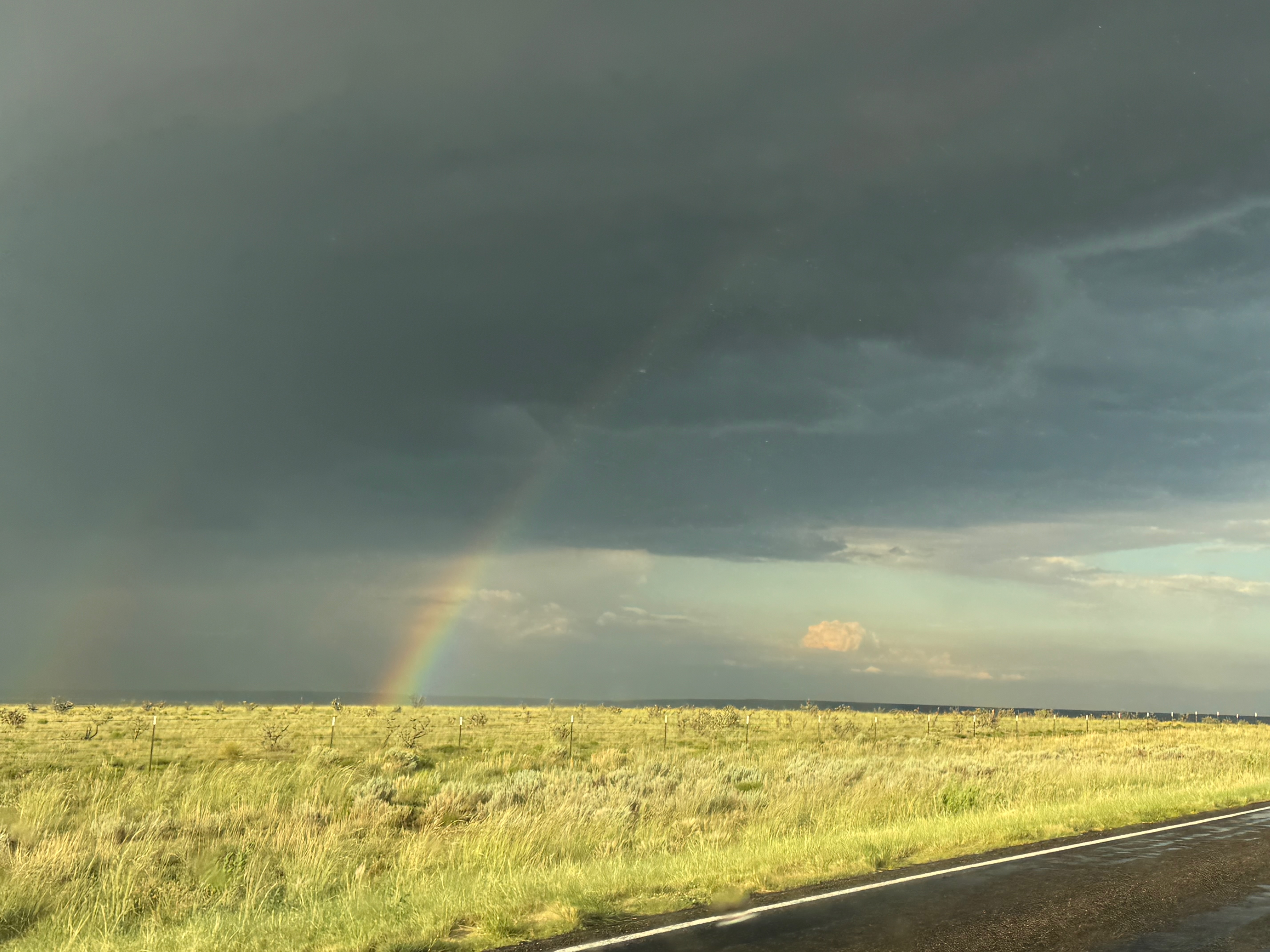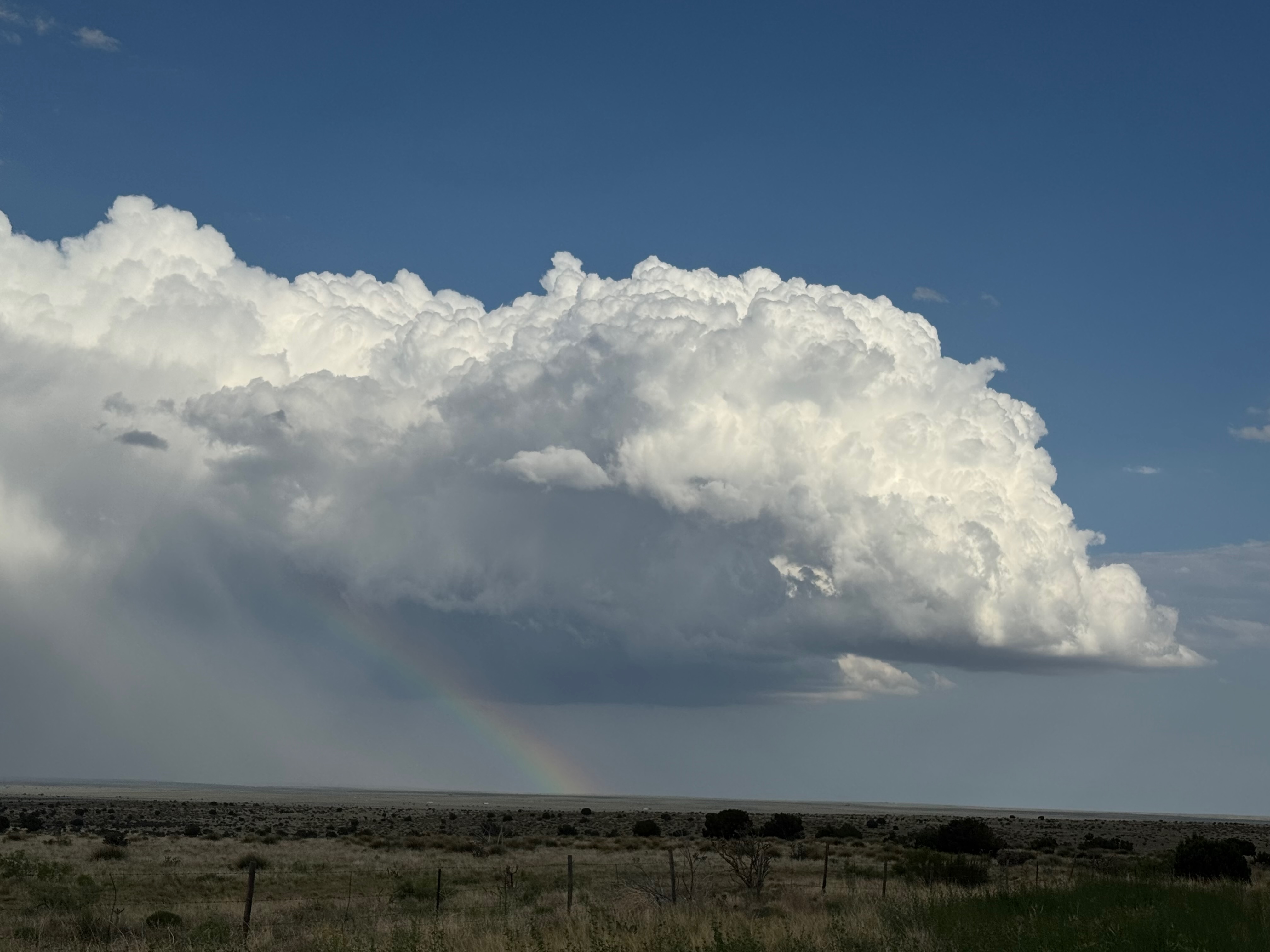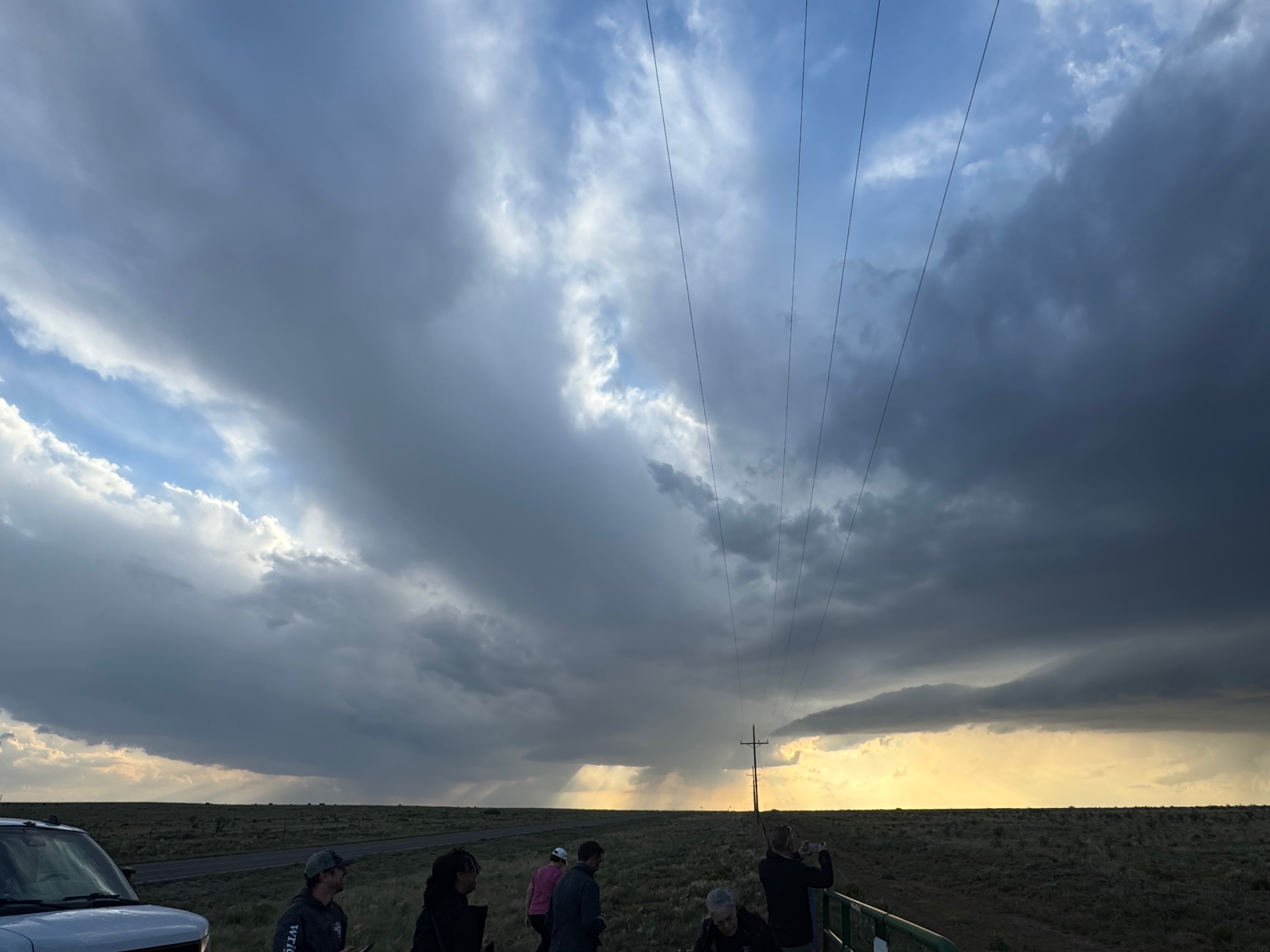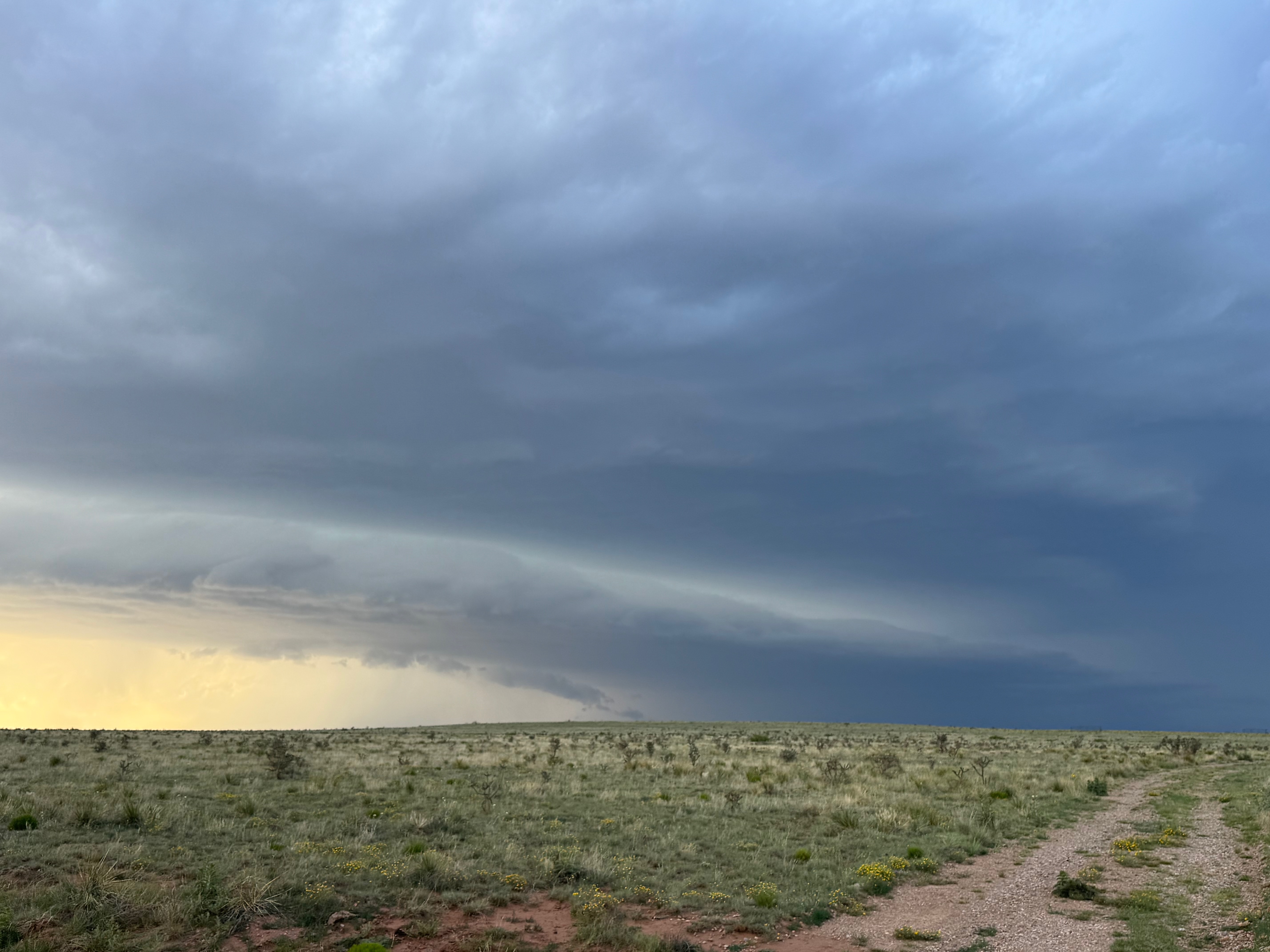 Moisture and shear and upslope flow were good enough for severe storms in east-central New Mexico on this chase day. We headed to Tucumcari and Vaughn. There was some high-based junk around Vaughn. From there we checked out stronger stuff coming out of the Moriarty area along I-40 (second and third photos in the second batch below, around 4:35 p.m.). This stuff looked cold and outflowy. We went back east again to intercept a new updraft that was southwest of Santa Rosa. It looked big and beefy, and eventually we had a good look at the organized storm base that was northwest of Fort Sumner (see last several images below).