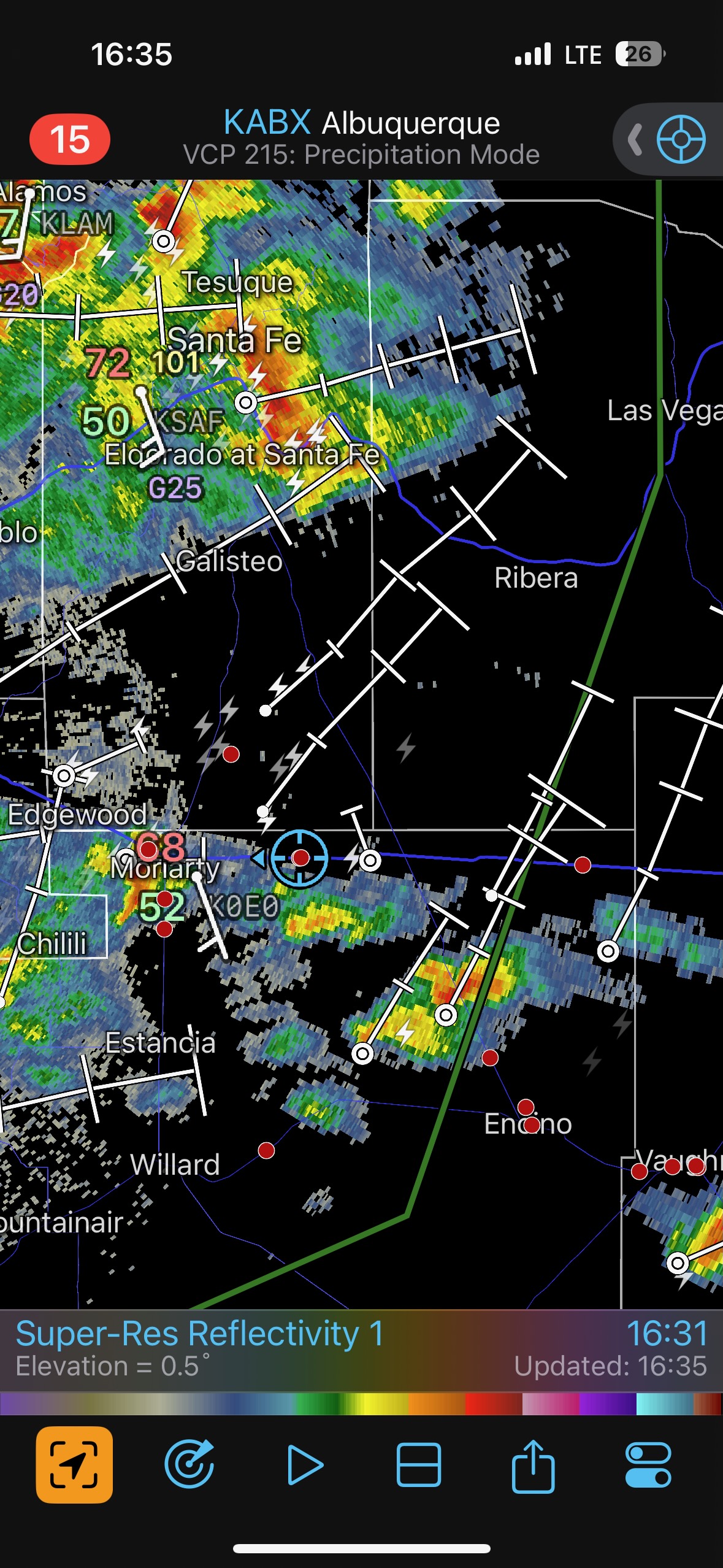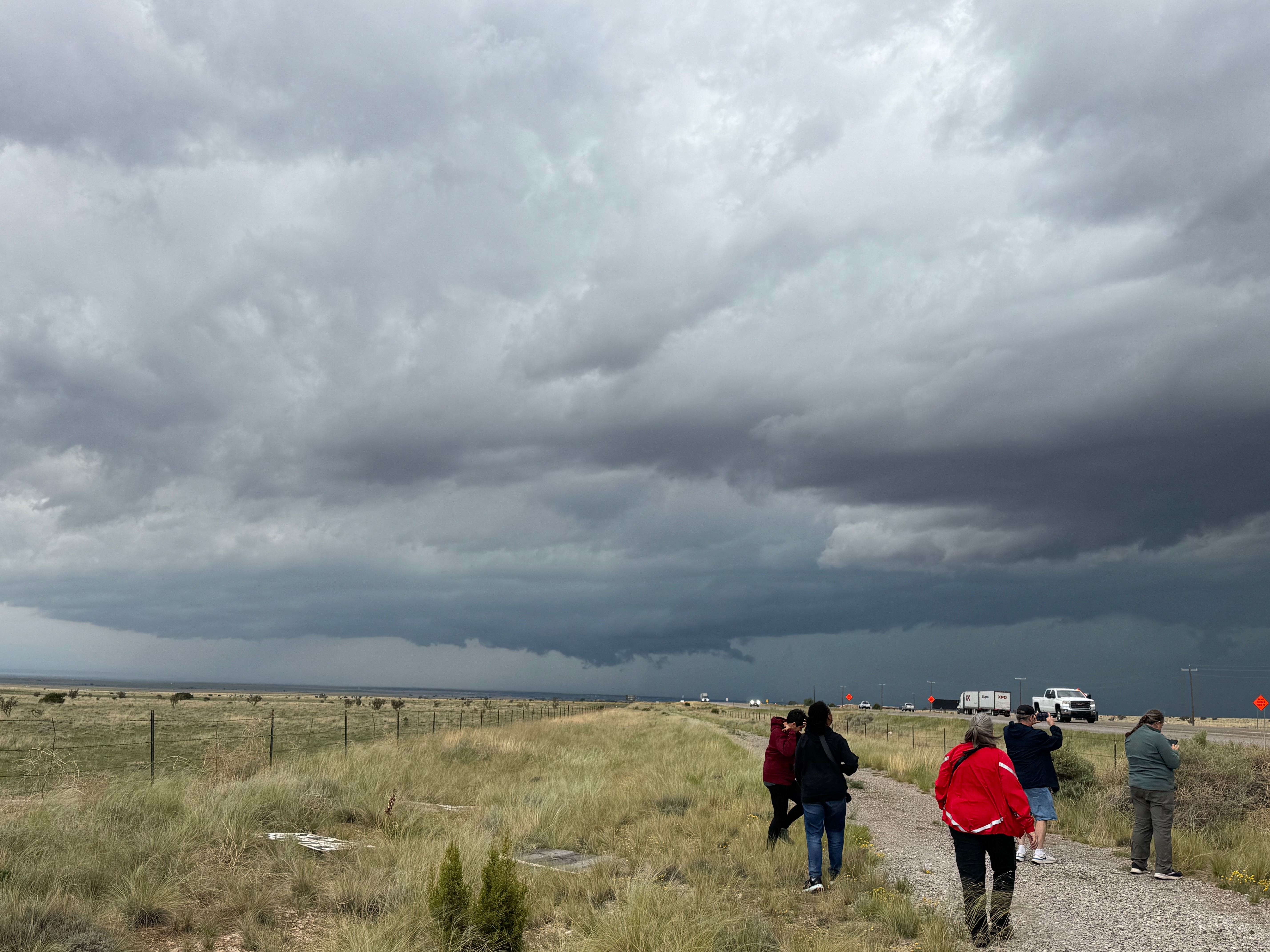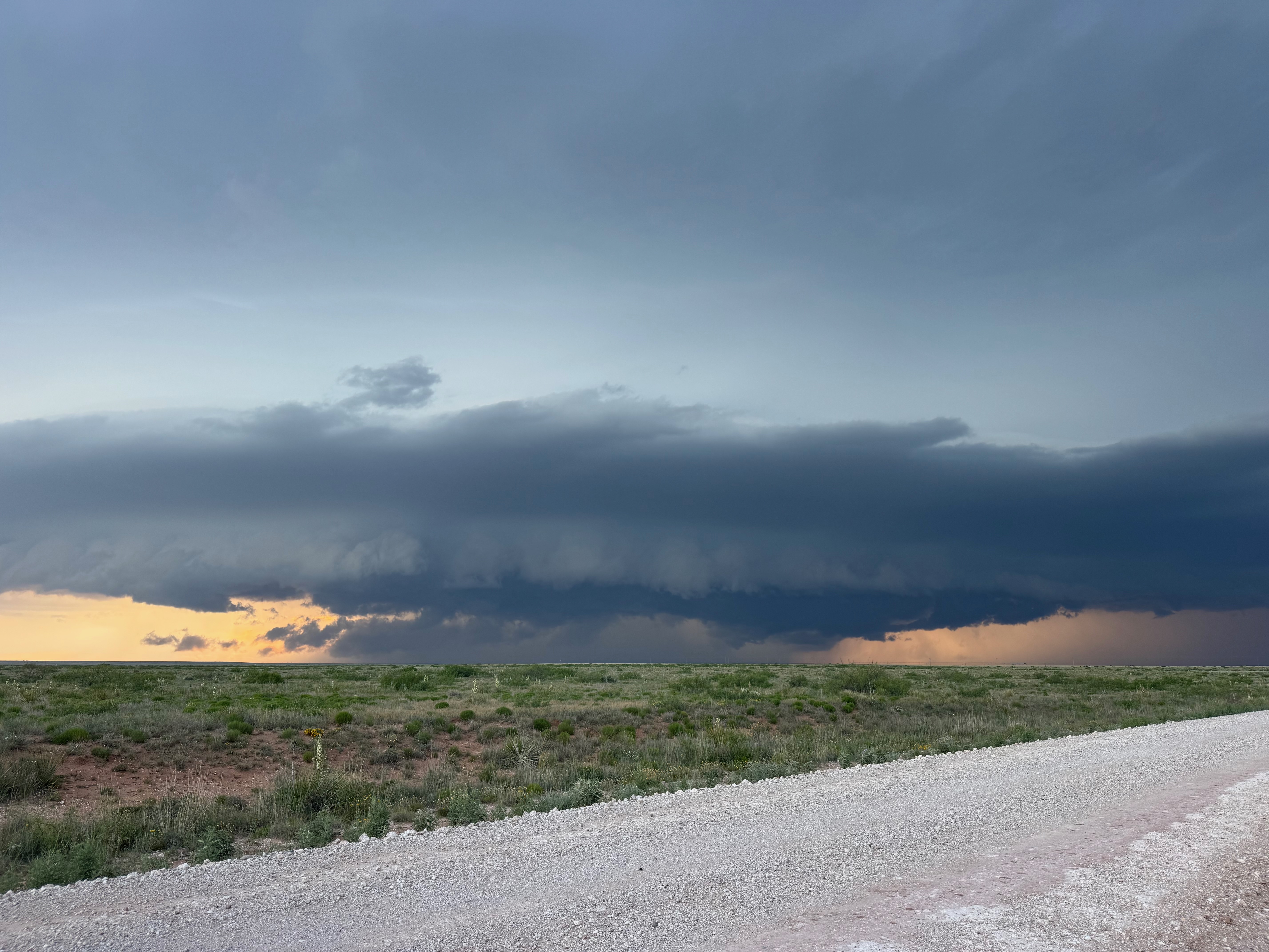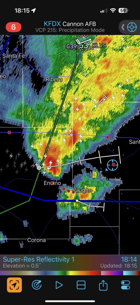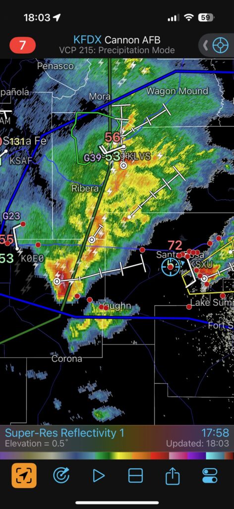 Moisture and shear and upslope flow were good enough for severe storms in east-central New Mexico on this chase day. We headed to Tucumcari and Vaughn. There was some high-based junk around Vaughn. From there we checked out stronger stuff coming out of the Moriarty area along I-40 (second and third photos in the second batch below, around 4:35 p.m.). This stuff looked cold and outflowy. We went back east again to intercept a new updraft that was southwest of Santa Rosa. It looked big and beefy, and eventually we had a good look at the organized storm base that was northwest of Fort Sumner (see last several images below).